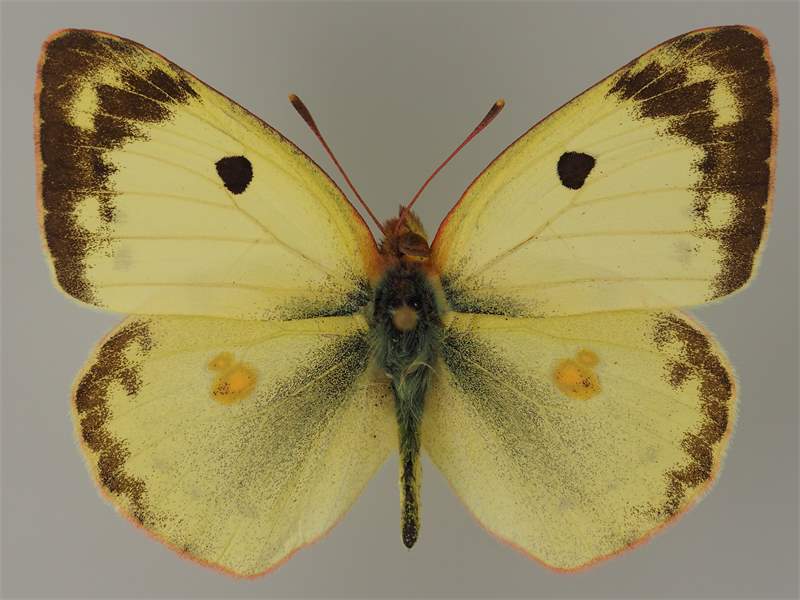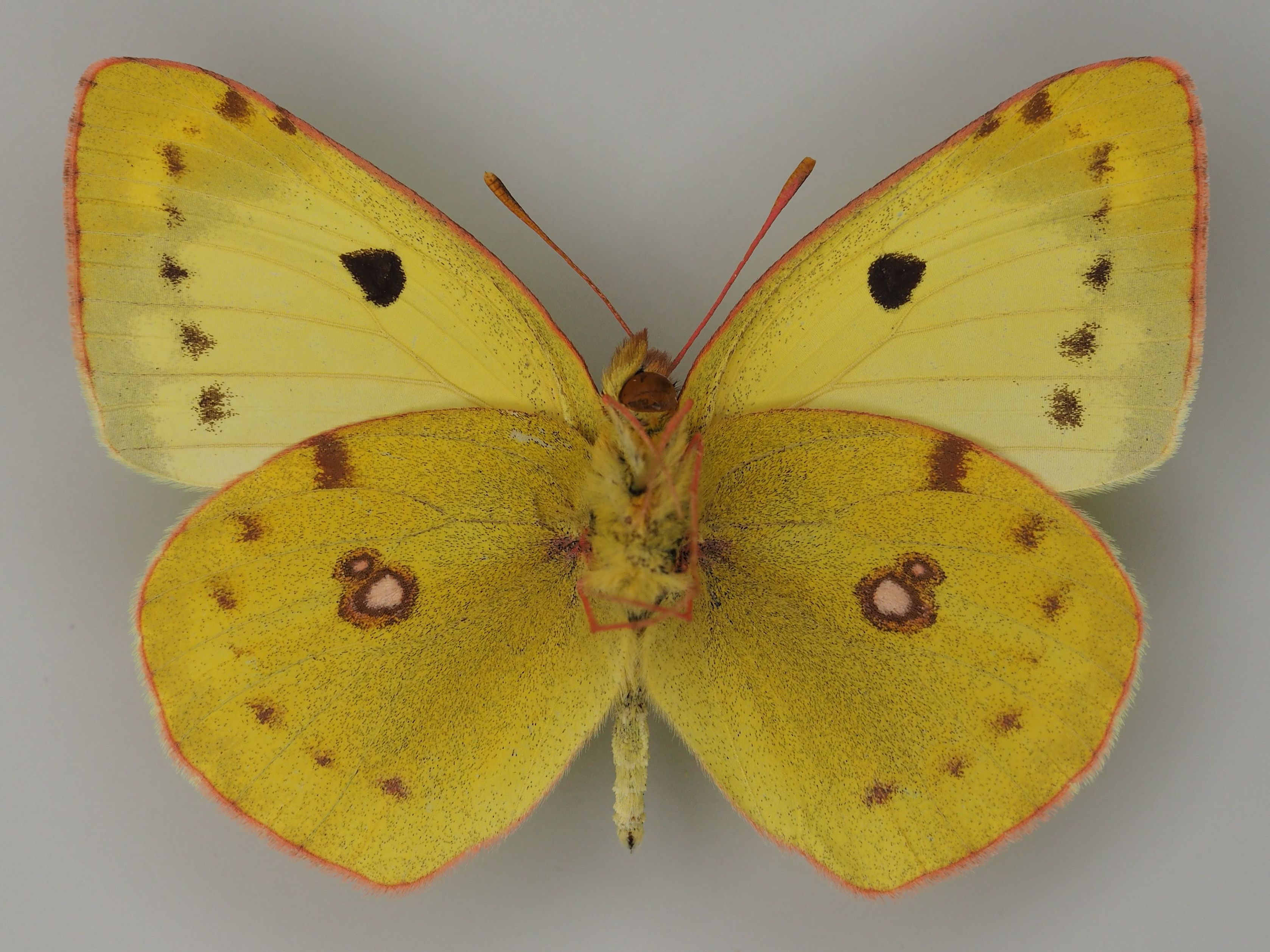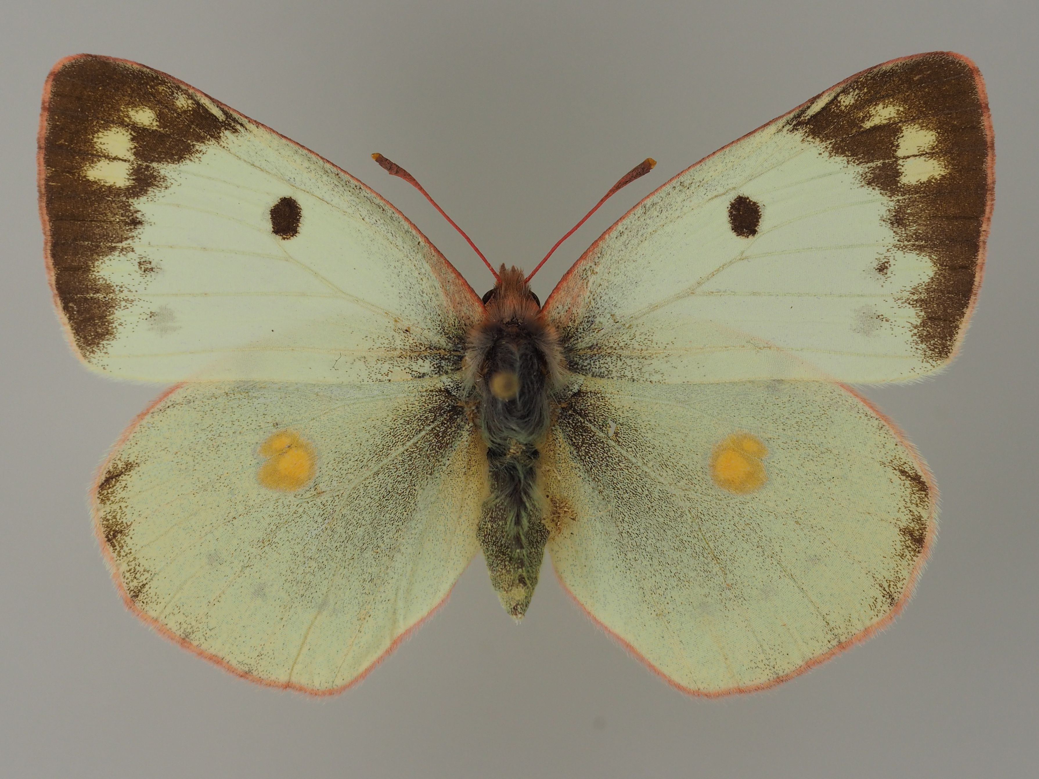 Männchen des Hufeisenkleegelblings vom 2. August 1985 aus Arnstadt (Thüringen), leg. M. Nuß. Coll. Senckenberg Museum für Tierkunde Dresden