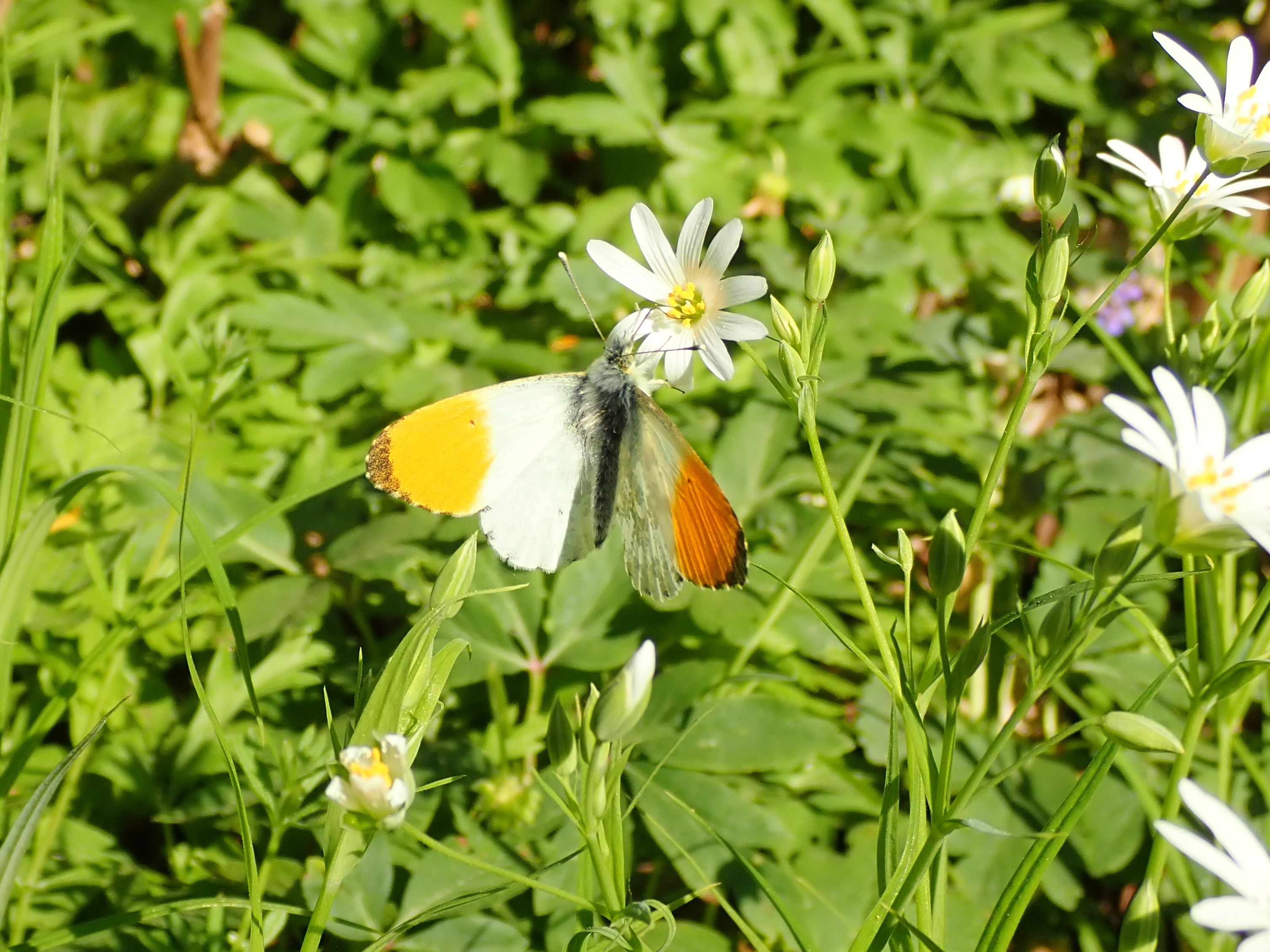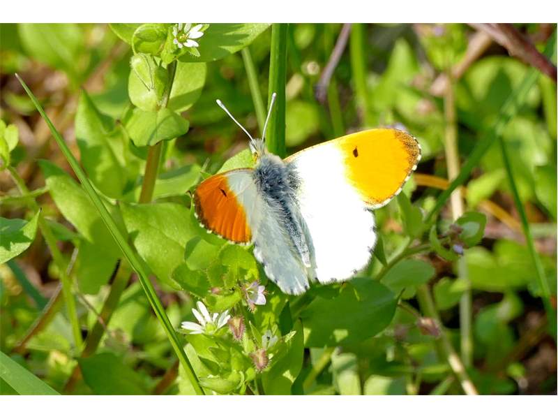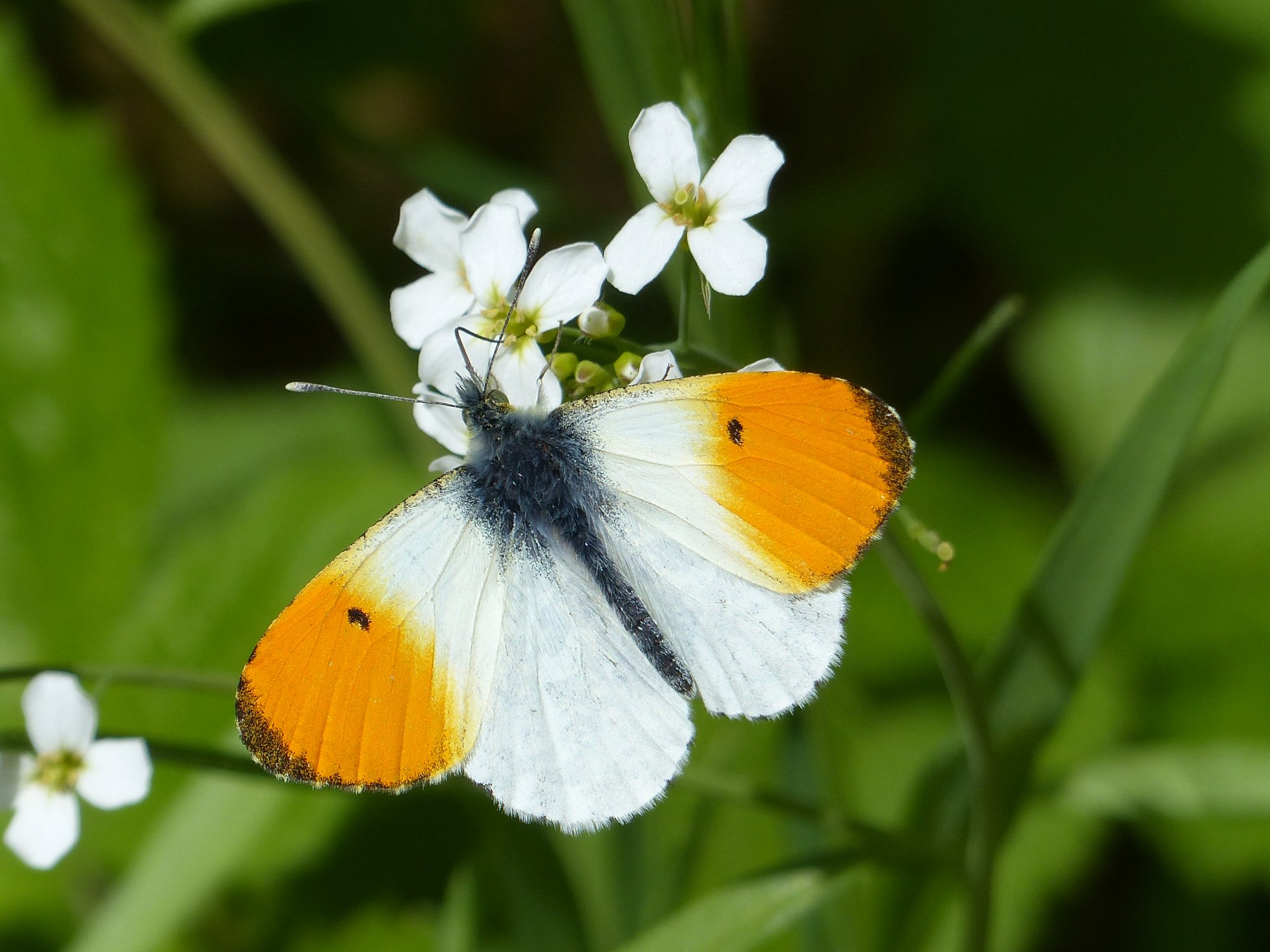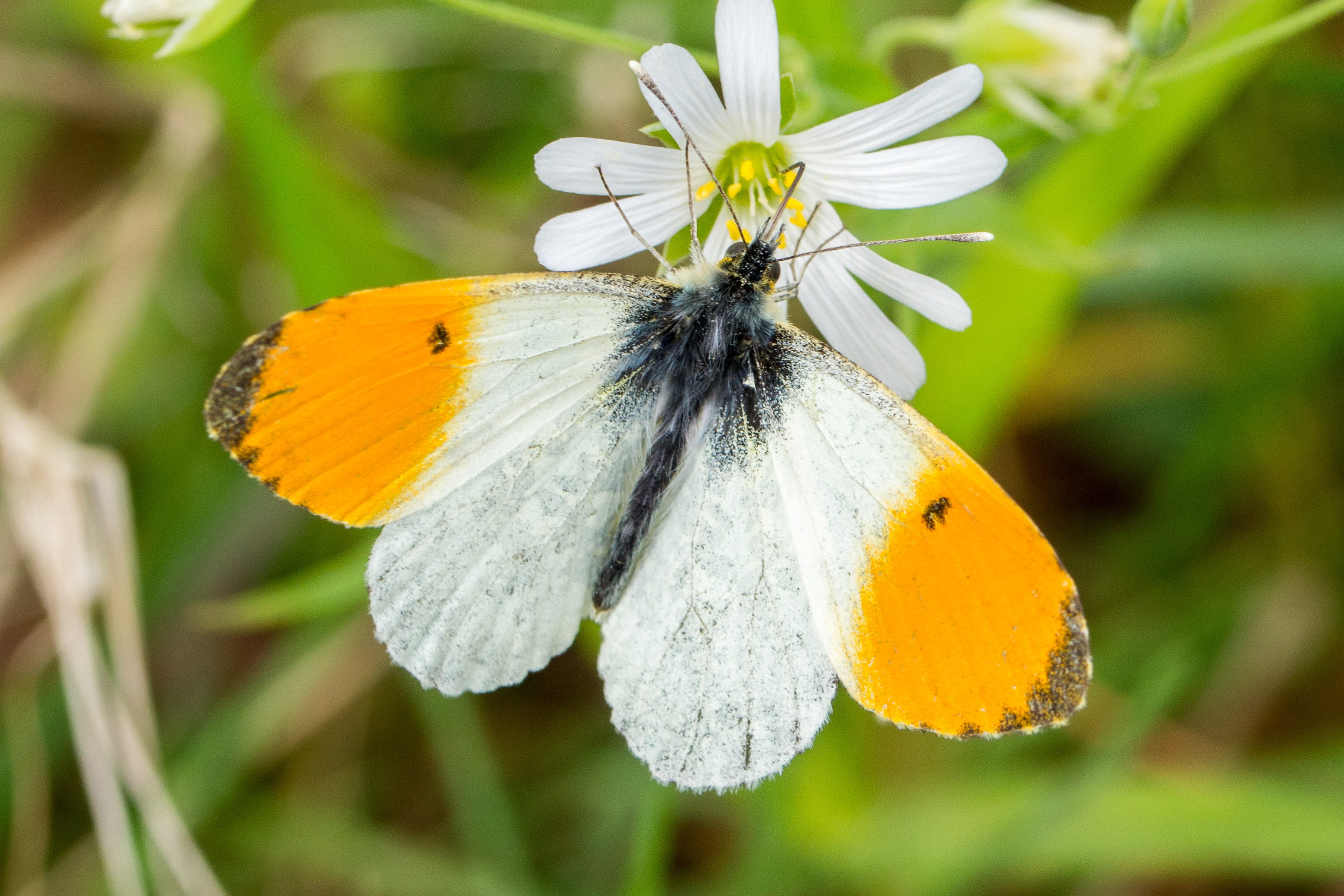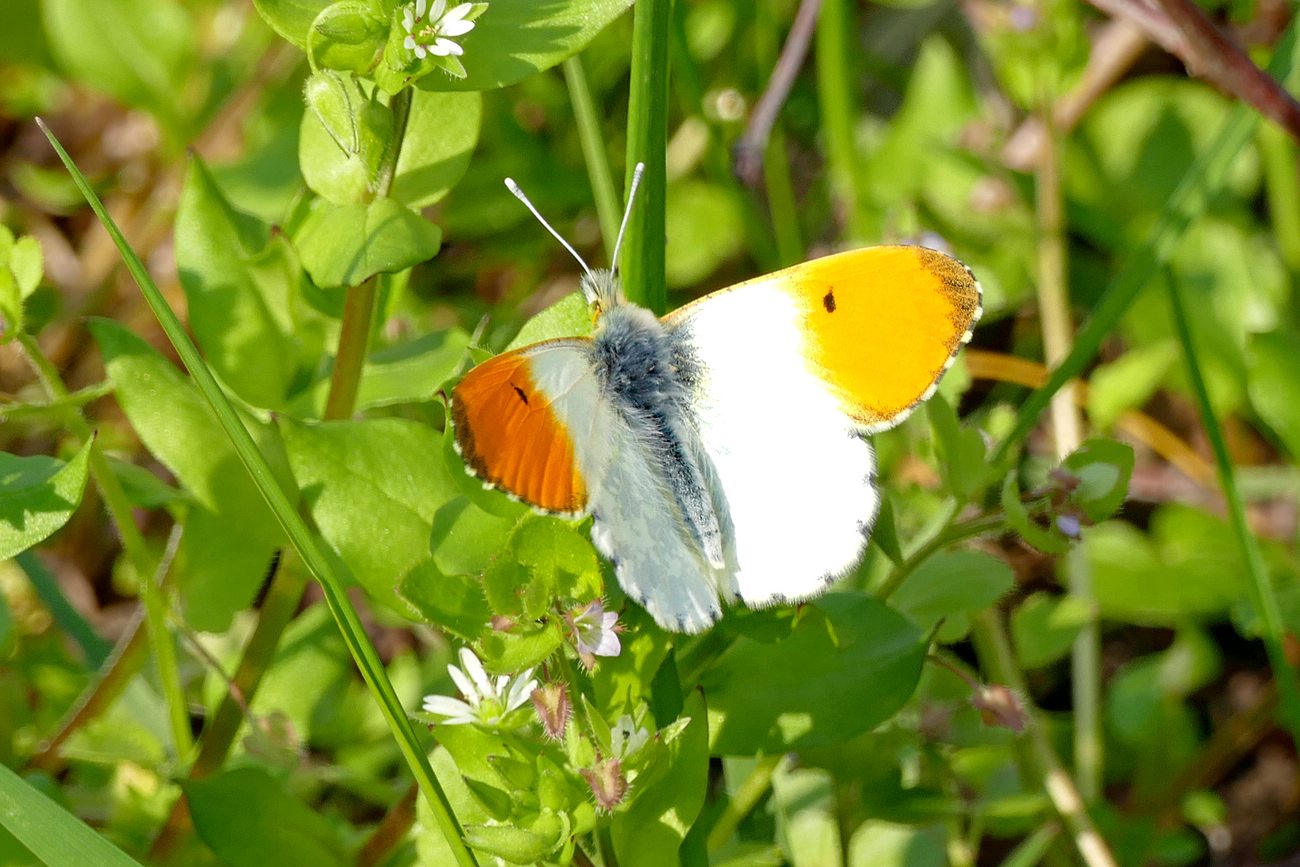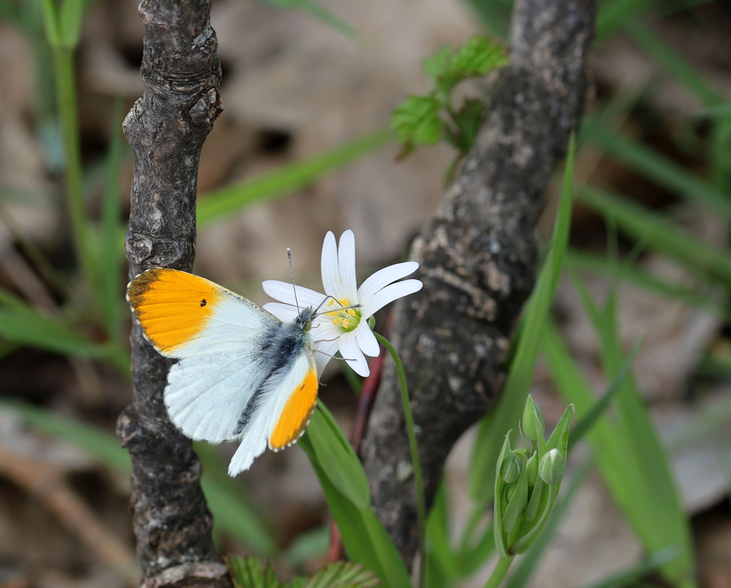 Aurorafalter (Anthocharis cardamines (Linnaeus, 1758)), Männchen, Blütenbesuch an Stellaria holostea, bei Nossen, April 2020 (© Andreas Hurtig)( Bild vergrößern)