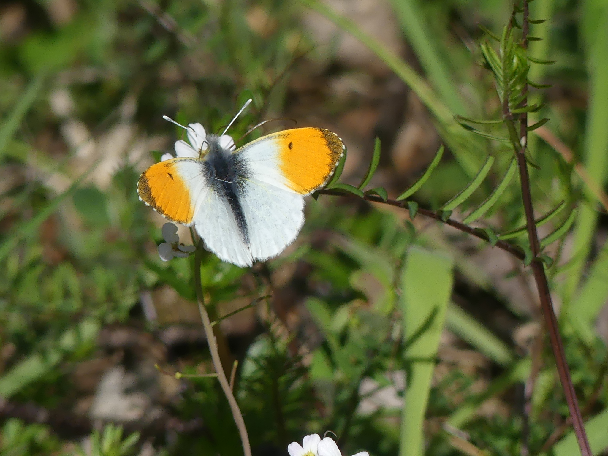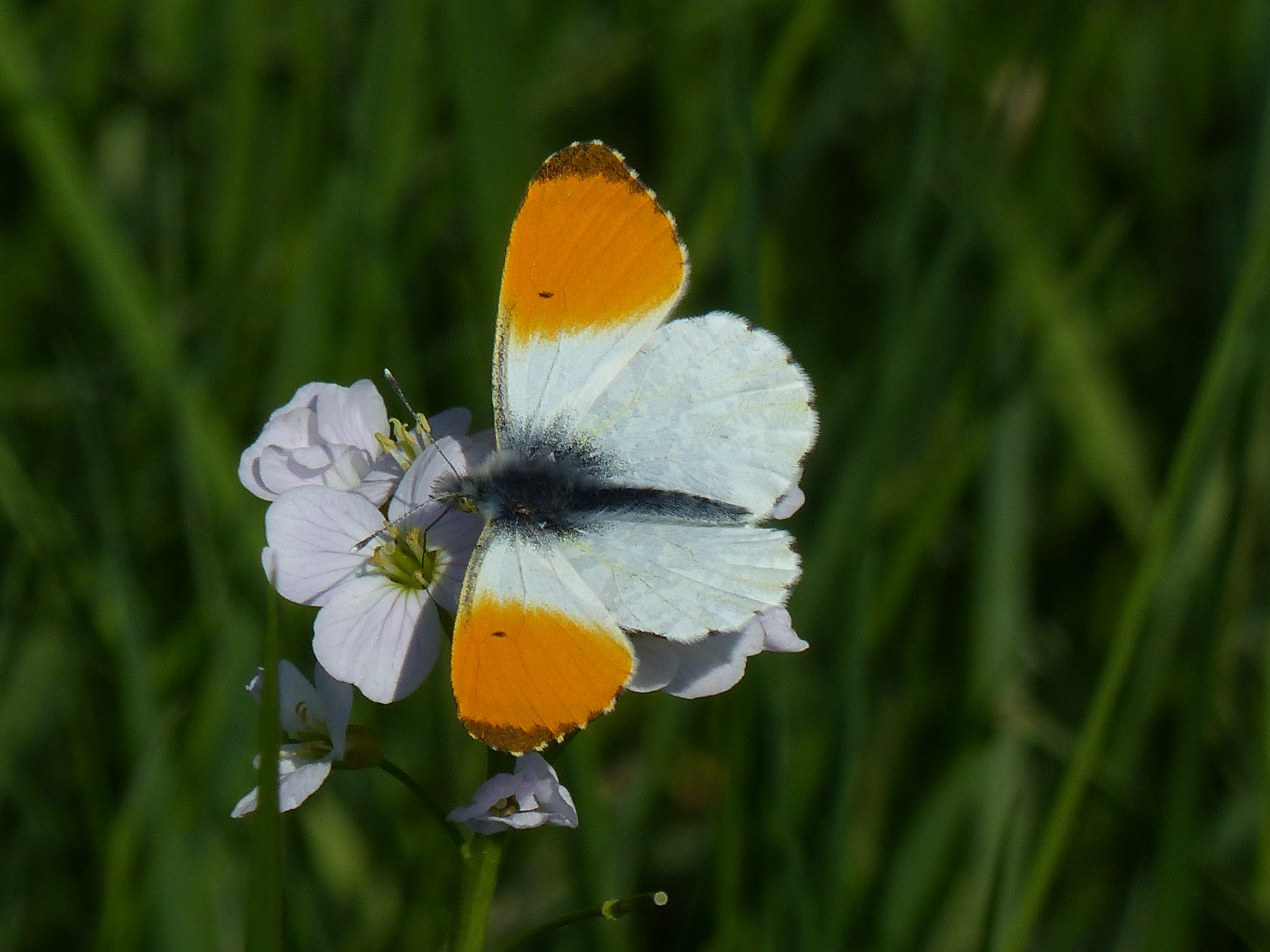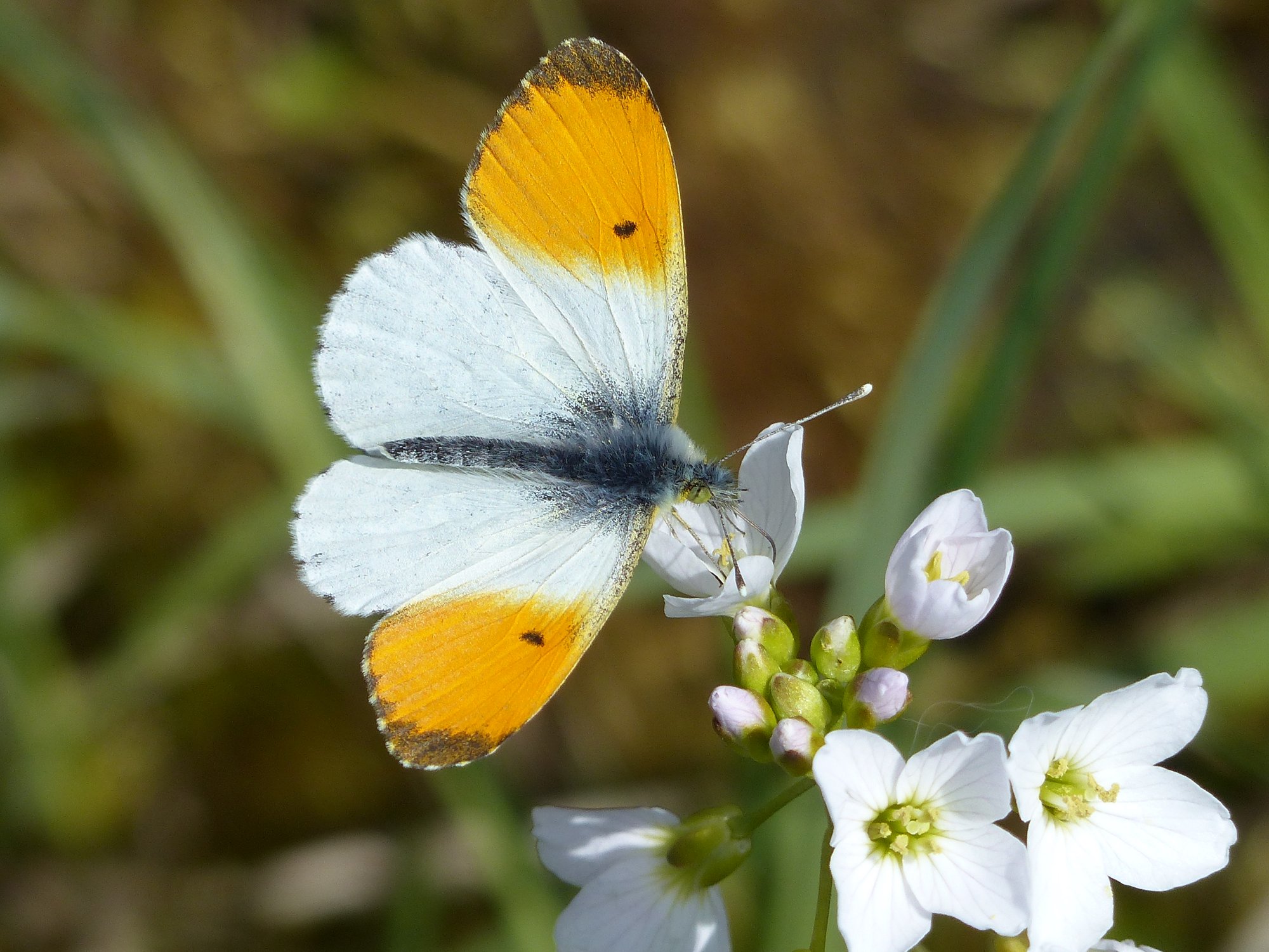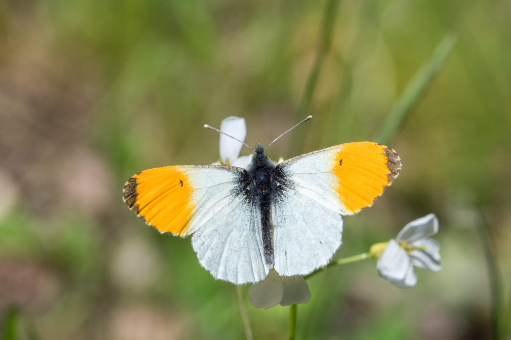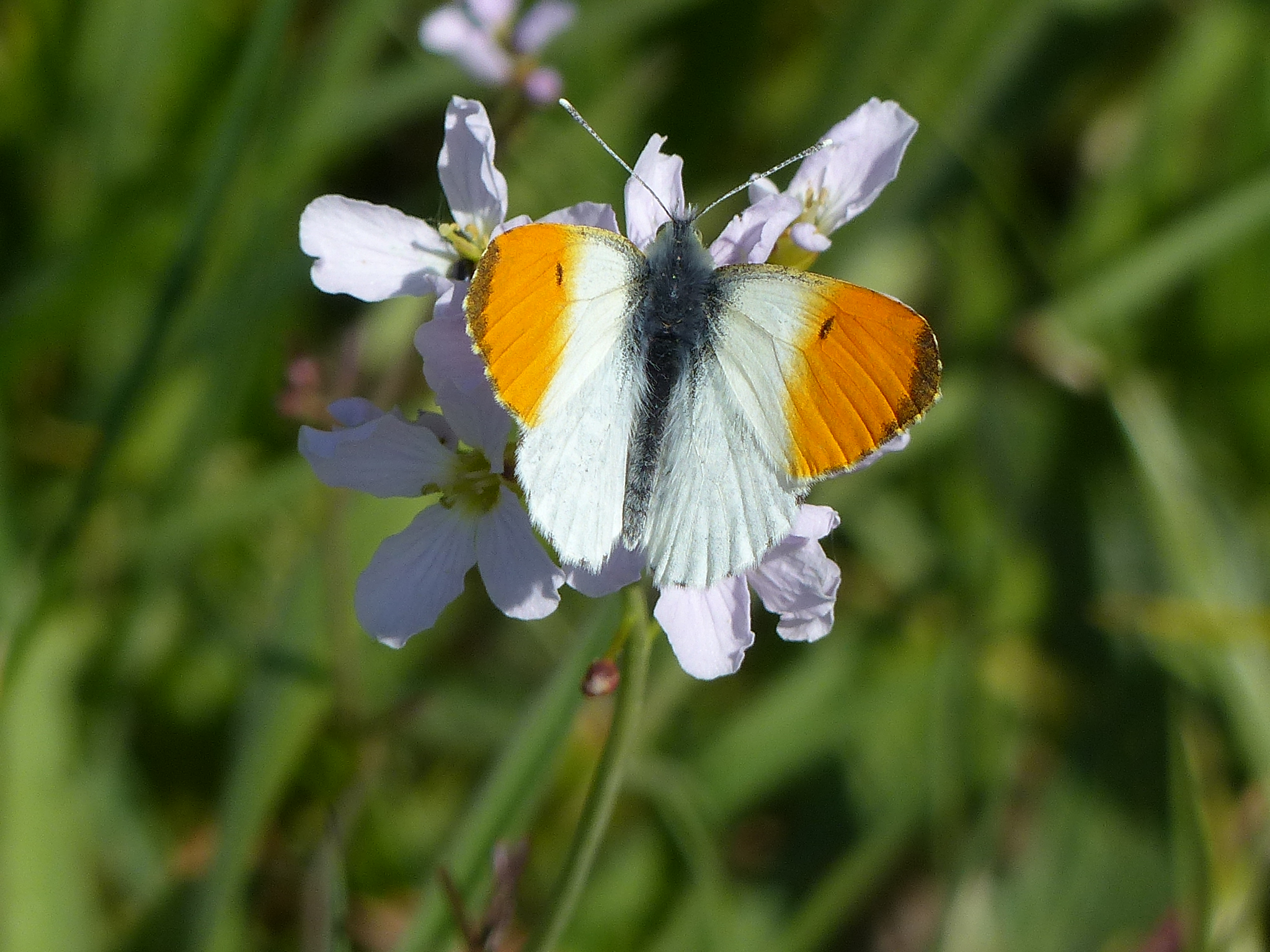 Aurorafalter (Anthocharis cardamines (Linnaeus, 1758)), Männchen, Blütenbesuch an Stellaria holostea, bei Nossen, April 2020 (© Andreas Hurtig)( Bild vergrößern)