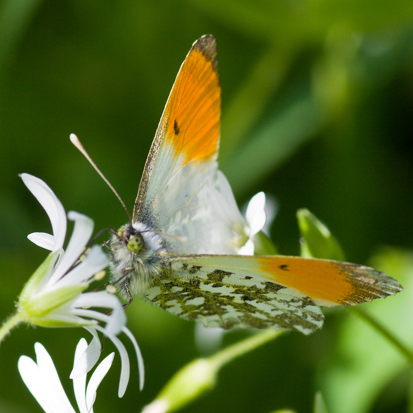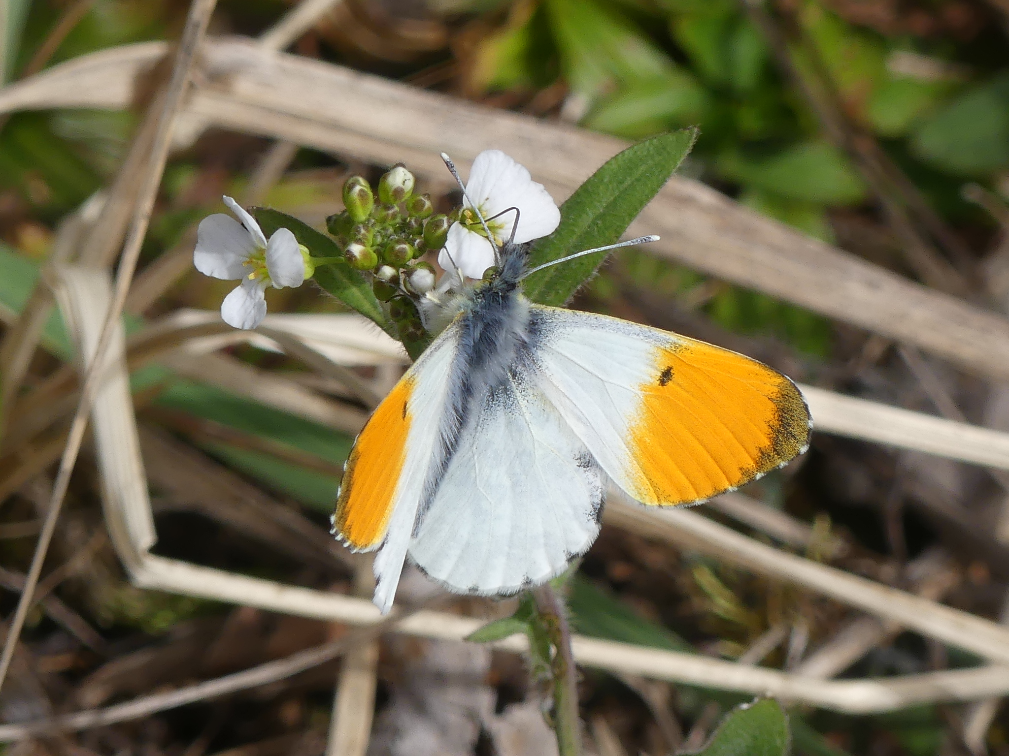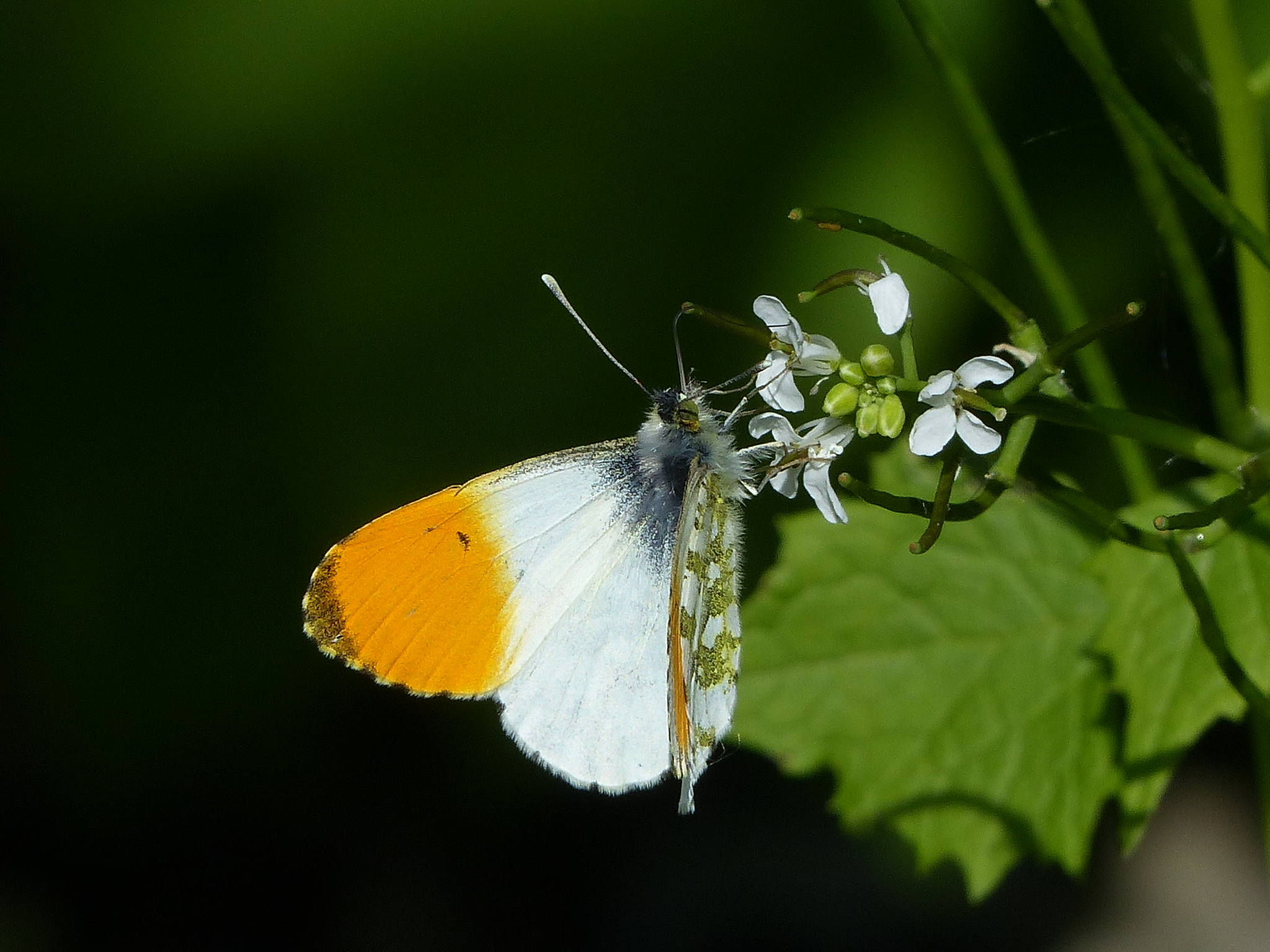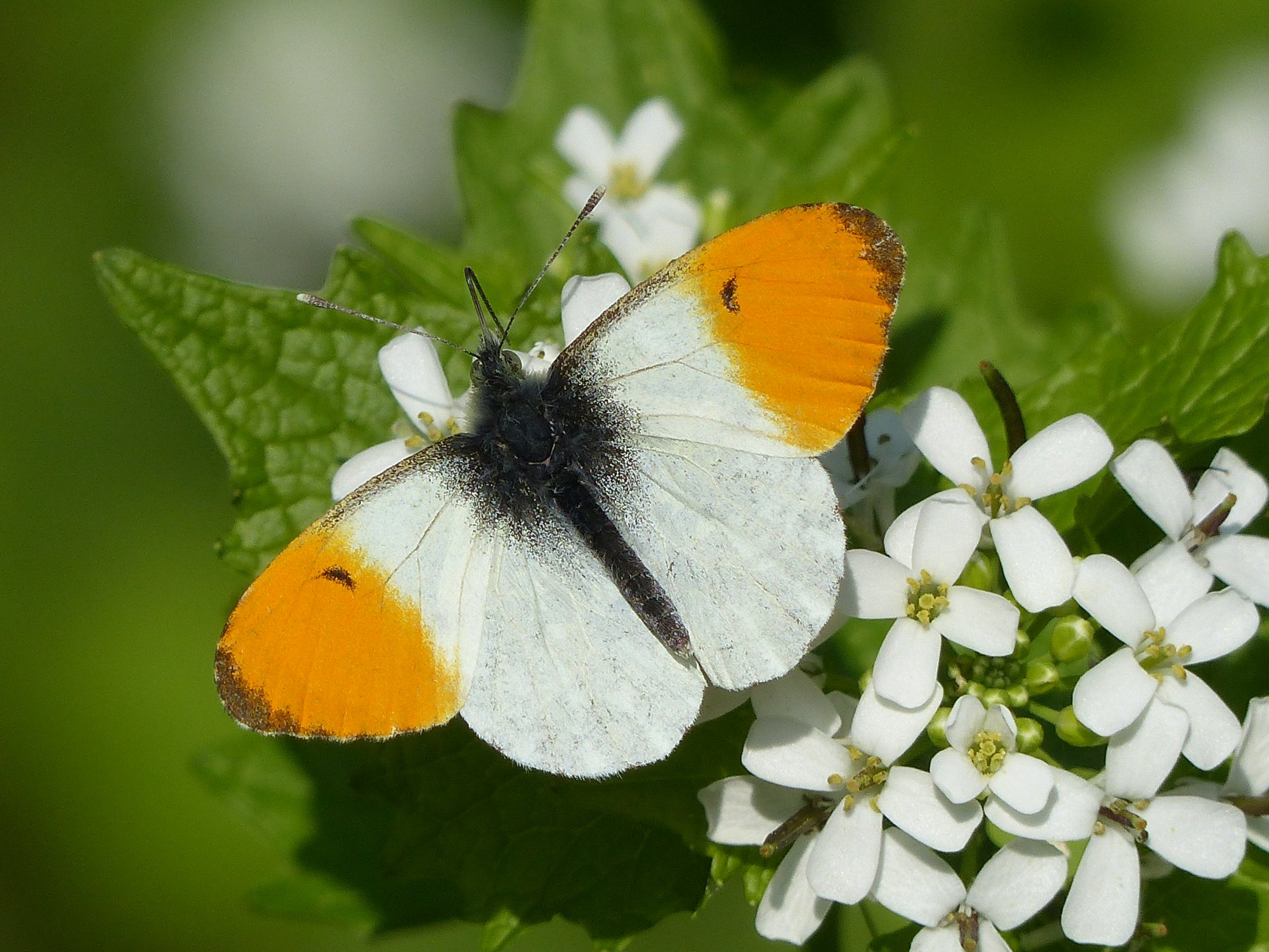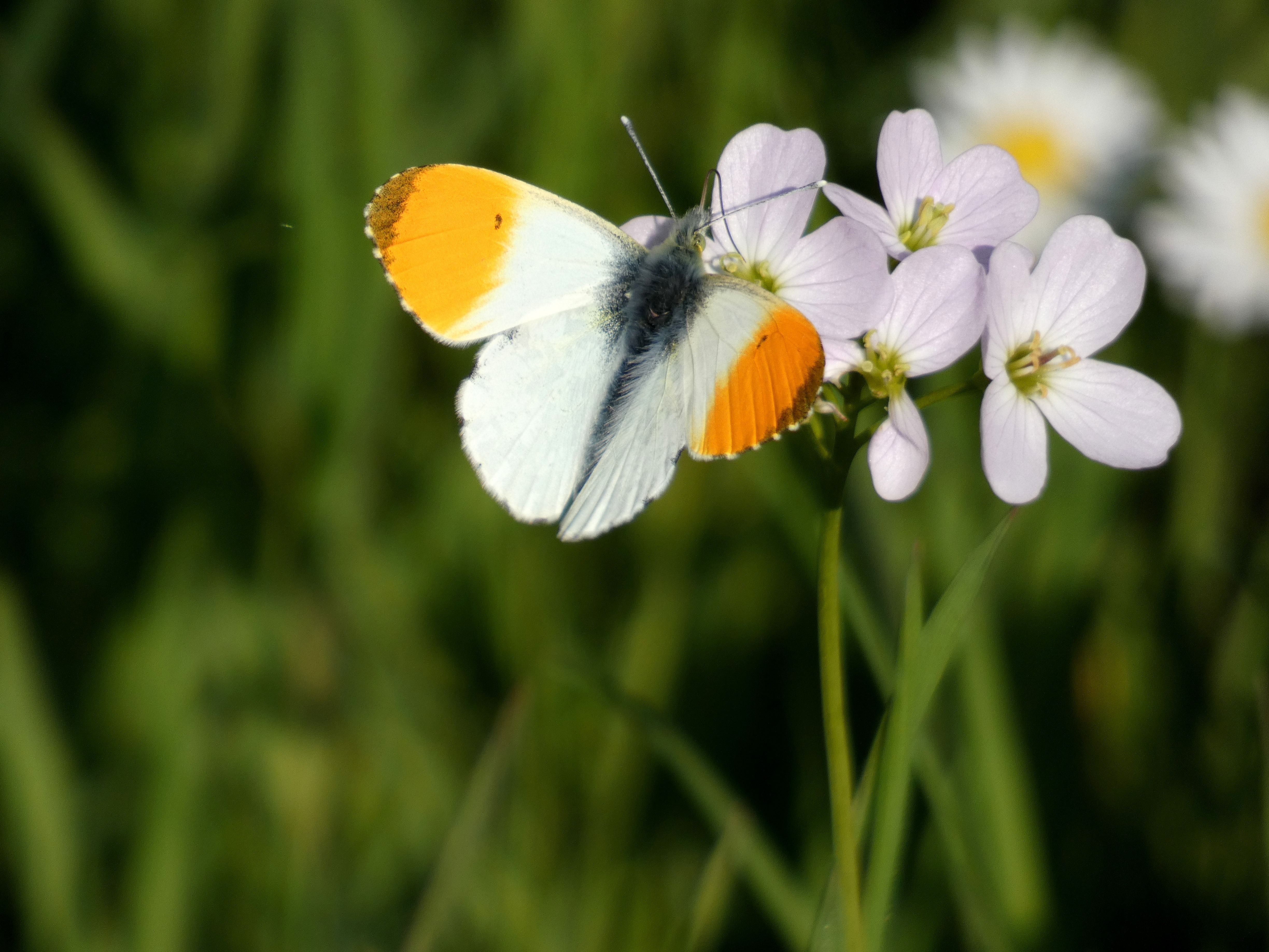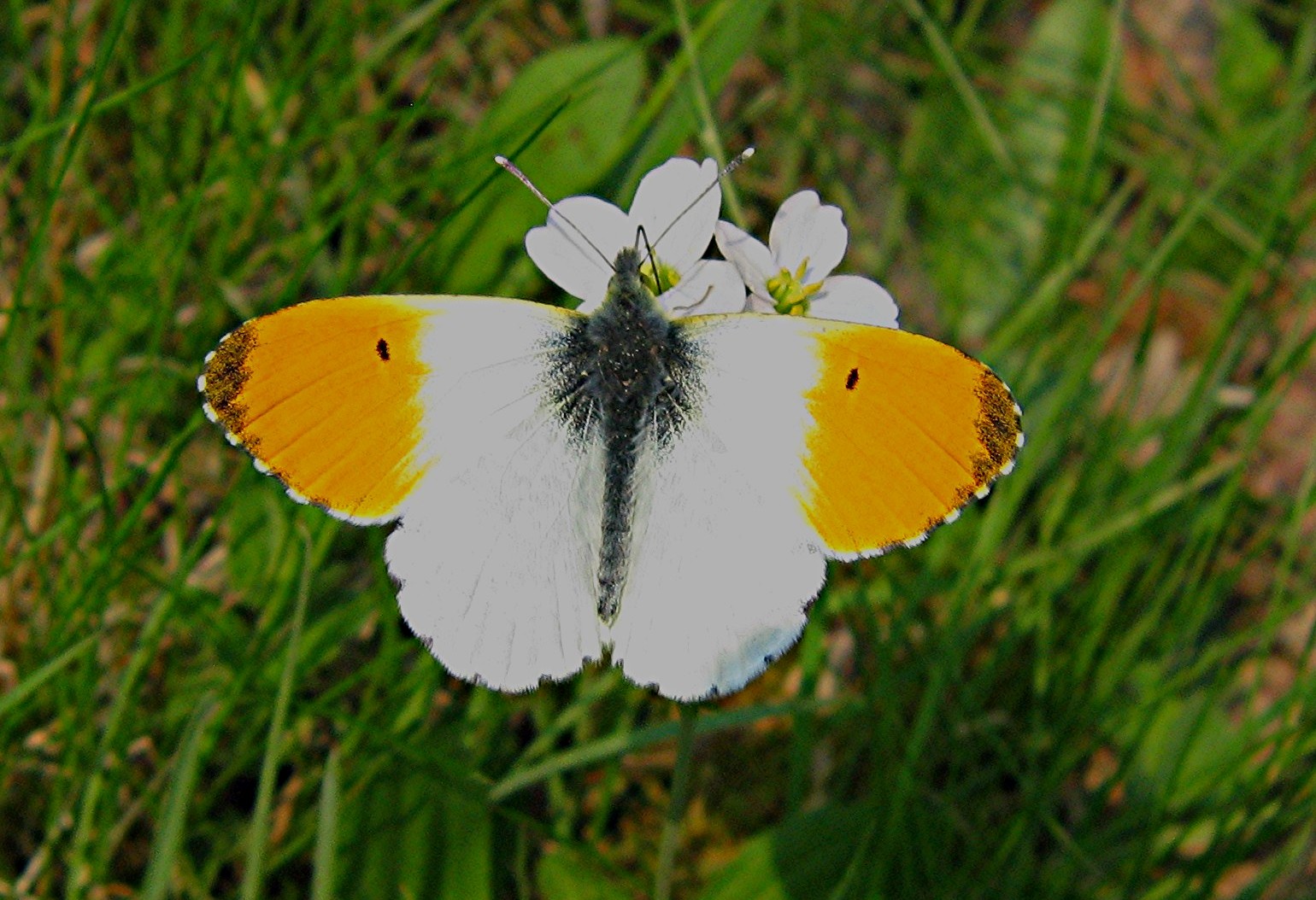 Aurorafalter (Anthocharis cardamines (Linnaeus, 1758)), Männchen, Blütenbesuch an Stellaria holostea, bei Nossen, April 2020 (© Andreas Hurtig)( Bild vergrößern)
