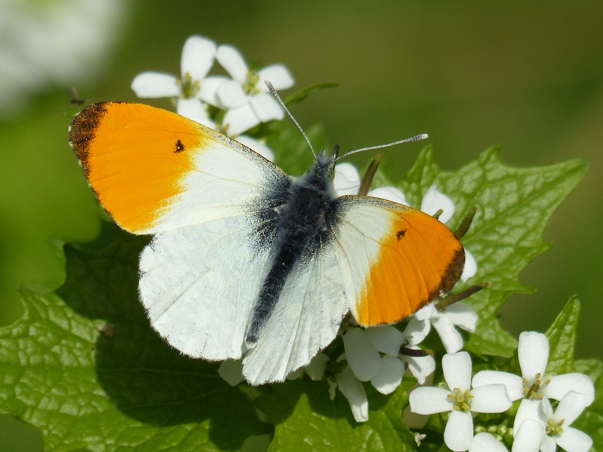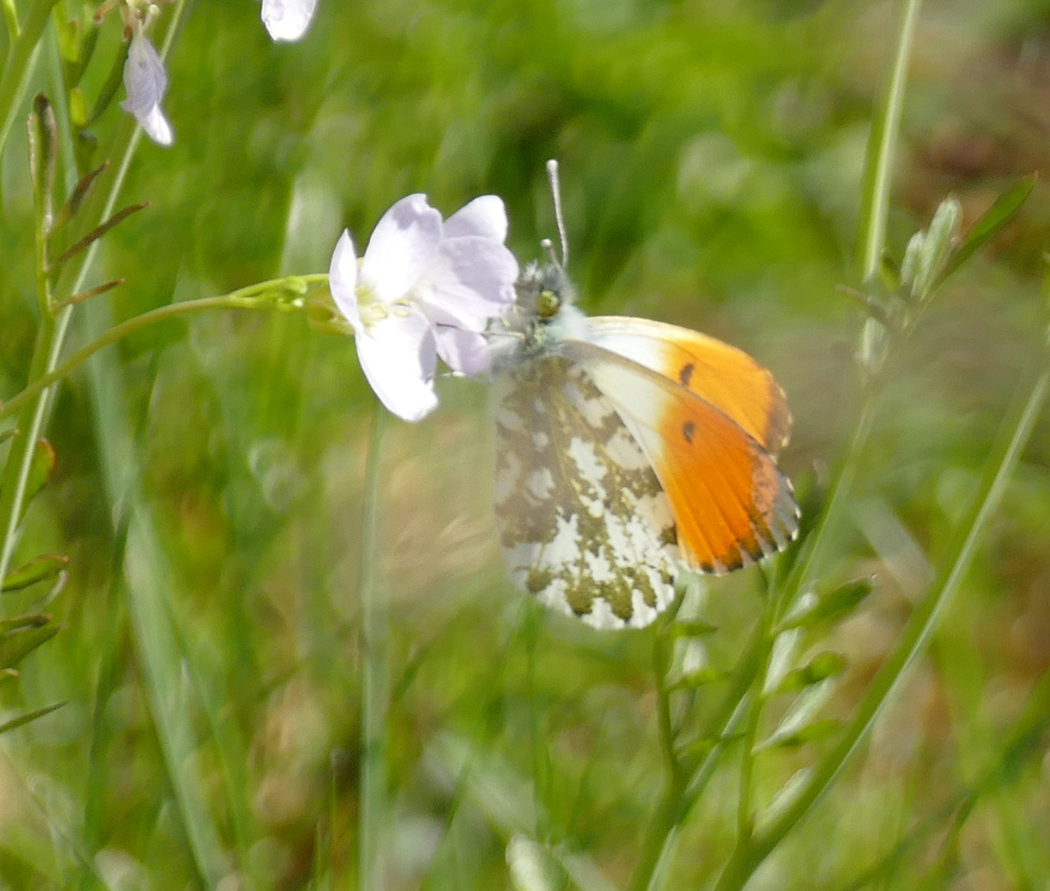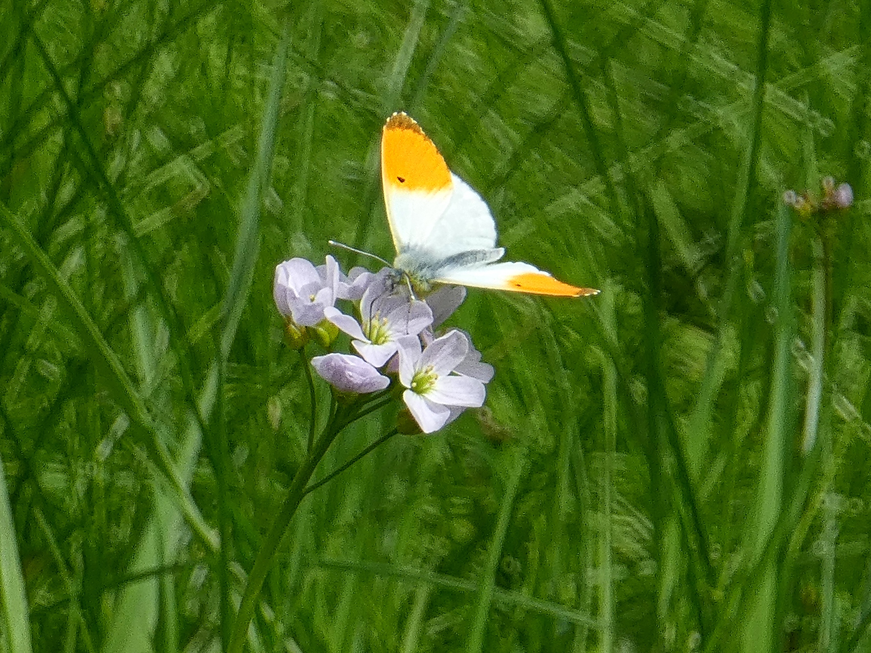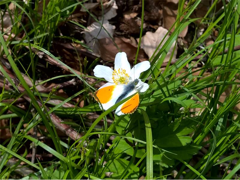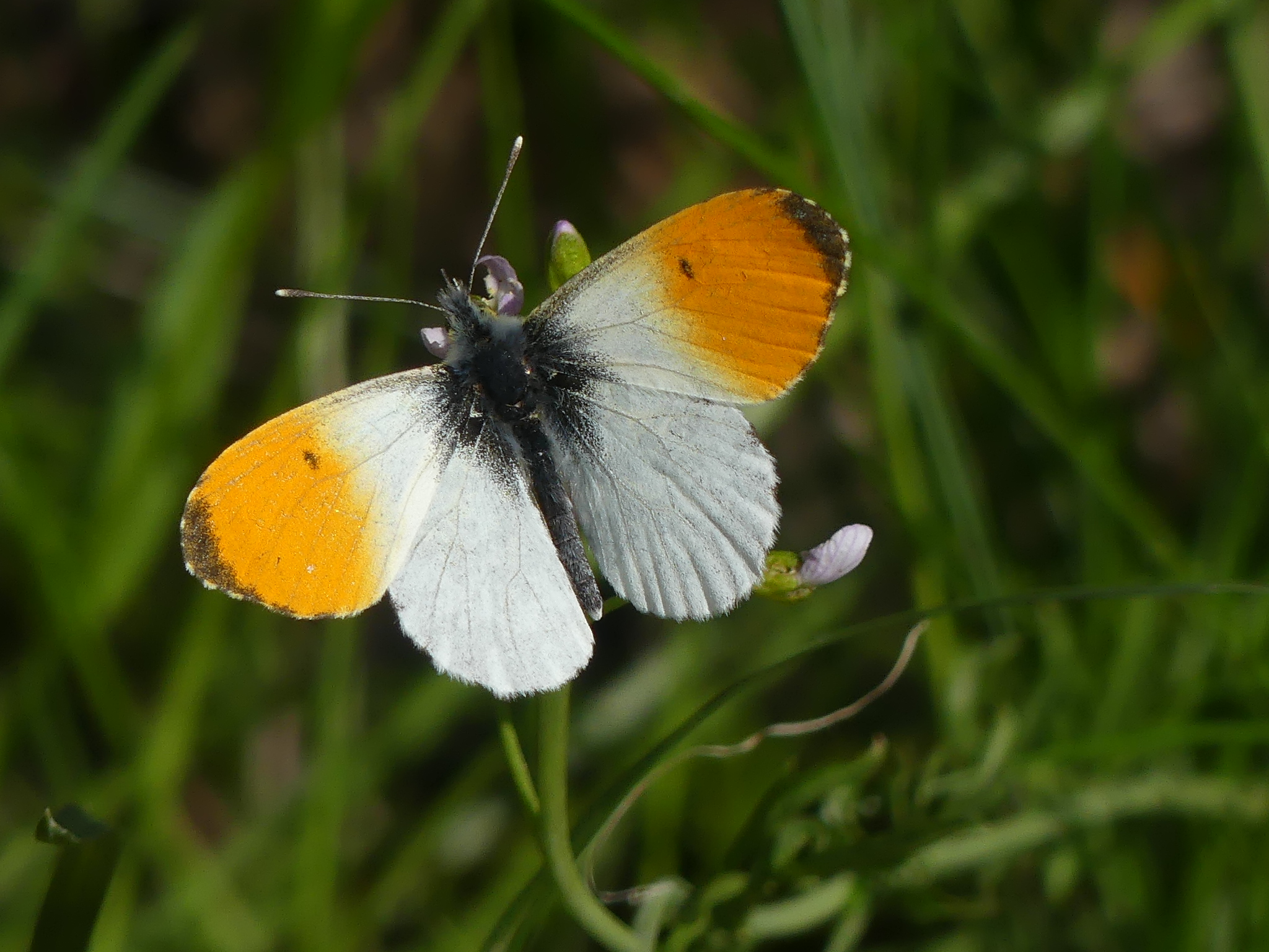 Aurorafalter (Anthocharis cardamines (Linnaeus, 1758)), Männchen, Blütenbesuch an Stellaria holostea, bei Nossen, April 2020 (© Andreas Hurtig)( Bild vergrößern)