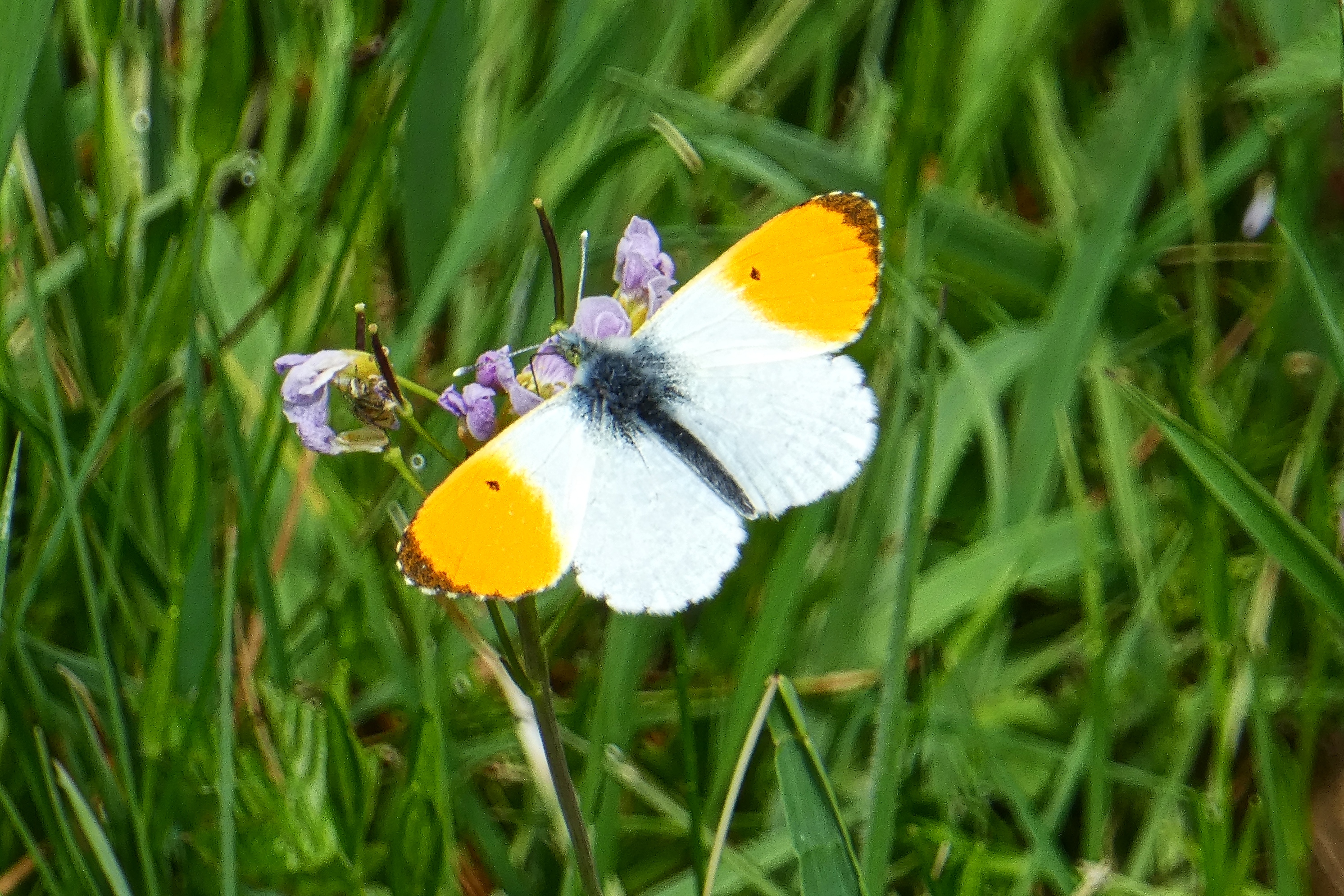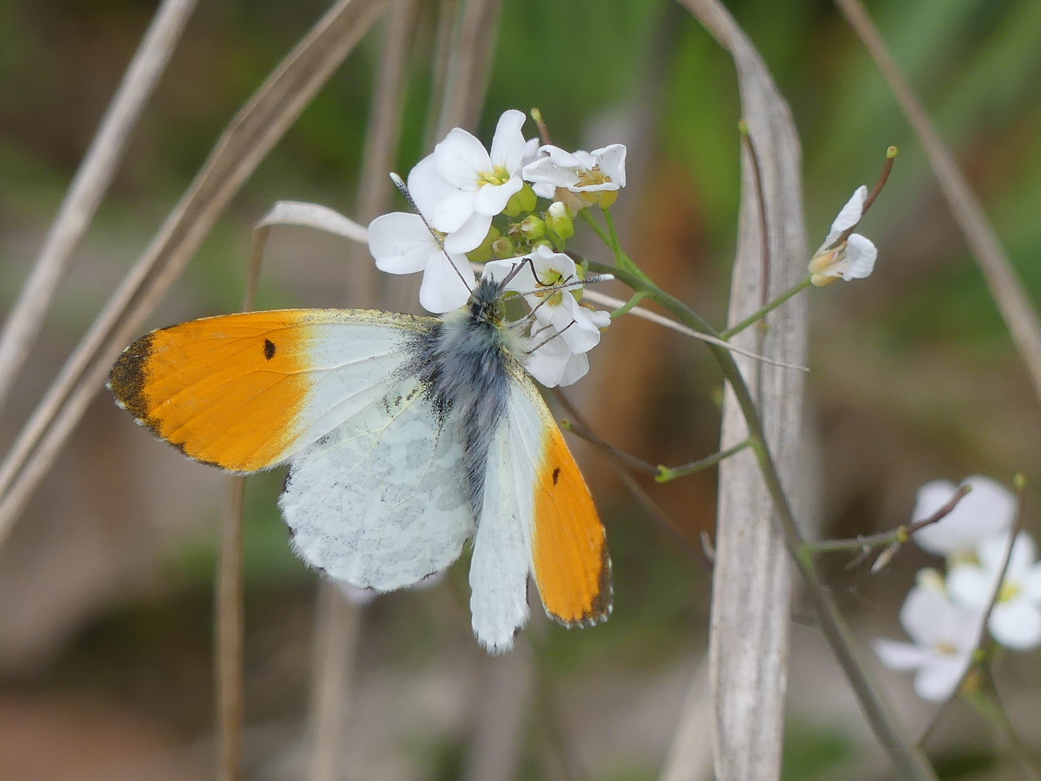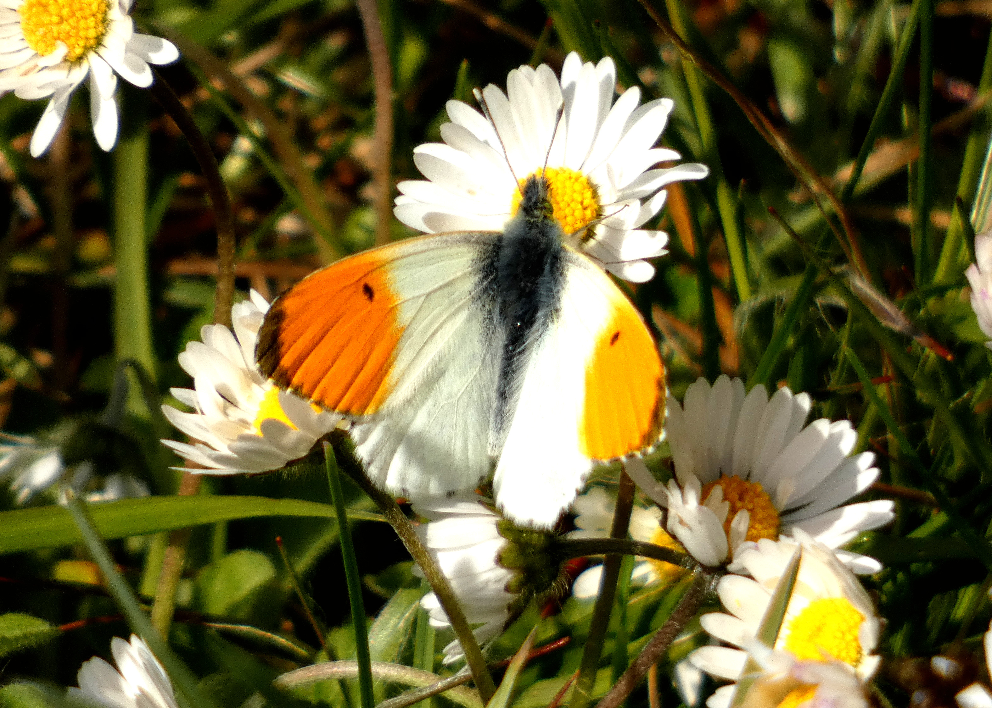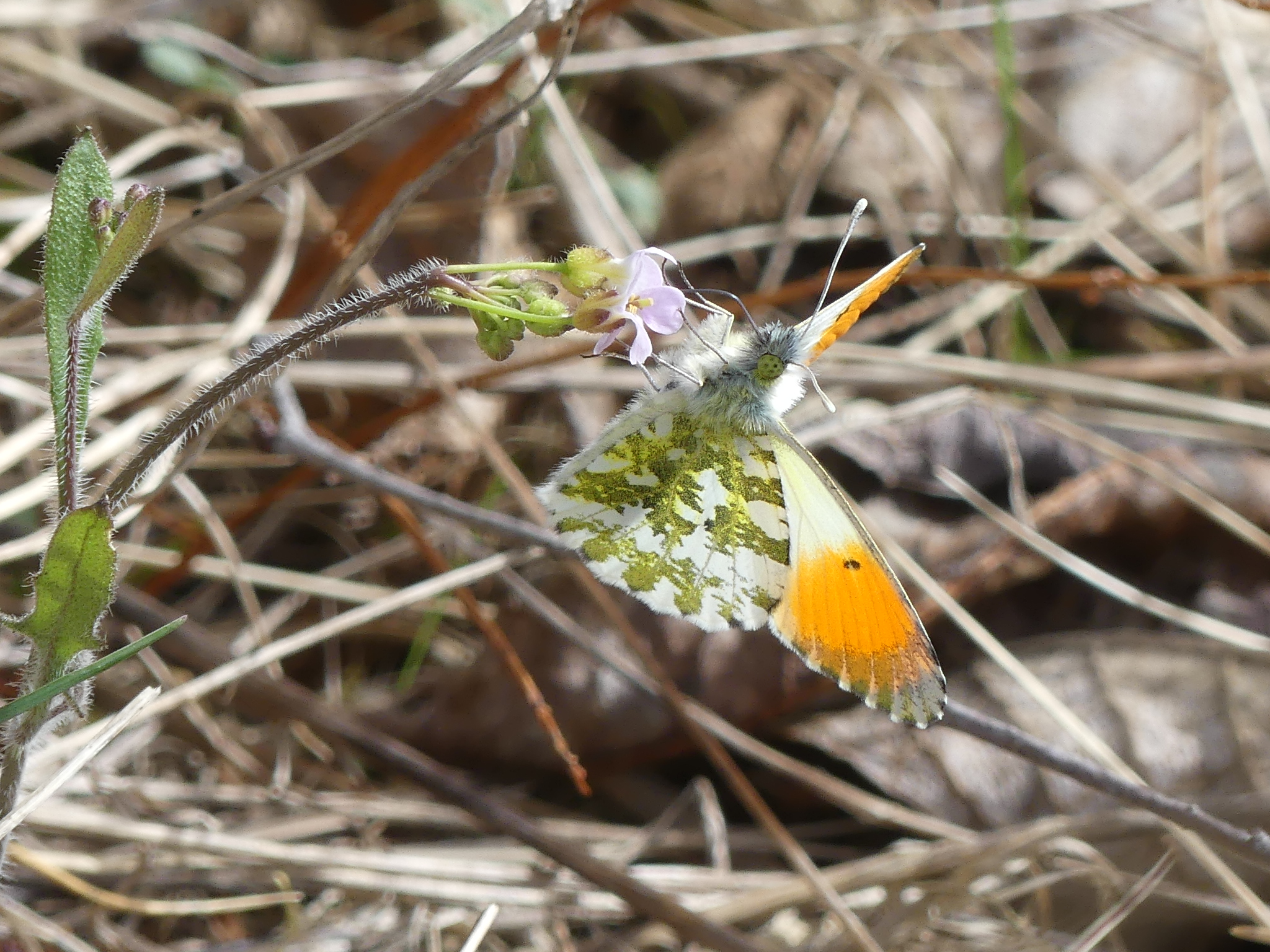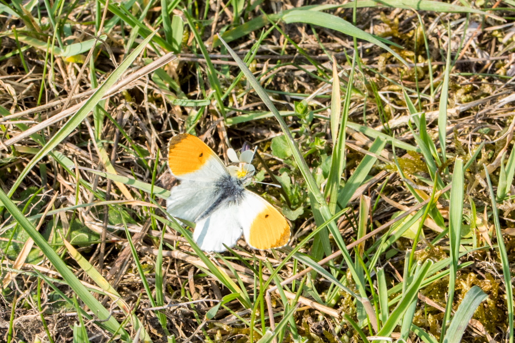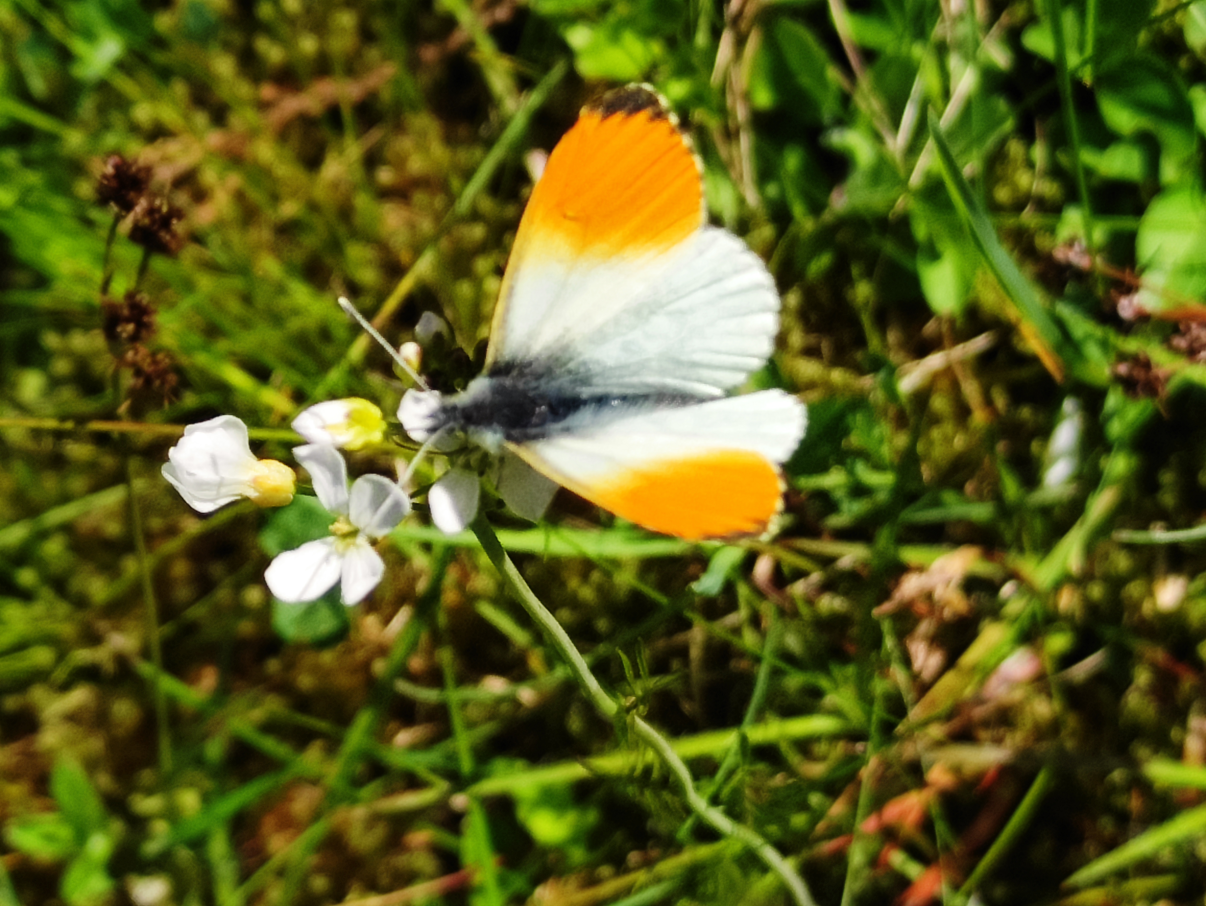 Aurorafalter (Anthocharis cardamines (Linnaeus, 1758)), Männchen, Blütenbesuch an Stellaria holostea, bei Nossen, April 2020 (© Andreas Hurtig)( Bild vergrößern)