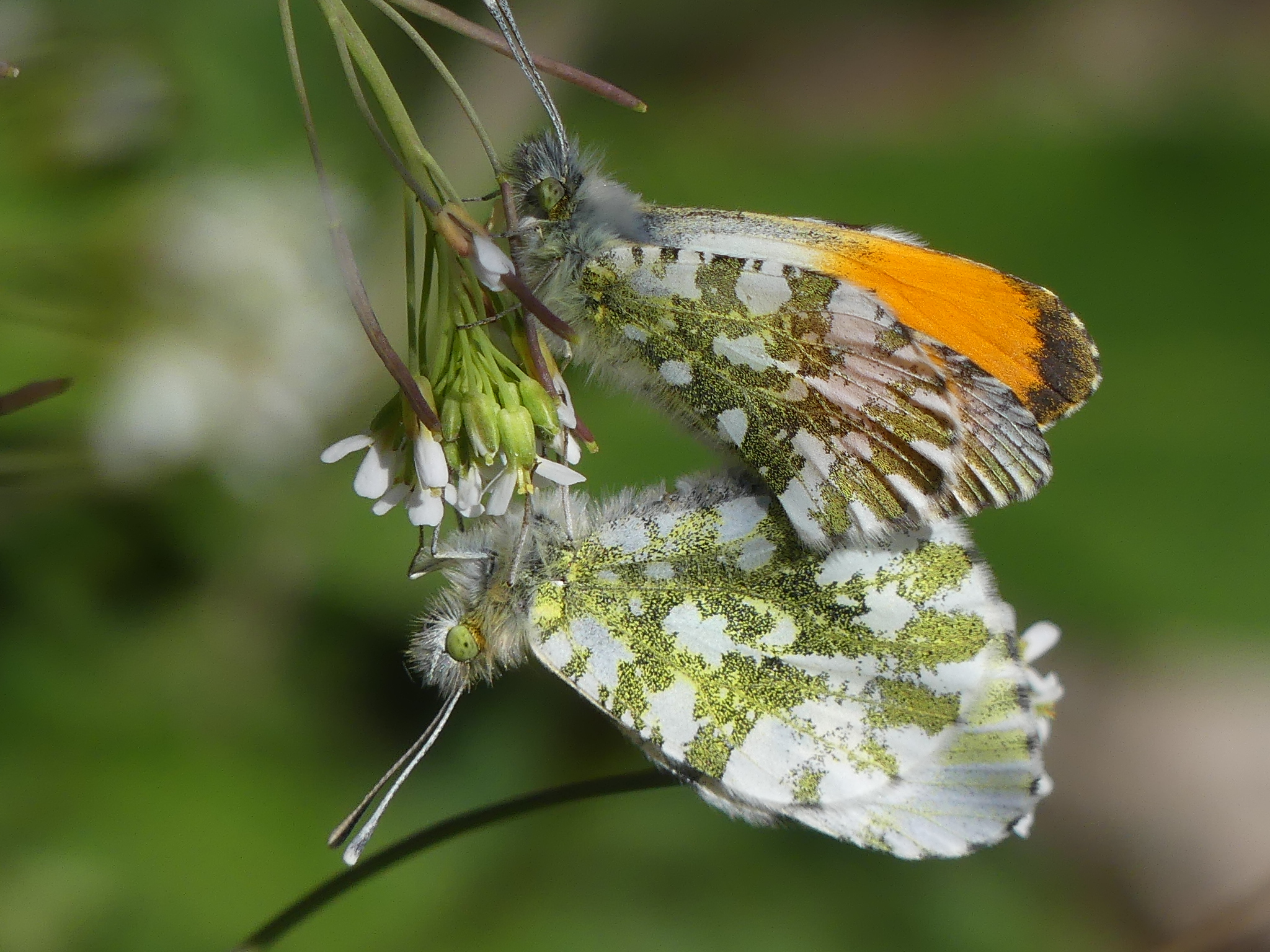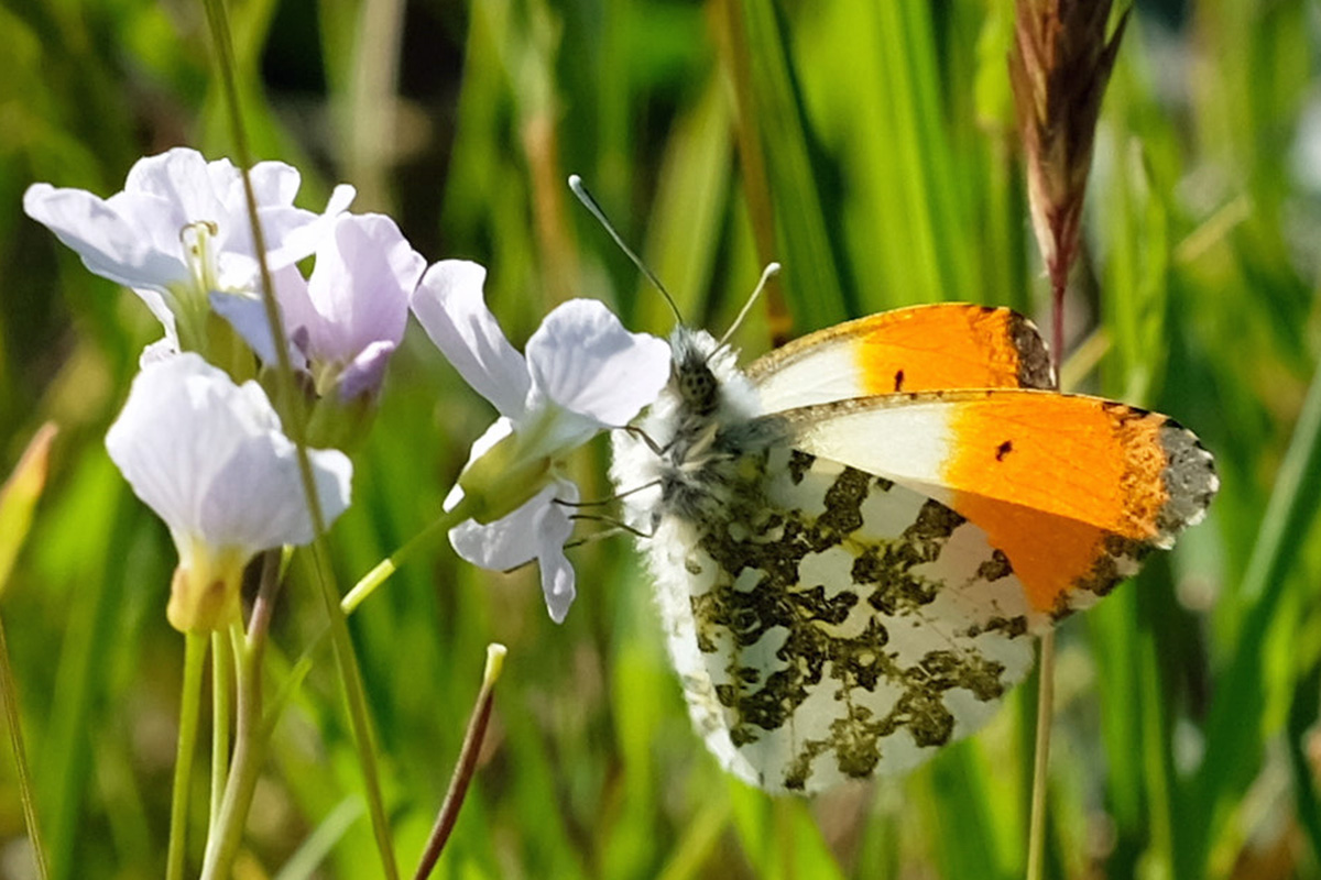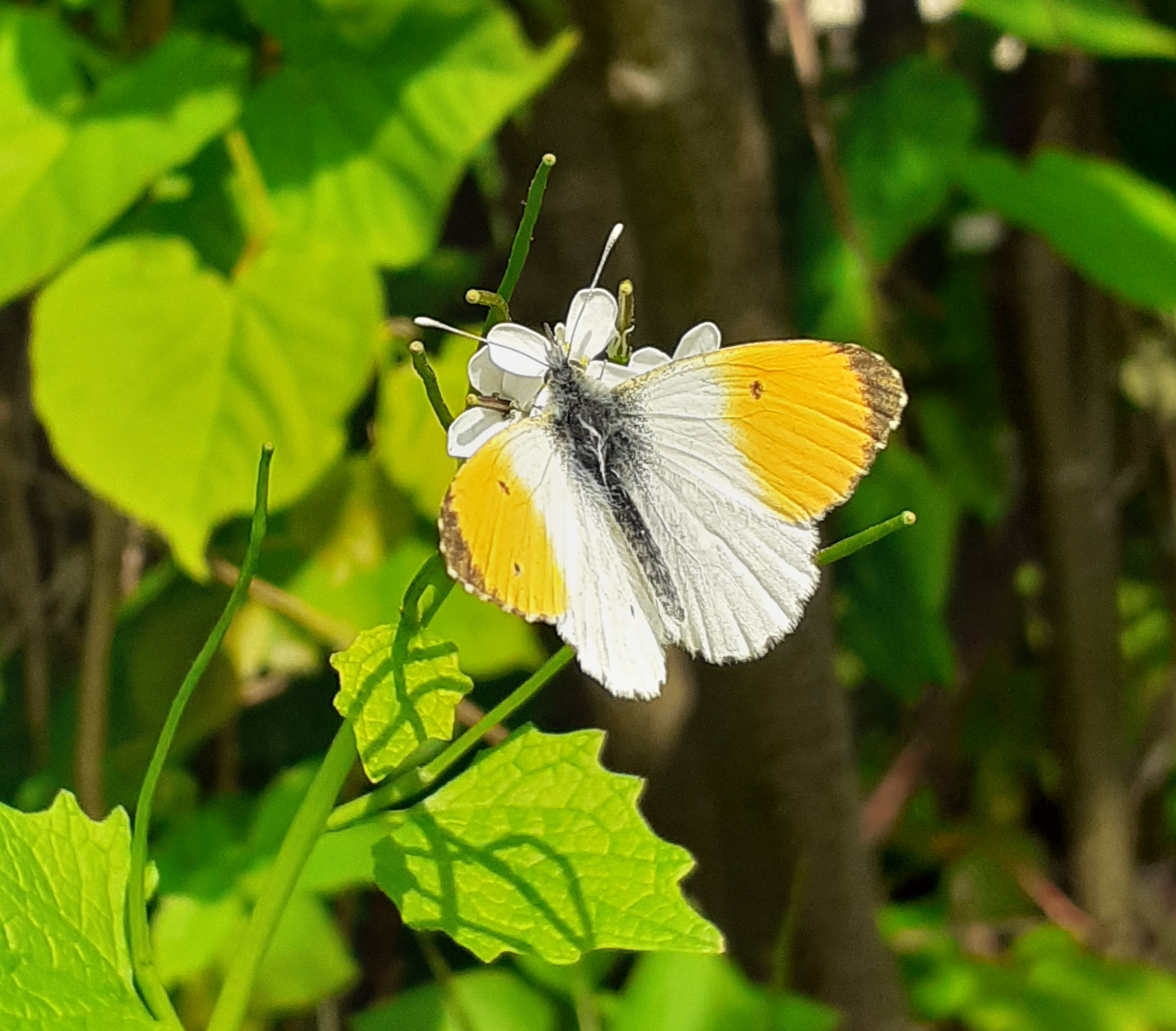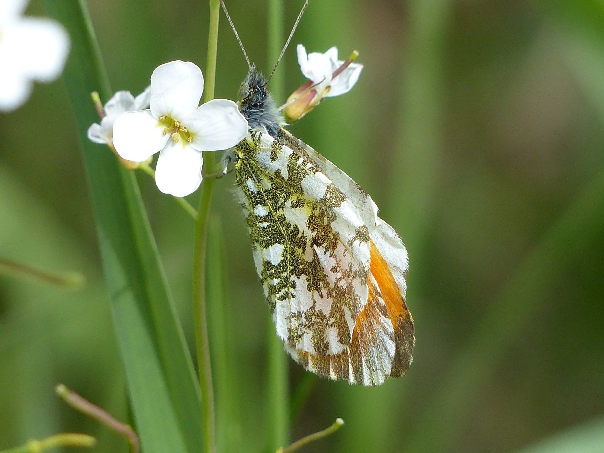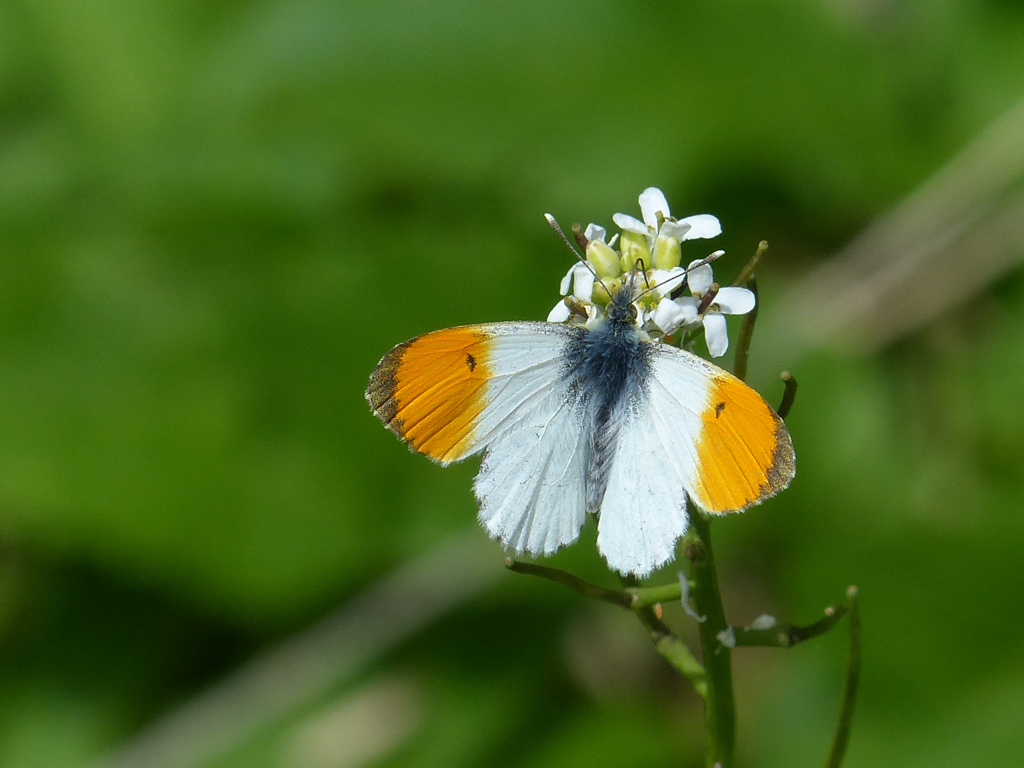 Aurorafalter (Anthocharis cardamines (Linnaeus, 1758)), Männchen, Blütenbesuch an Stellaria holostea, bei Nossen, April 2020 (© Andreas Hurtig)( Bild vergrößern)