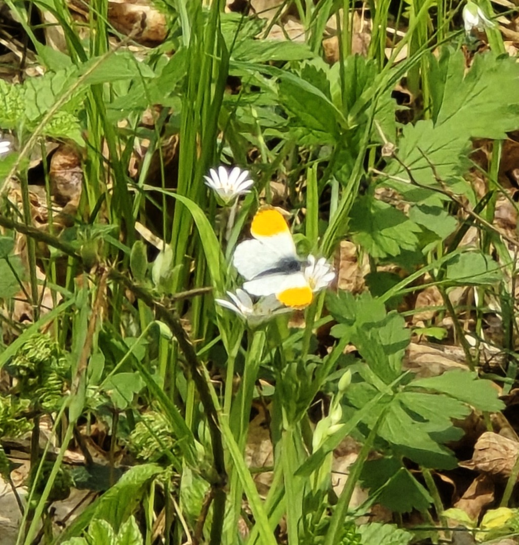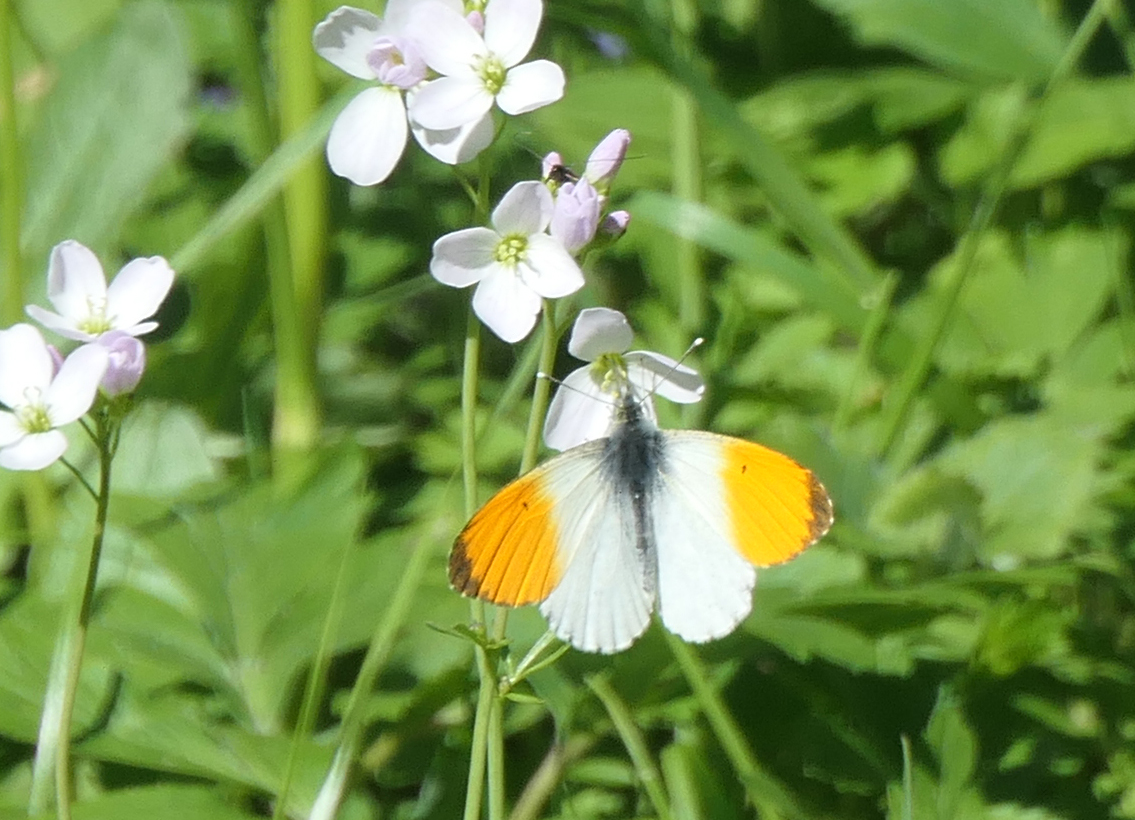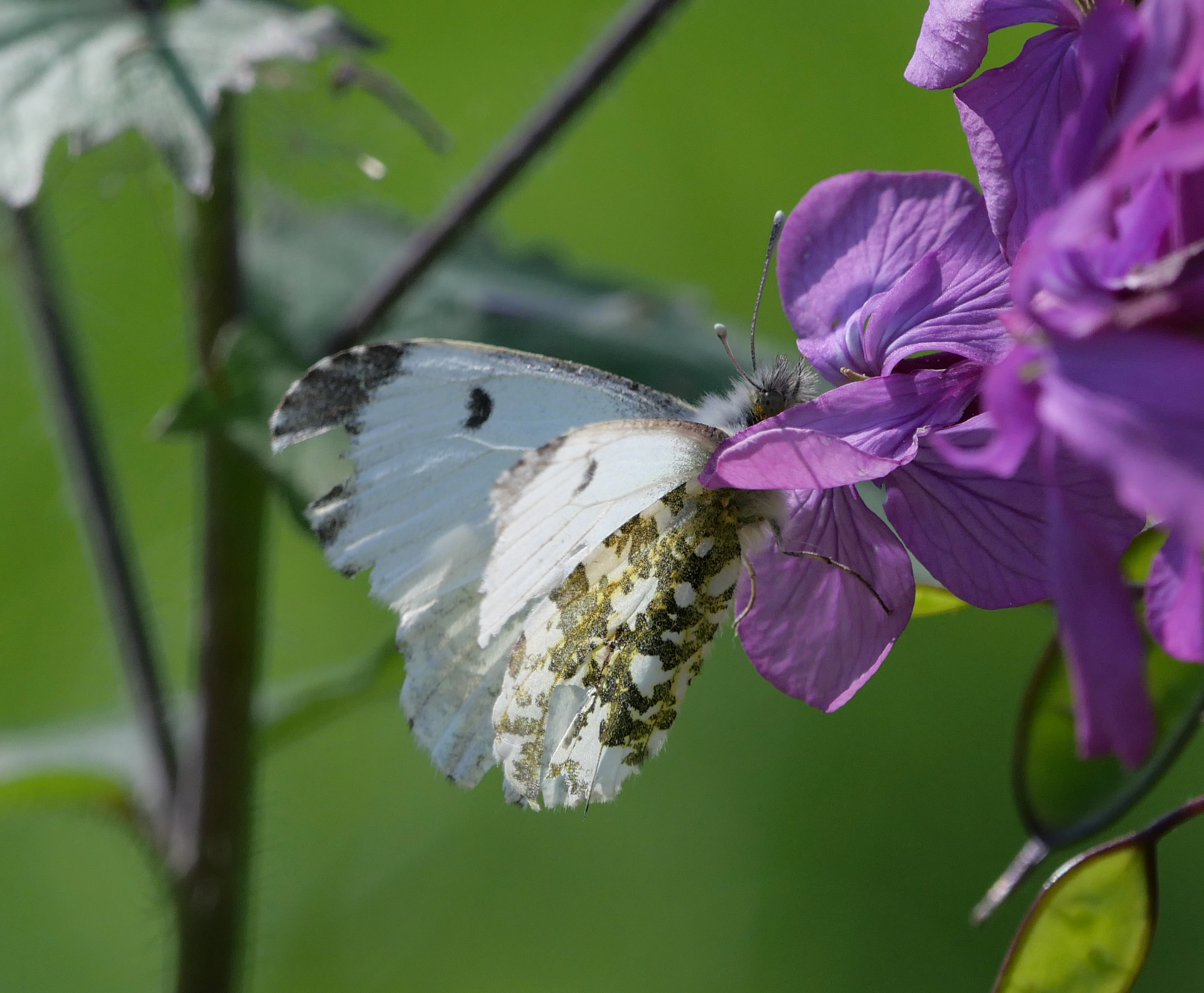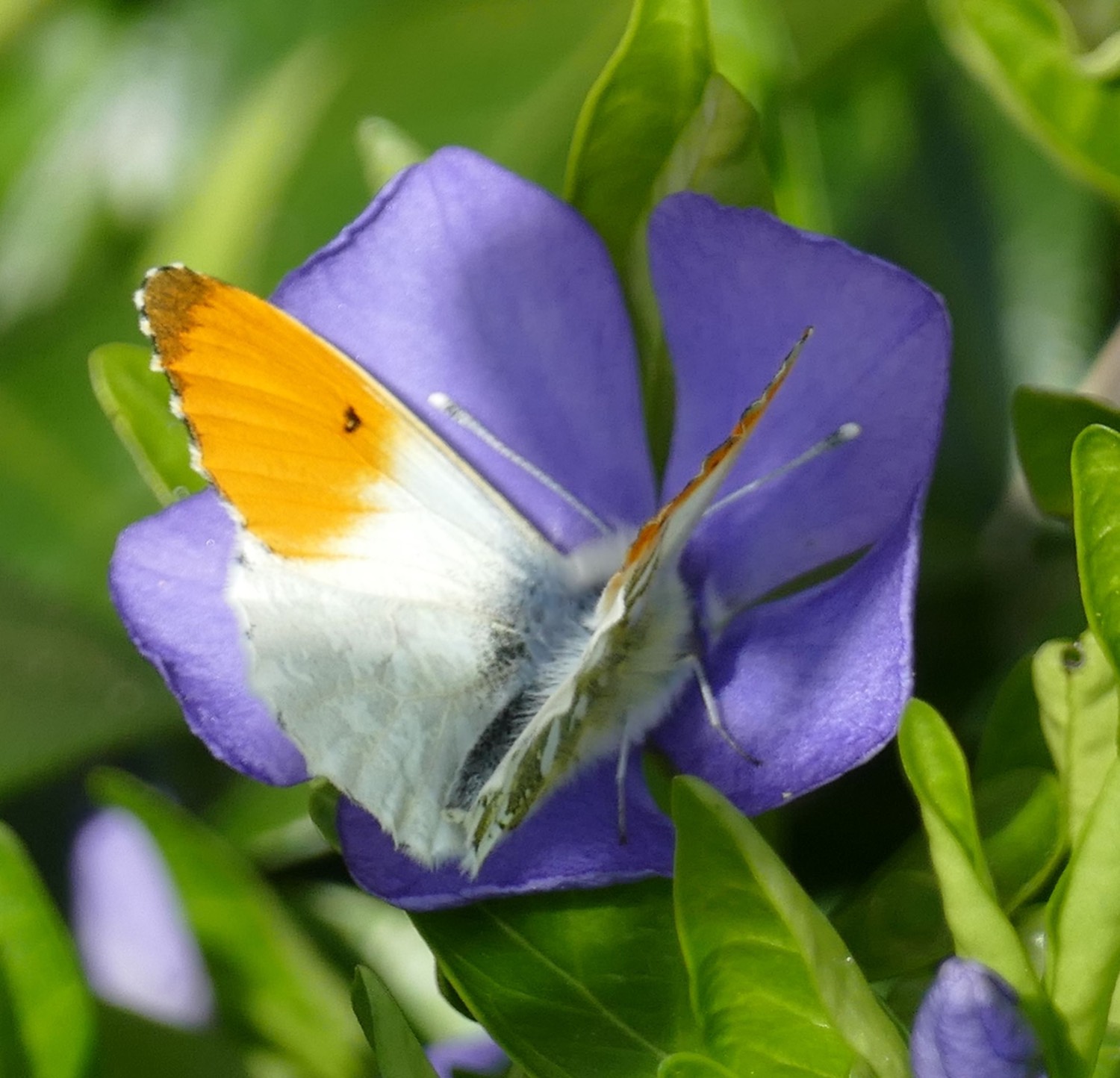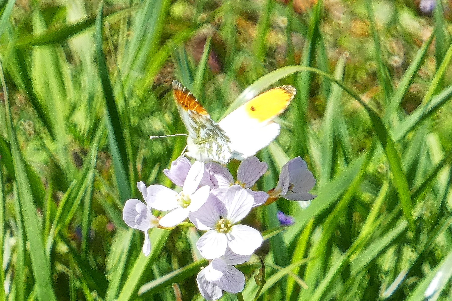 Aurorafalter (Anthocharis cardamines (Linnaeus, 1758)), Männchen, Blütenbesuch an Stellaria holostea, bei Nossen, April 2020 (© Andreas Hurtig)( Bild vergrößern)