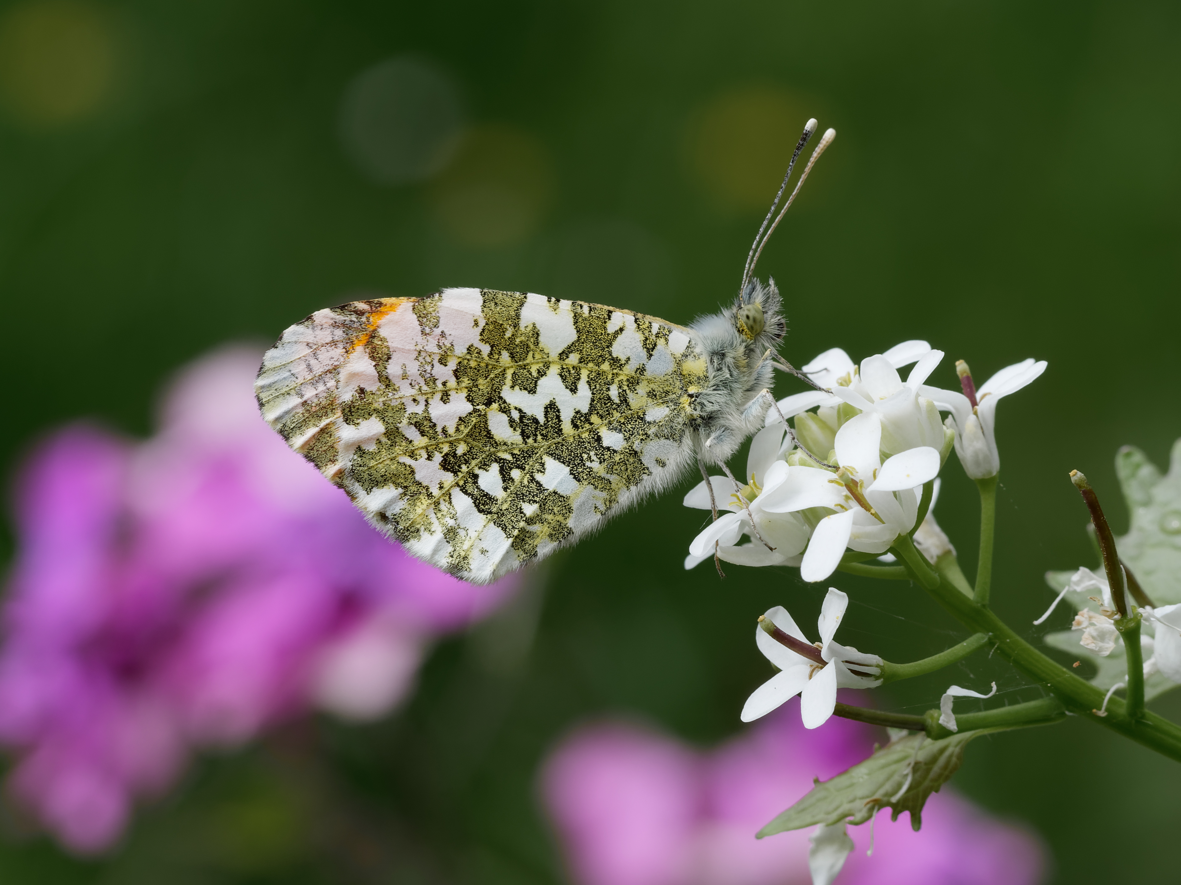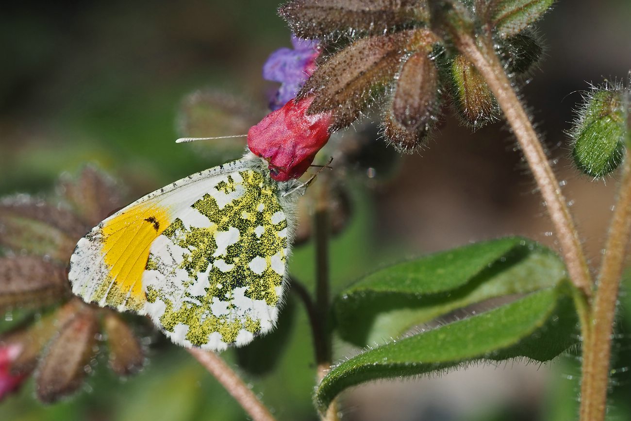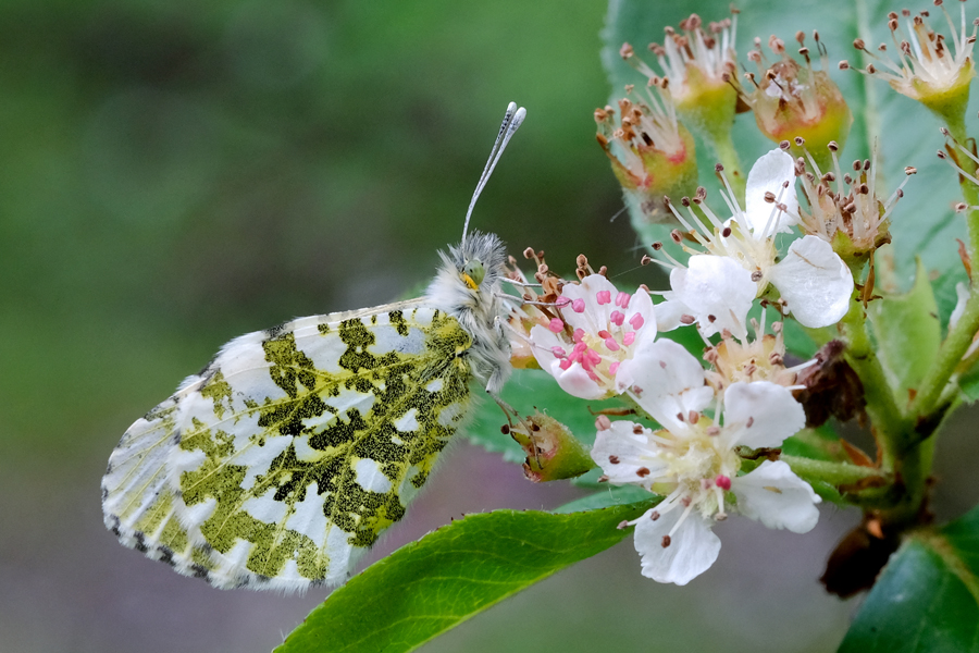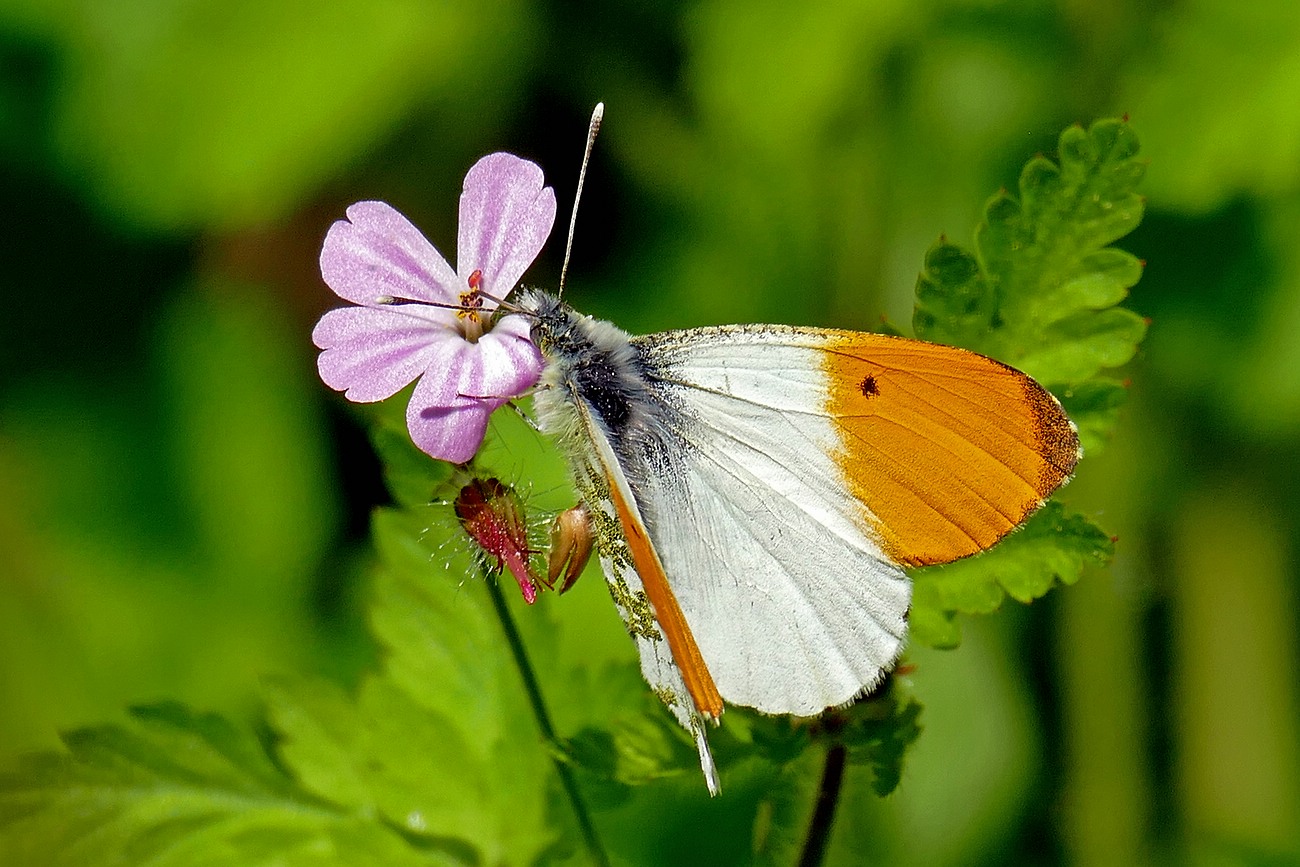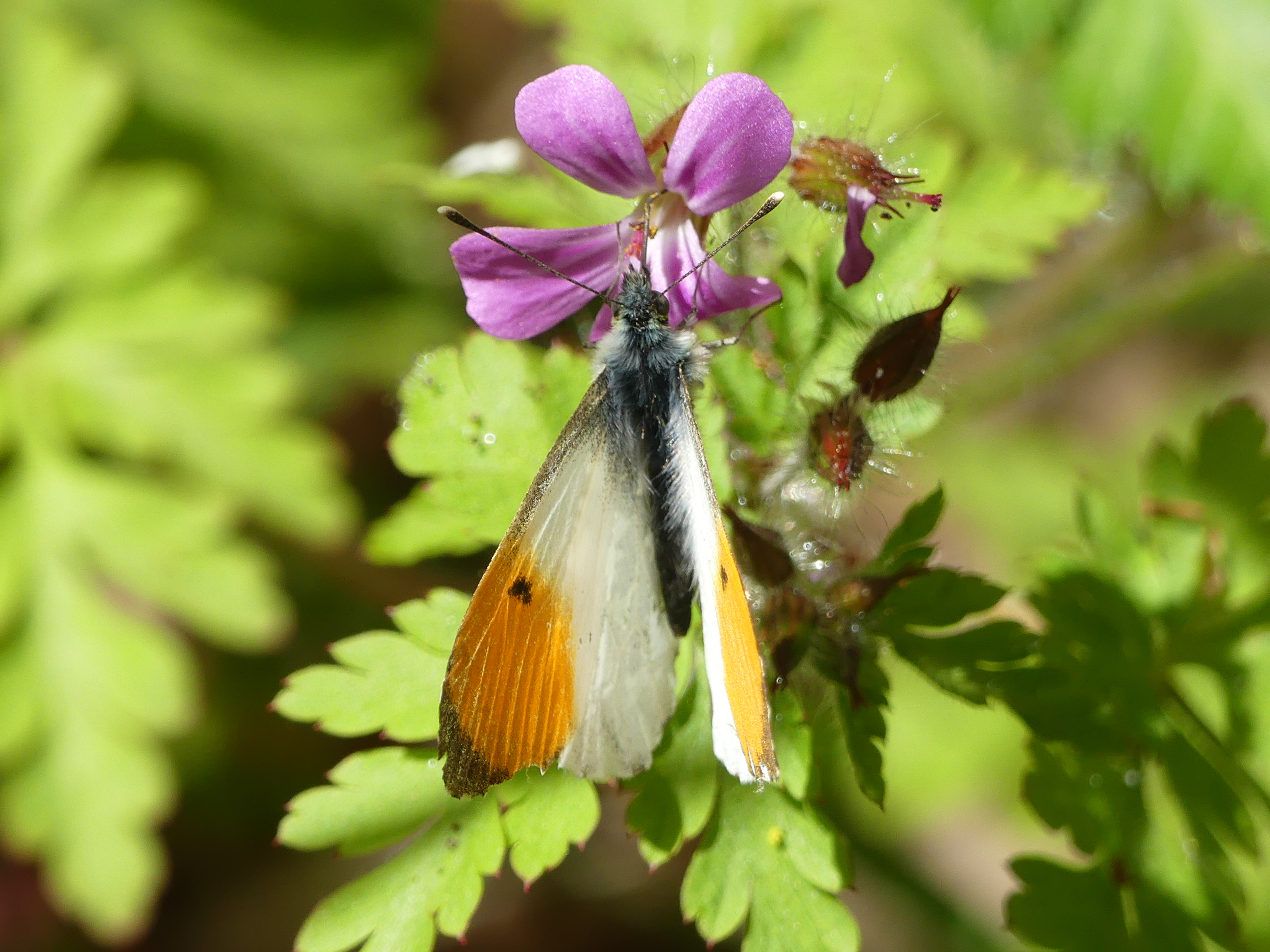 Aurorafalter (Anthocharis cardamines (Linnaeus, 1758)), Männchen, Blütenbesuch an Stellaria holostea, bei Nossen, April 2020
