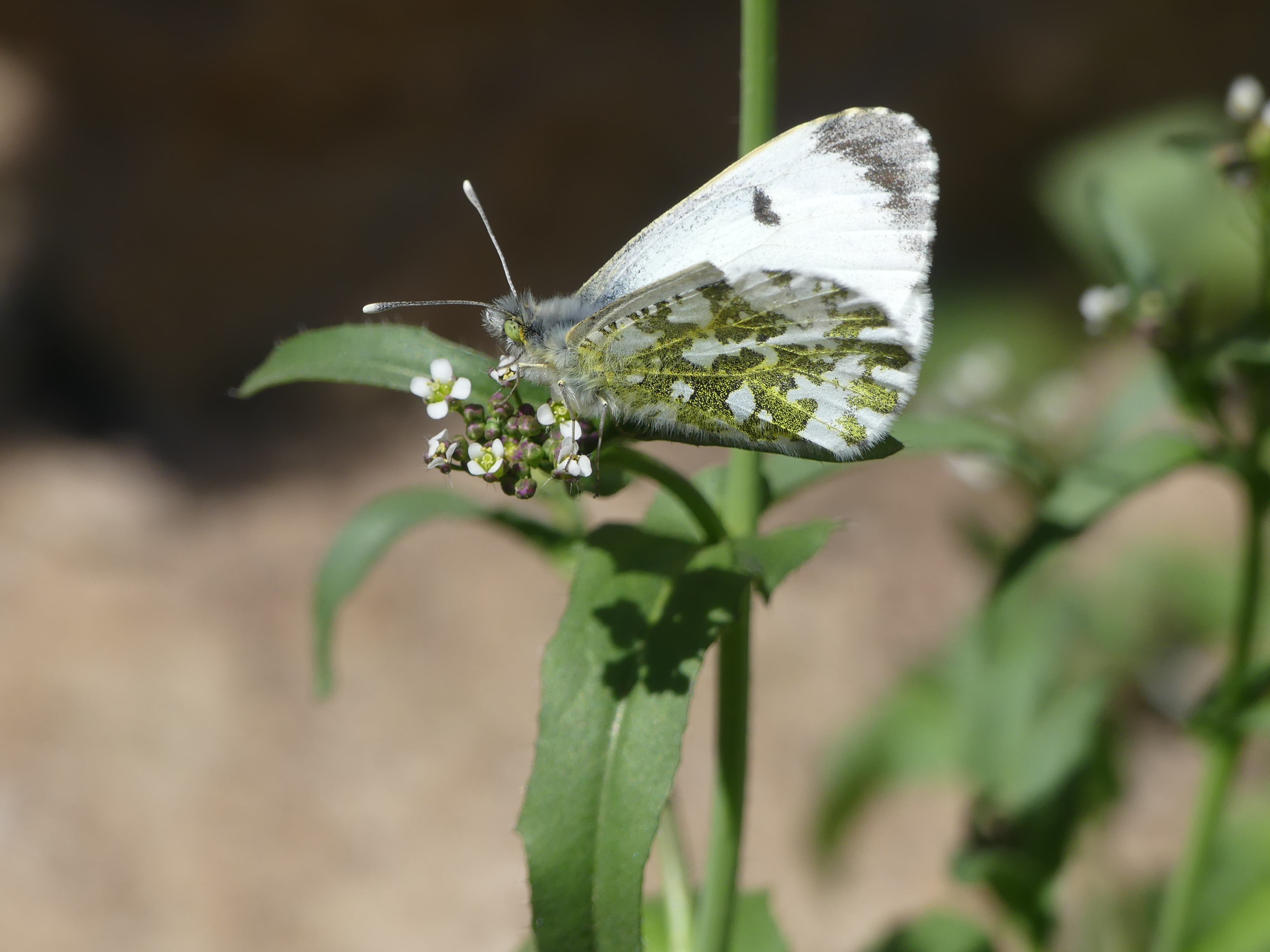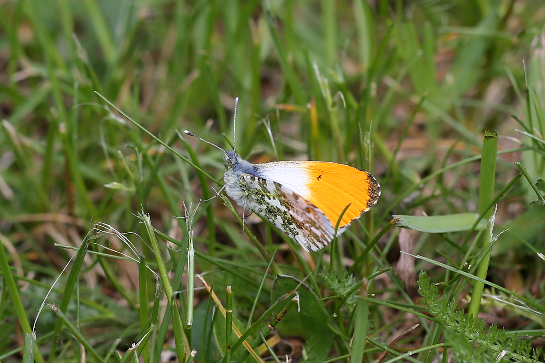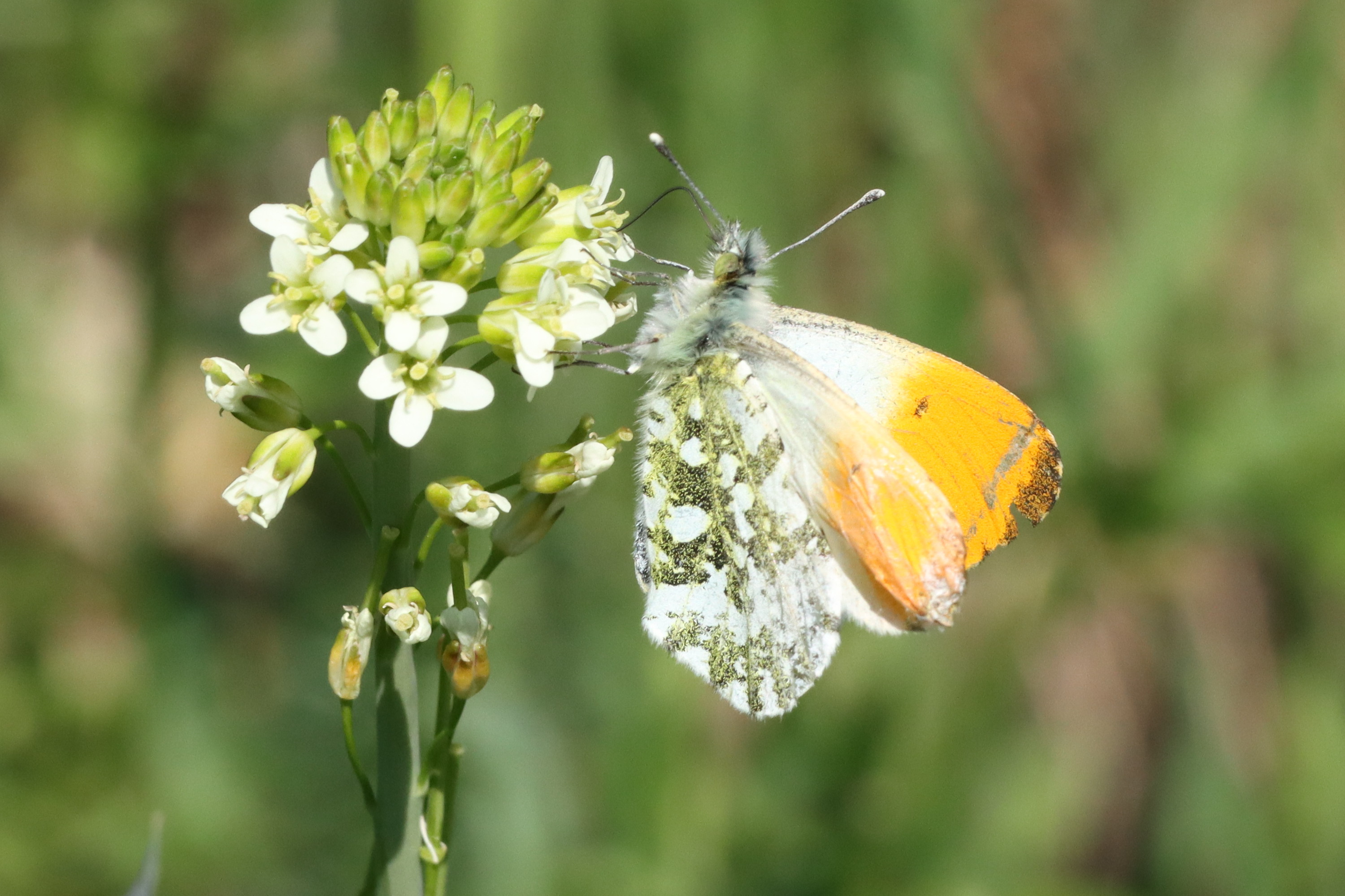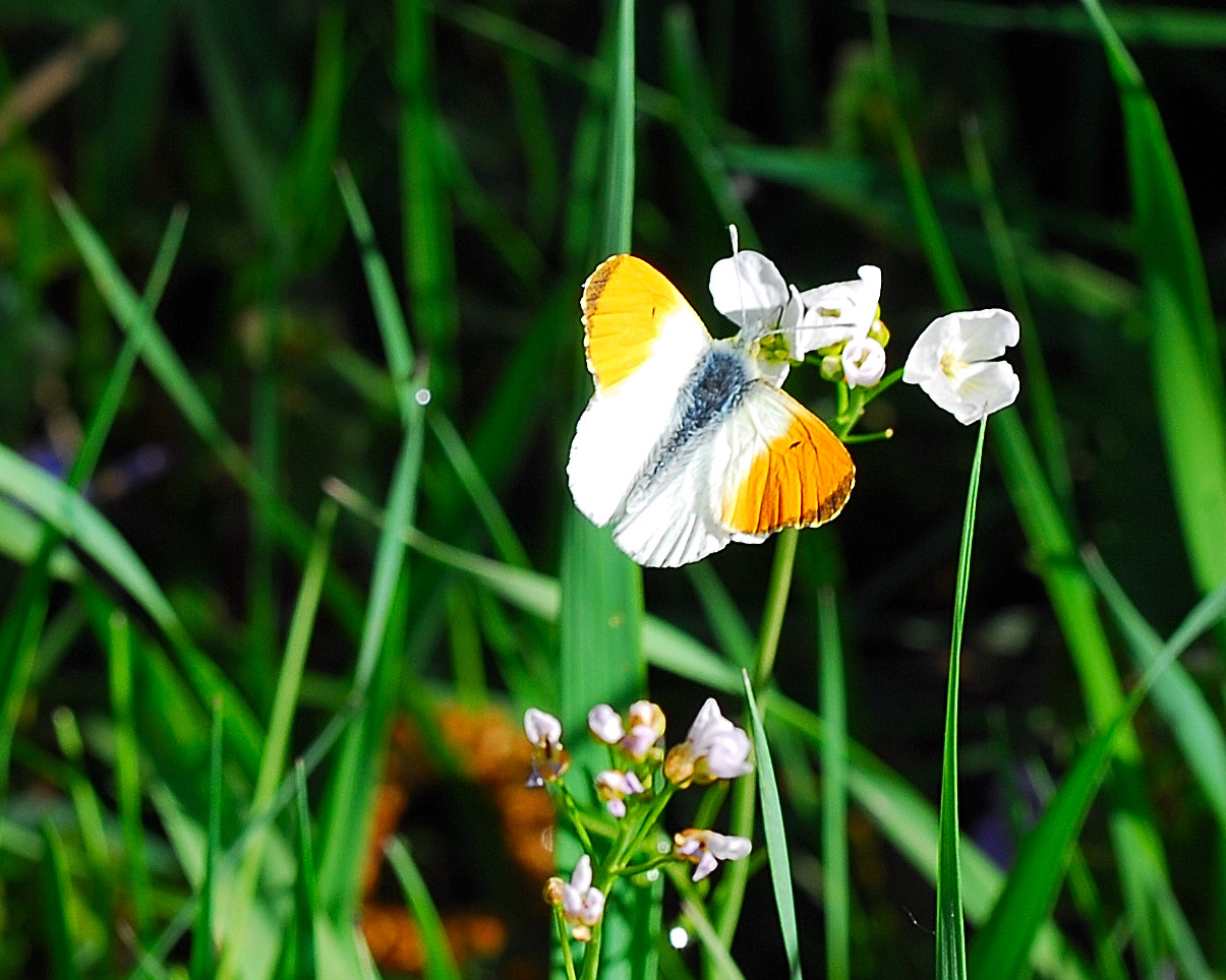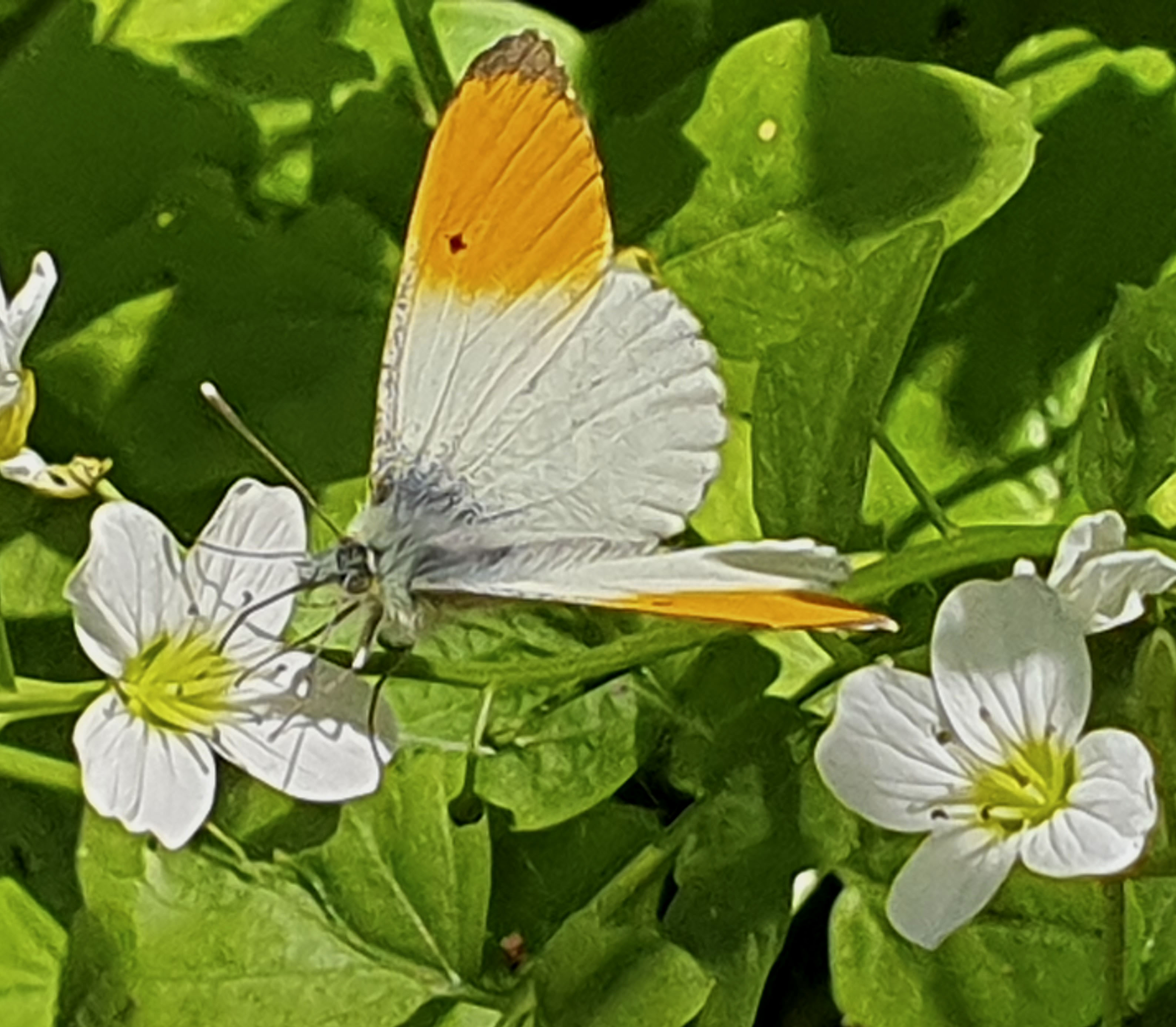 Aurorafalter (Anthocharis cardamines (Linnaeus, 1758)), Männchen, Blütenbesuch an Stellaria holostea, bei Nossen, April 2020