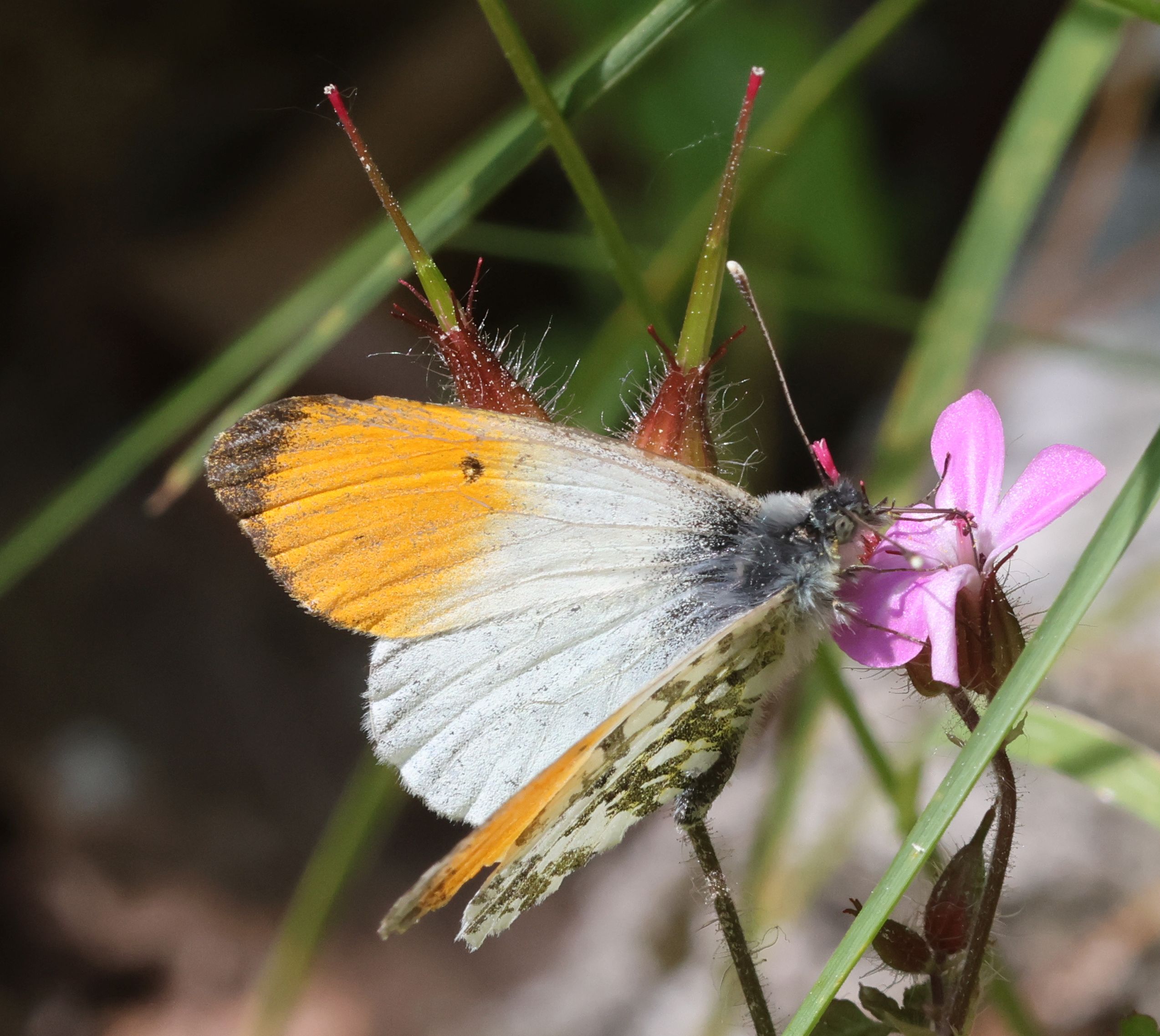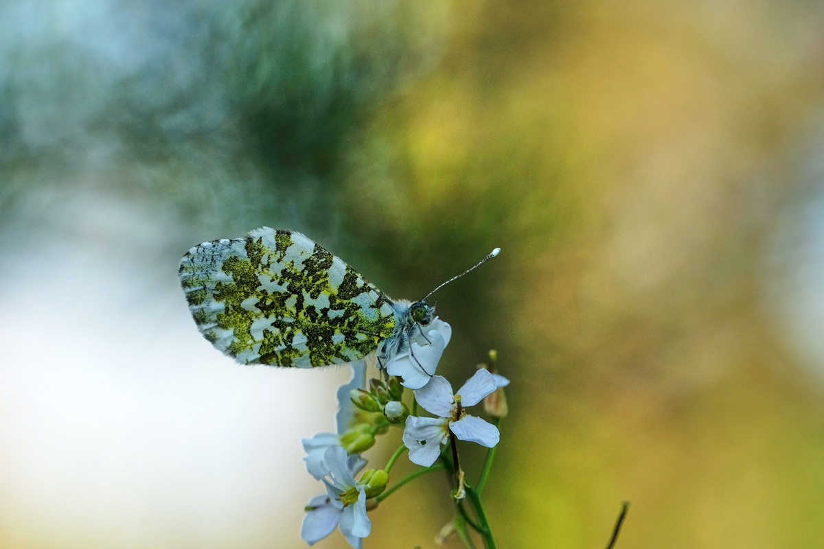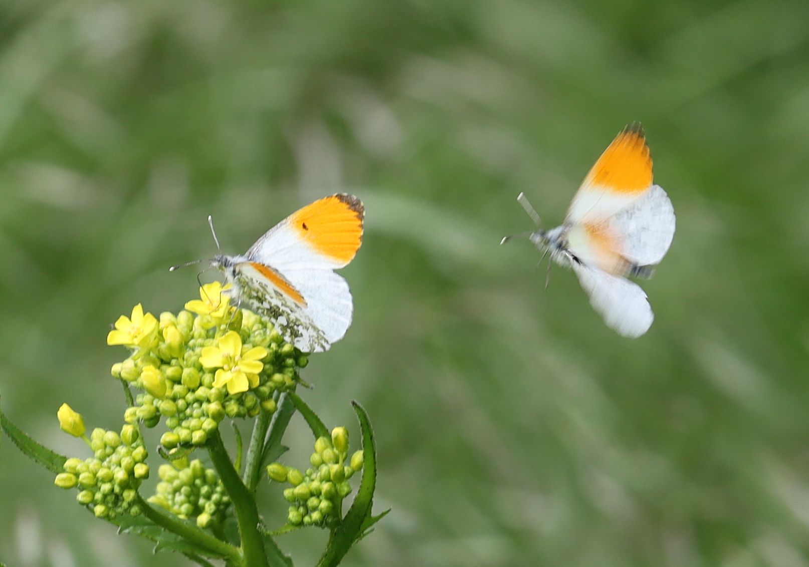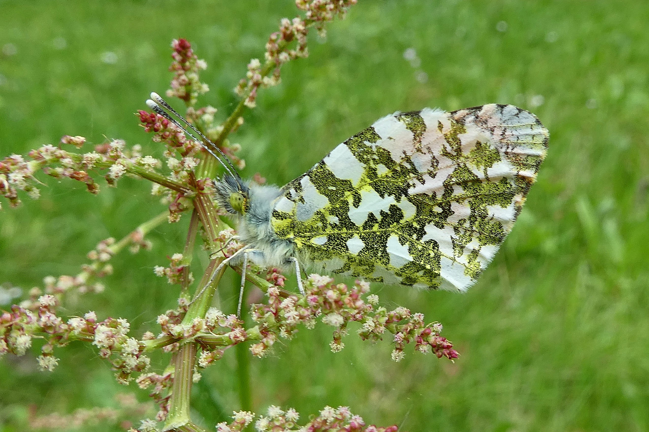 Aurorafalter (Anthocharis cardamines (Linnaeus, 1758)), Männchen, Blütenbesuch an Stellaria holostea, bei Nossen, April 2020