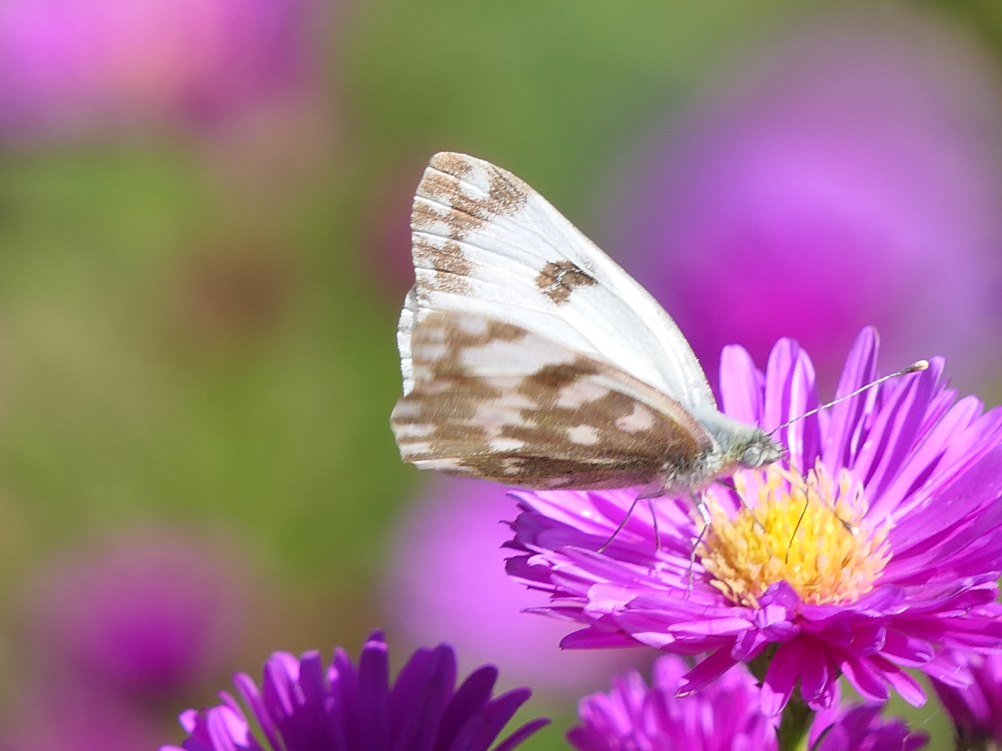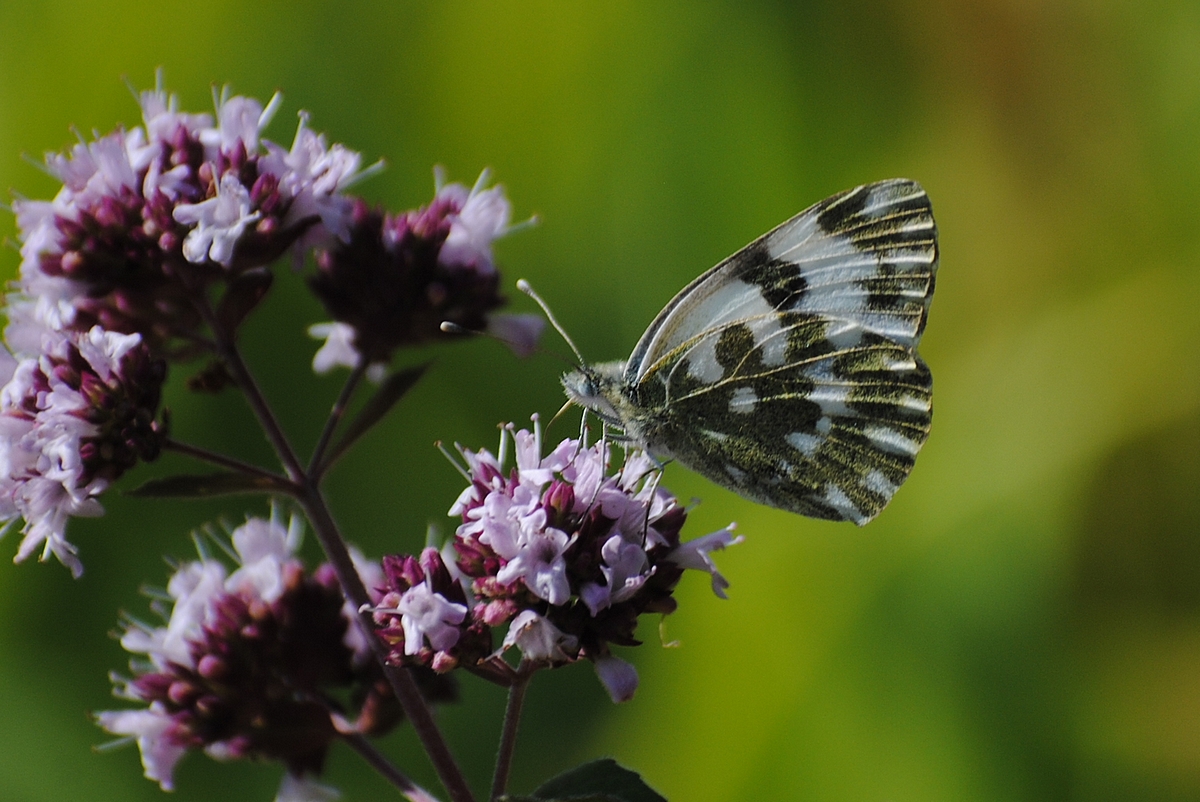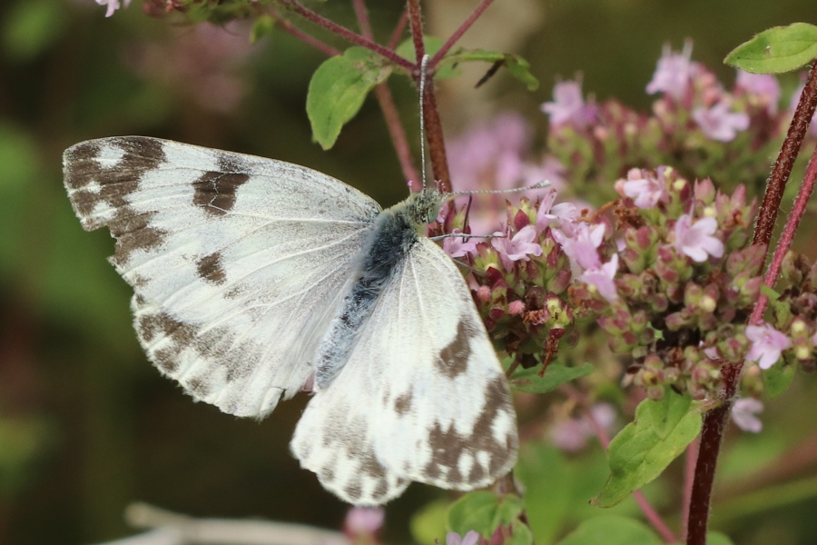 Resedaweißling, seit Juli 18 Gast im Garten in Borsdorf an Sommerflieder oder Oregano. Aktuell am 26.7.2019.
