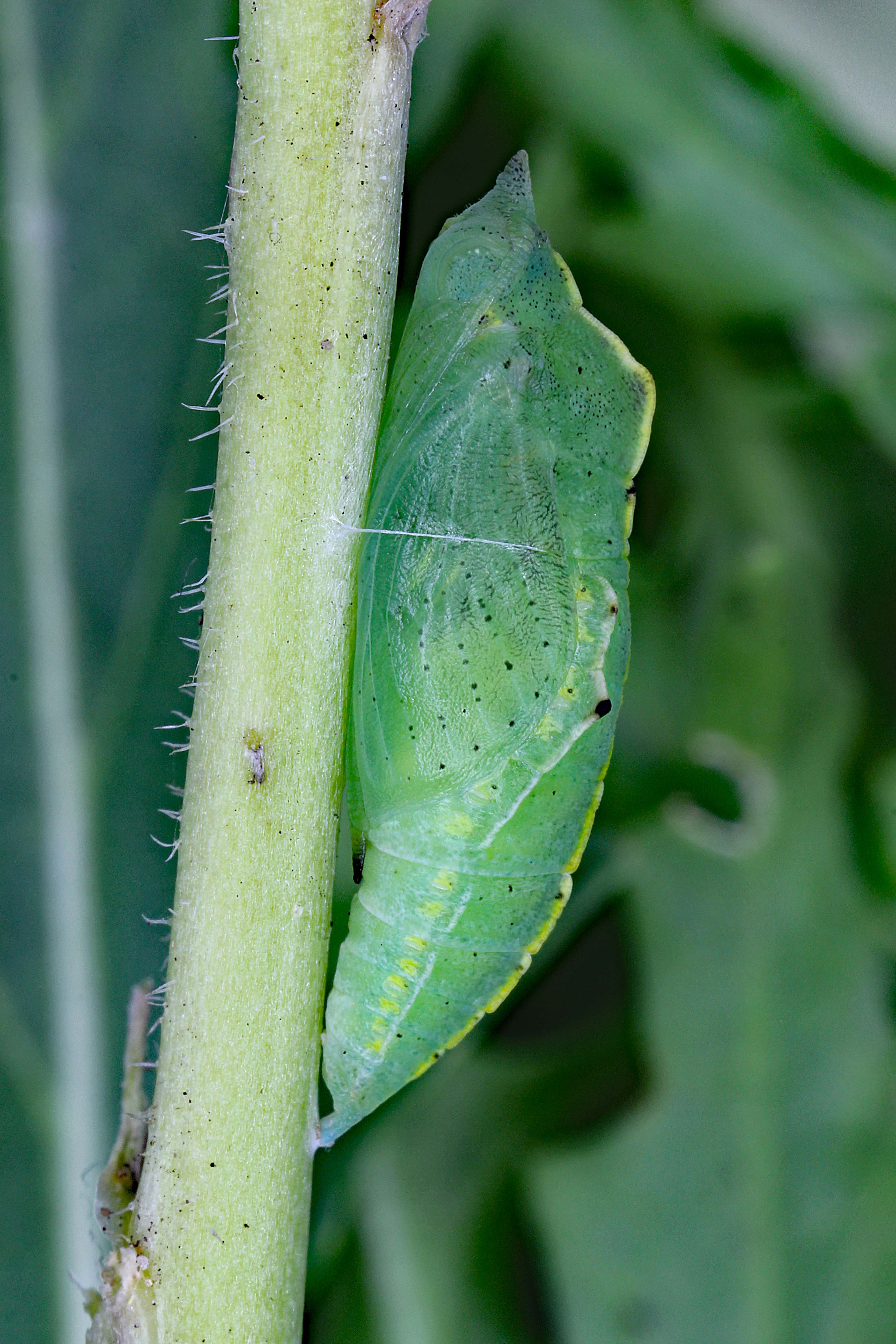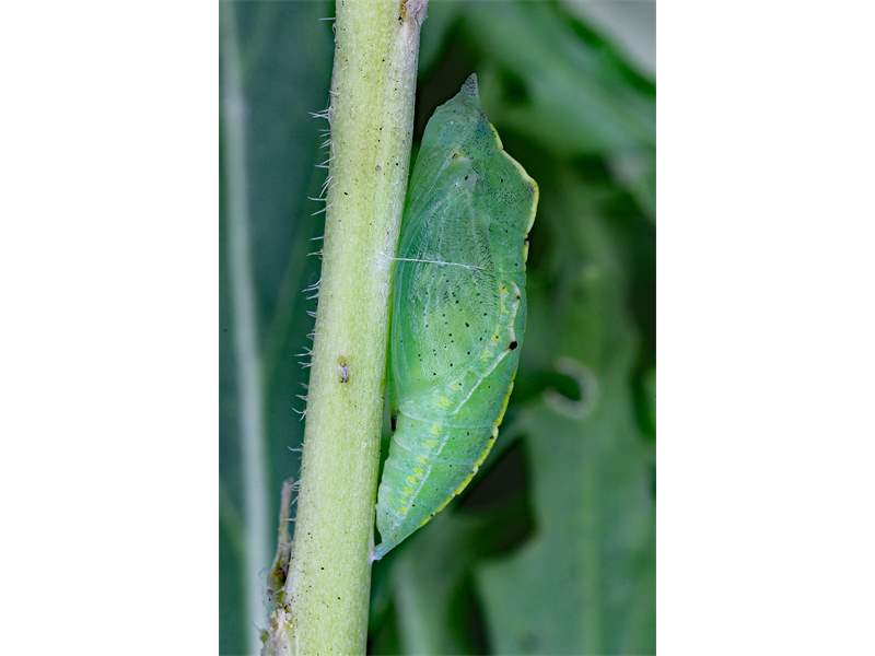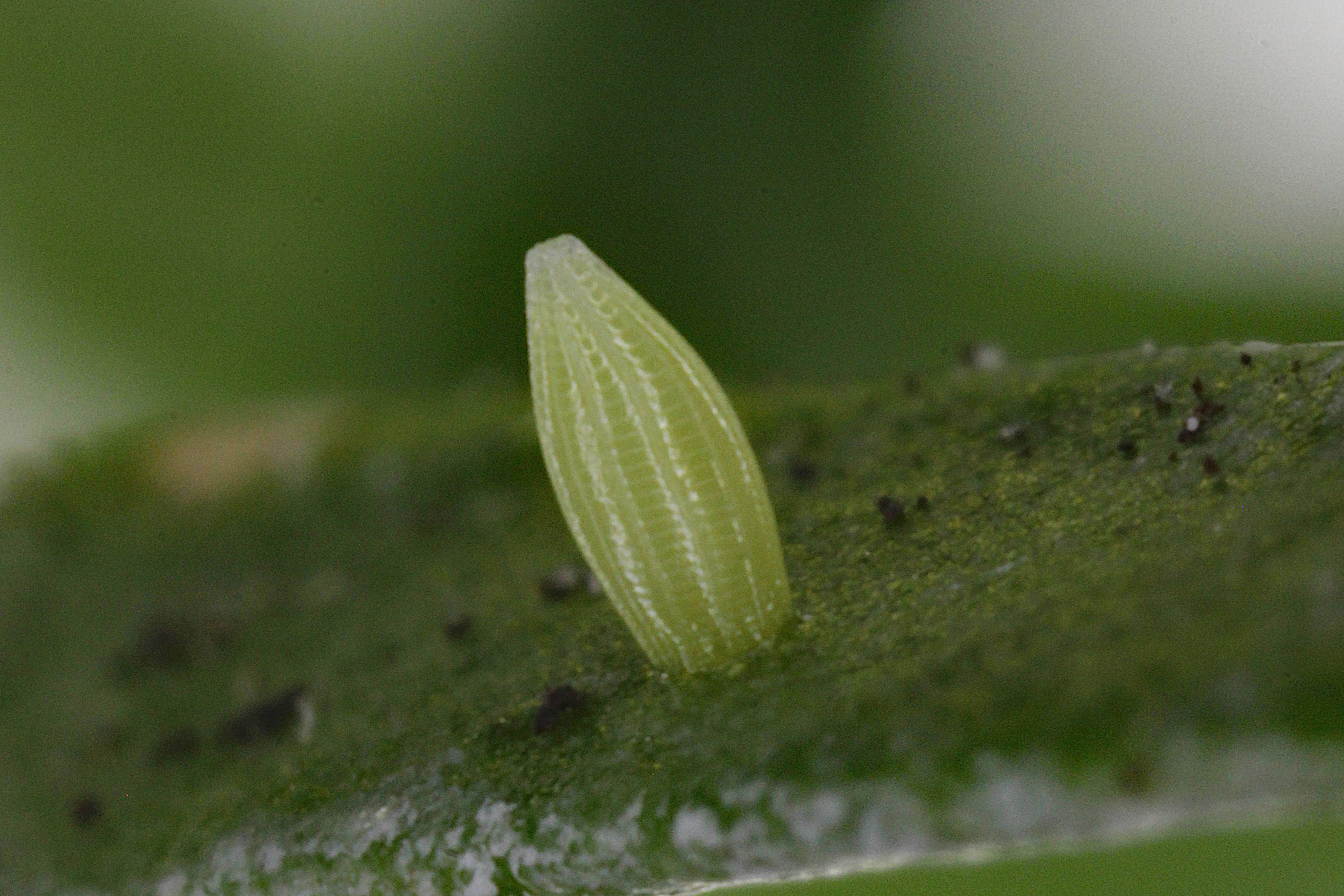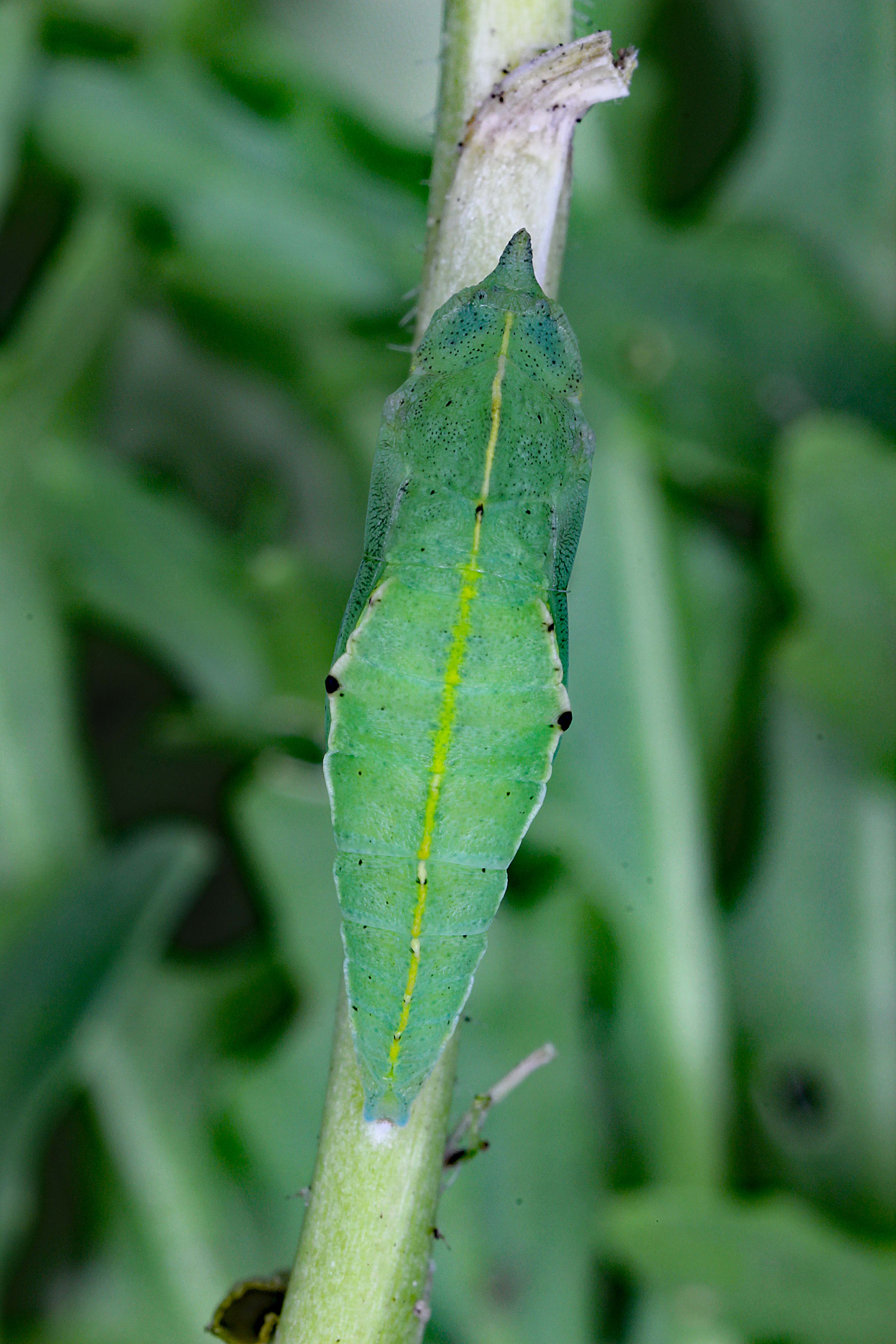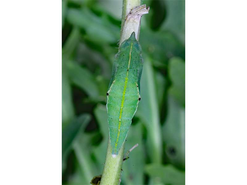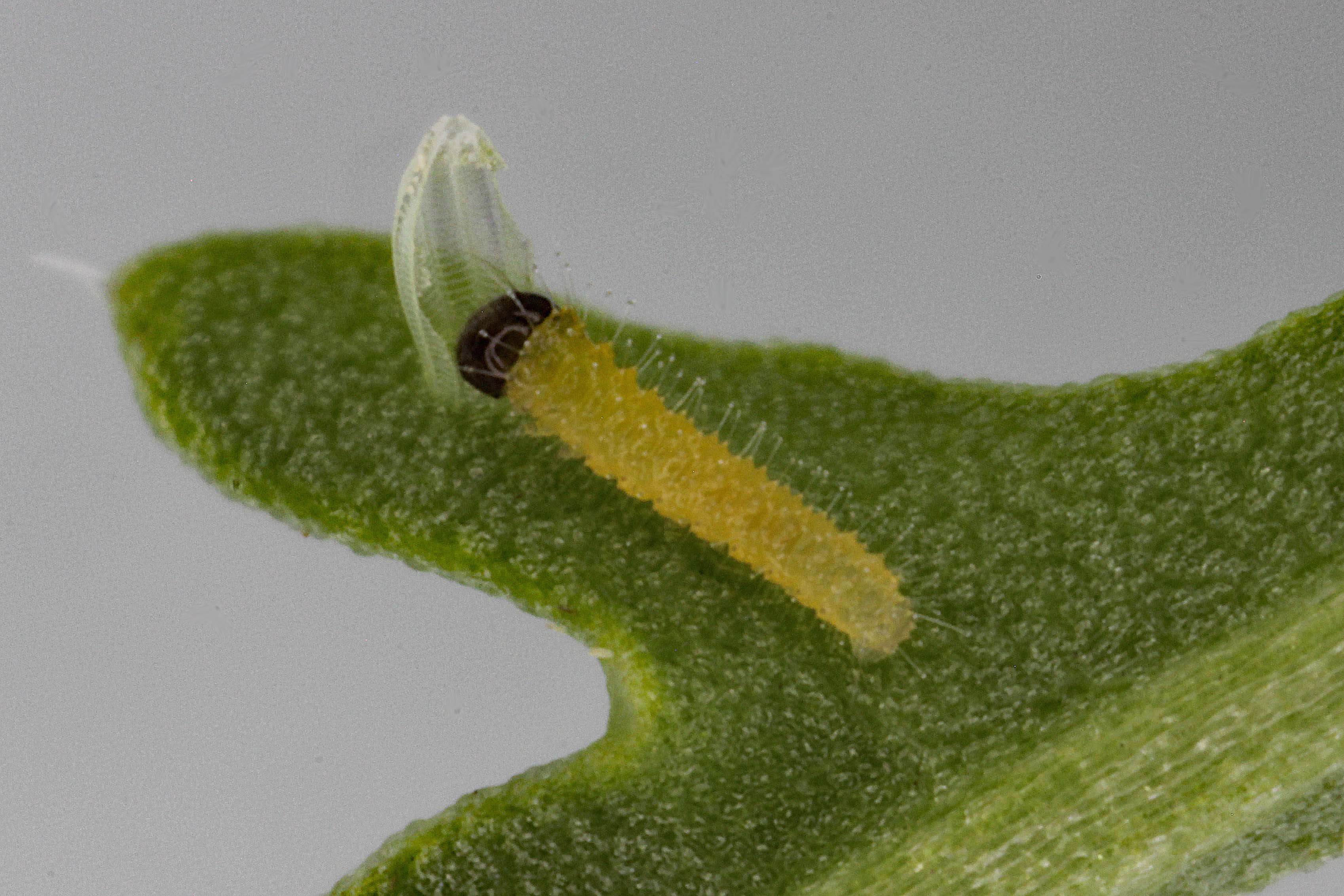 Karstweißling, Hoyerswerda 2019. Die frisch geschlüpfte Larve frisst ihre Eihülle