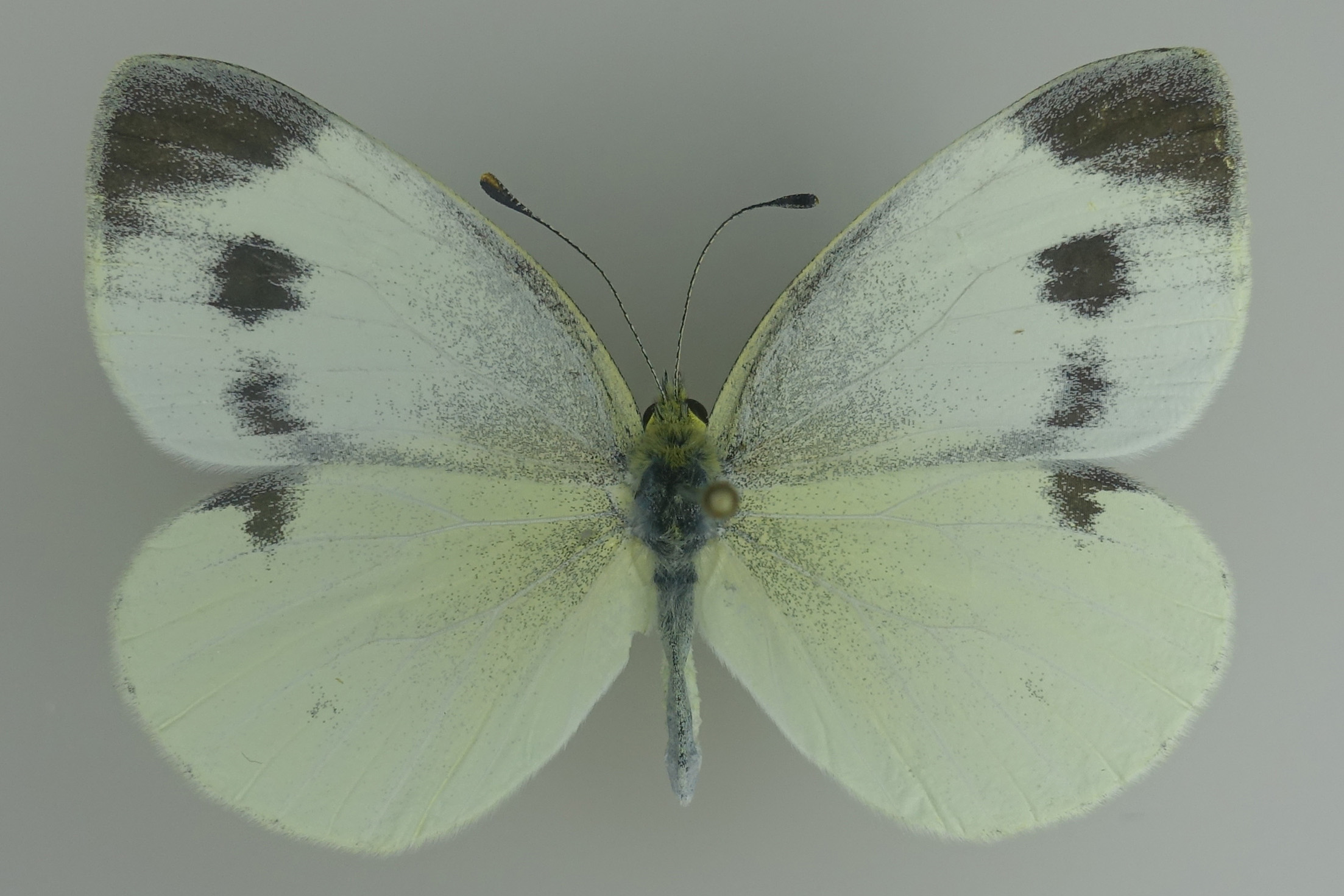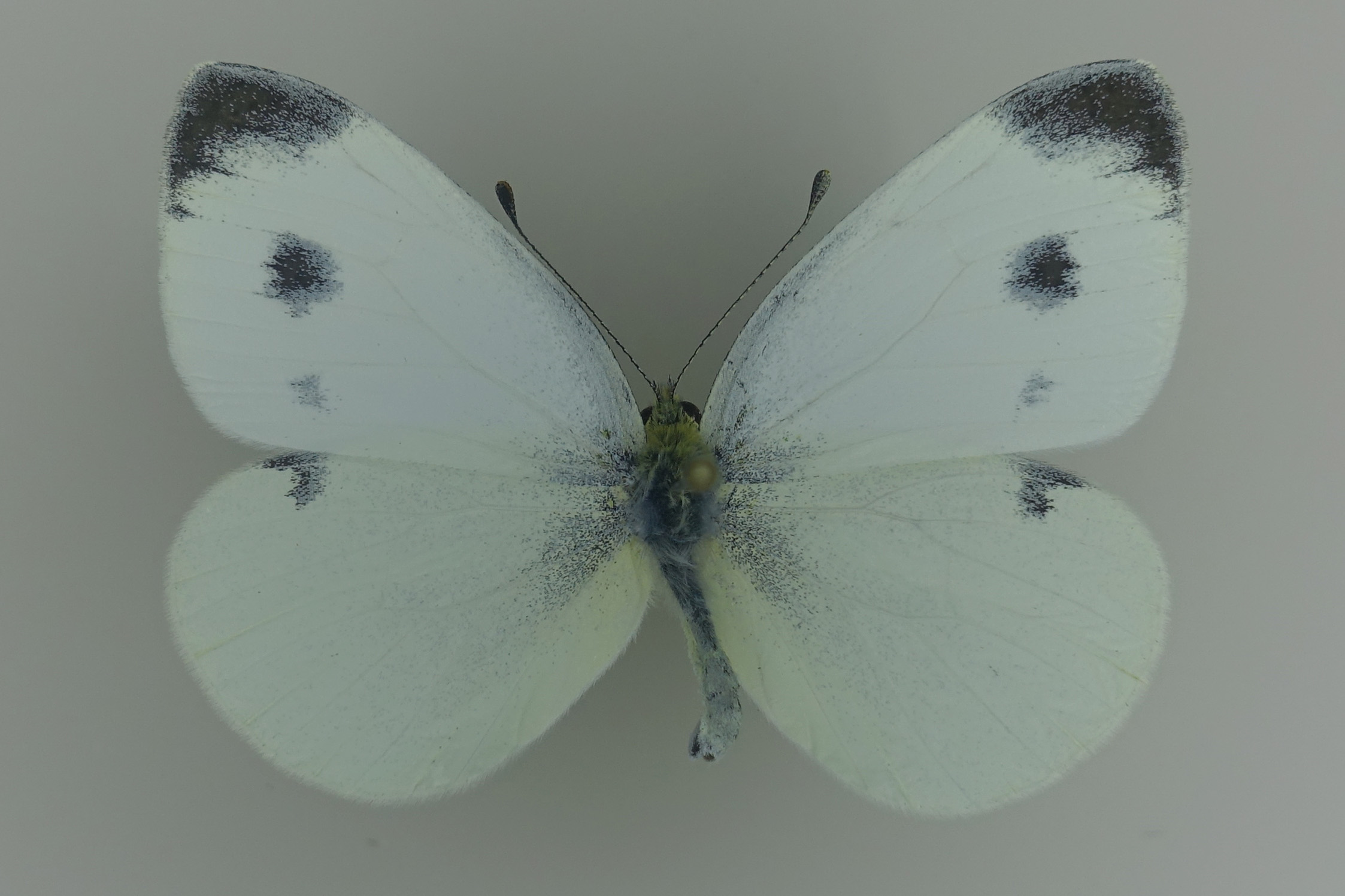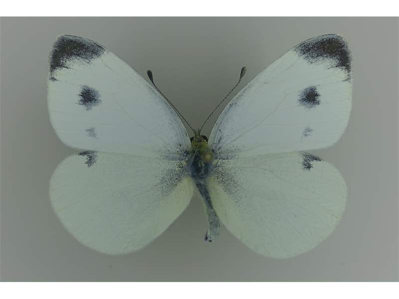 Flügeloberseiten weiß, auf dem Vorderflügel der Apikalfleck schwarz, oft im Zentrum kreisförmig dunkler, sein Innenrand gestuft und am Flügelaußenrand verlängert bis auf Höhe der Oberkante des Diskalfleckes; letzterer etwa rechteckig. Hinterflügel mit halbmondförmigem Vorderrandfleck, der nach Außen hohl ist.