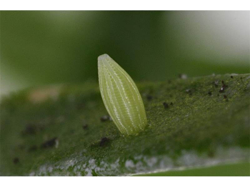 Karstweißling, Hoyerswerda 2019. Die frisch geschlüpfte Larve frisst ihre Eihülle (© Thomas Sobczyk)( Bild vergrößern)
