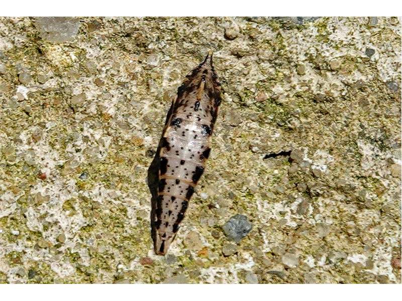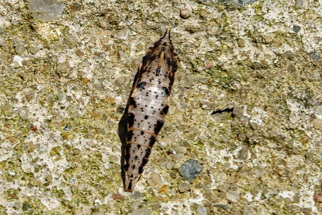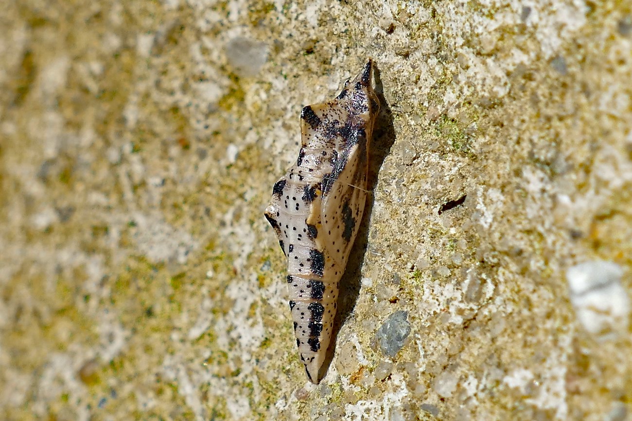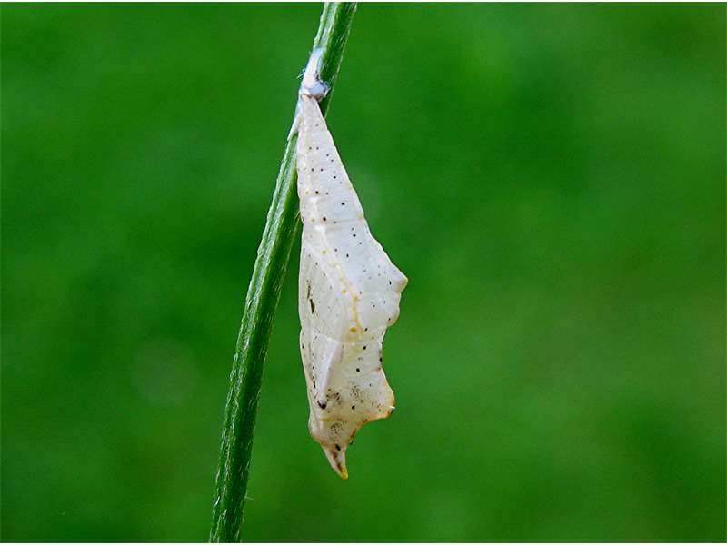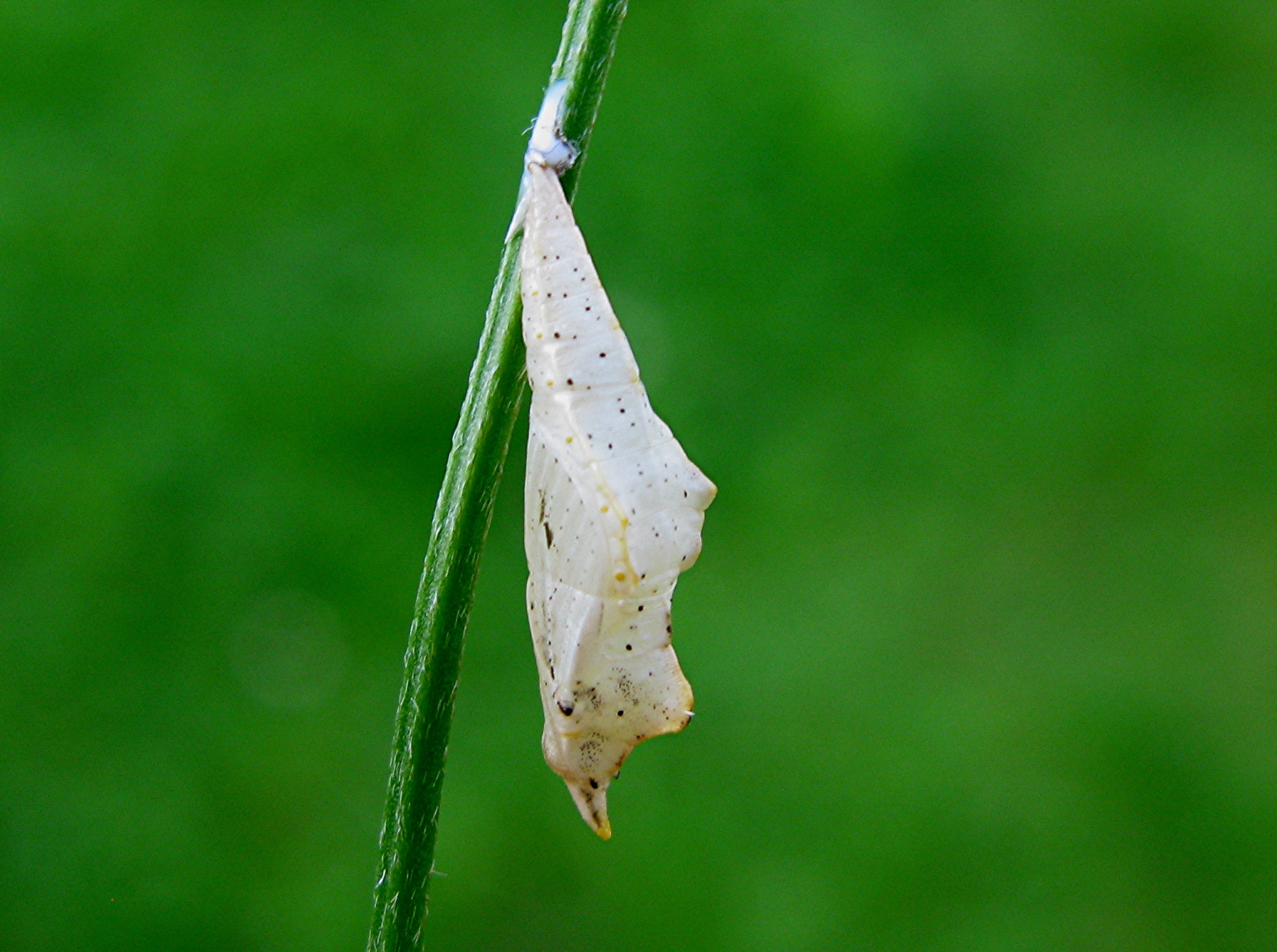 Puppe eines Grünaderweißlings, gefunden am 20.9.2009 in Lengenfeld/Stadtrand. Das Bild erweckt den Eindruck einer Stürzpuppe. Die Puppe des Grünaderweißlings ist wie bei allen anderen Weißlingen jedoch eine Gürtelpuppe, die mit einer seidenen Schlinge und mit dem Kopf nach oben an einem Stängel o.ä. befestigt ist. Der Gürtel der Puppe auf dem Foto ist vermutlich gerissen, sodass sie der Schwerkraft folgend kopfabwärts hängt.