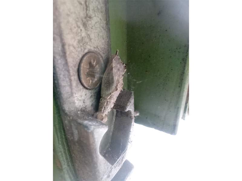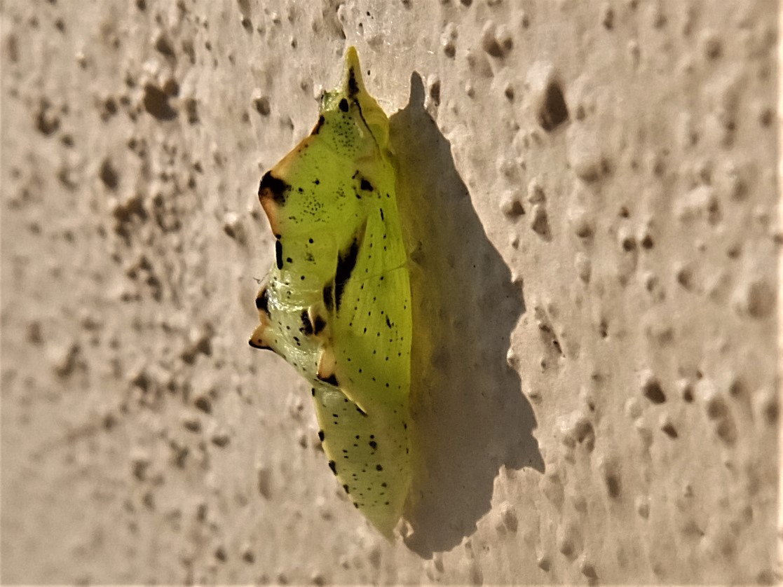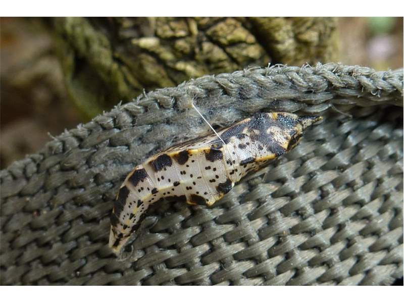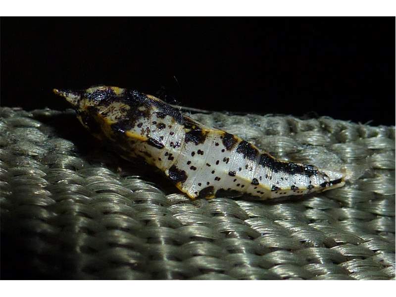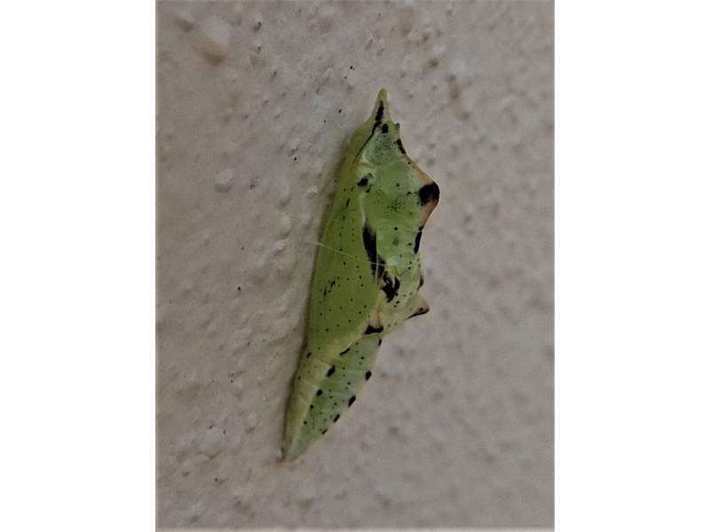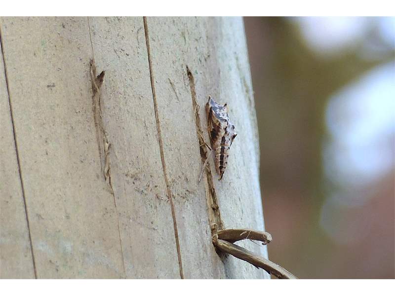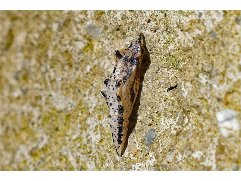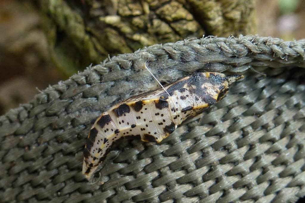 Puppe eines Grünaderweißlings, gefunden am 20.9.2009 in Lengenfeld/Stadtrand. Das Bild erweckt den Eindruck einer Stürzpuppe. Die Puppe des Grünaderweißlings ist wie bei allen anderen Weißlingen jedoch eine Gürtelpuppe, die mit einer seidenen Schlinge und mit dem Kopf nach oben an einem Stängel o.ä. befestigt ist. Der Gürtel der Puppe auf dem Foto ist vermutlich gerissen, sodass sie der Schwerkraft folgend kopfabwärts hängt.