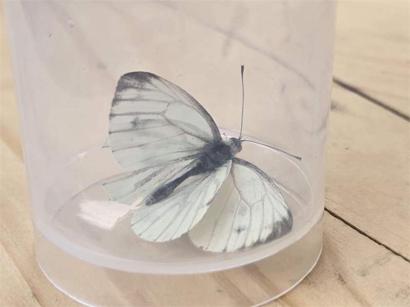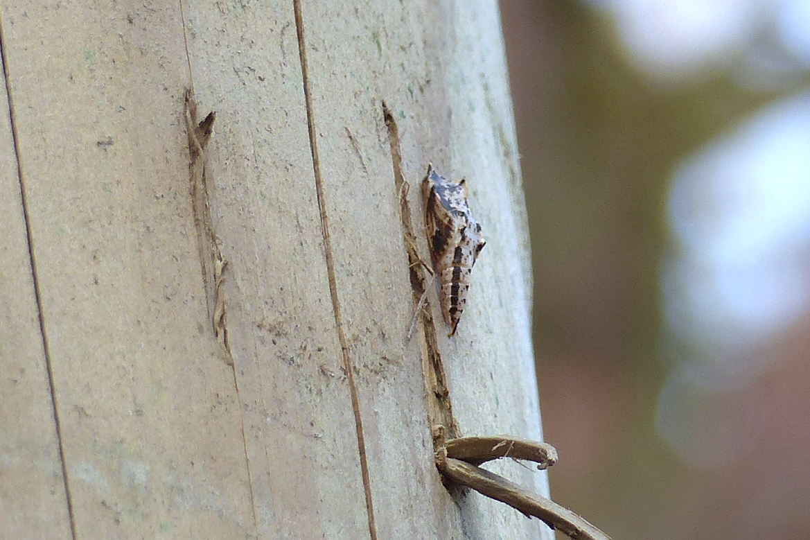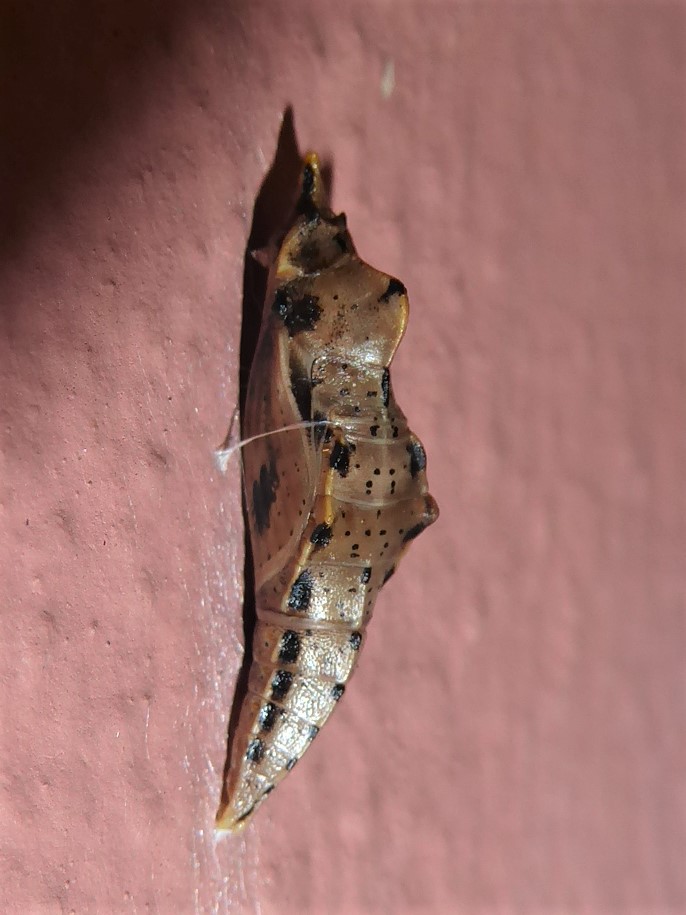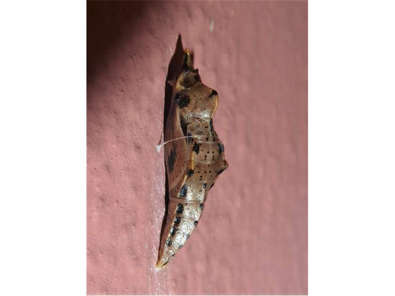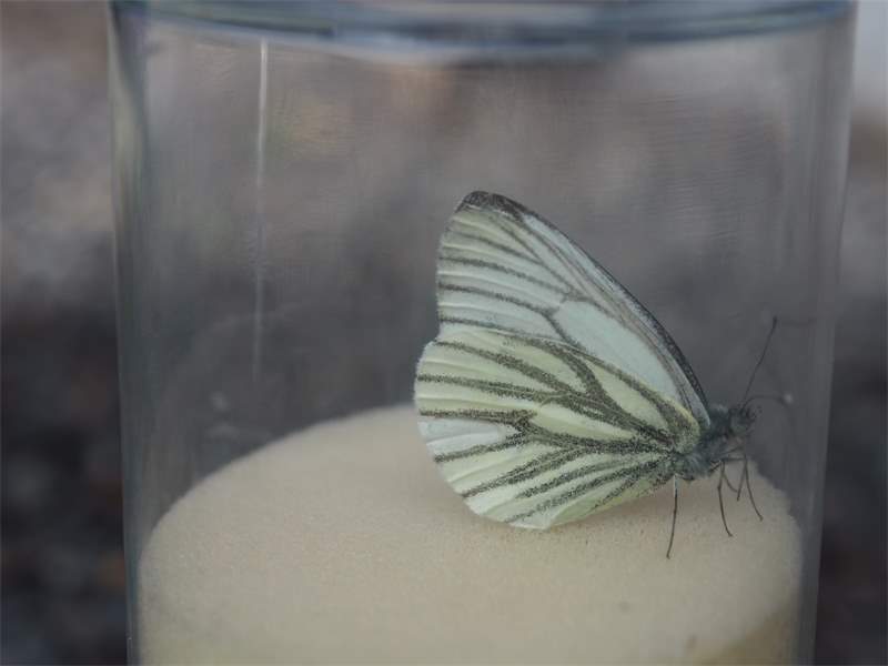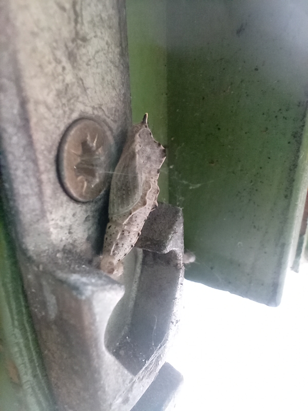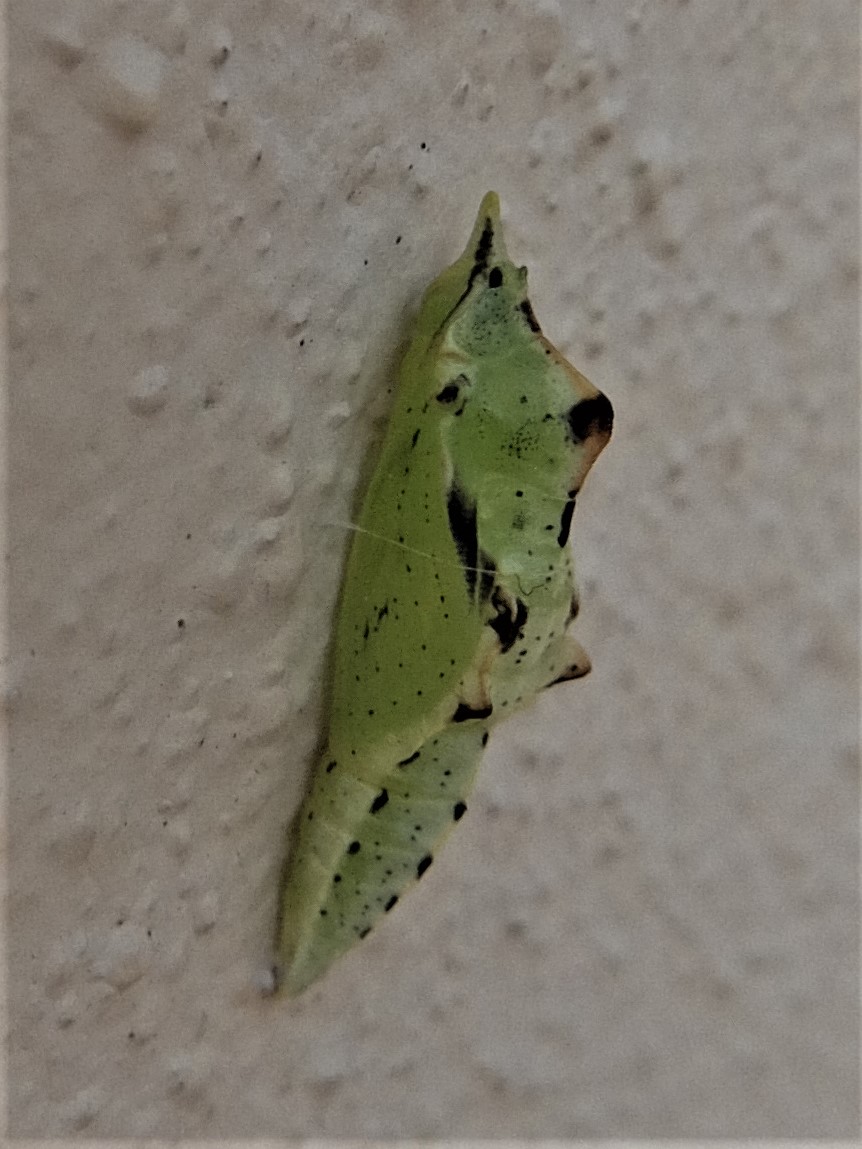 Puppe eines Grünaderweißlings, gefunden am 20.9.2009 in Lengenfeld/Stadtrand. Das Bild erweckt den Eindruck einer Stürzpuppe. Die Puppe des Grünaderweißlings ist wie bei allen anderen Weißlingen jedoch eine Gürtelpuppe, die mit einer seidenen Schlinge und mit dem Kopf nach oben an einem Stängel o.ä. befestigt ist. Der Gürtel der Puppe auf dem Foto ist vermutlich gerissen, sodass sie der Schwerkraft folgend kopfabwärts hängt.