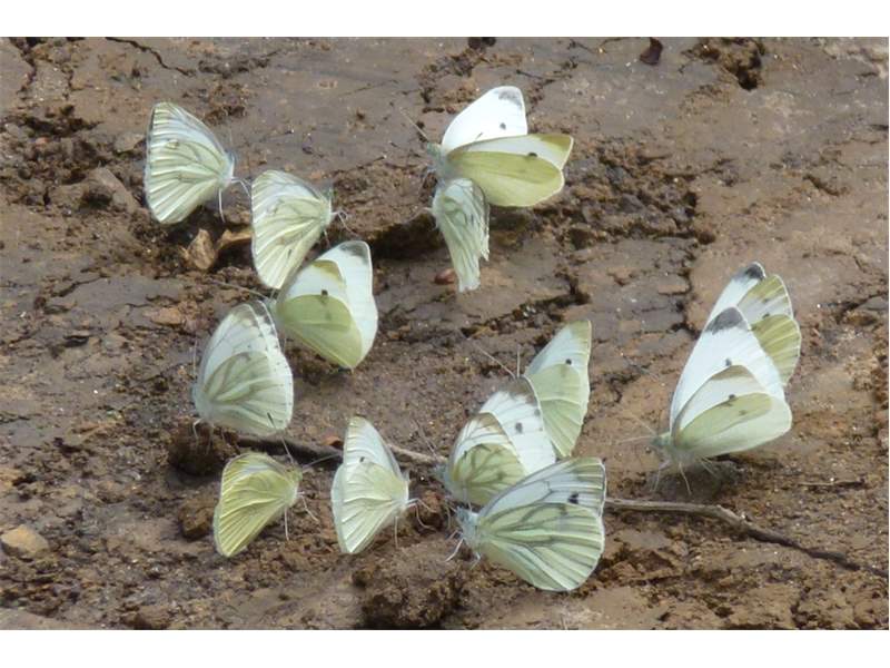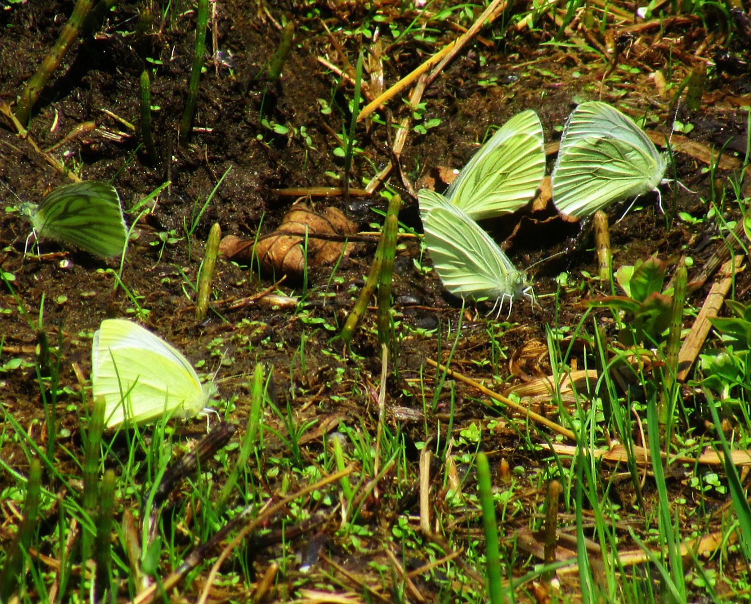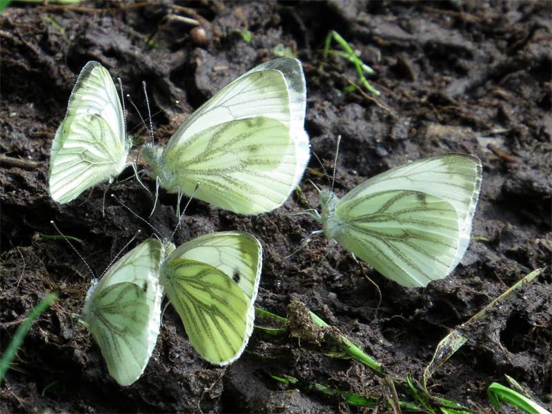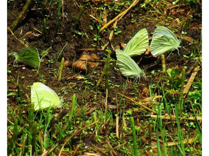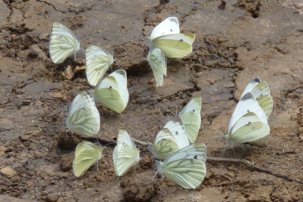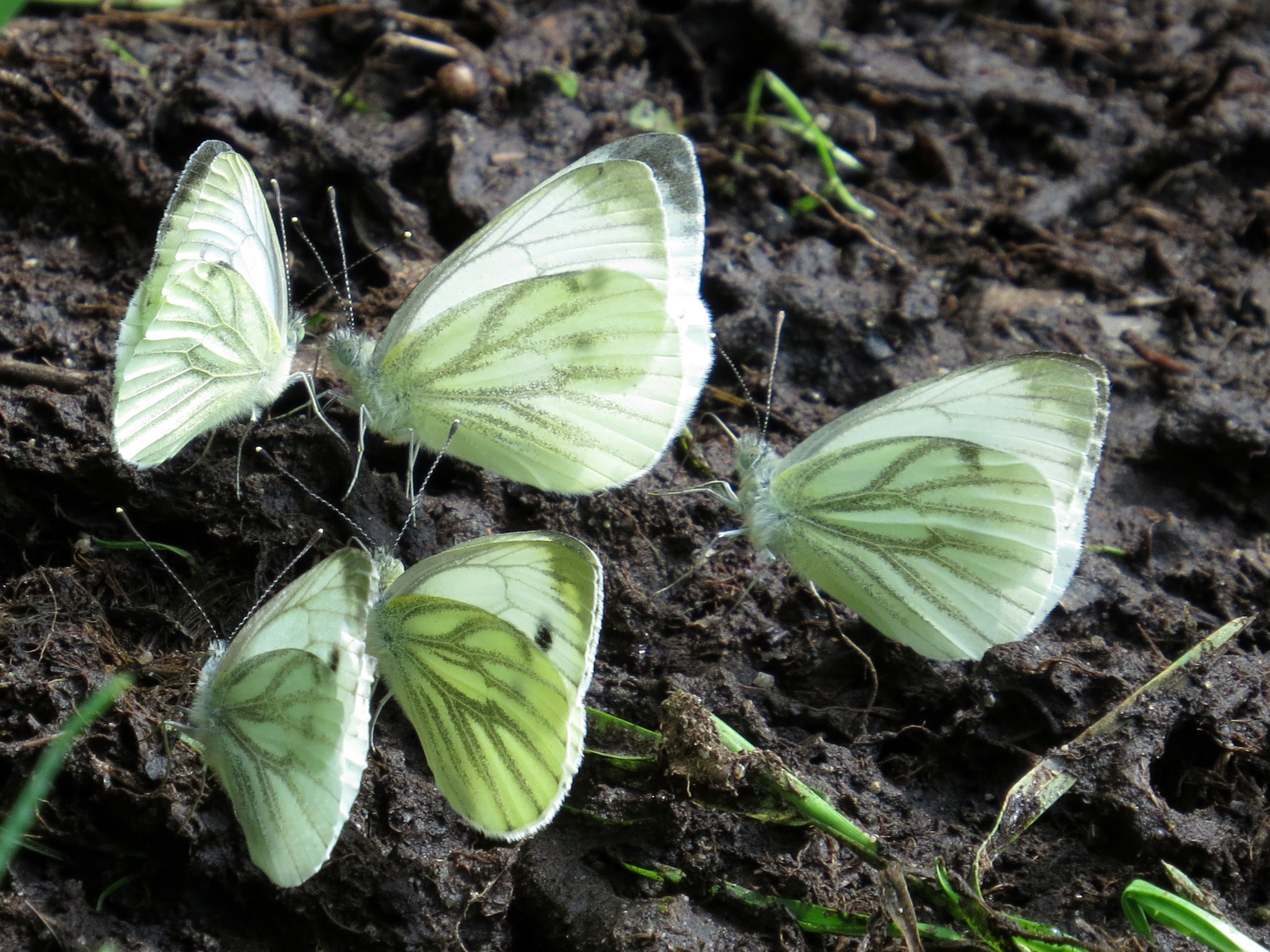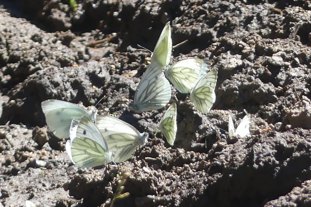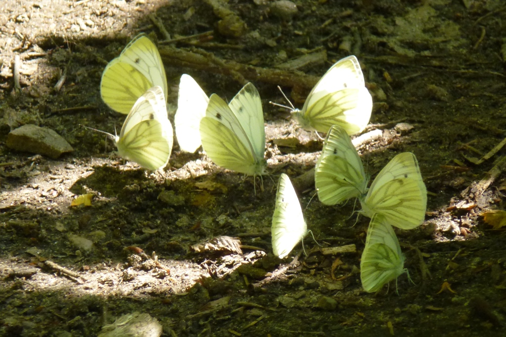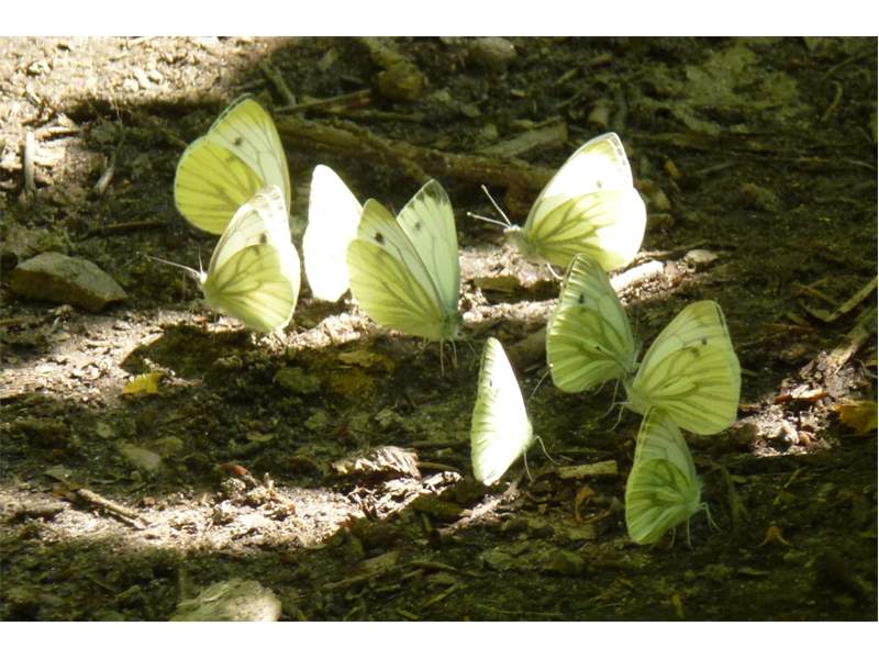 Grünaderweißlinge findet man oft an feuchten Stellen in Gruppen gemeinsam saugend, wie hier im Prießnitztal bei Glashütte am 28.07.2013