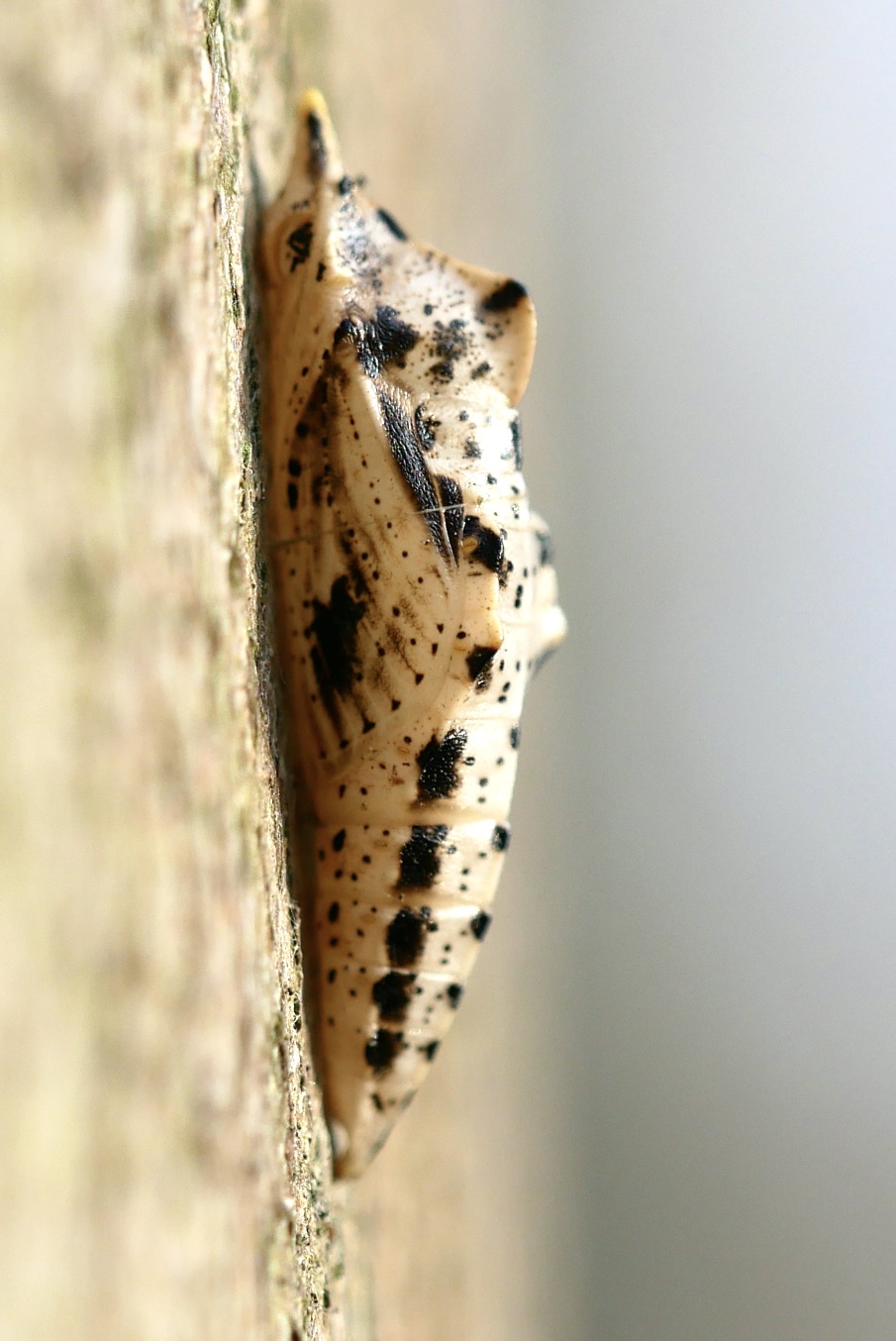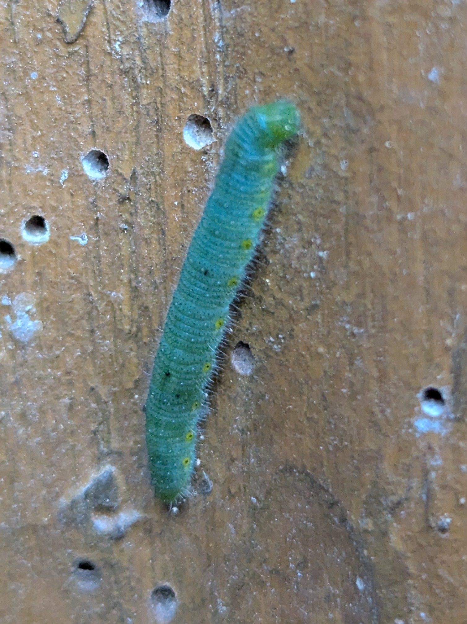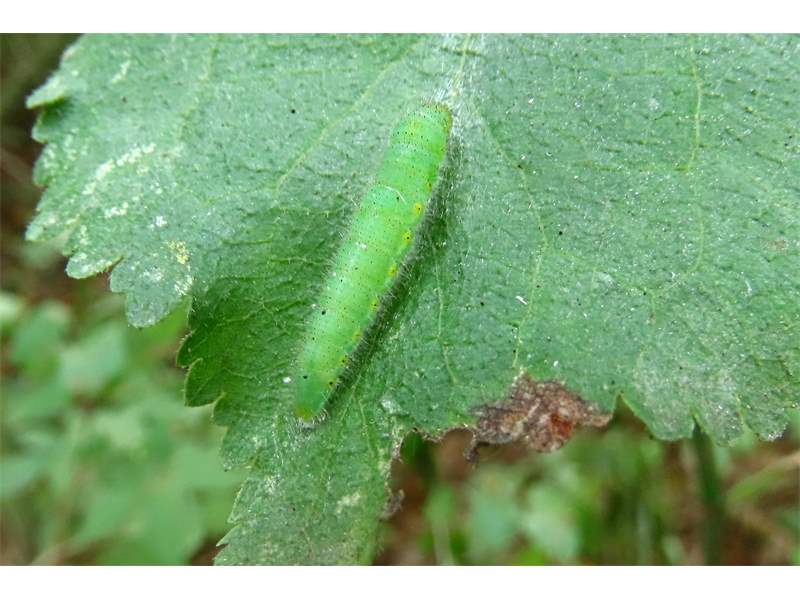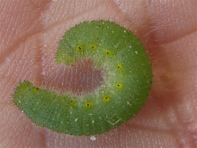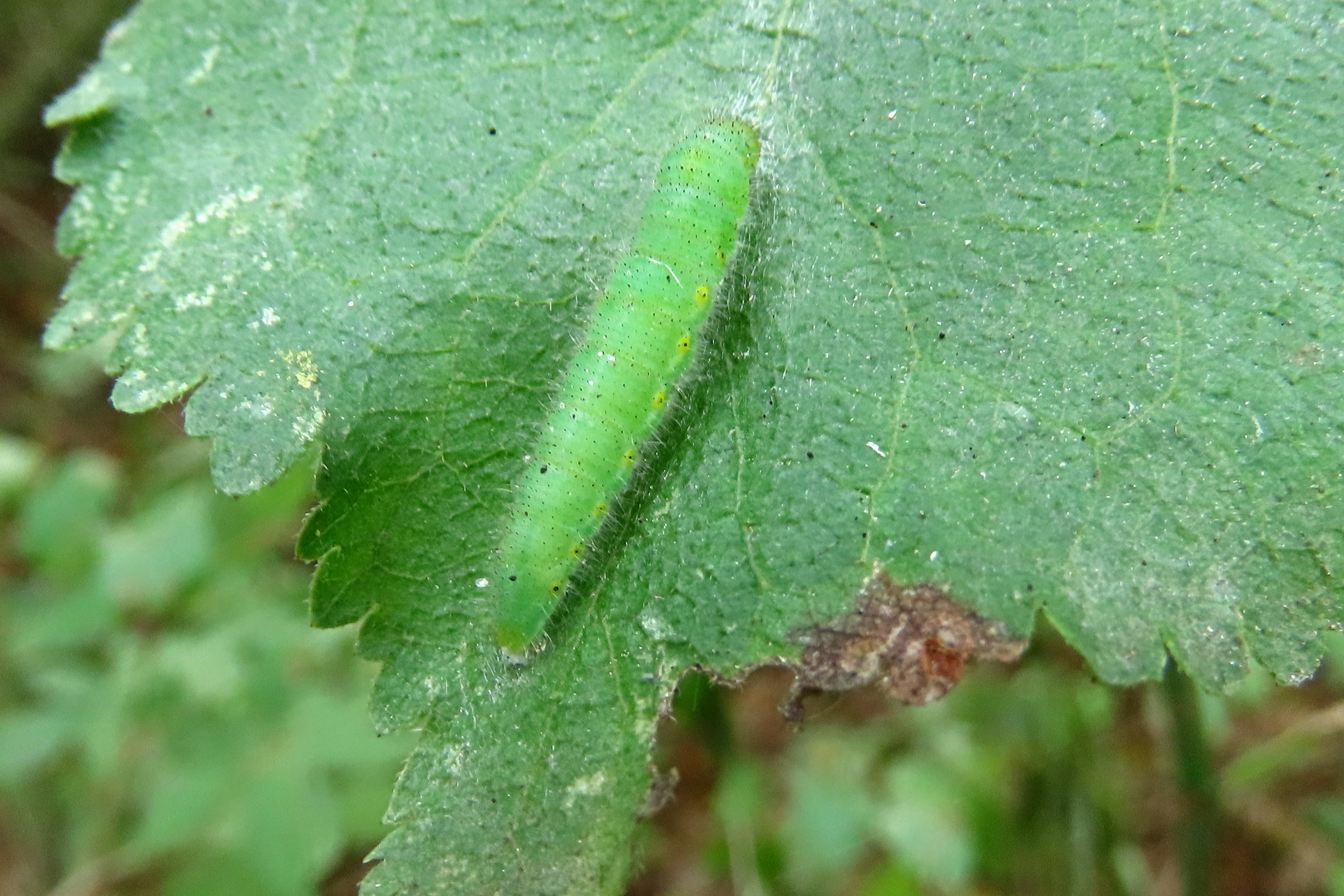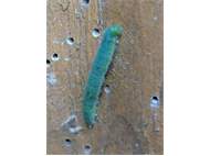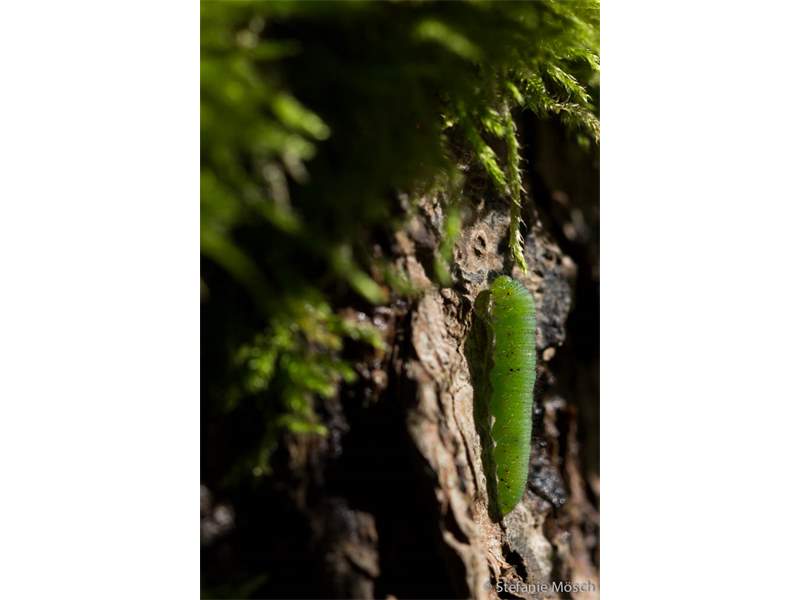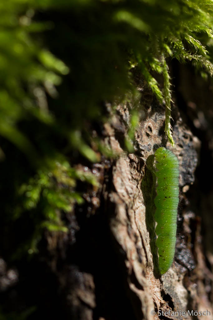 Präpuppe des Grünaderweißlings, aufgenommen im Oktober 2013 im Elm. Als Präpuppe bezeichnet man Raupen, die das Fressen eingestellt haben und sich auf die Verpuppung vorbereiten. In diesem Fall hat sich die Raupe bereits ihren seidenen "Gürtel" gesponnen, der sie nach der Verpuppung am Substrat festhält.