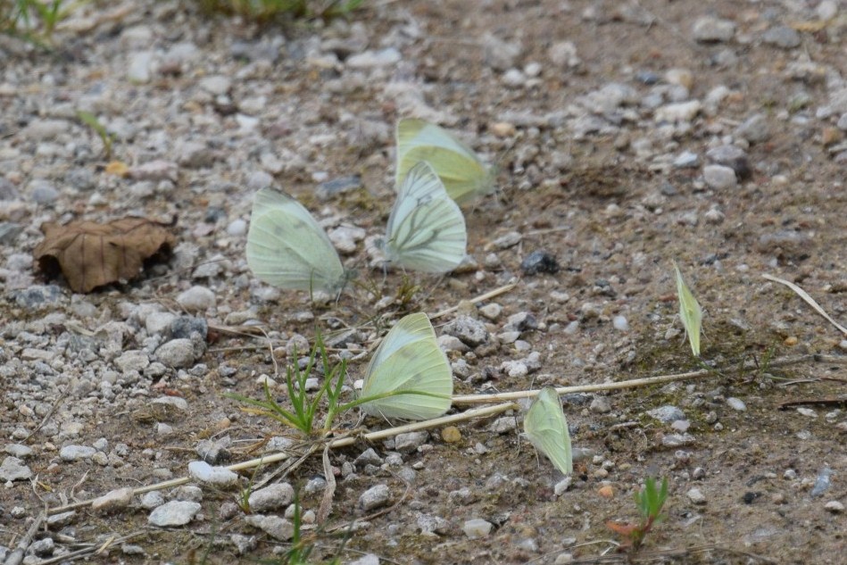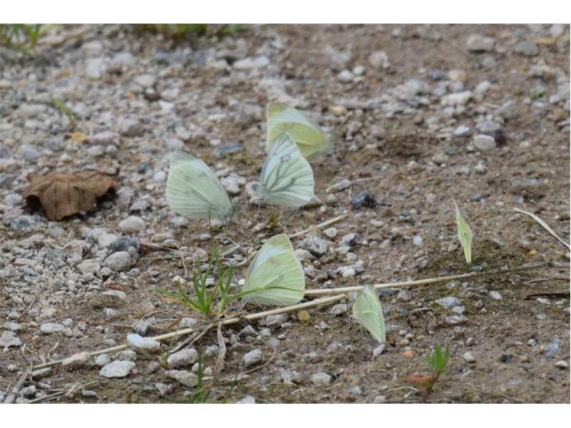 Grünaderweißlinge bei der Aufnahme von Feuchtigkeit, Waldweg in der Nähe von Pressel, Dübener Heide, August 2014