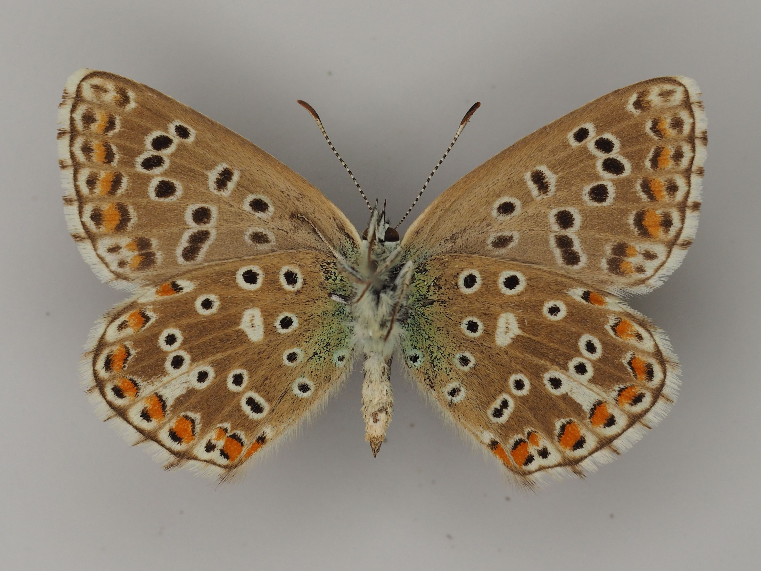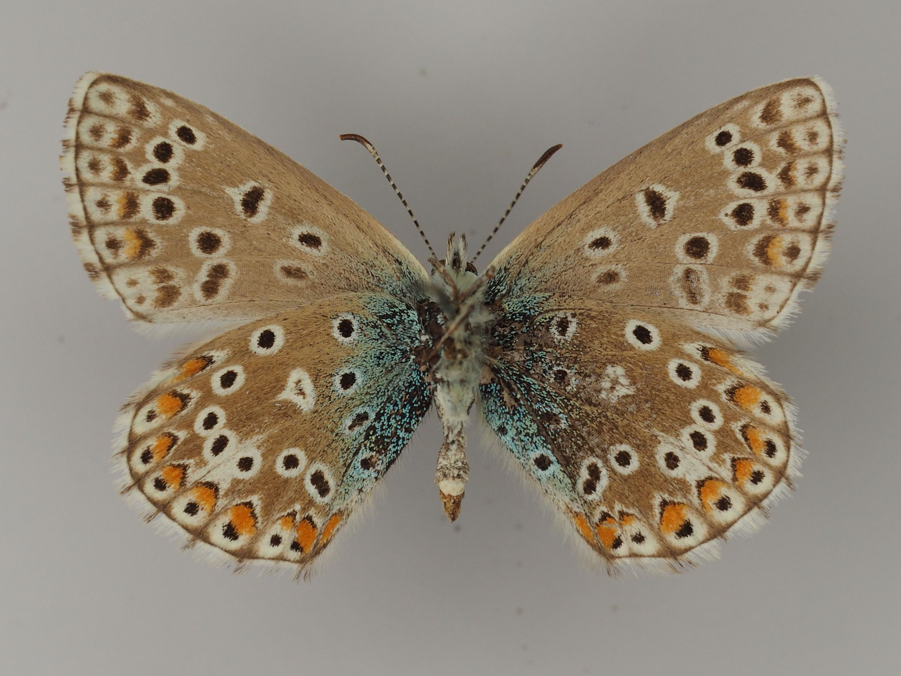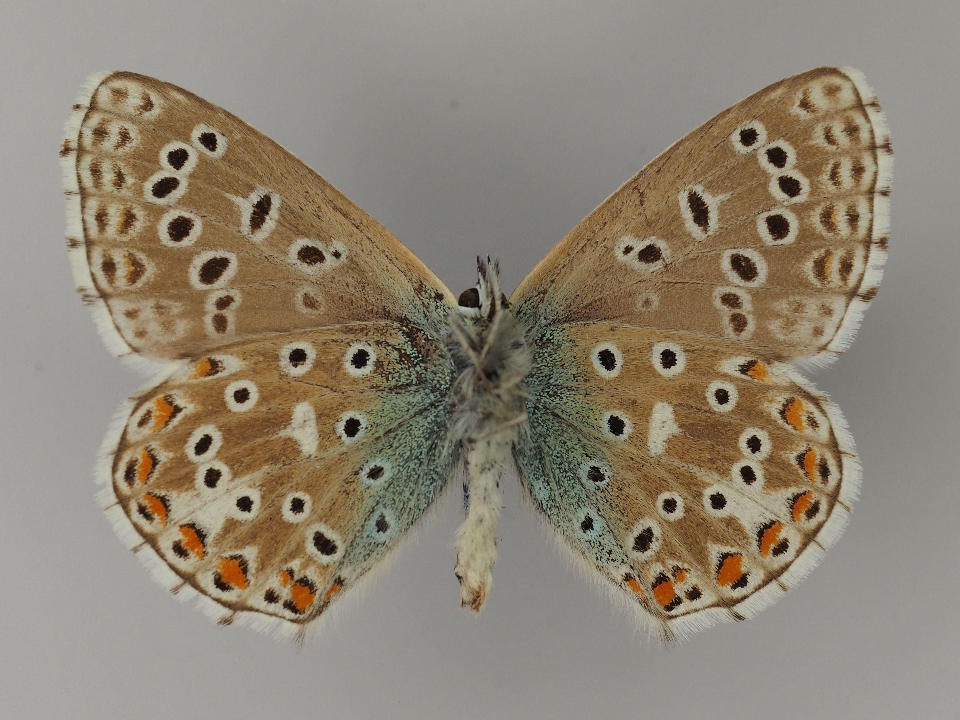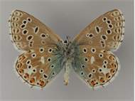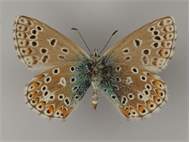 Weibchen des Himmelblauen Bläulings aus Nordhausen (Thüringen). Senckenberg Museum für Tierkunde Dresden. Flügelunterseiten
