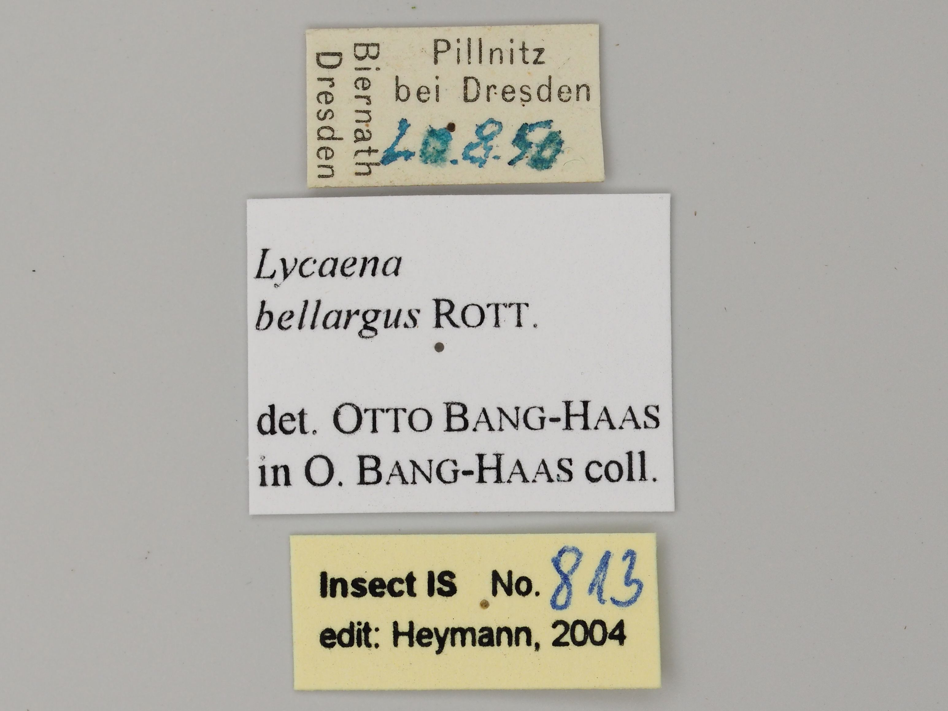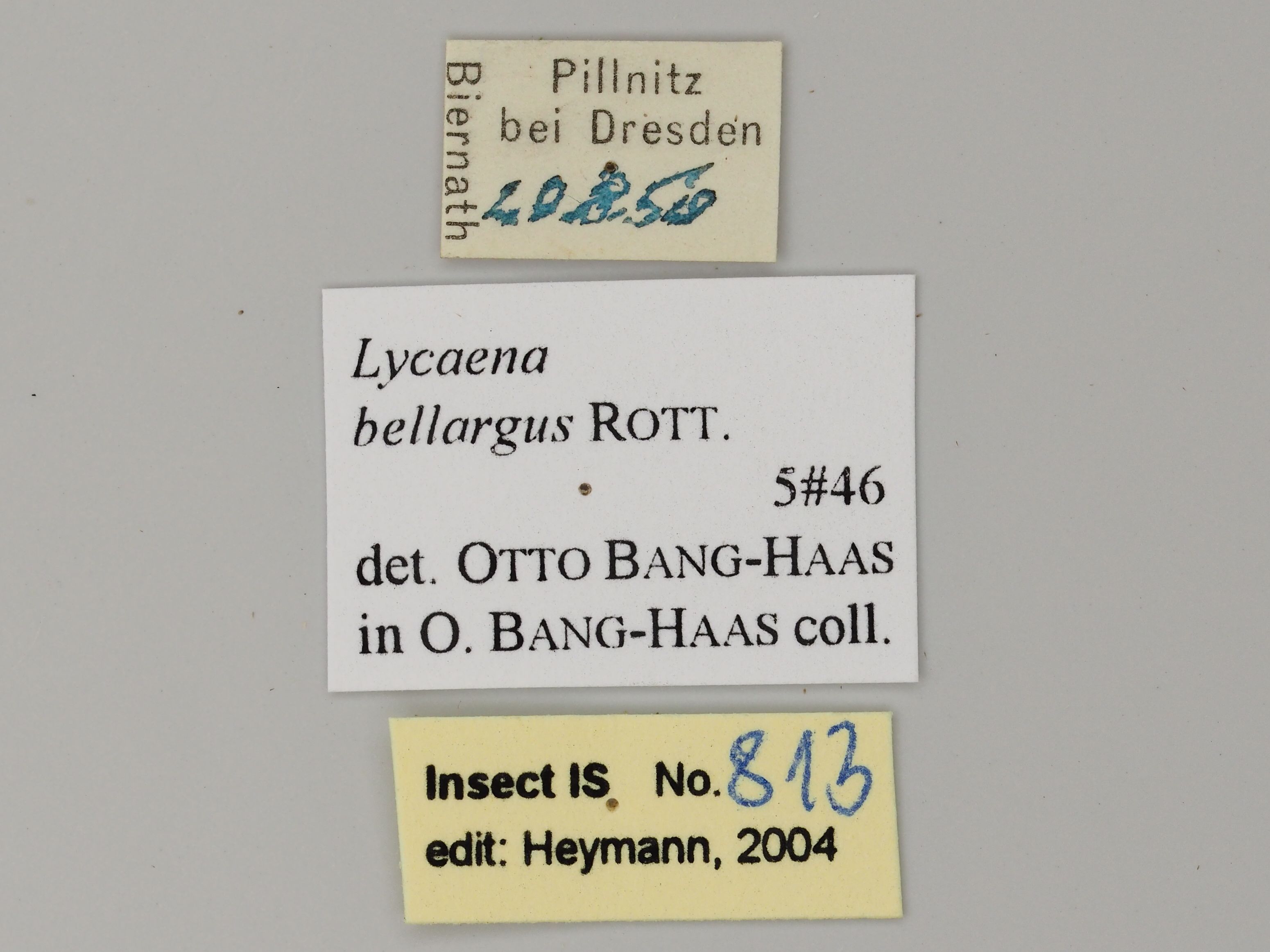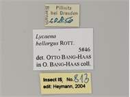 Etiketten des männlichen Himmelblauen Bläulings vom 20.08.1950 aus Dresden-Pillnitz, leg. Biernath. Senckenberg Museum für Tierkunde Dresden.