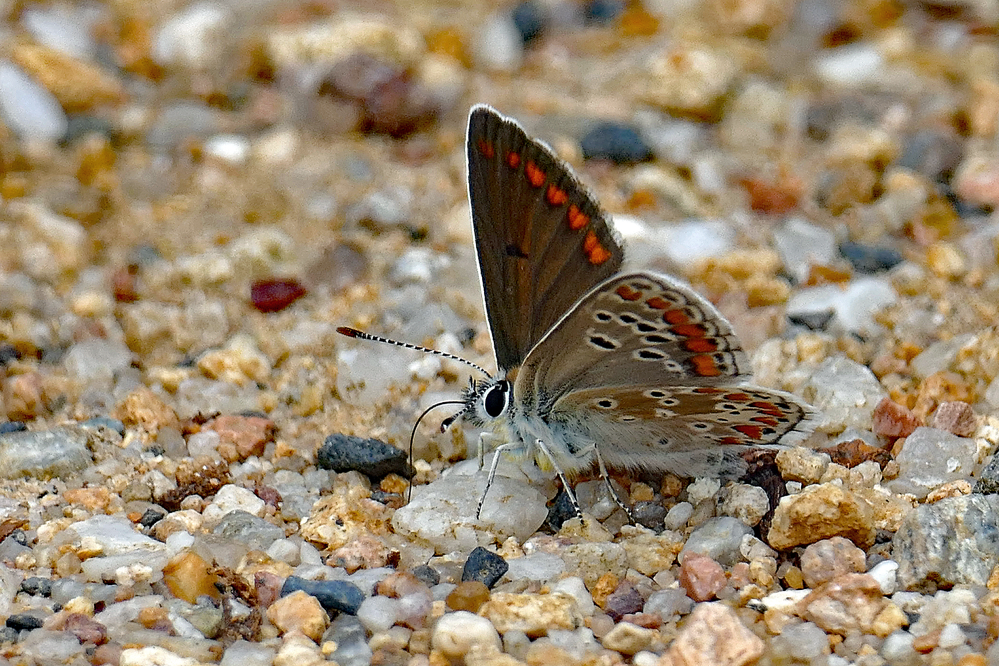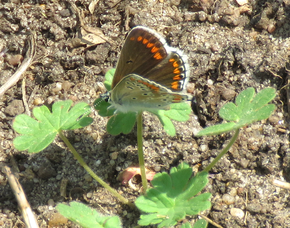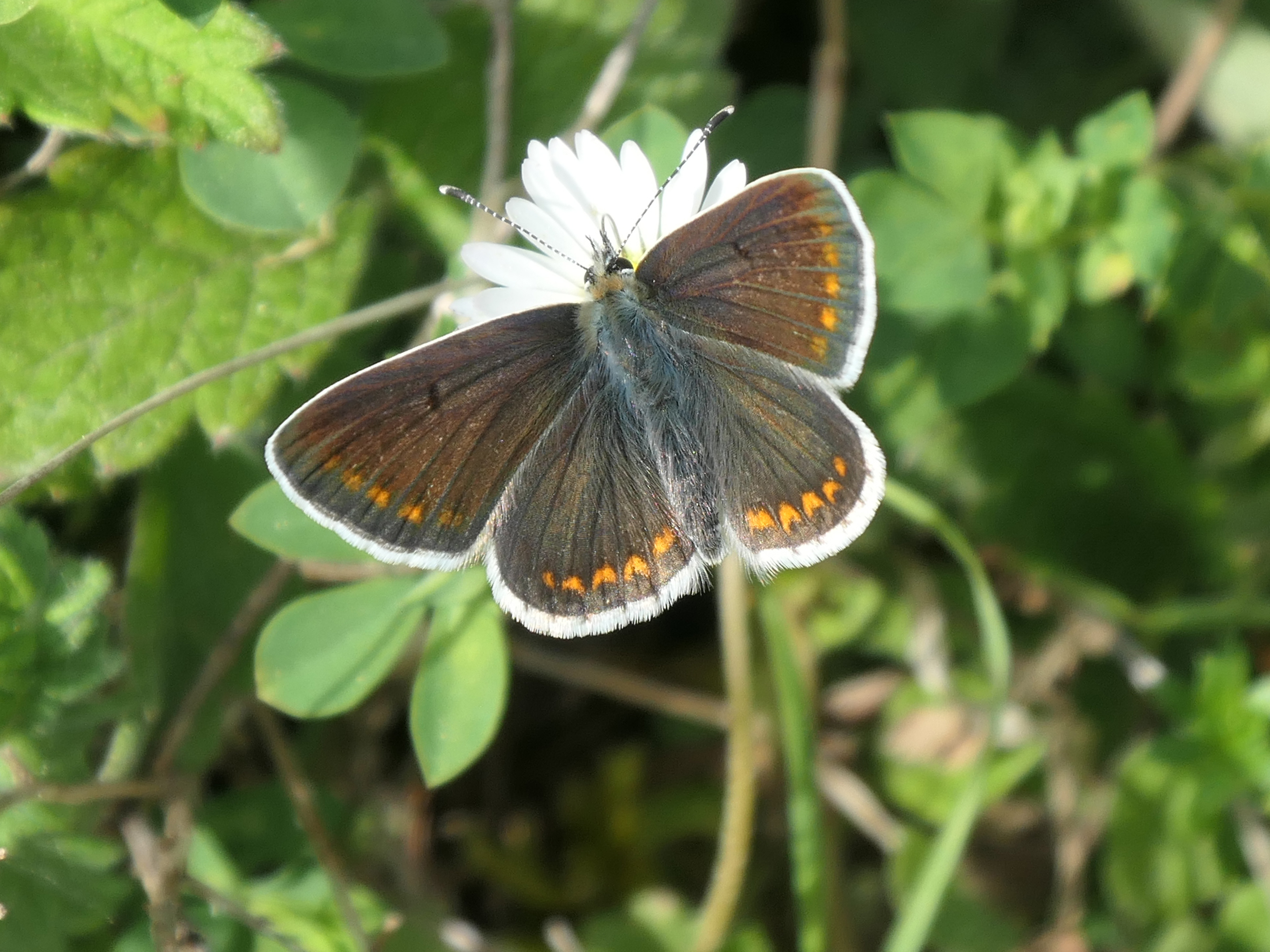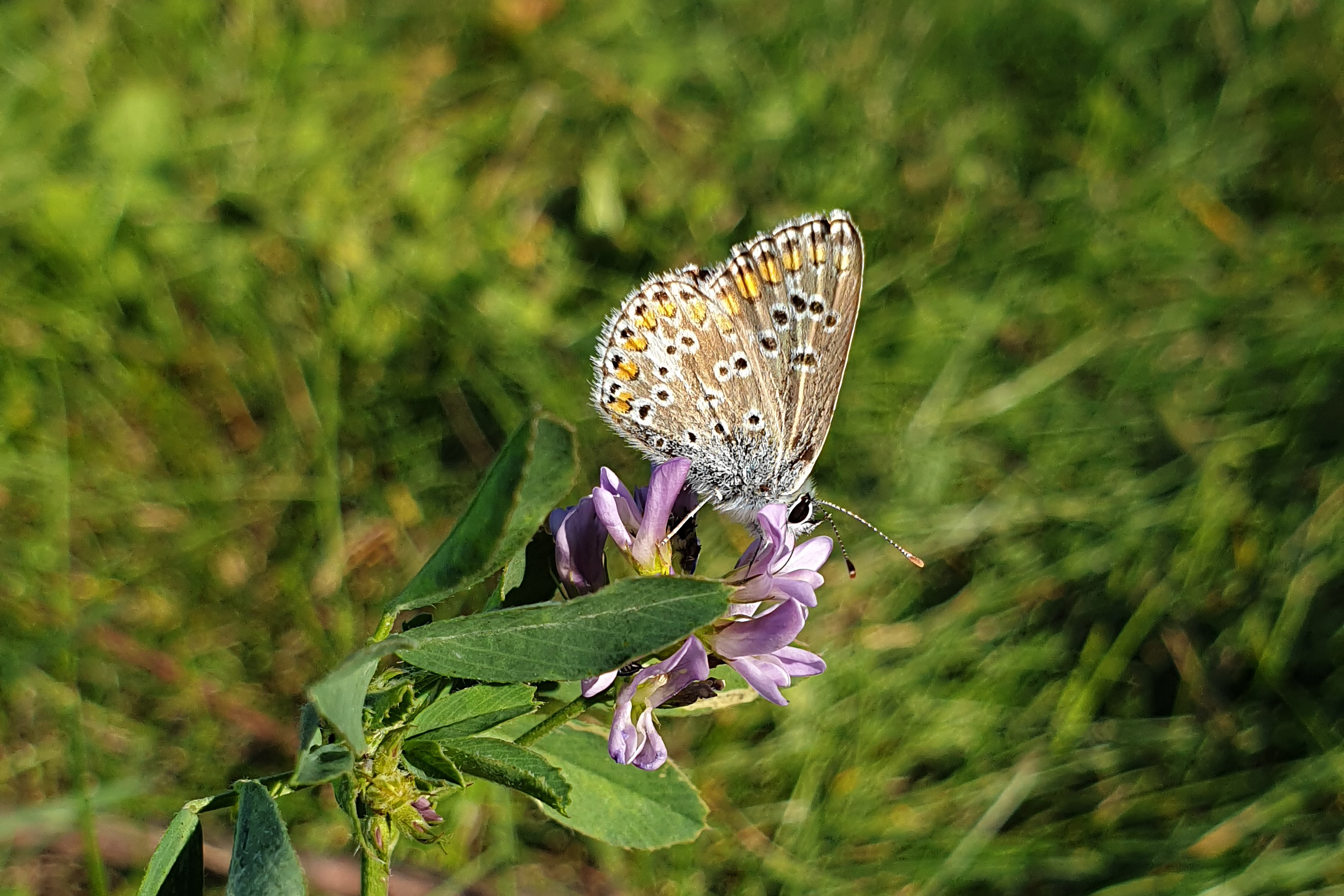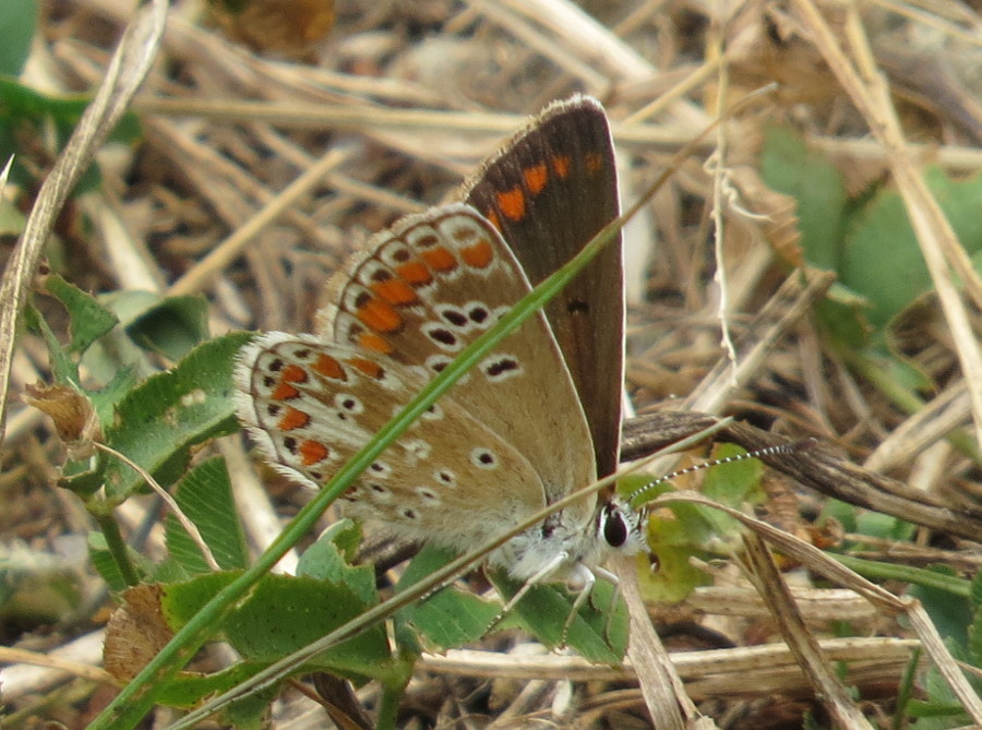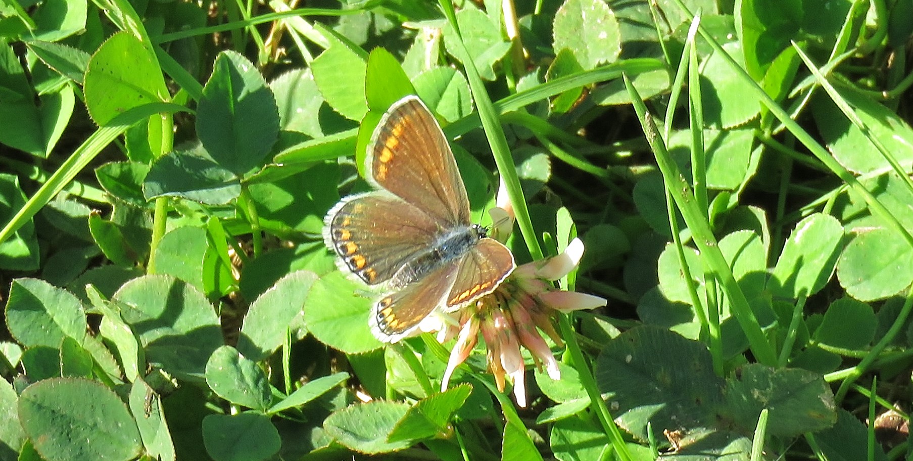 Kleiner Sonnenröschenbläuling (Aricia agestis (Denis & Schiffermüller, 1775)),Freital/Wurgwitz,Hammerteich,Wegrand auf Klee,Sep.2019