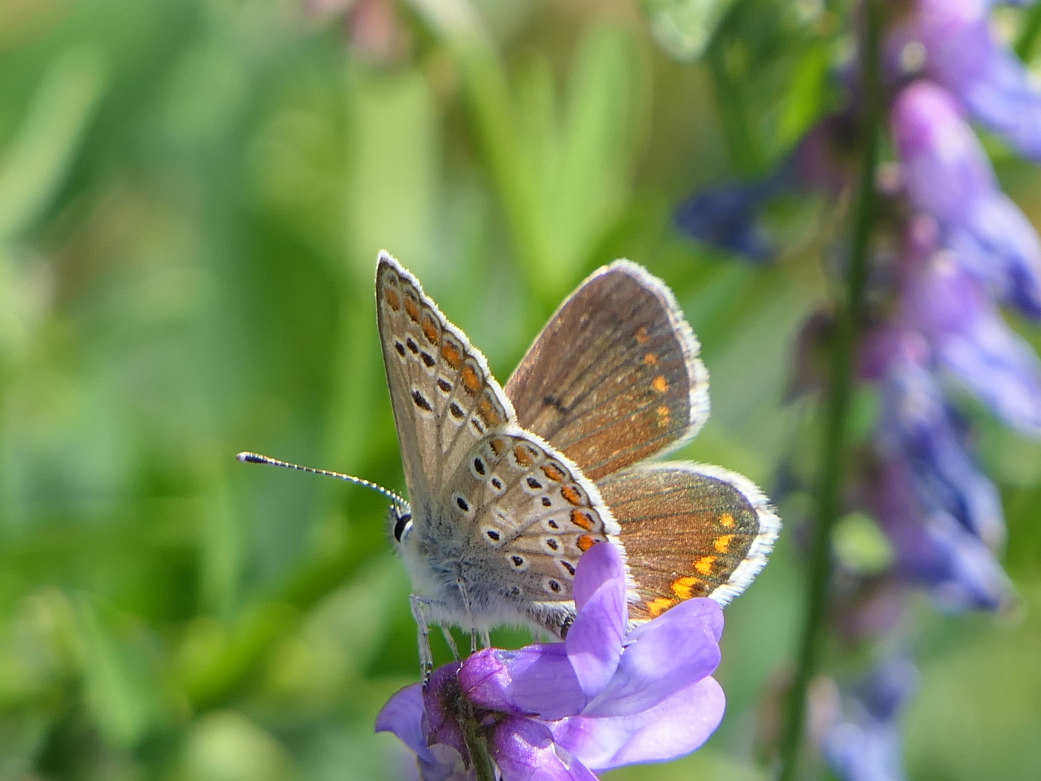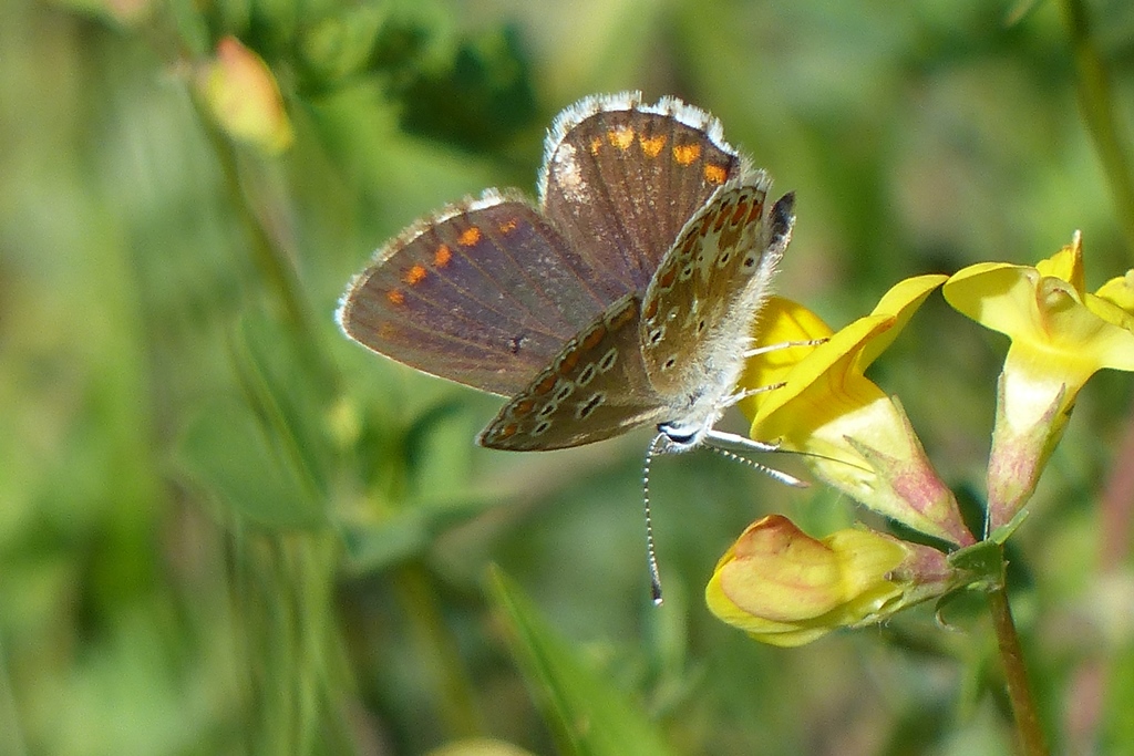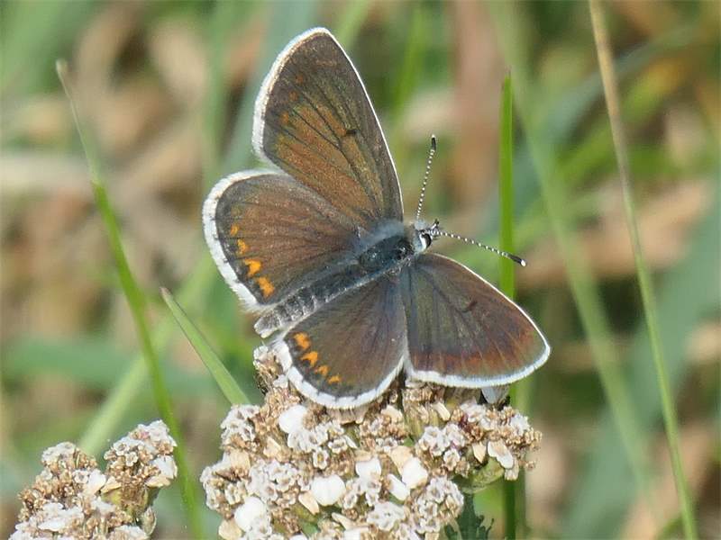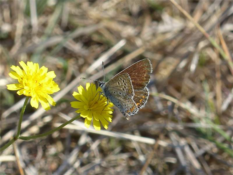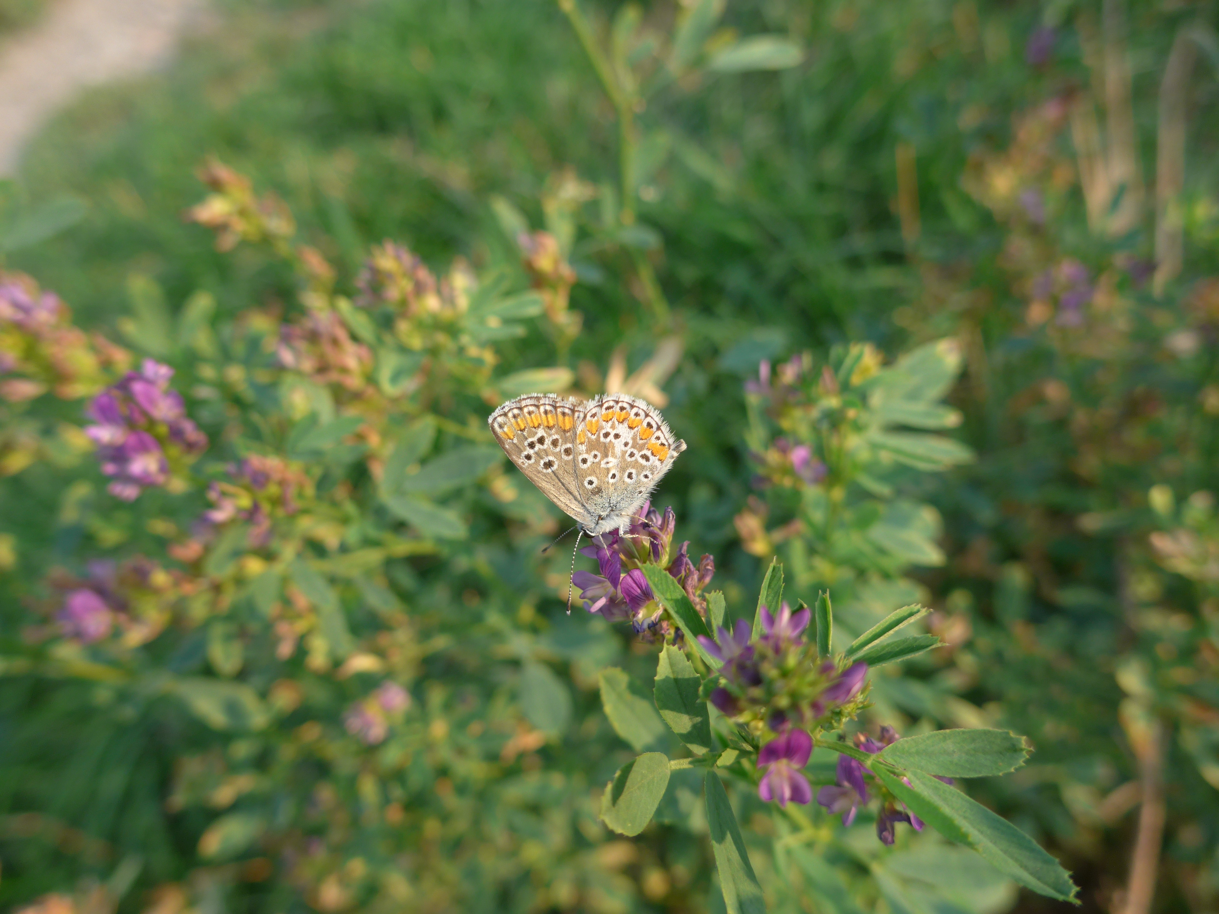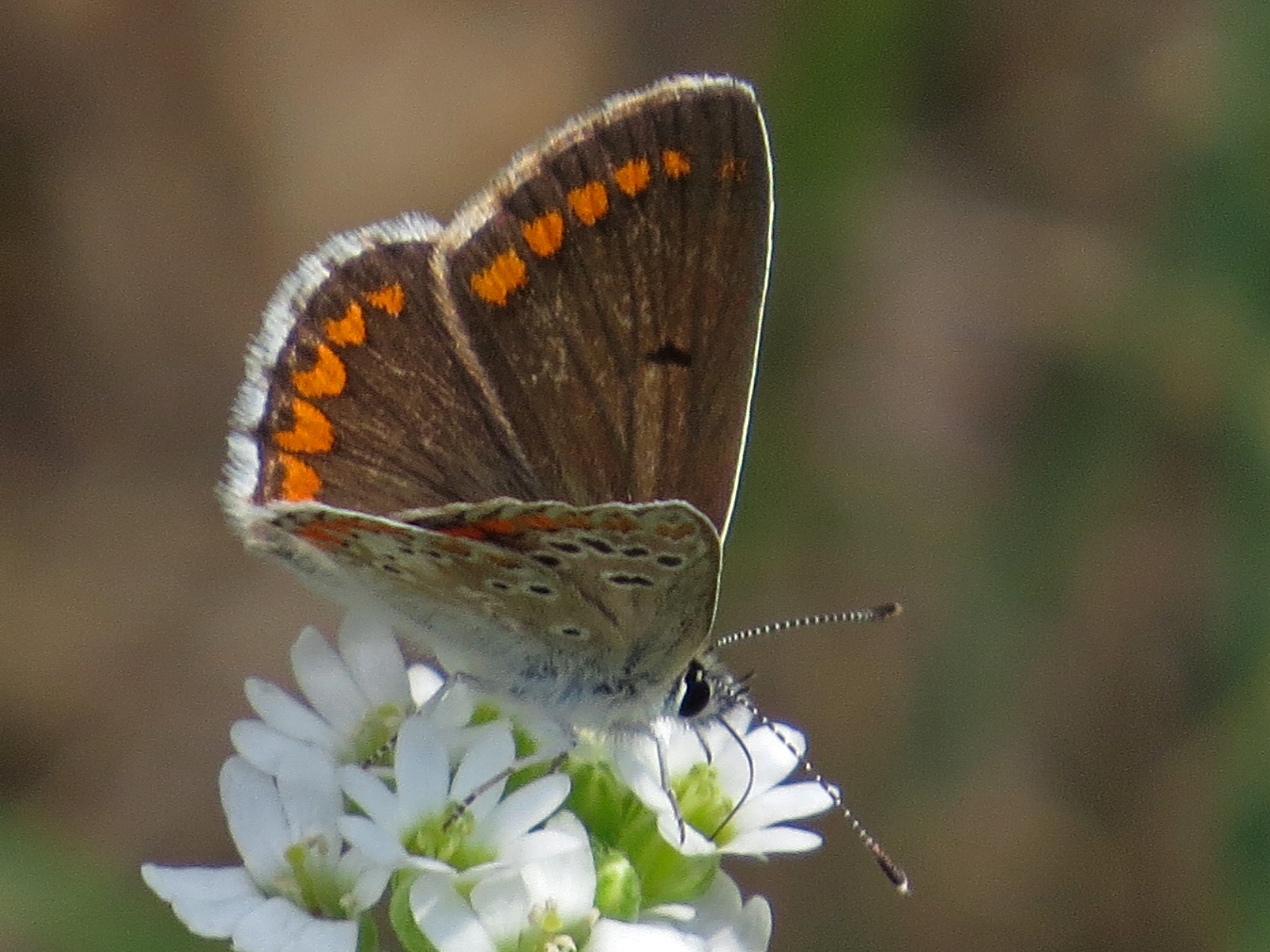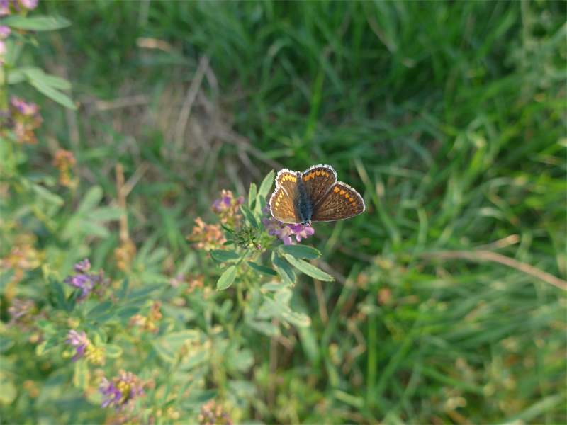 Kleiner Sonnenröschenbläuling (Aricia agestis (Denis & Schiffermüller, 1775)),Freital/Wurgwitz,Hammerteich,Wegrand auf Klee,Sep.2019