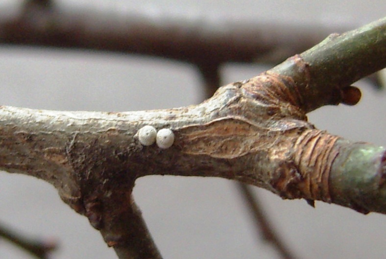 Bild 2 Eier von Thecla betulae, bei Bad Düben, am Rande der Dübener Heide, 11.04.2009 (© R. Papenfuß)( Bild vergrößern)