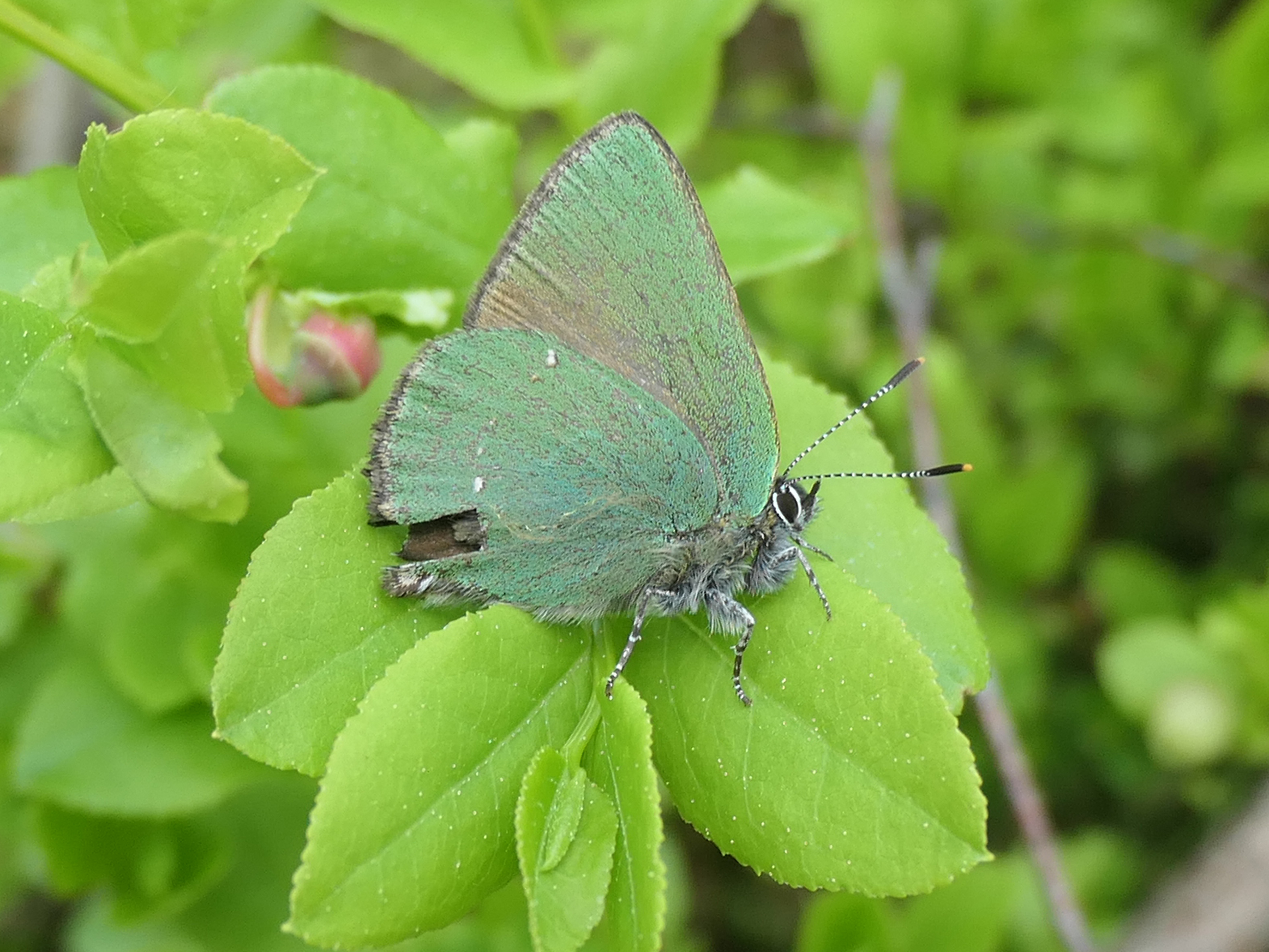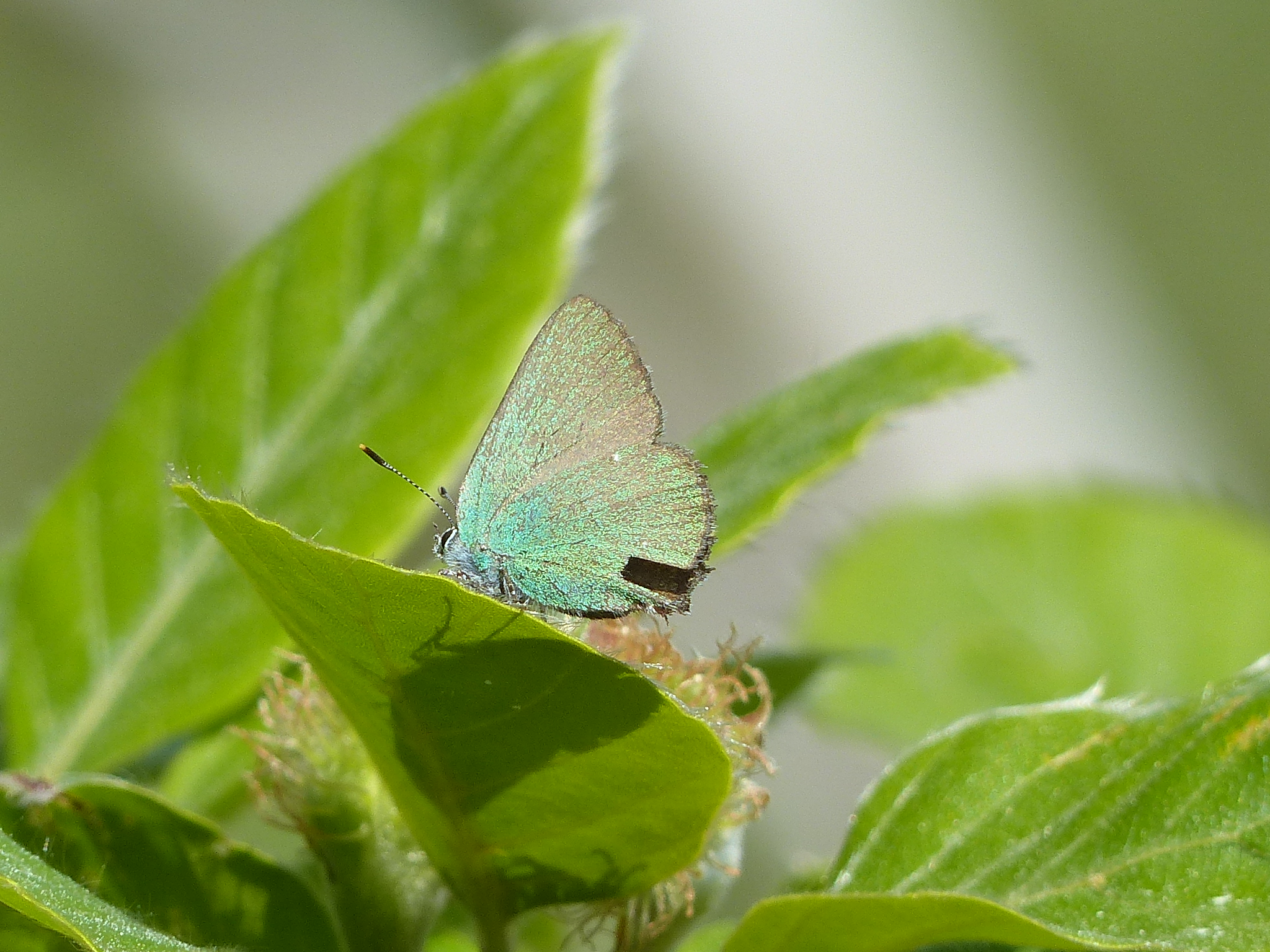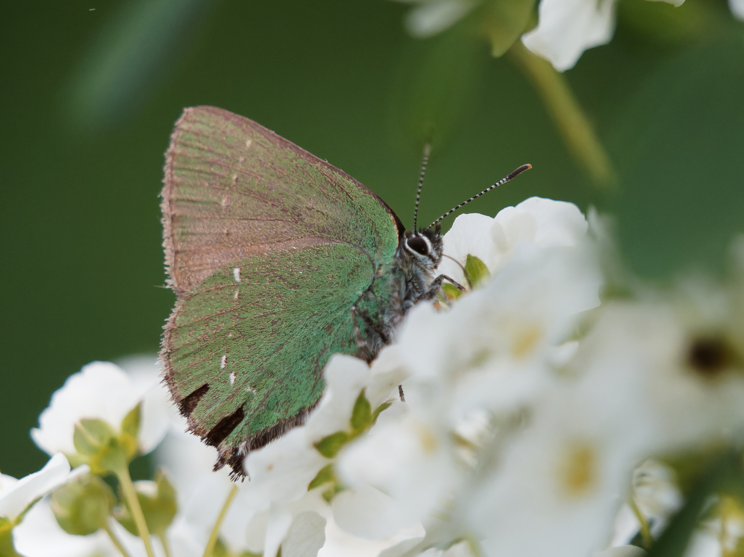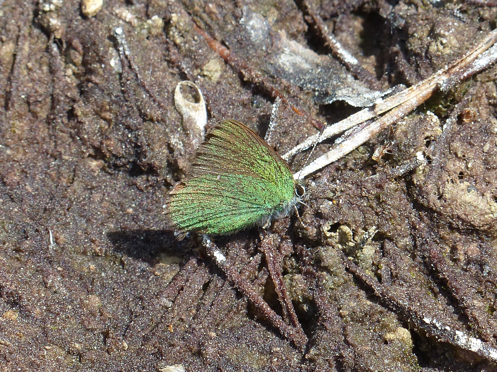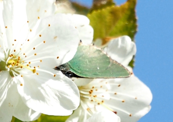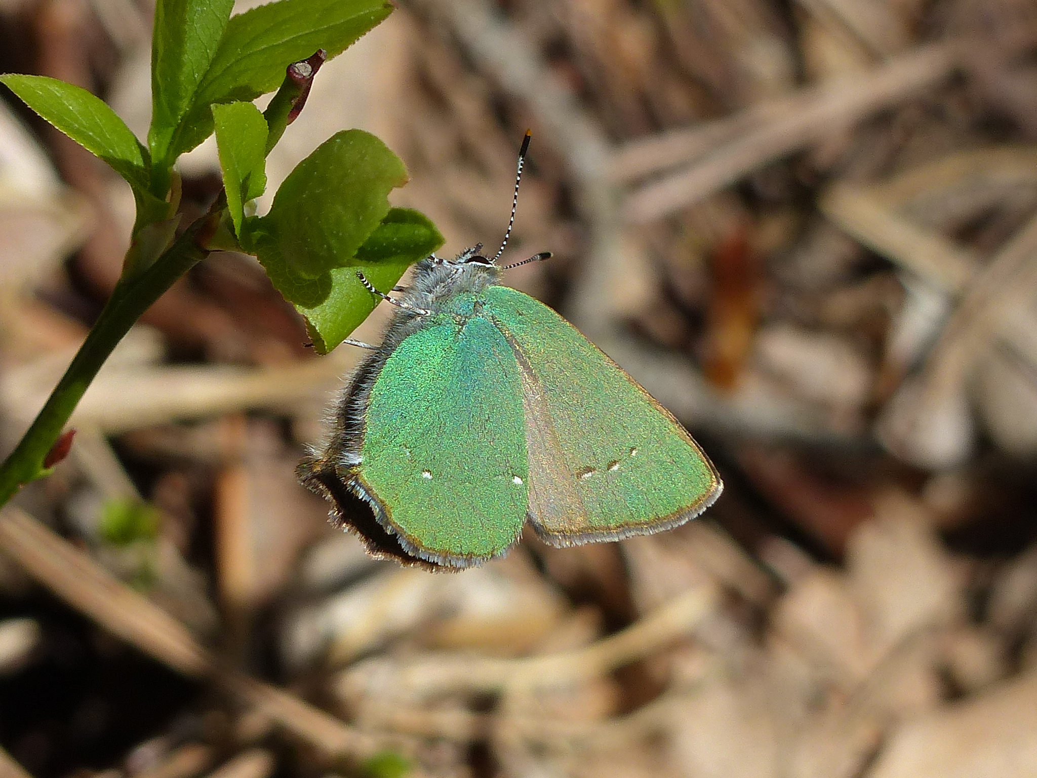 Grüner Zipfelfalter, im NSG Presseler Heide,- Wald,- und Moorgebiet, ca. 3 km nördl. von Wöllnau, am 17.05.2020