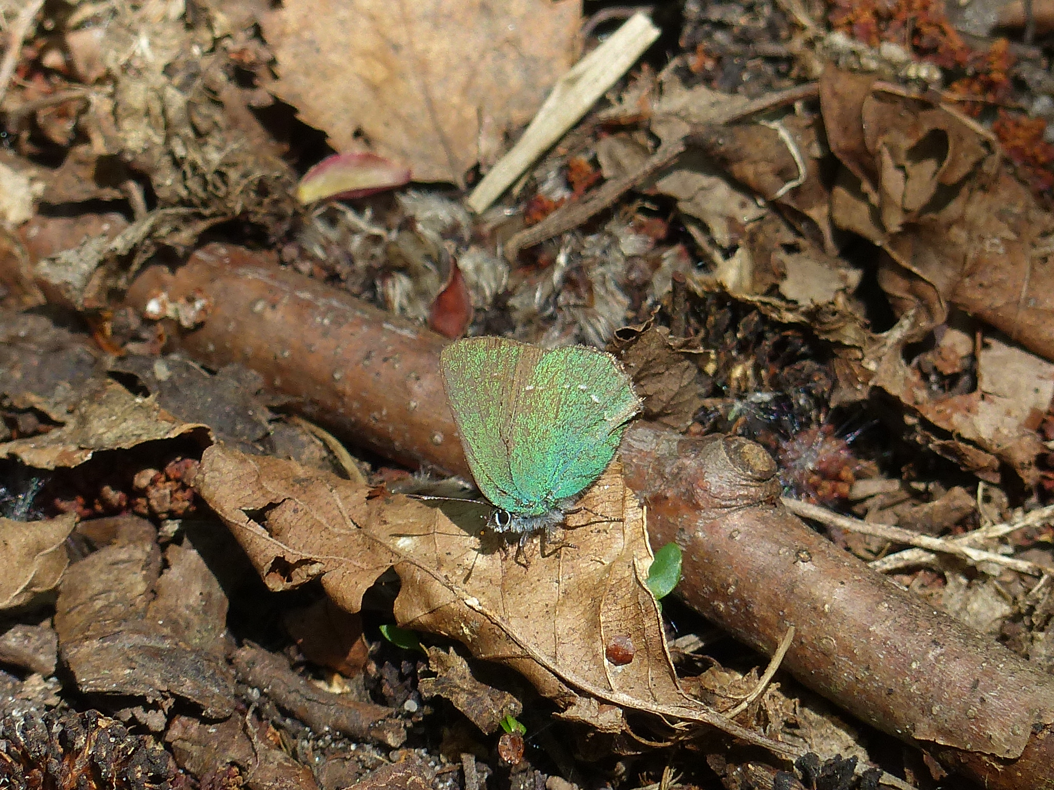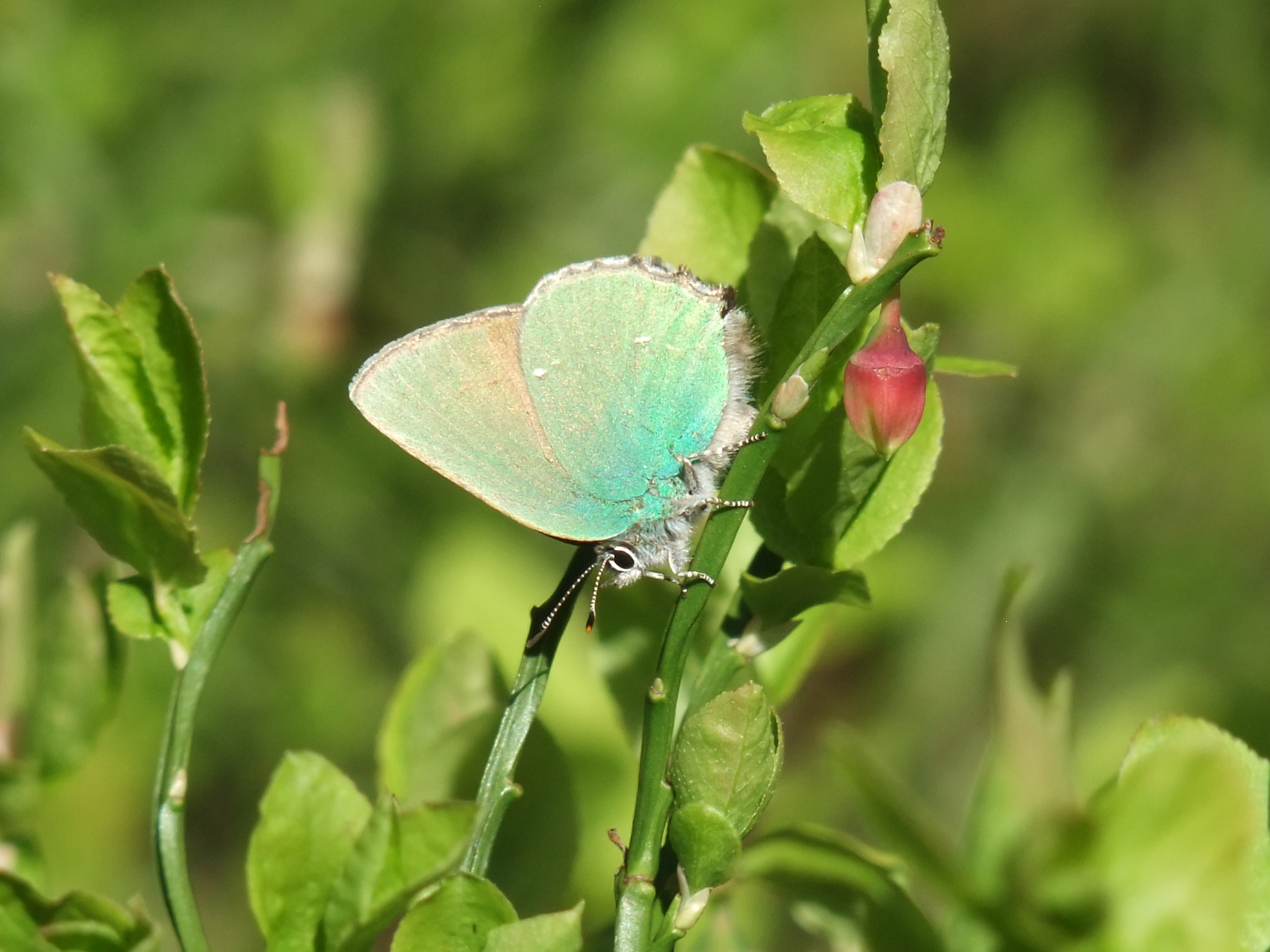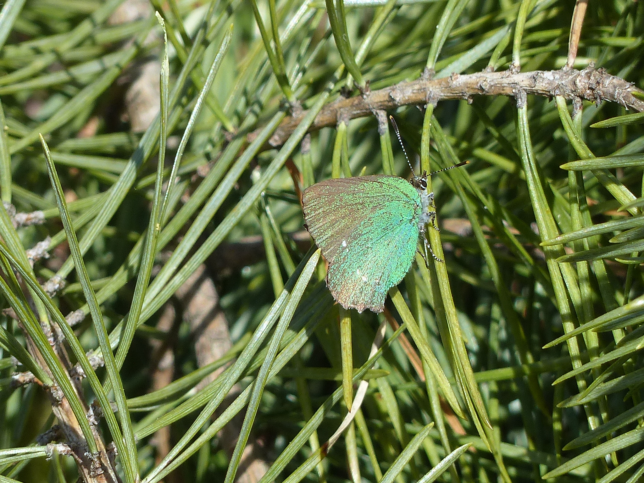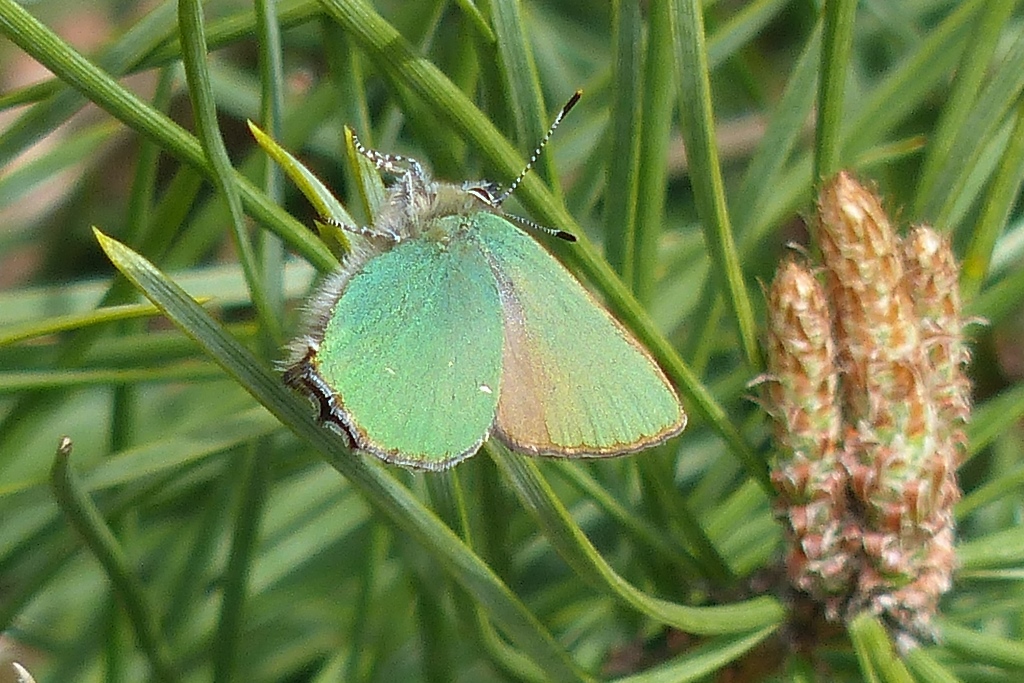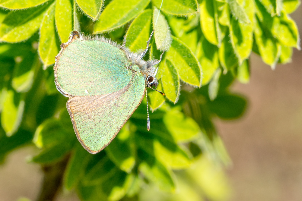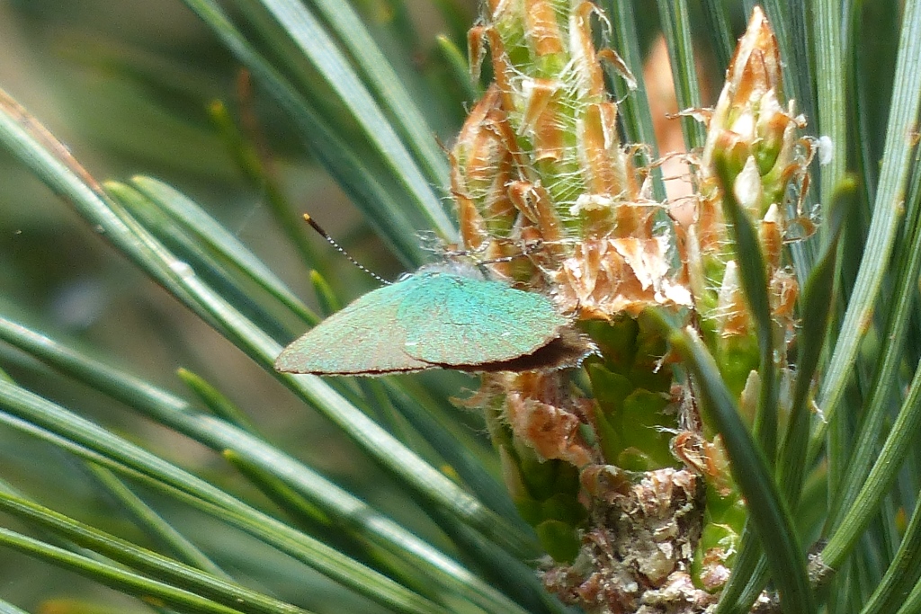 Grüner Zipfelfalter, im NSG Presseler Heide,- Wald,- und Moorgebiet, ca. 3 km nördl. von Wöllnau, am 17.05.2020