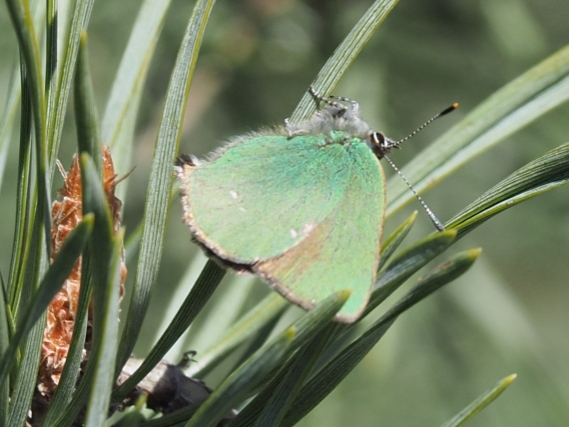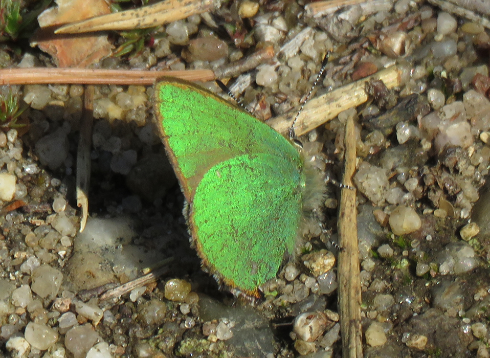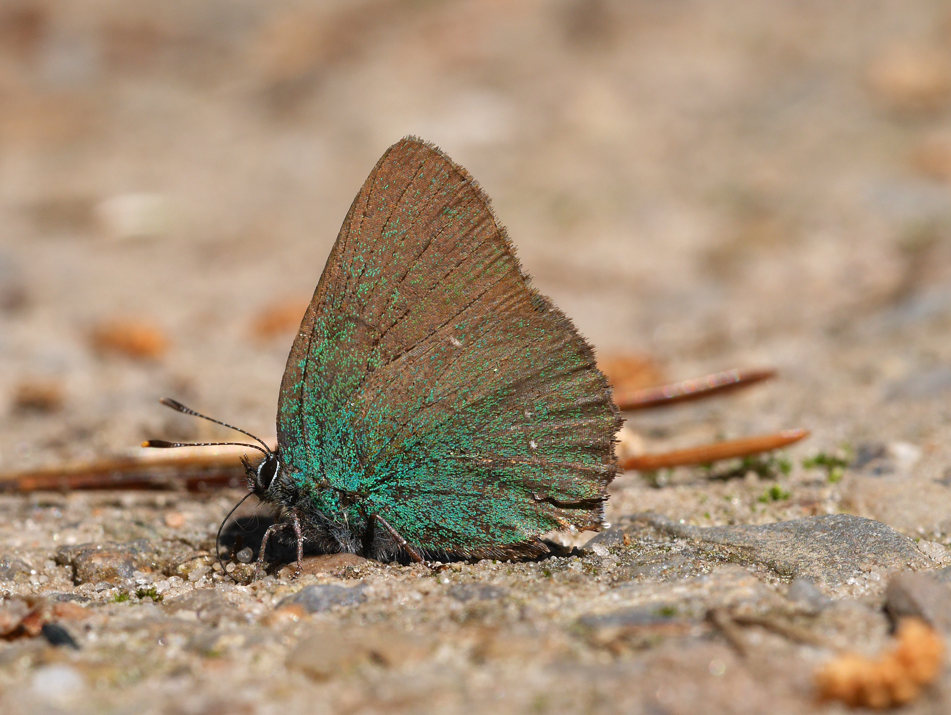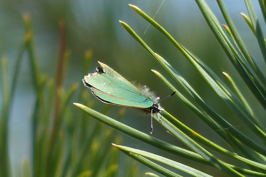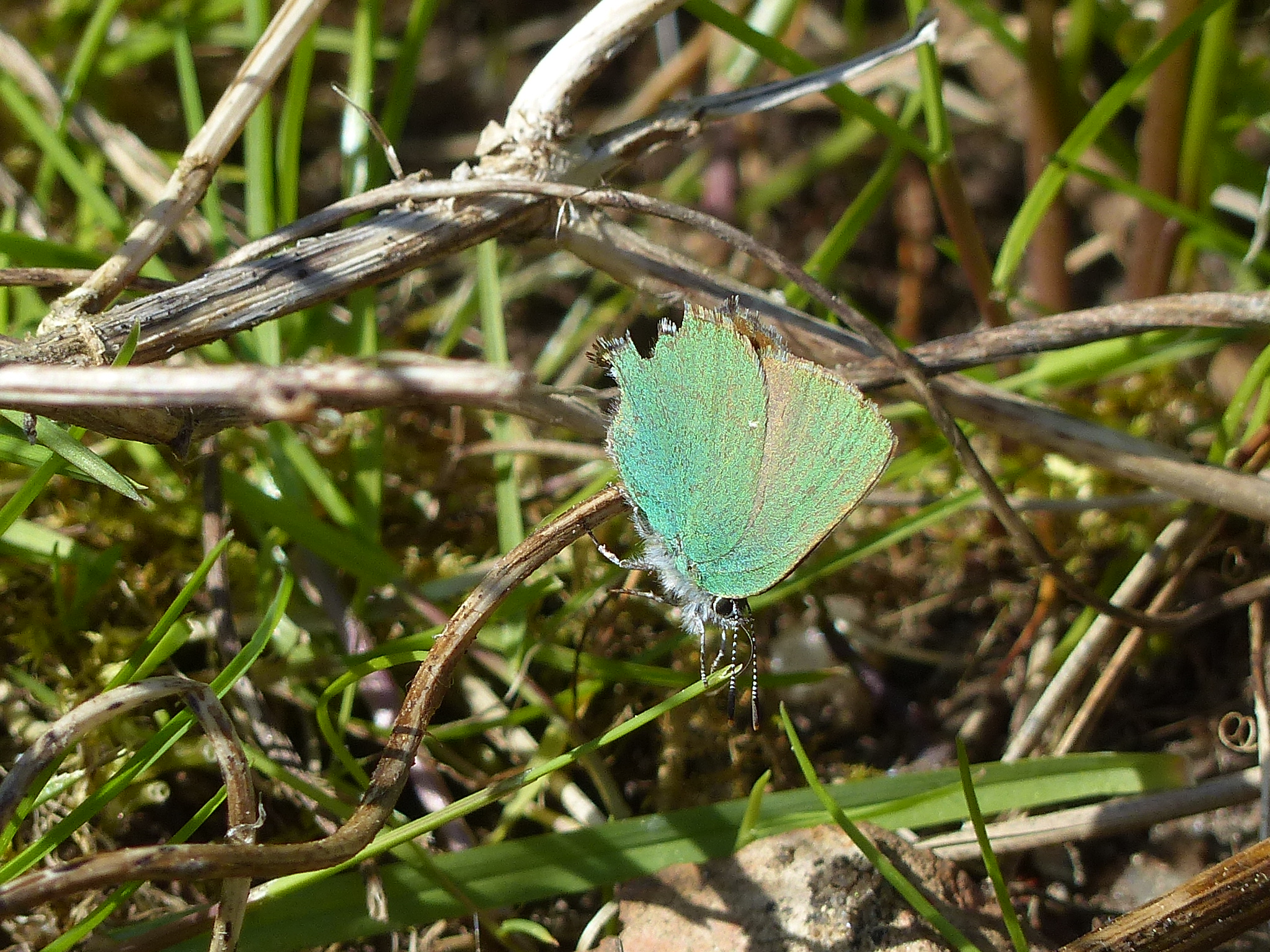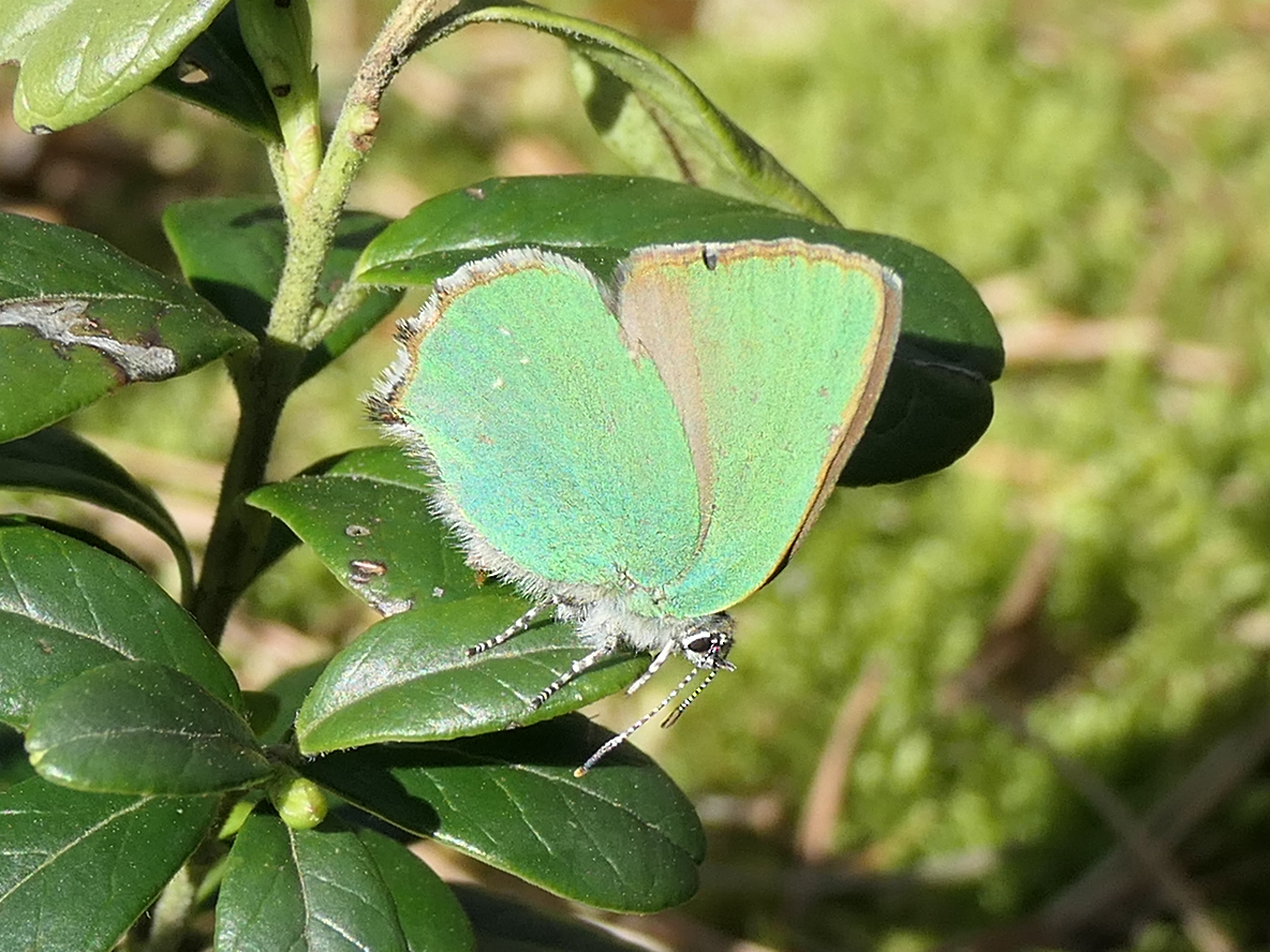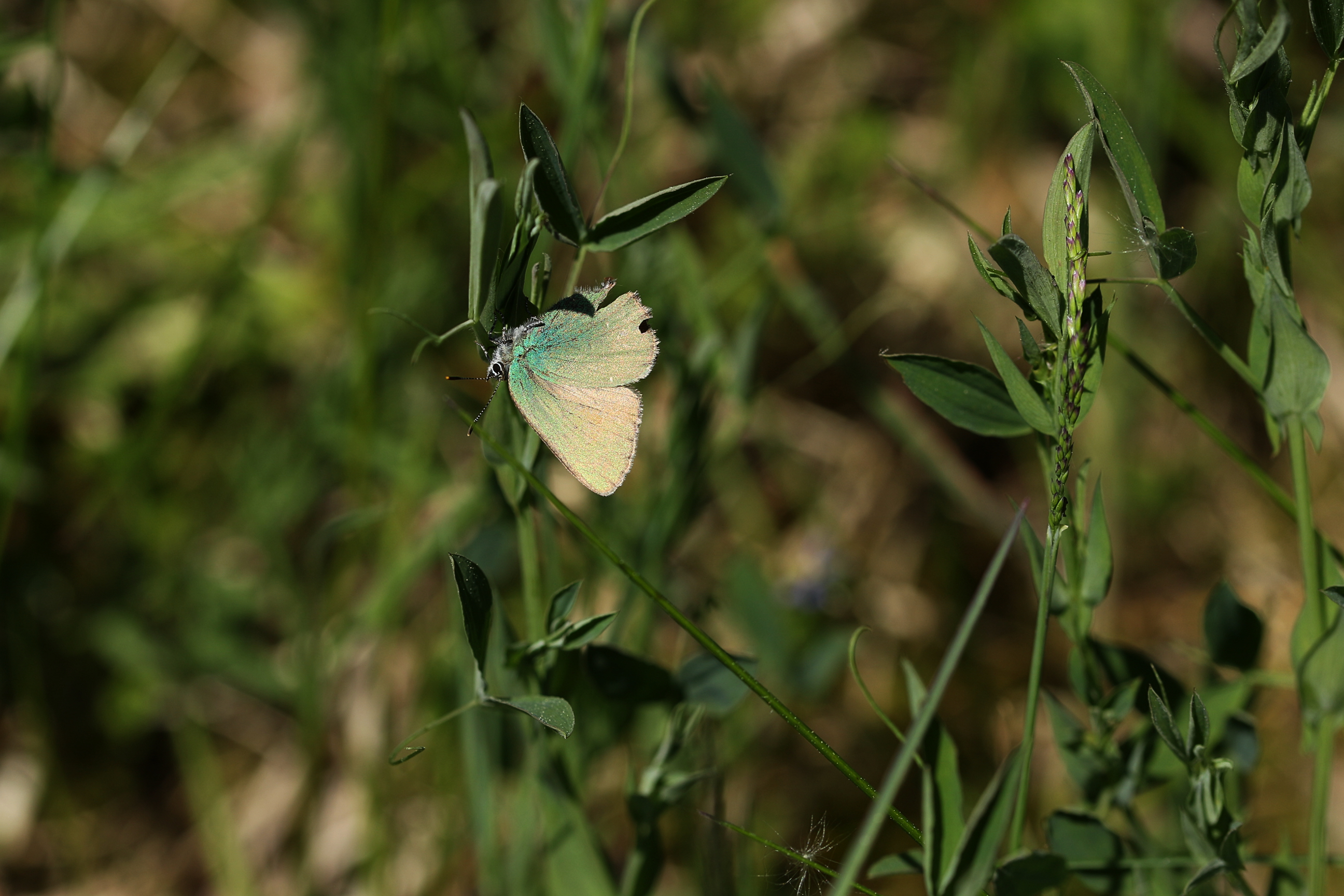 Grüner Zipfelfalter, im NSG Presseler Heide,- Wald,- und Moorgebiet, ca. 3 km nördl. von Wöllnau, am 17.05.2020