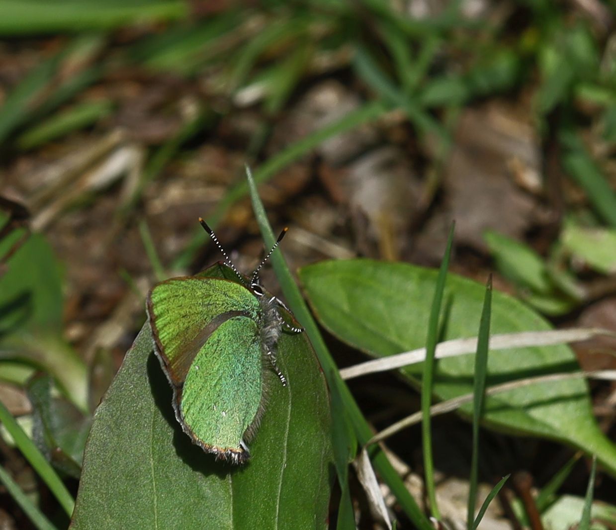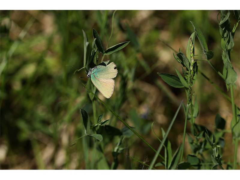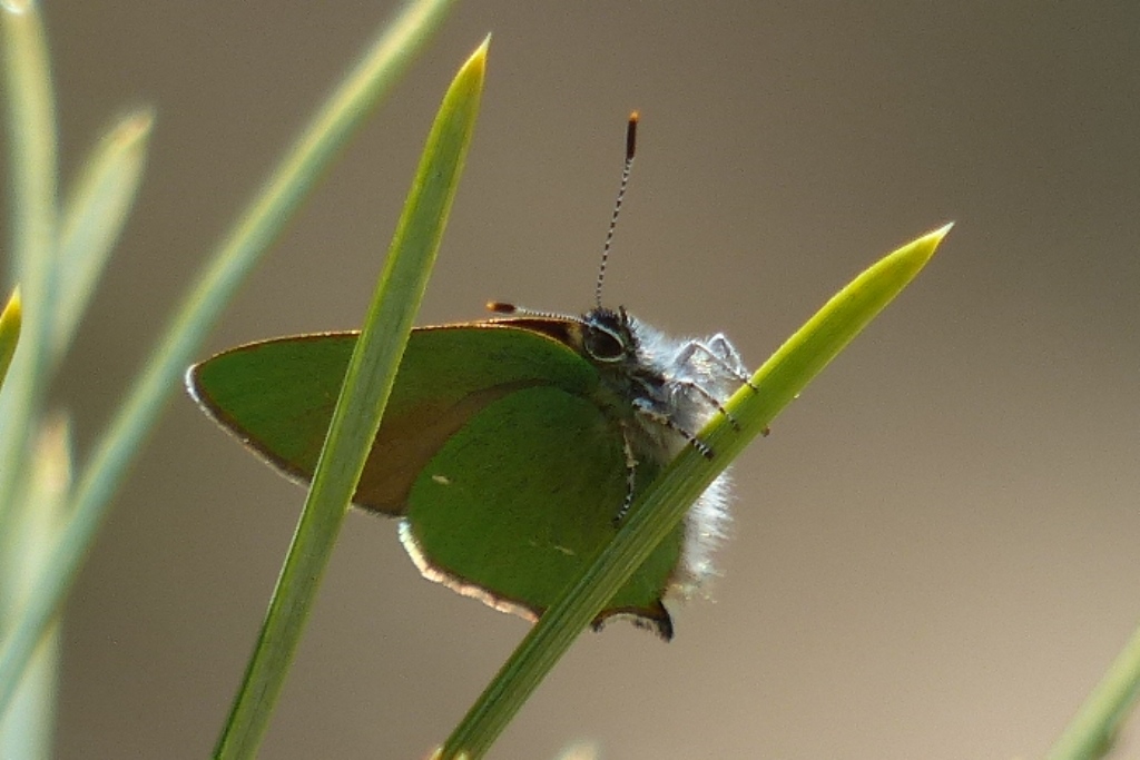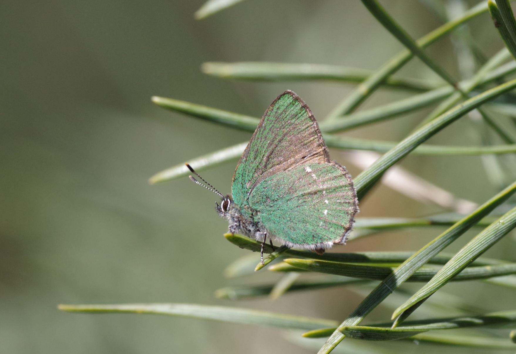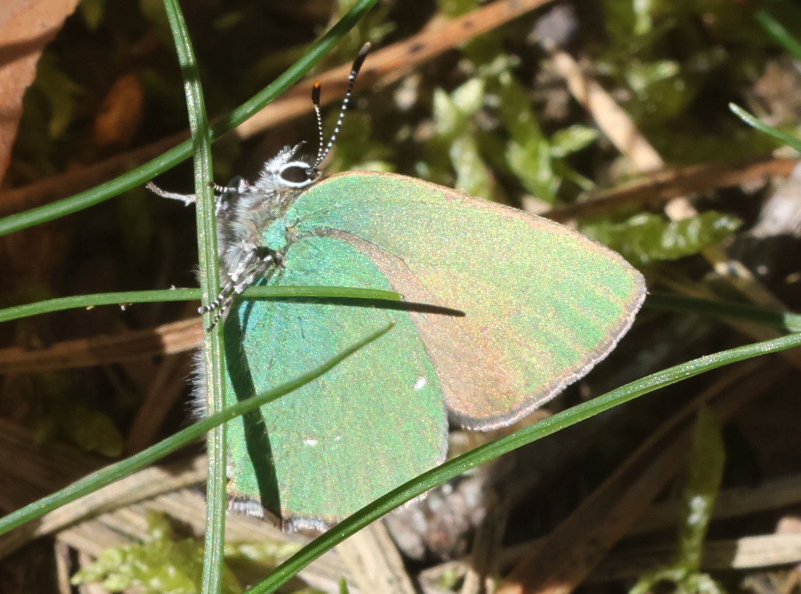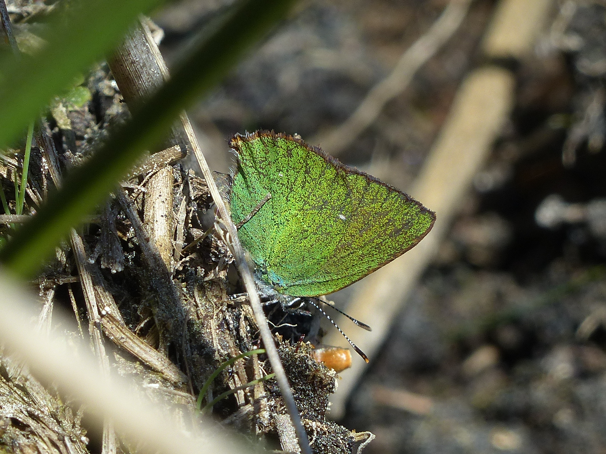 Grüner Zipfelfalter, im NSG Presseler Heide,- Wald,- und Moorgebiet, ca. 3 km nördl. von Wöllnau, am 17.05.2020