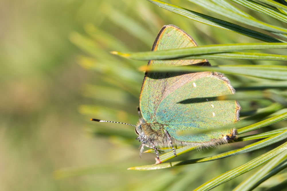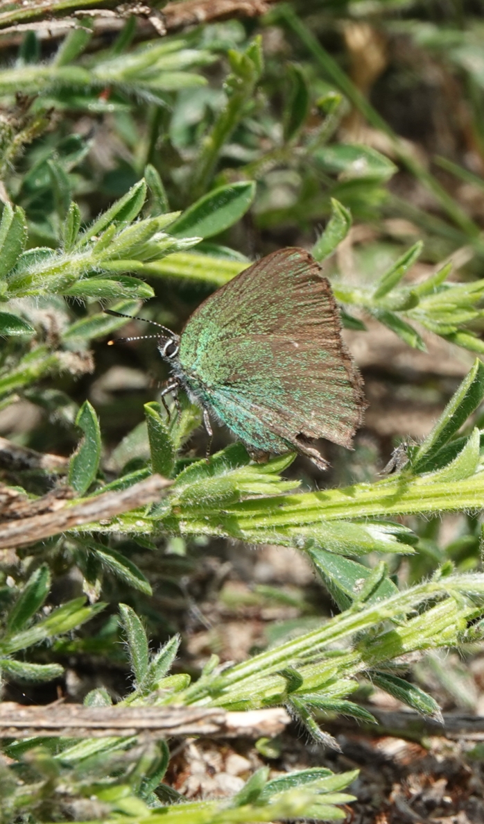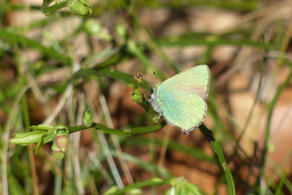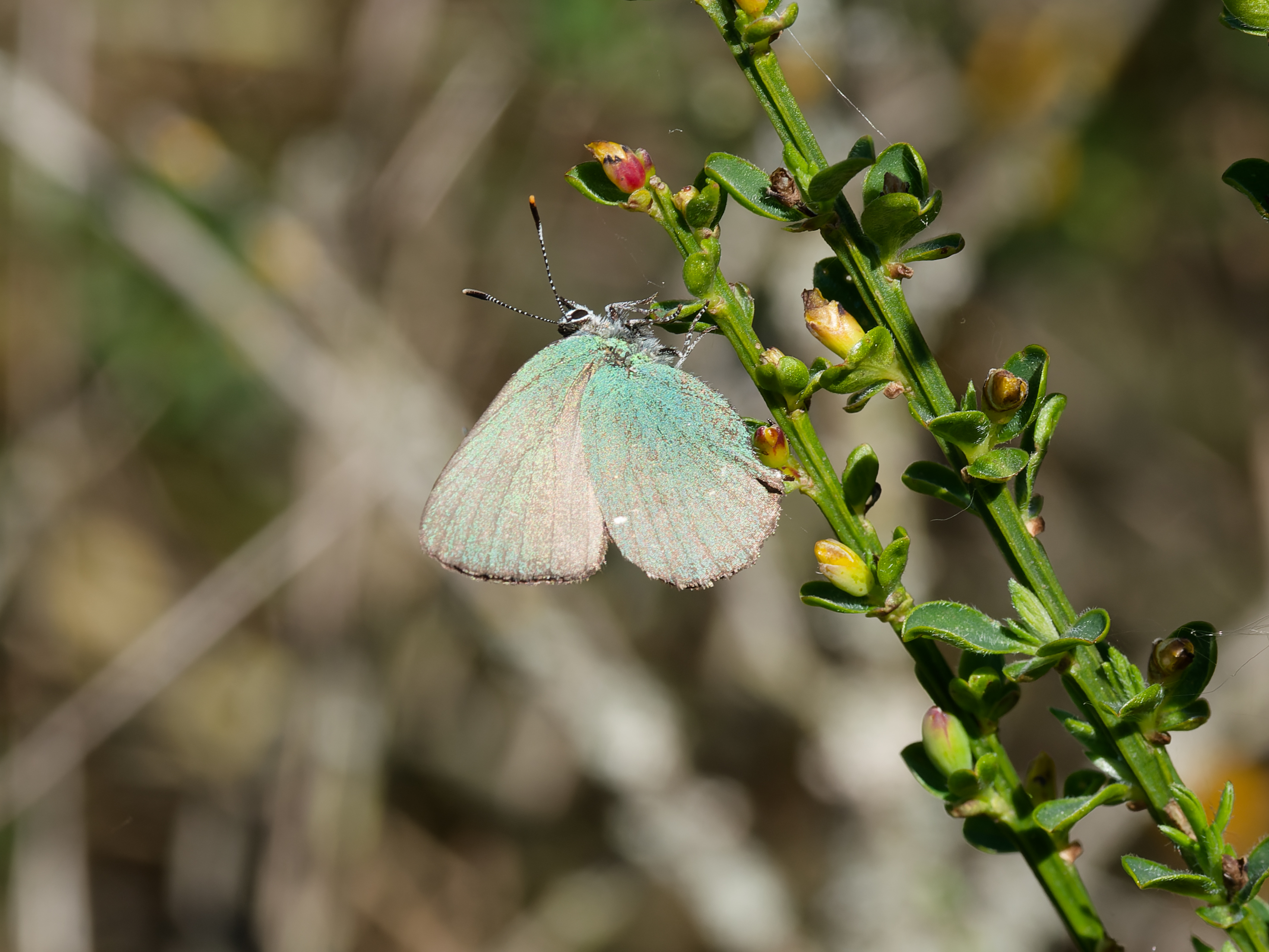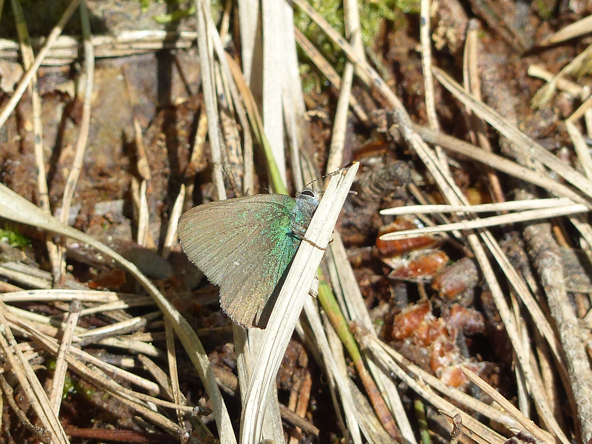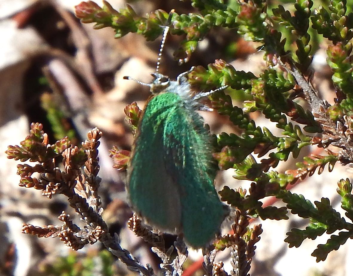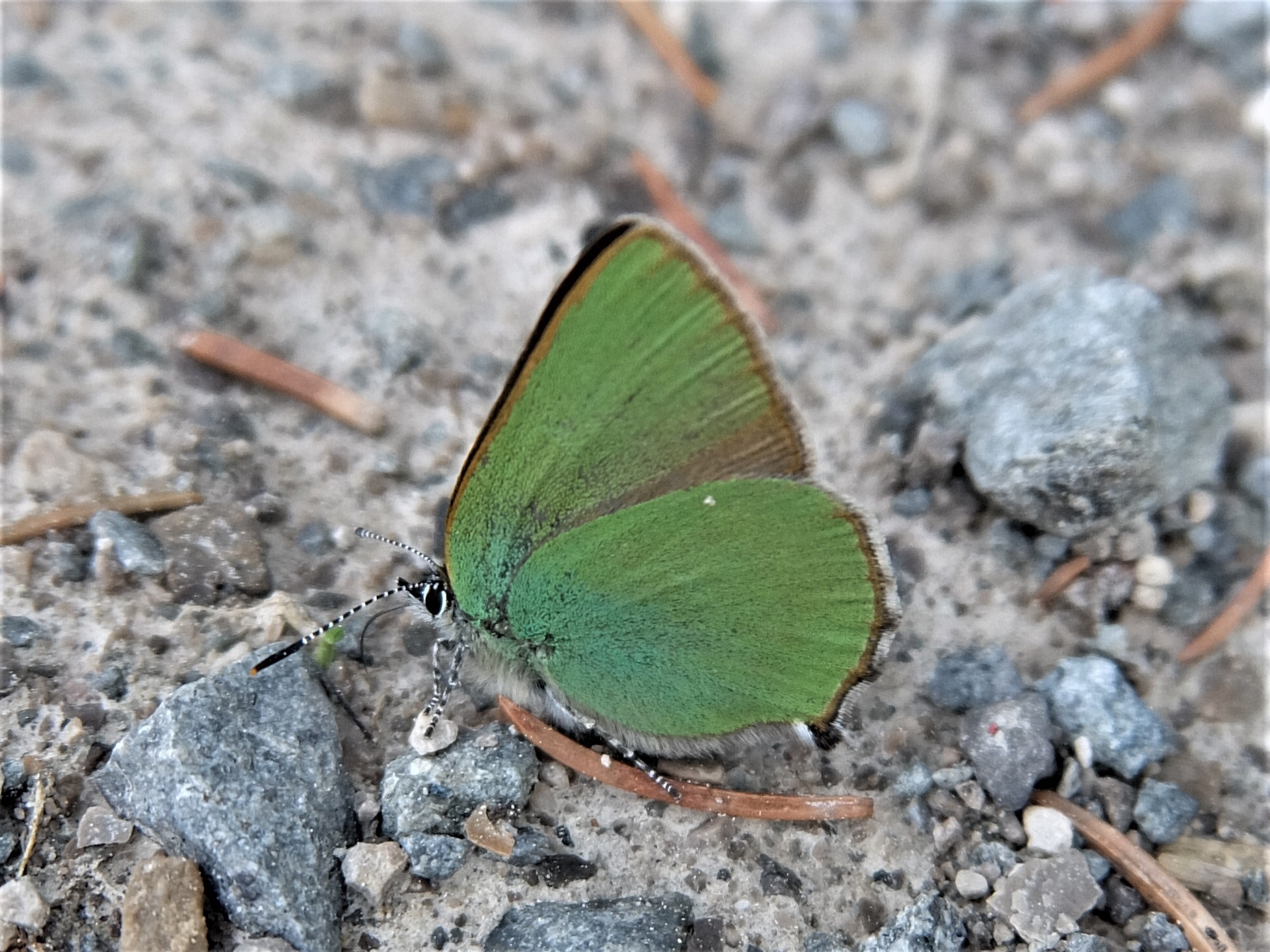 Grüner Zipfelfalter, im NSG Presseler Heide,- Wald,- und Moorgebiet, ca. 3 km nördl. von Wöllnau, am 17.05.2020