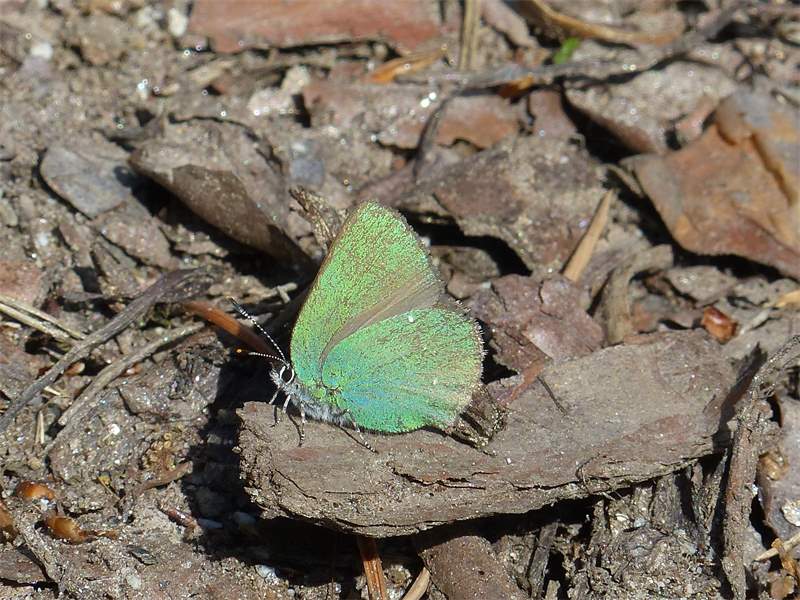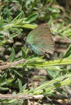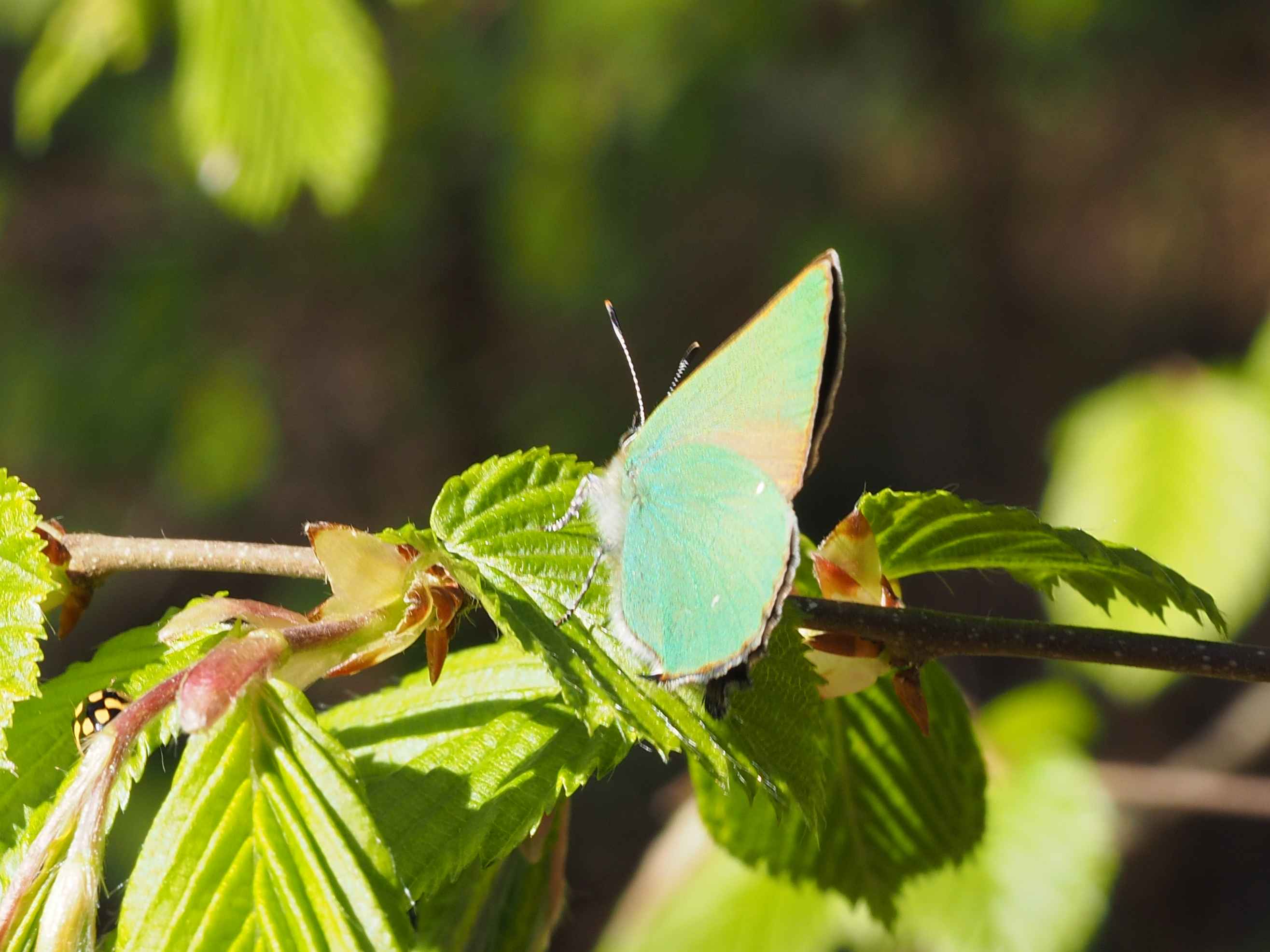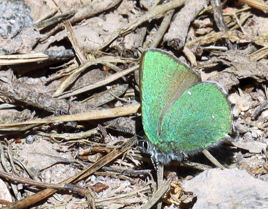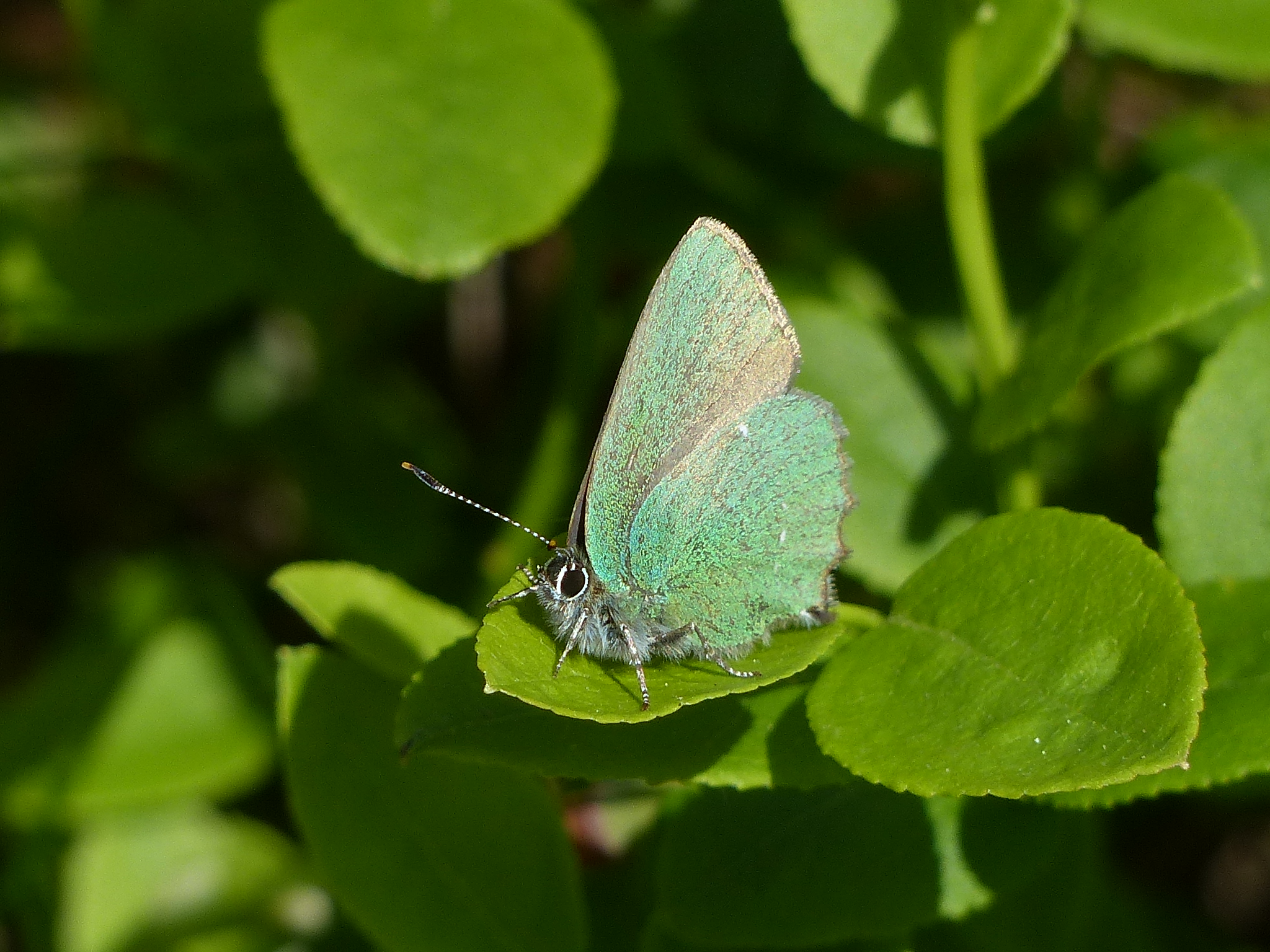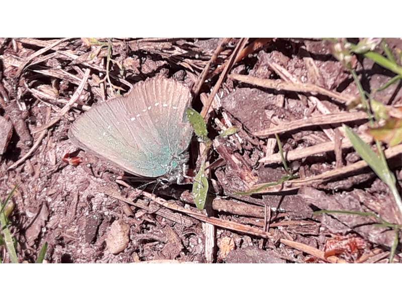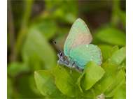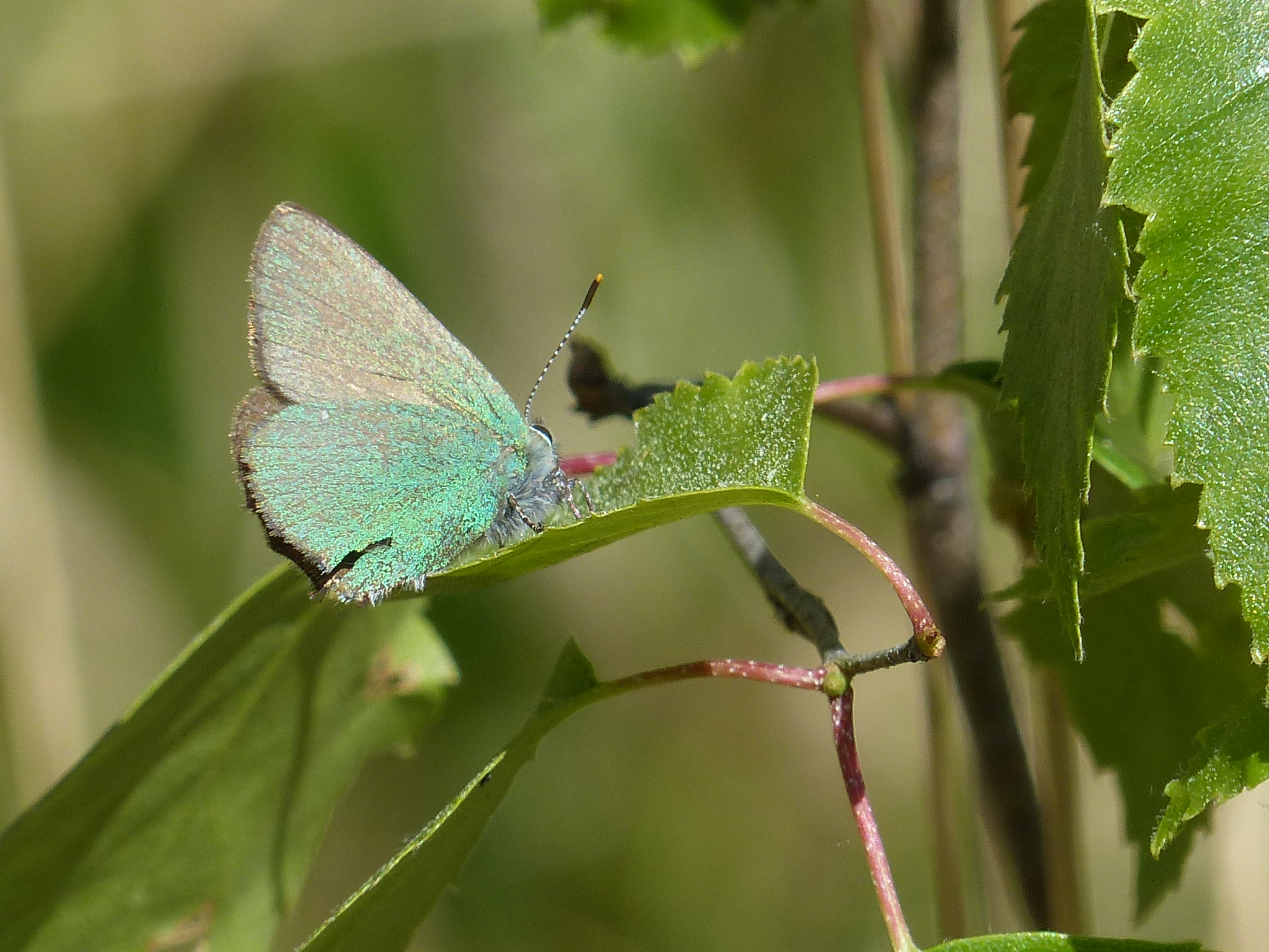 Grüner Zipfelfalter, im NSG Presseler Heide,- Wald,- und Moorgebiet, ca. 3 km nördl. von Wöllnau, am 17.05.2020