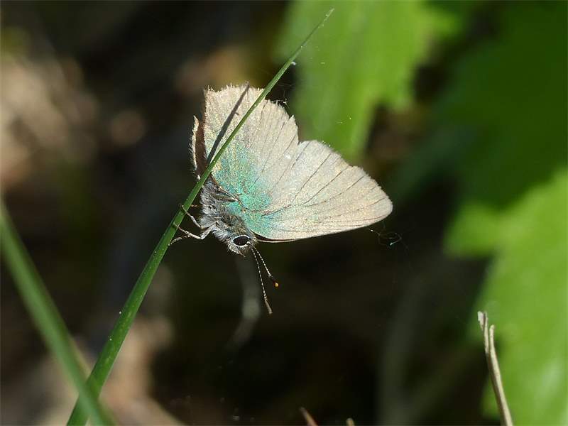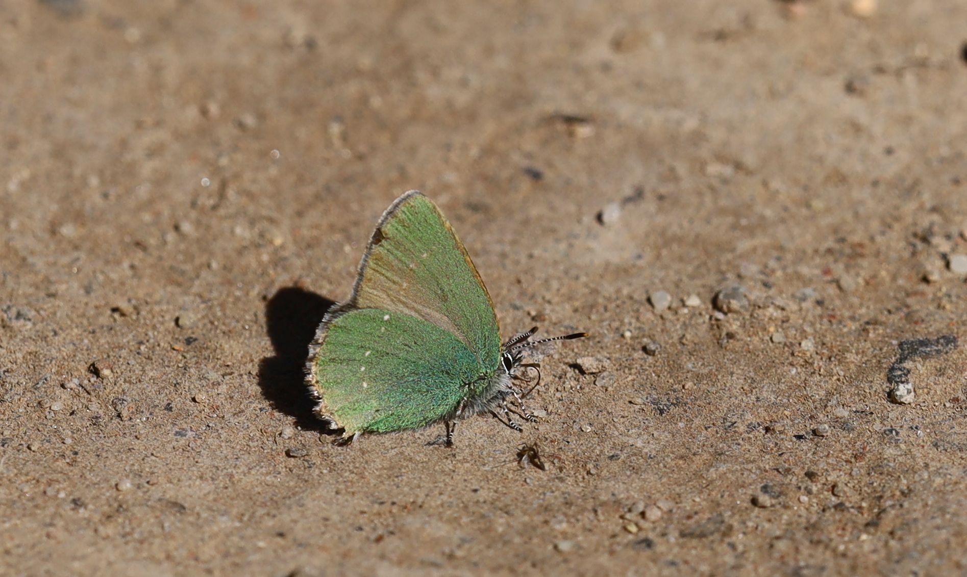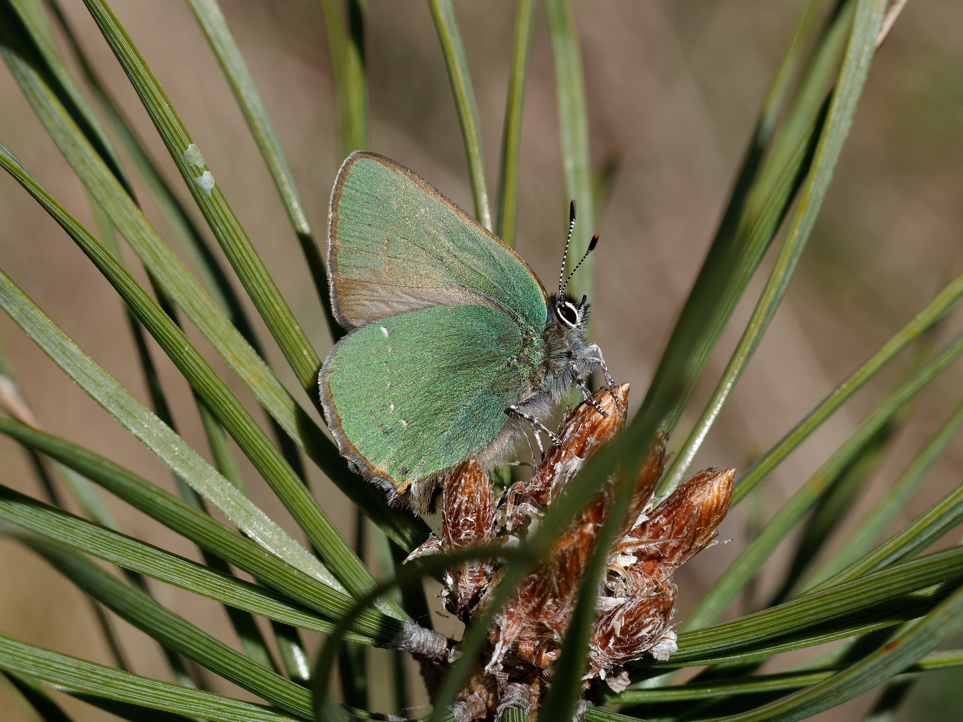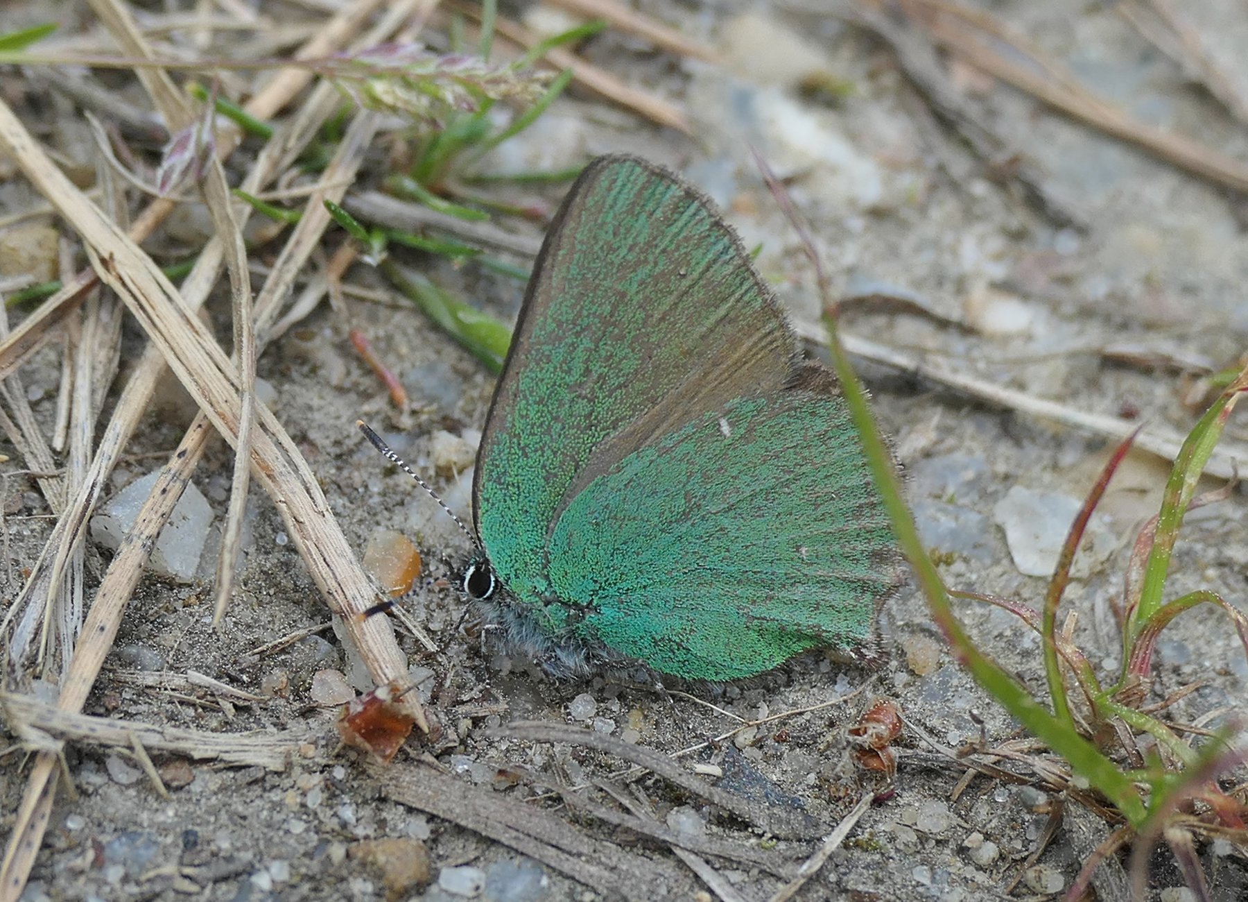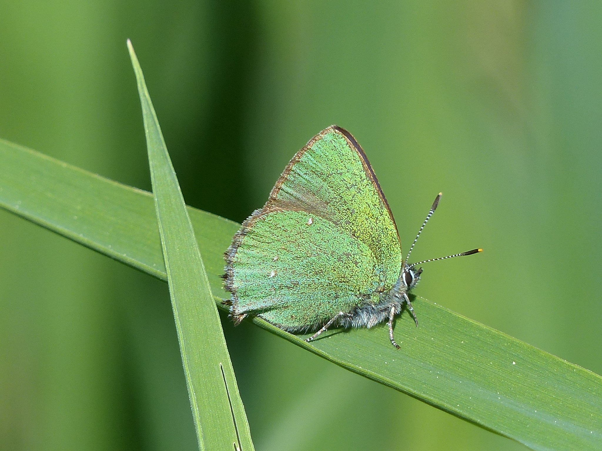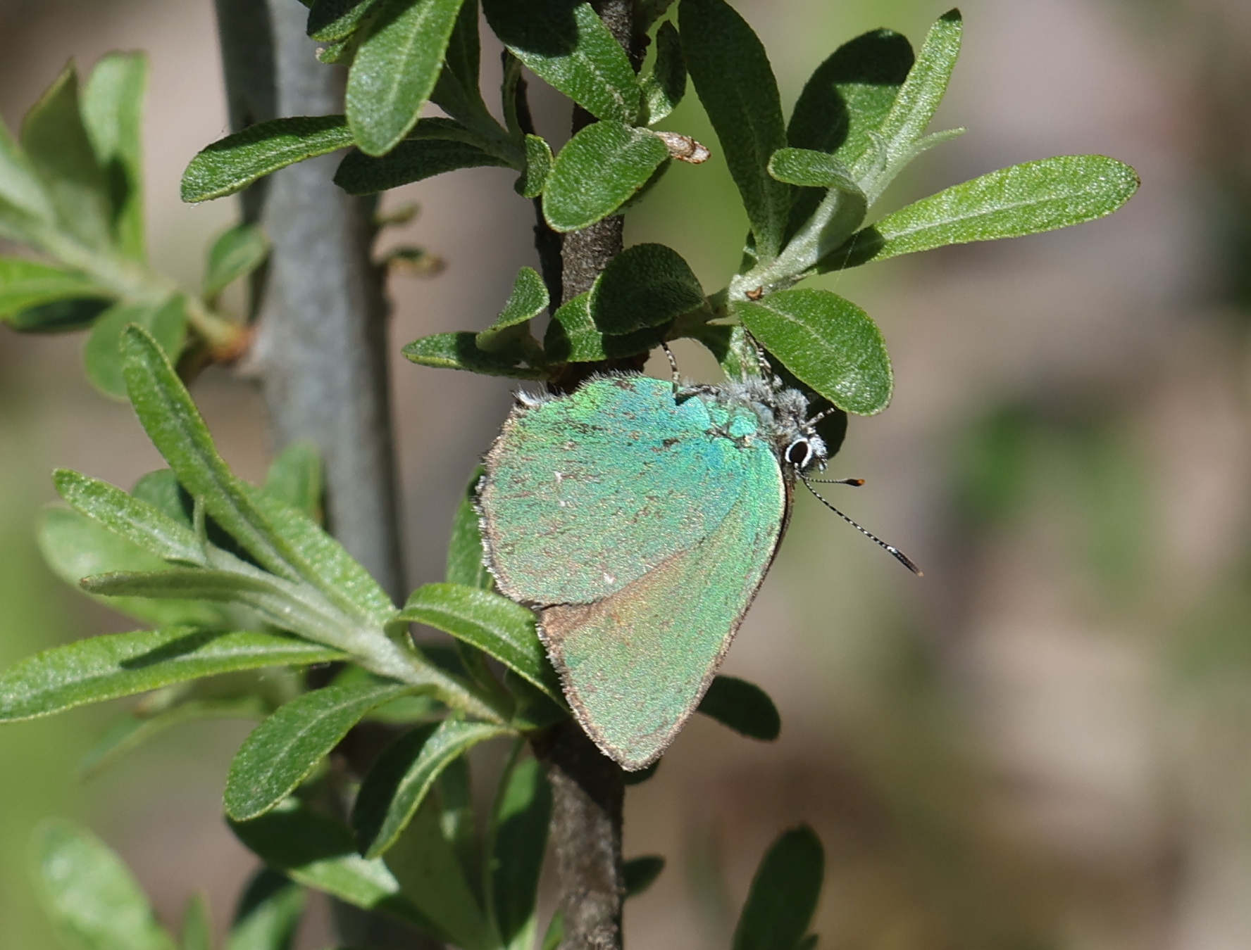 Grüner Zipfelfalter, im NSG Presseler Heide,- Wald,- und Moorgebiet, ca. 3 km nördl. von Wöllnau, am 17.05.2020