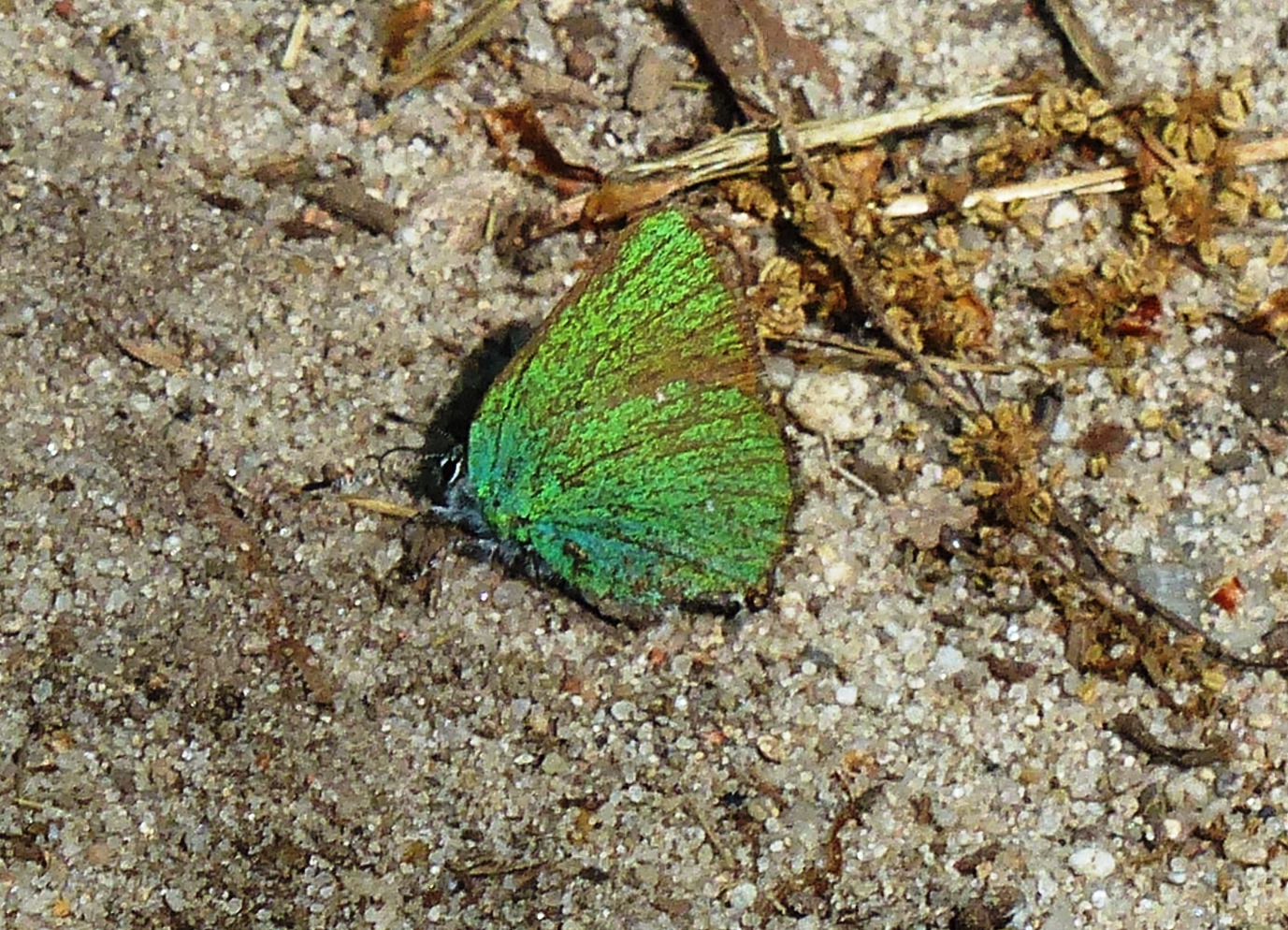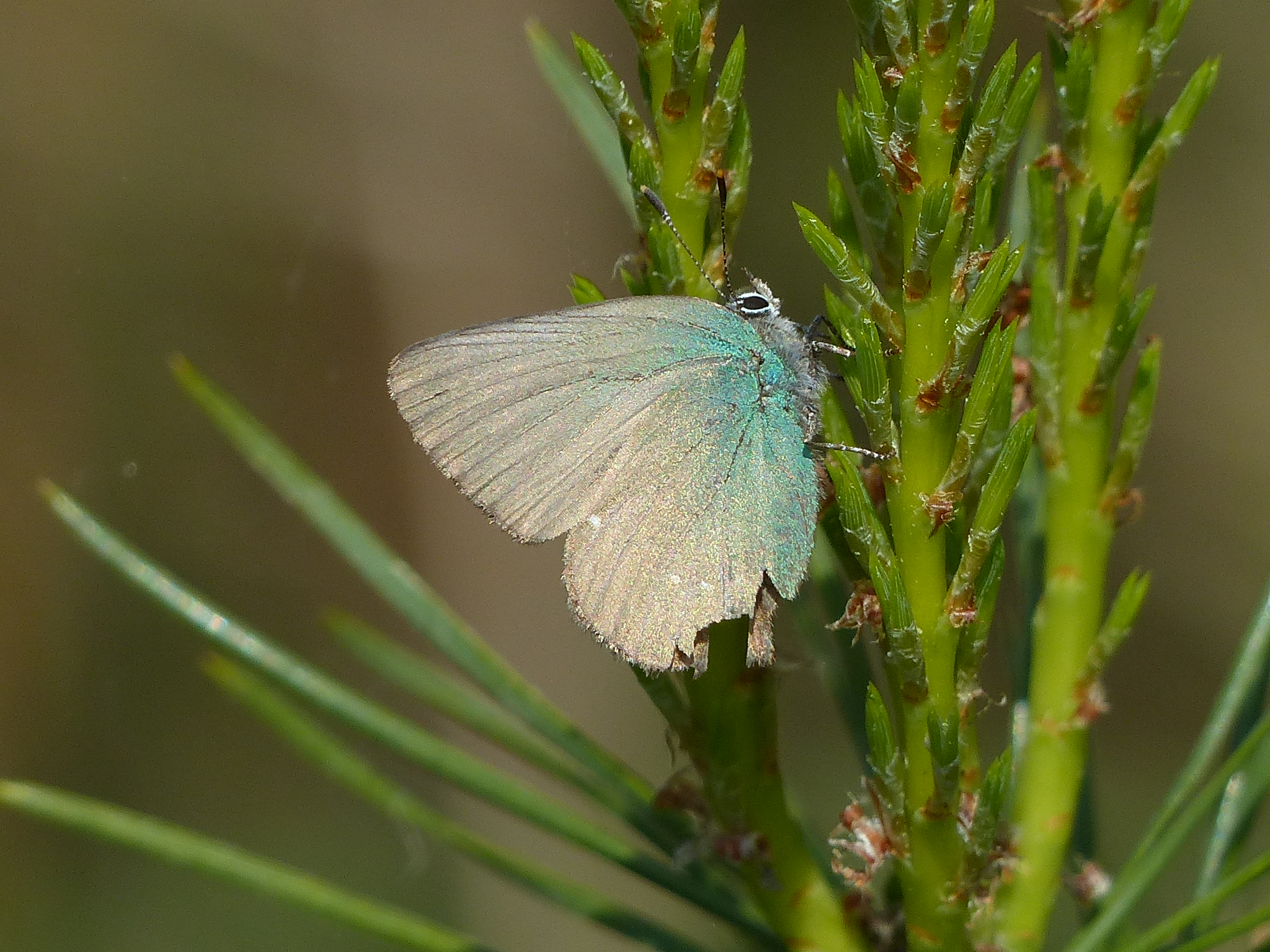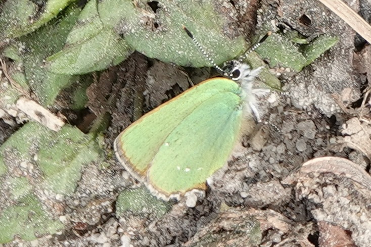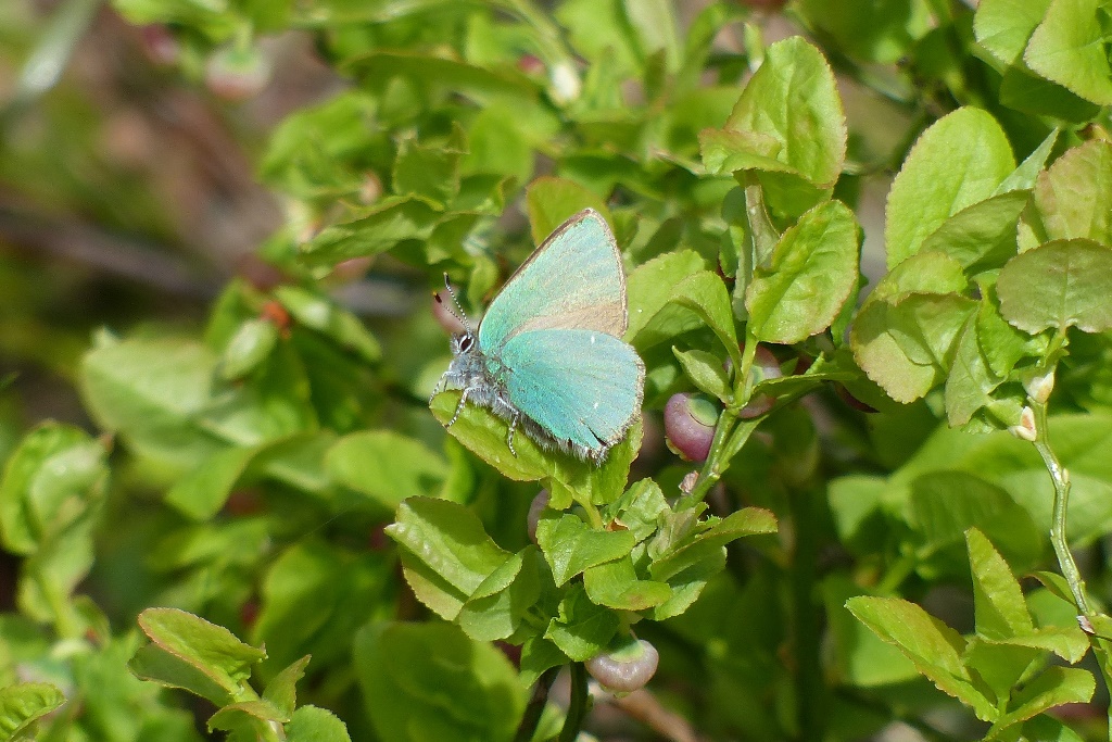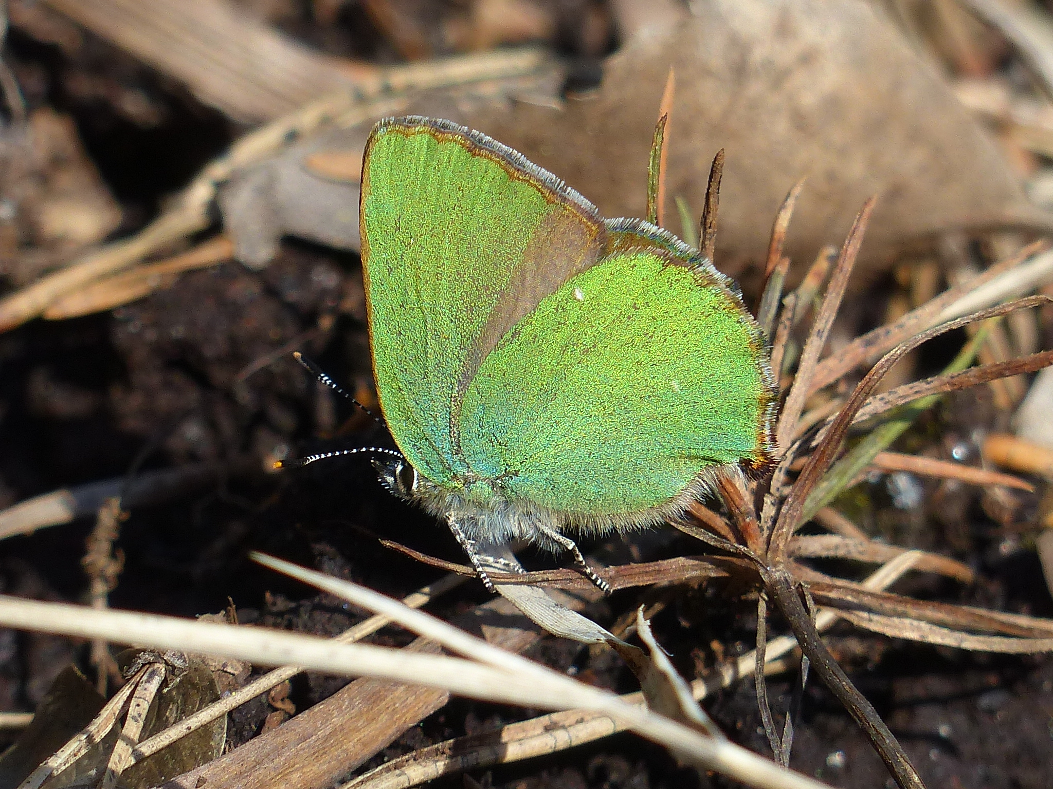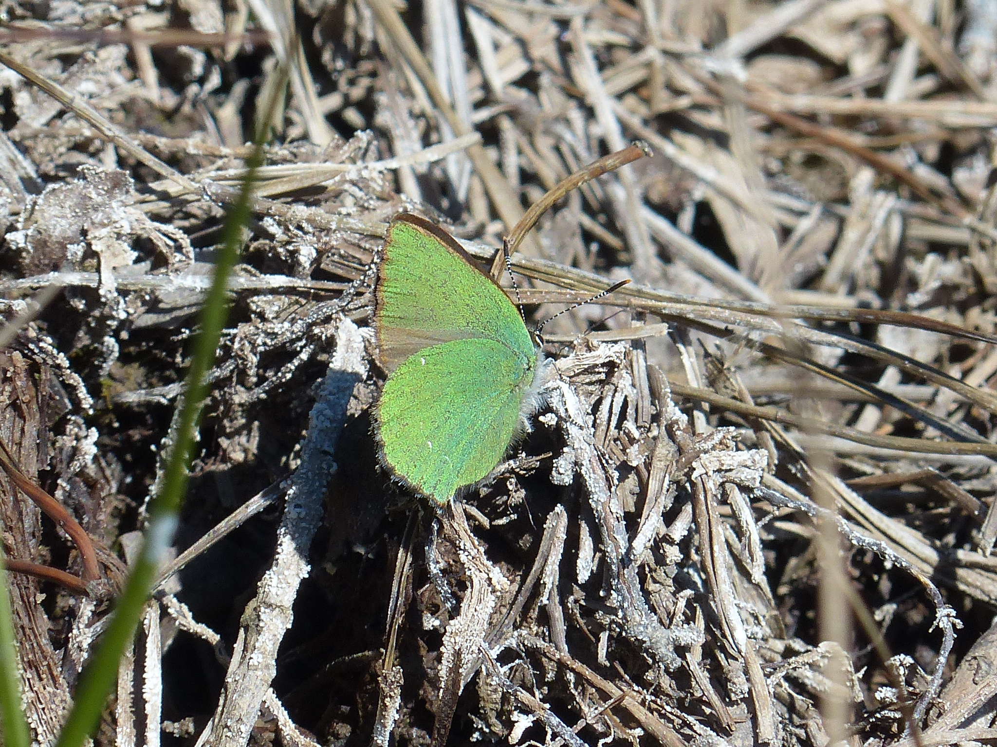 Grüner Zipfelfalter, im NSG Presseler Heide,- Wald,- und Moorgebiet, ca. 3 km nördl. von Wöllnau, am 17.05.2020