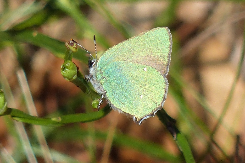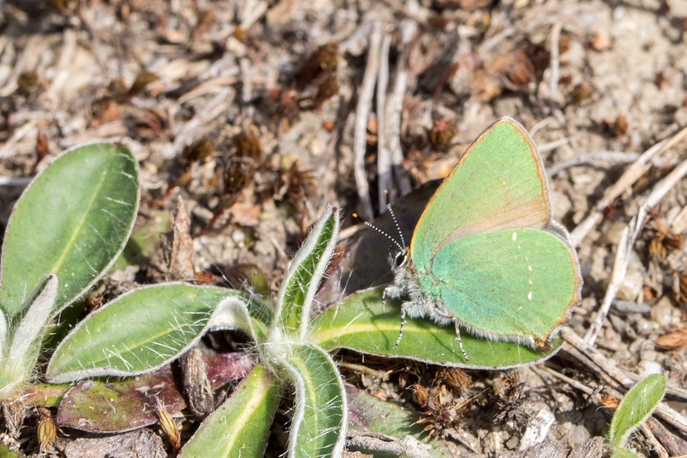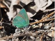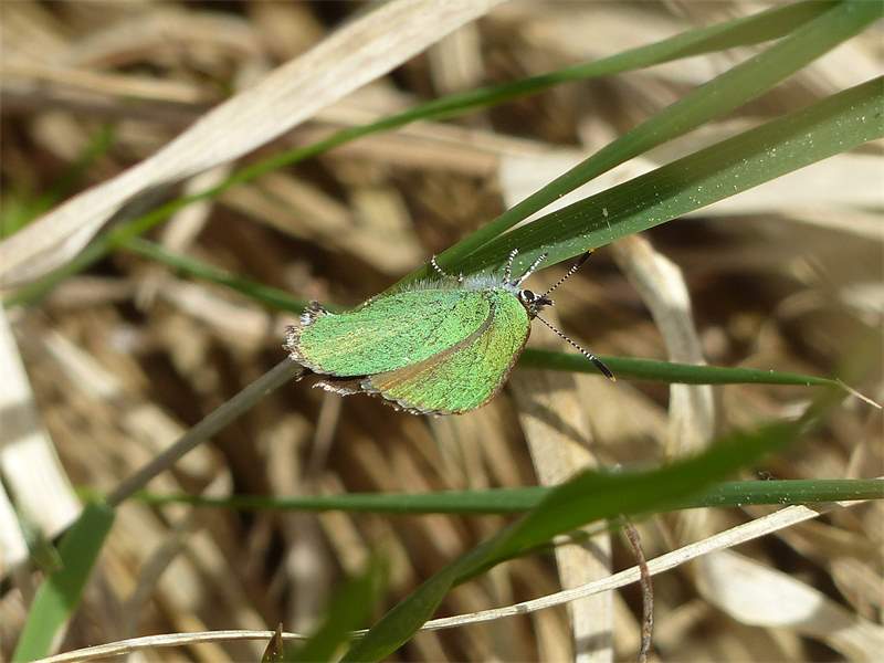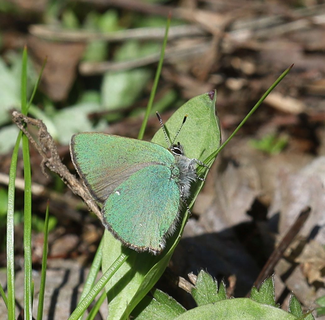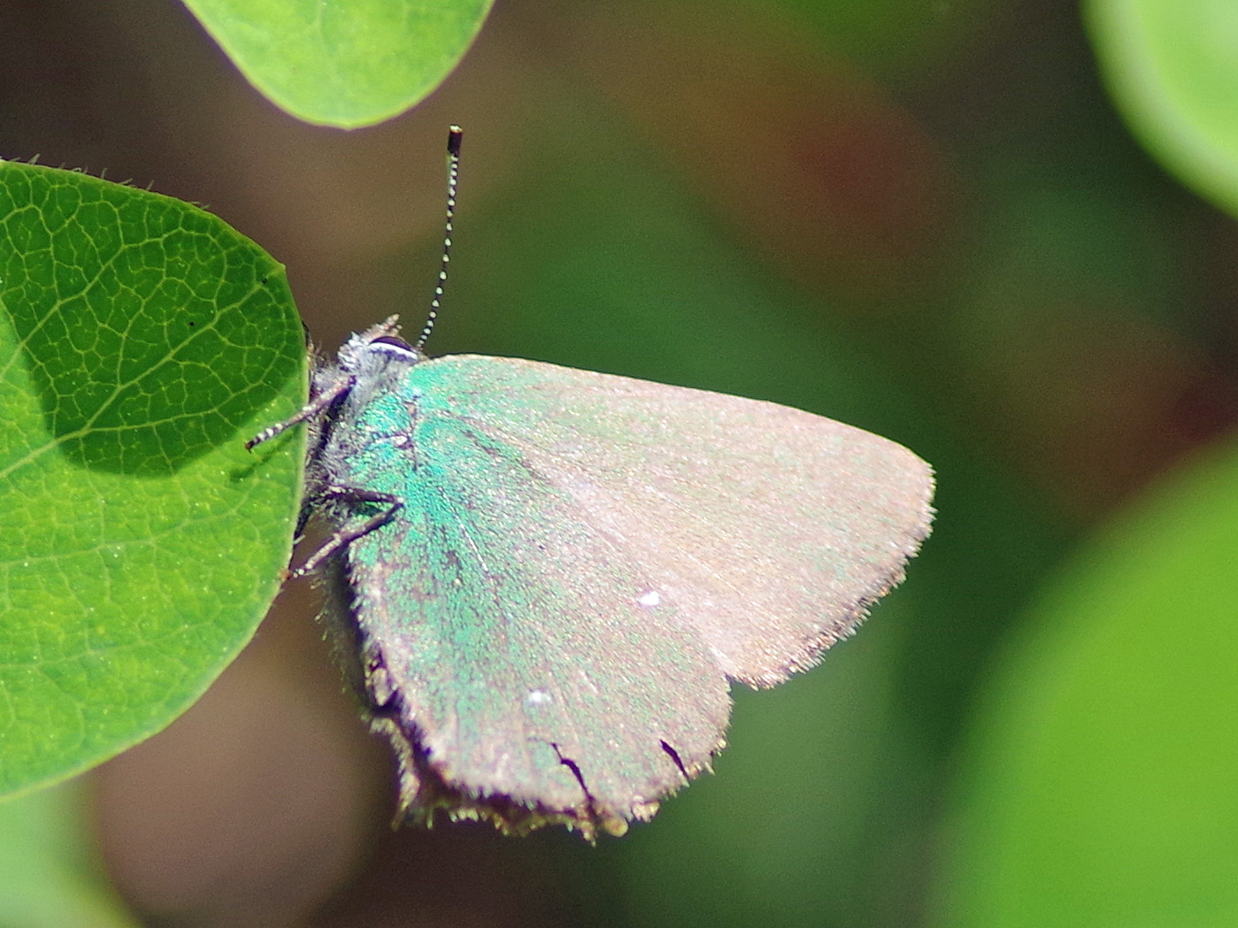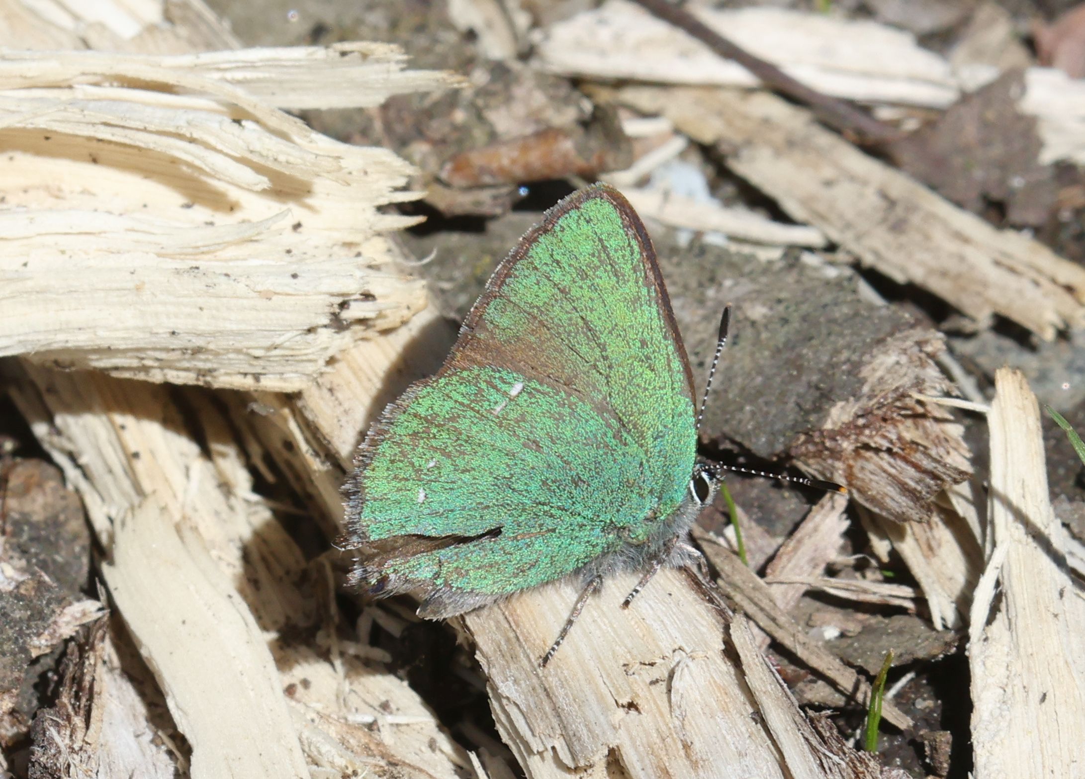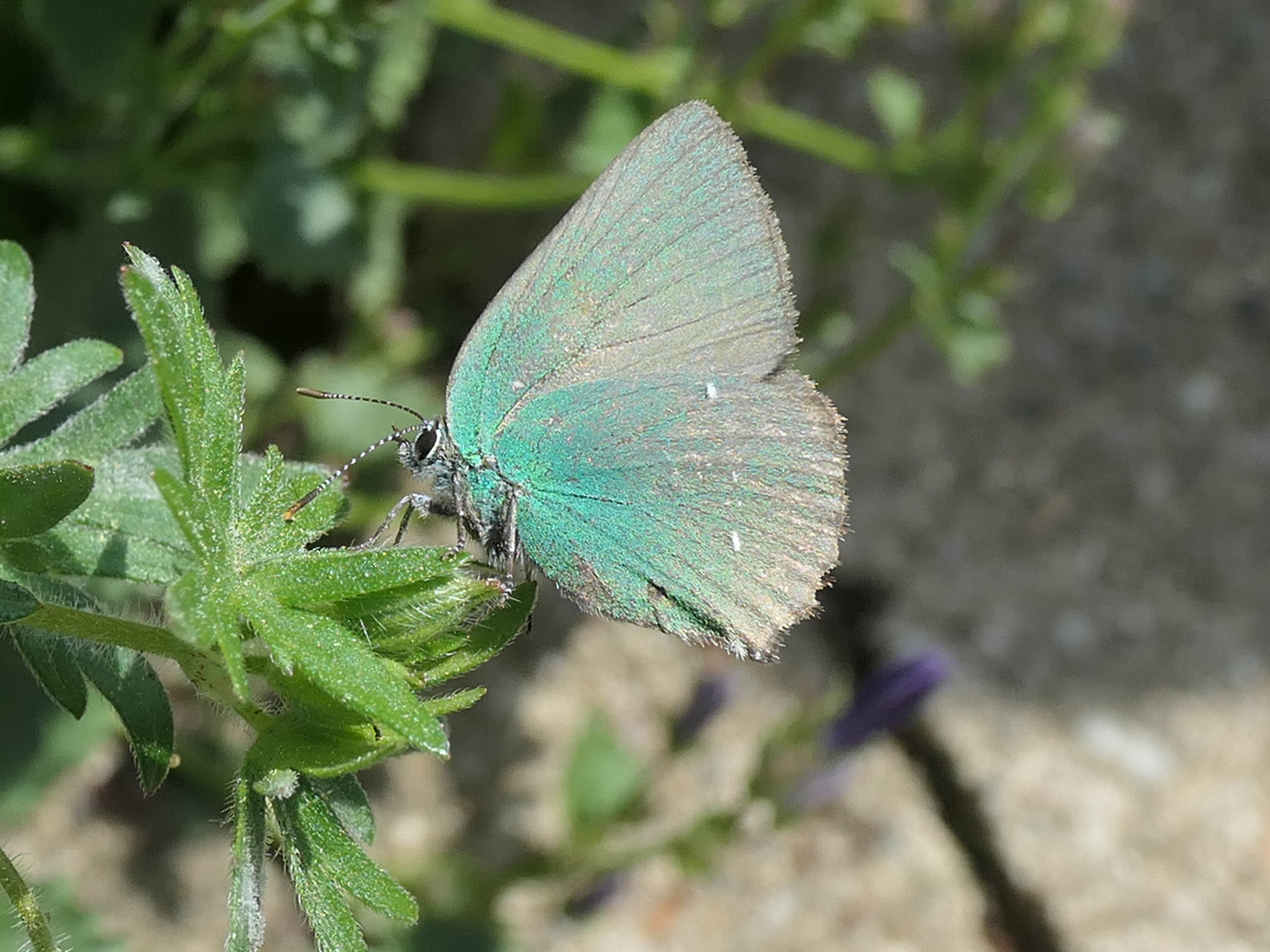 Grüner Zipfelfalter, im NSG Presseler Heide,- Wald,- und Moorgebiet, ca. 3 km nördl. von Wöllnau, am 17.05.2020
