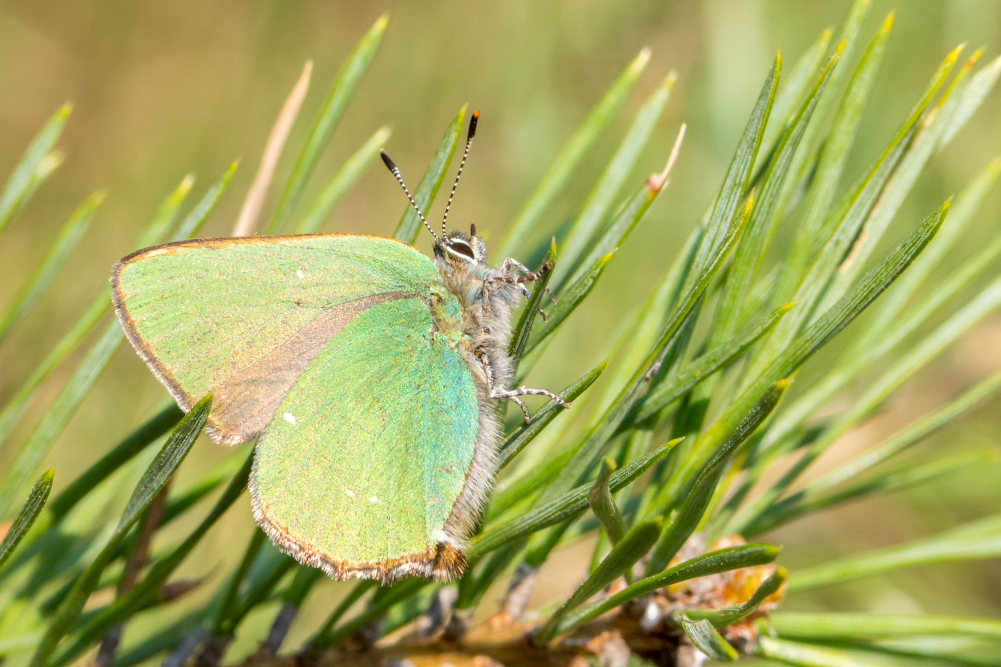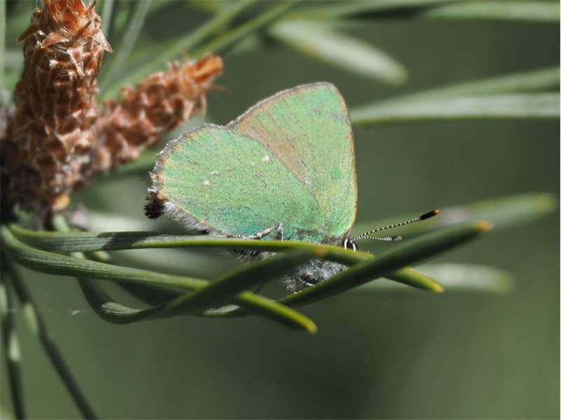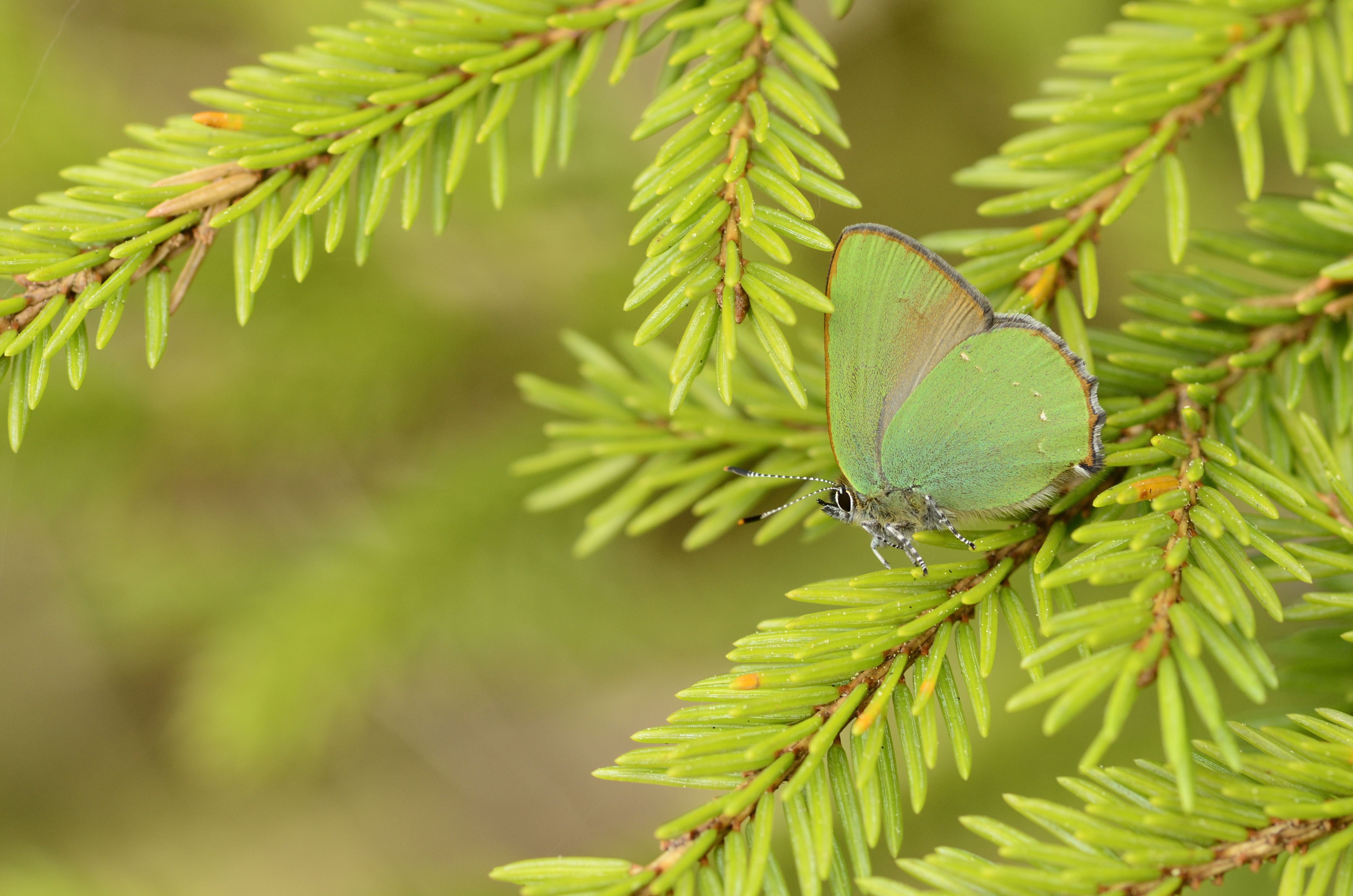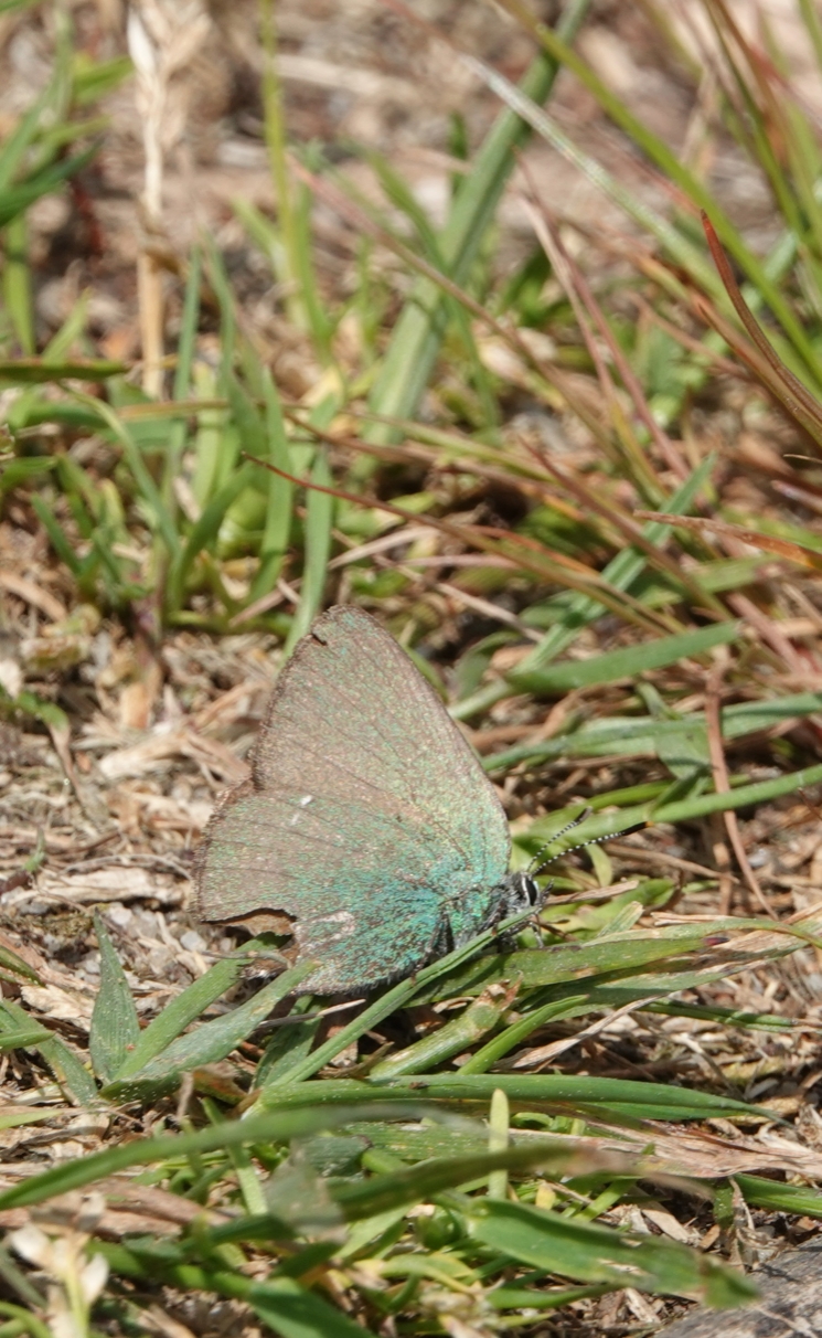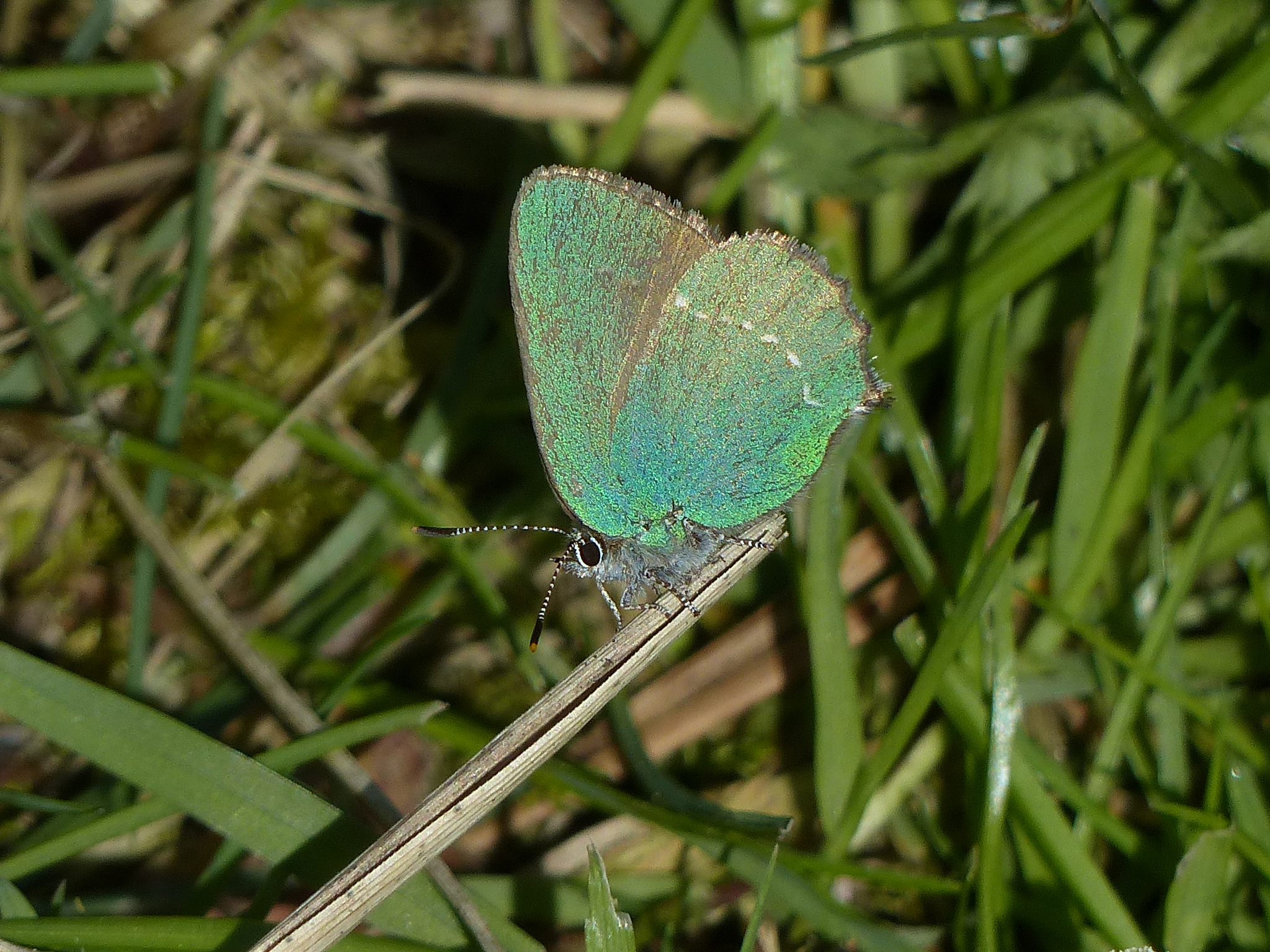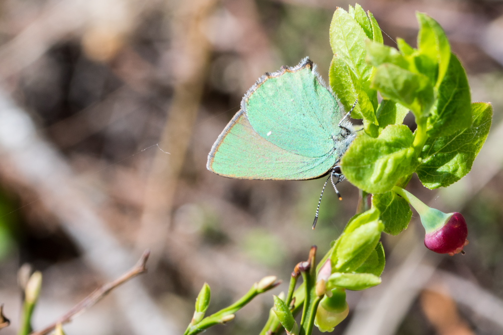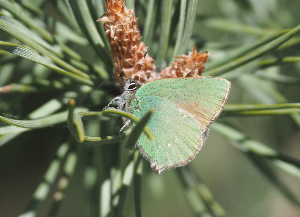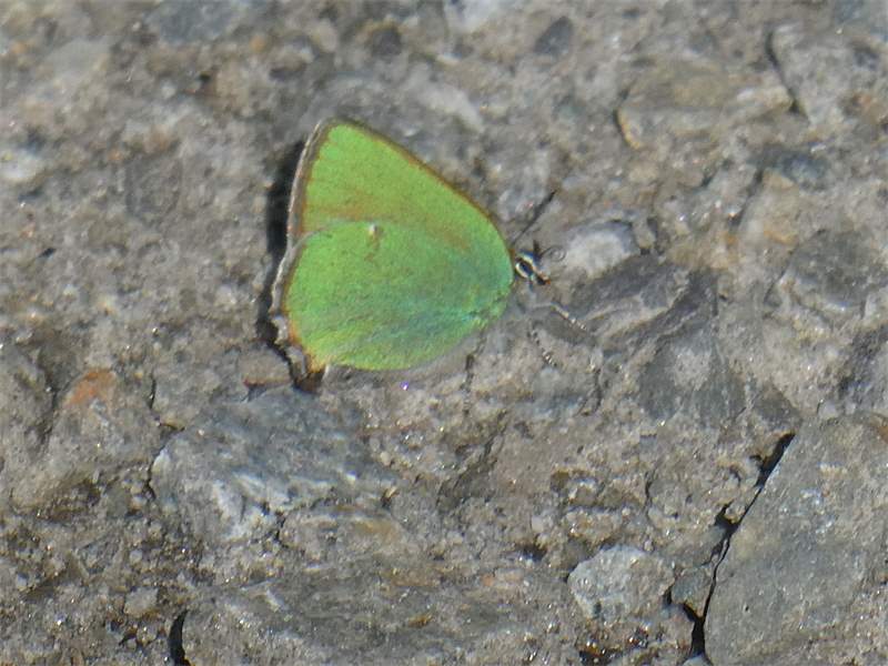 Grüner Zipfelfalter, im NSG Presseler Heide,- Wald,- und Moorgebiet, ca. 3 km nördl. von Wöllnau, am 17.05.2020