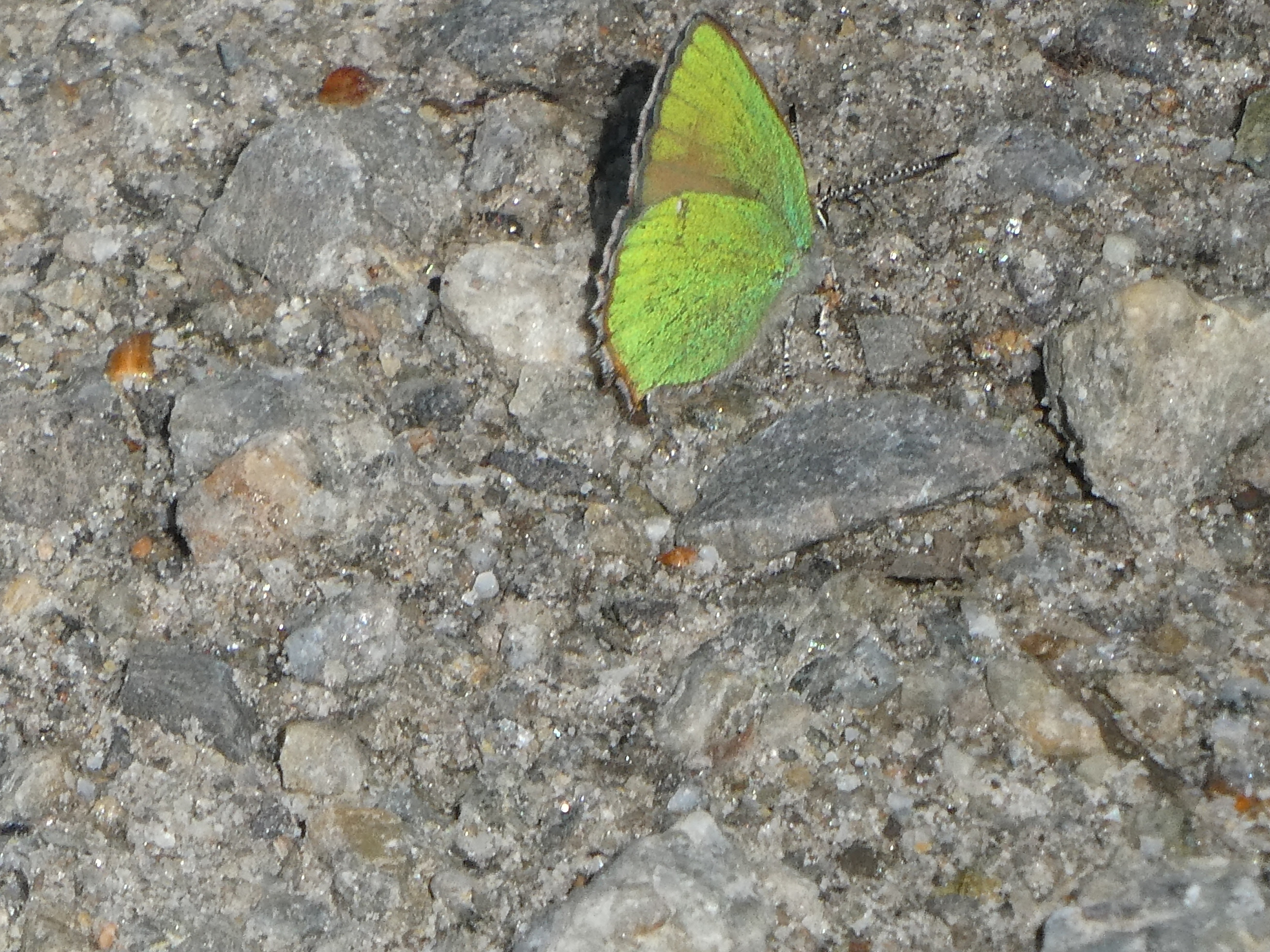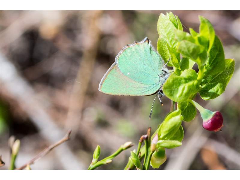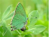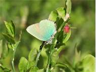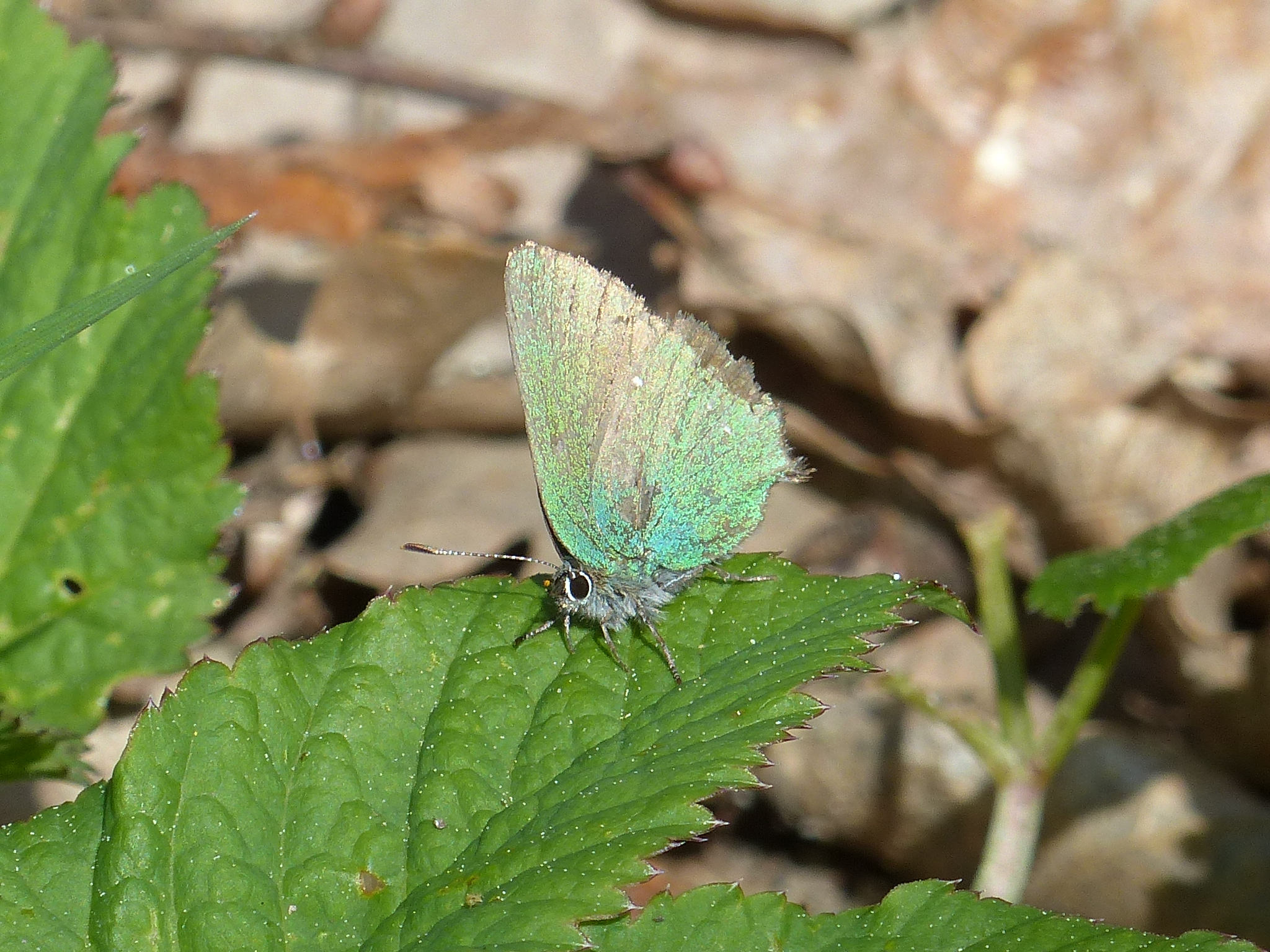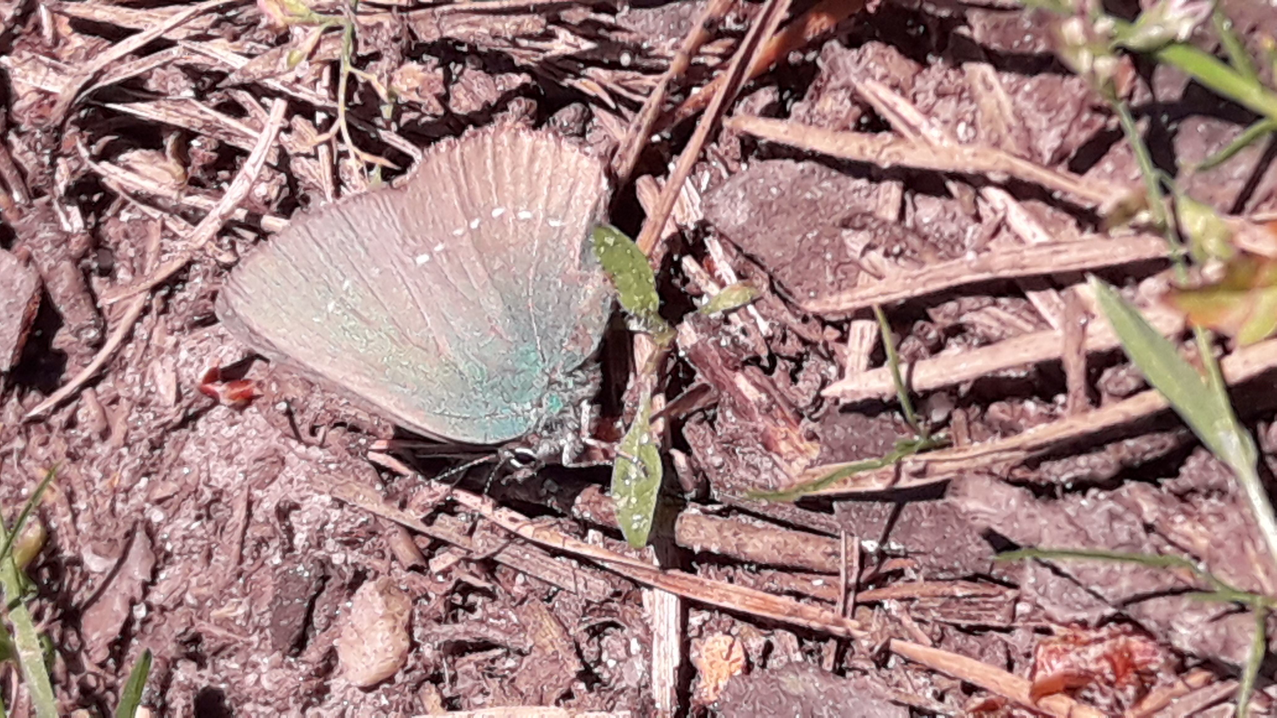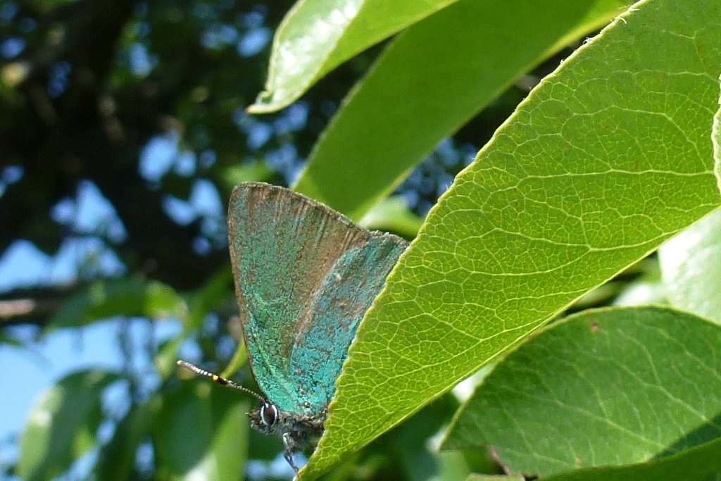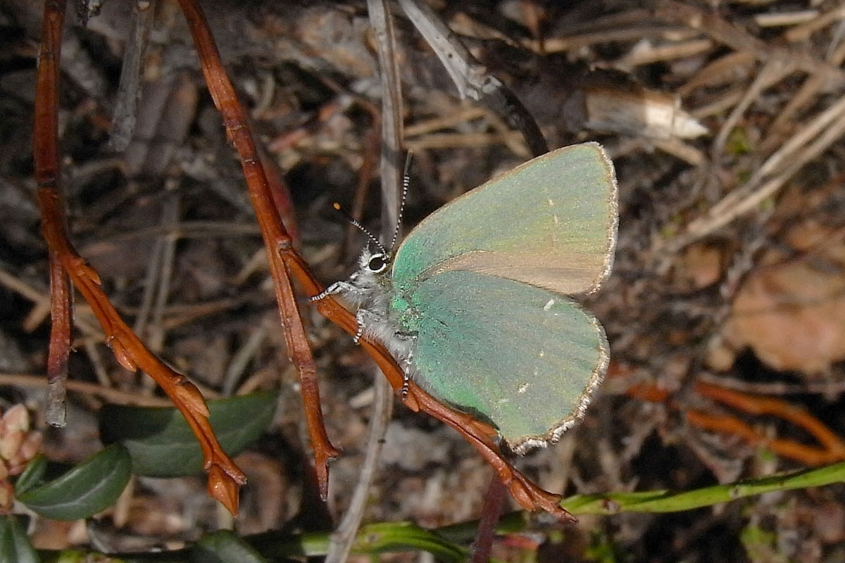 Grüner Zipfelfalter, im NSG Presseler Heide,- Wald,- und Moorgebiet, ca. 3 km nördl. von Wöllnau, am 17.05.2020