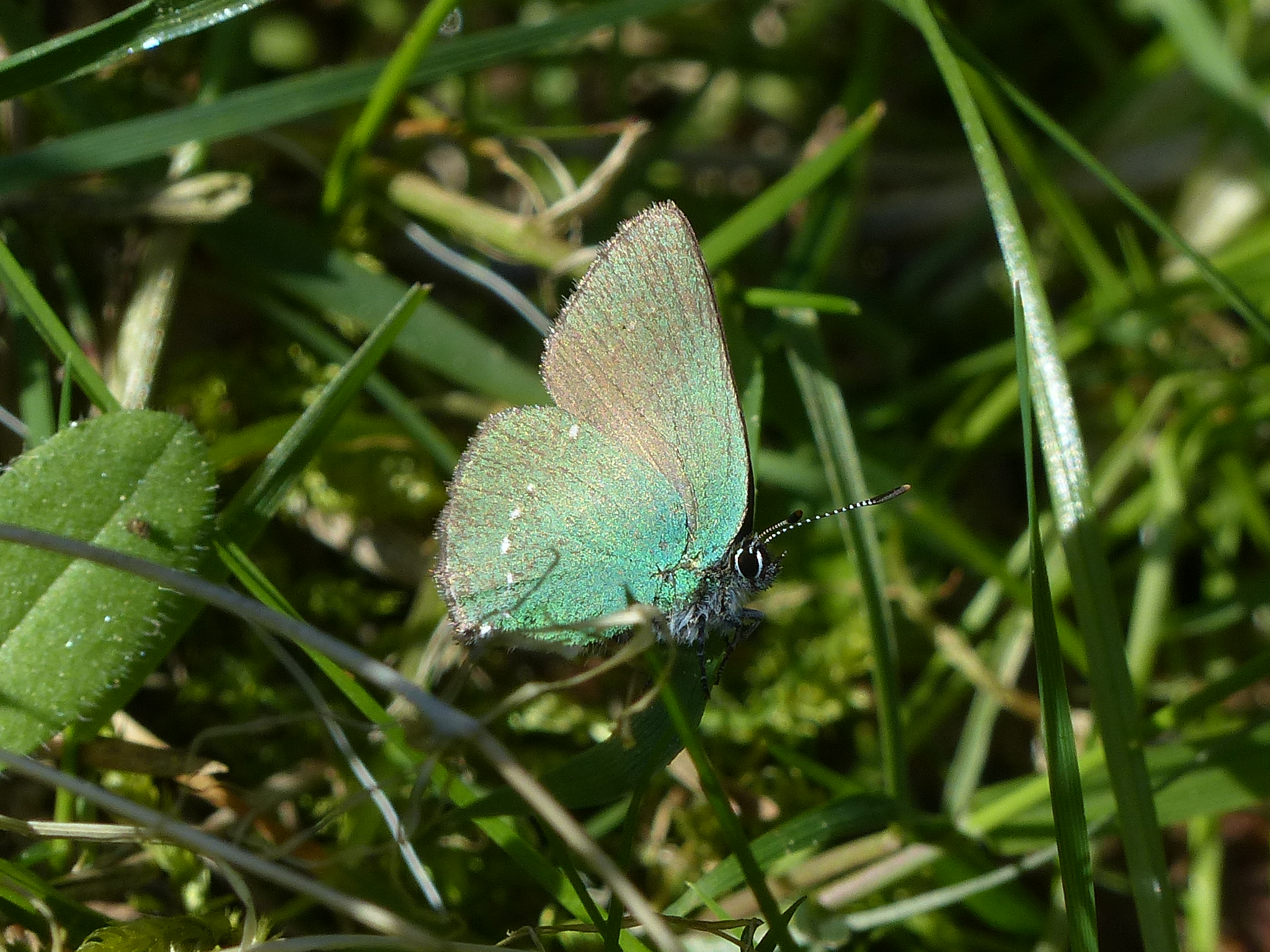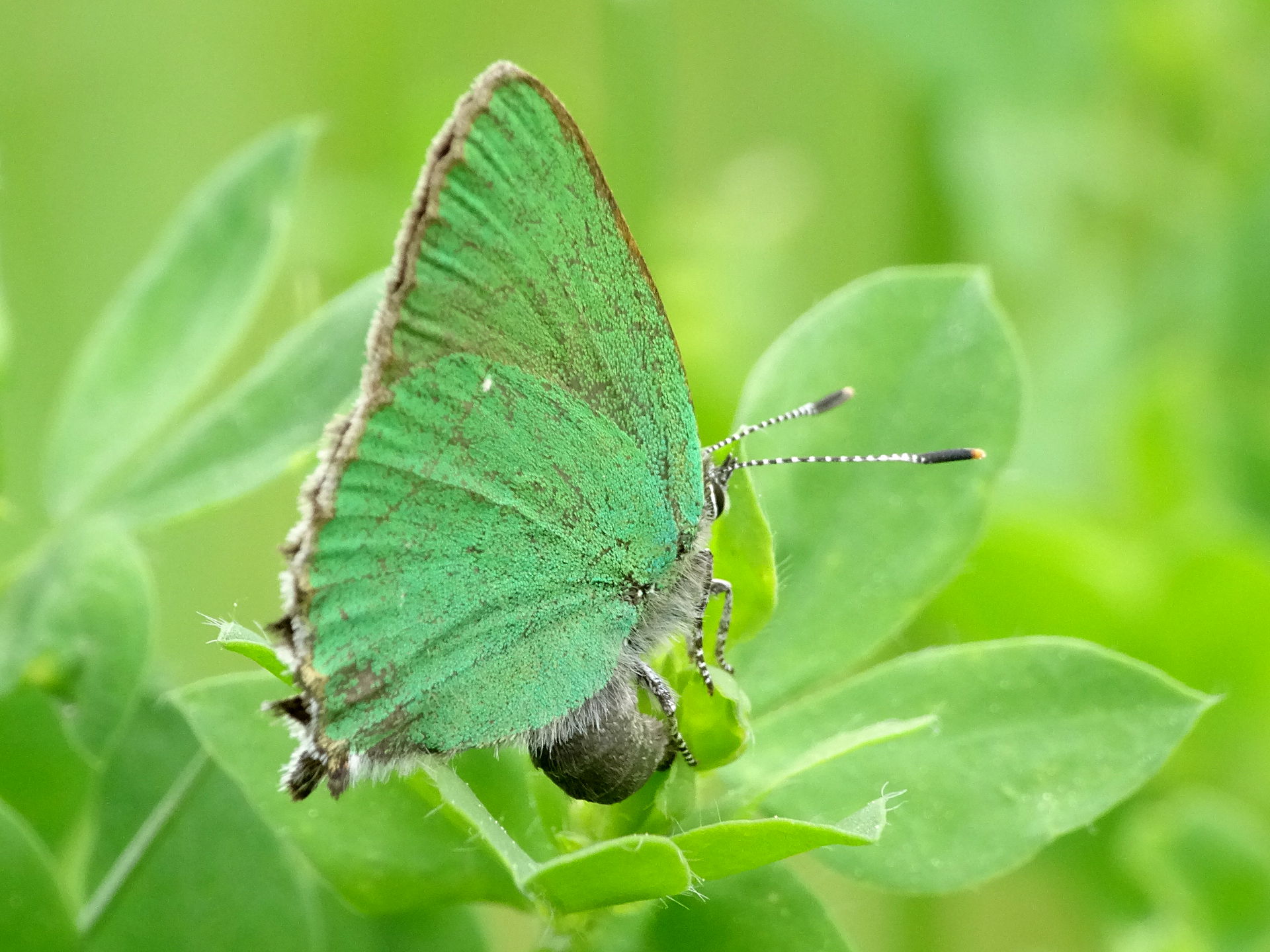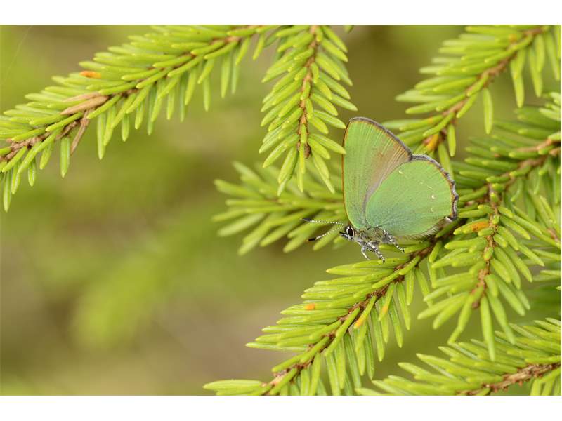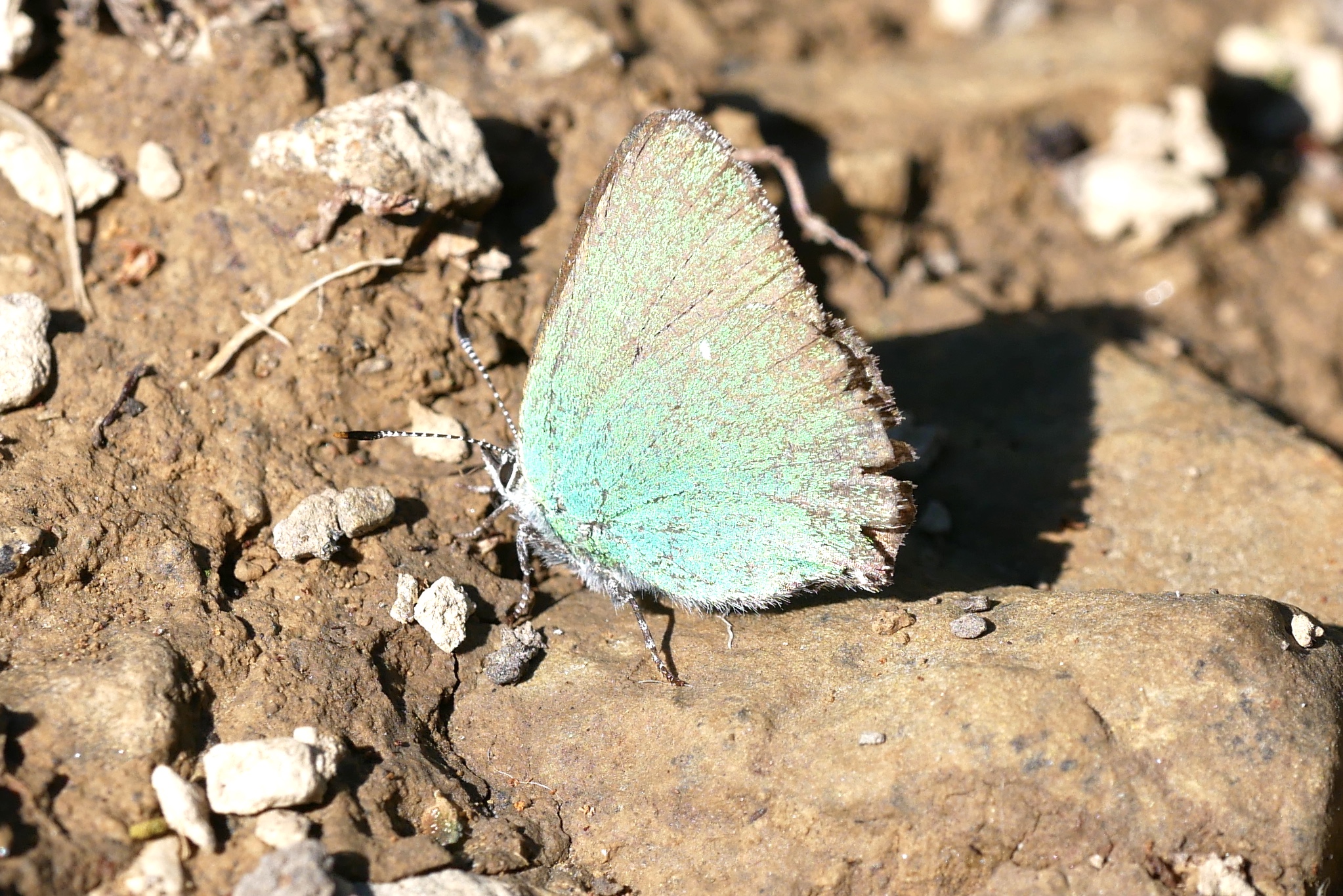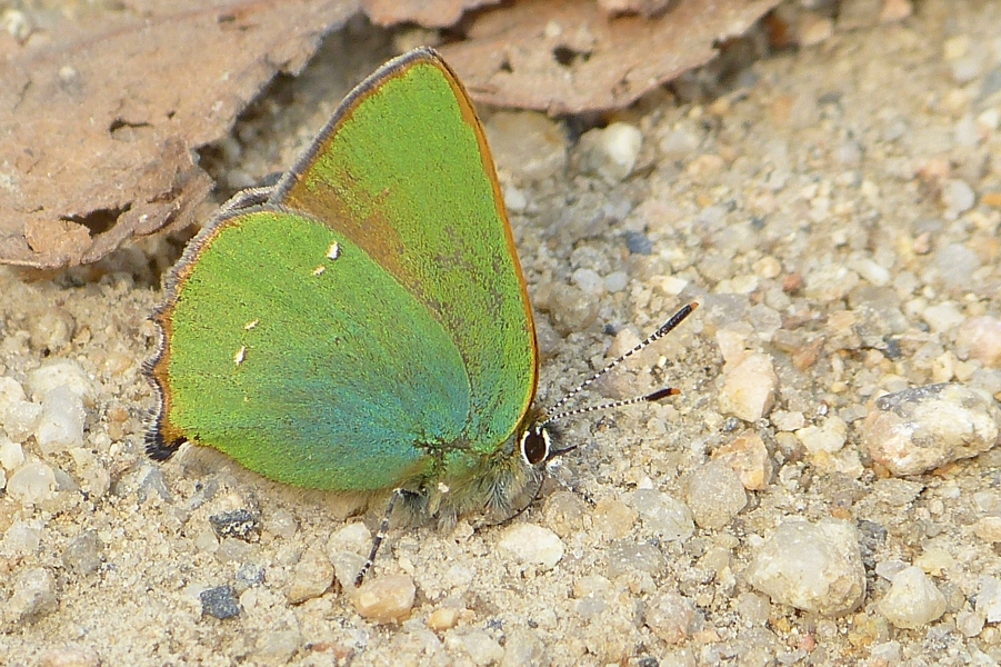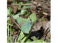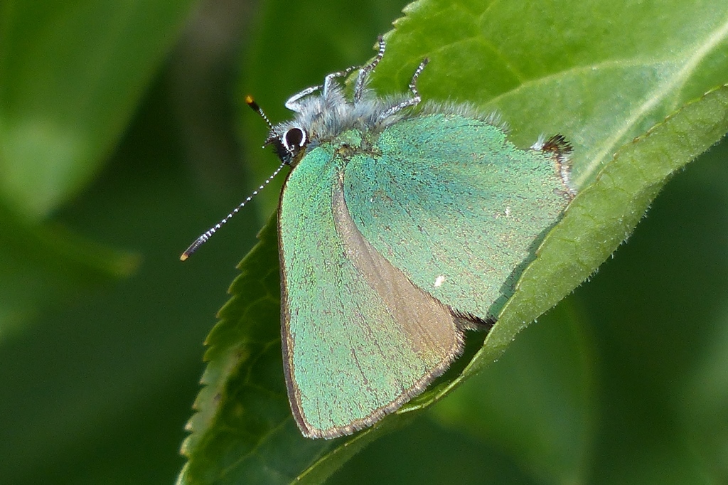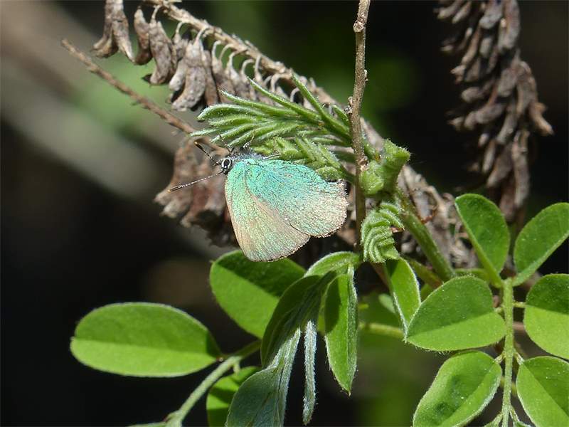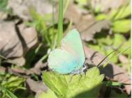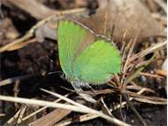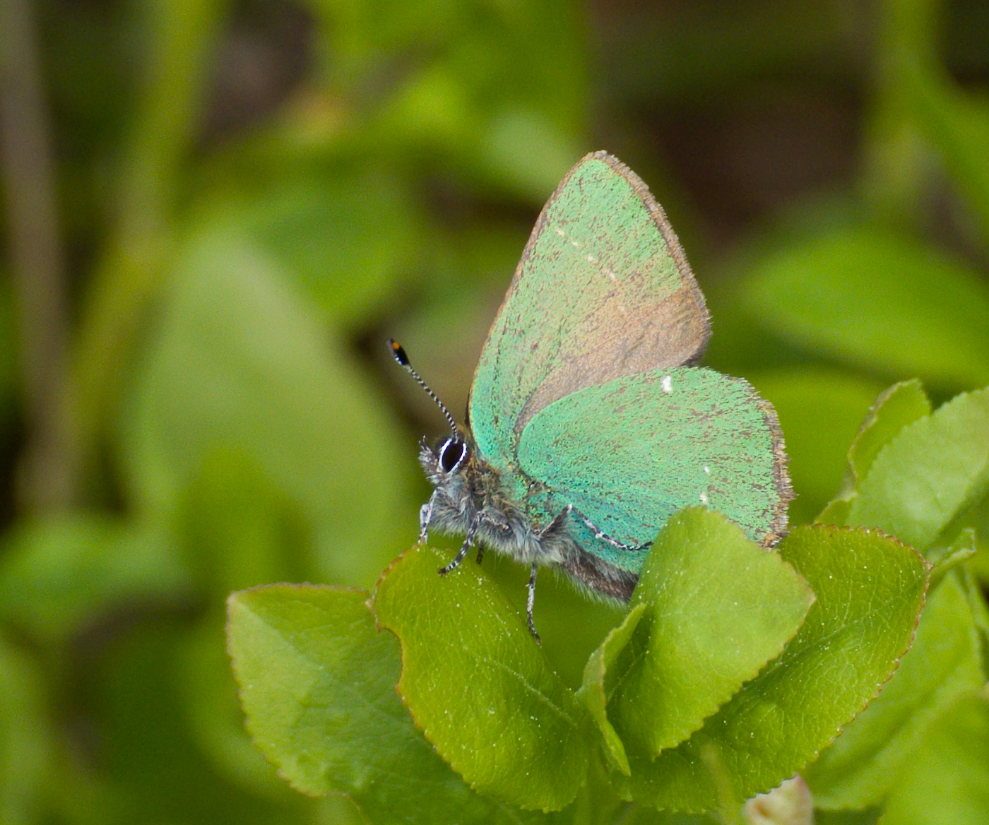 Grüner Zipfelfalter, im NSG Presseler Heide,- Wald,- und Moorgebiet, ca. 3 km nördl. von Wöllnau, am 17.05.2020