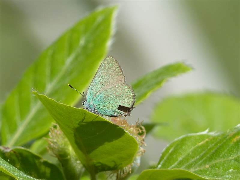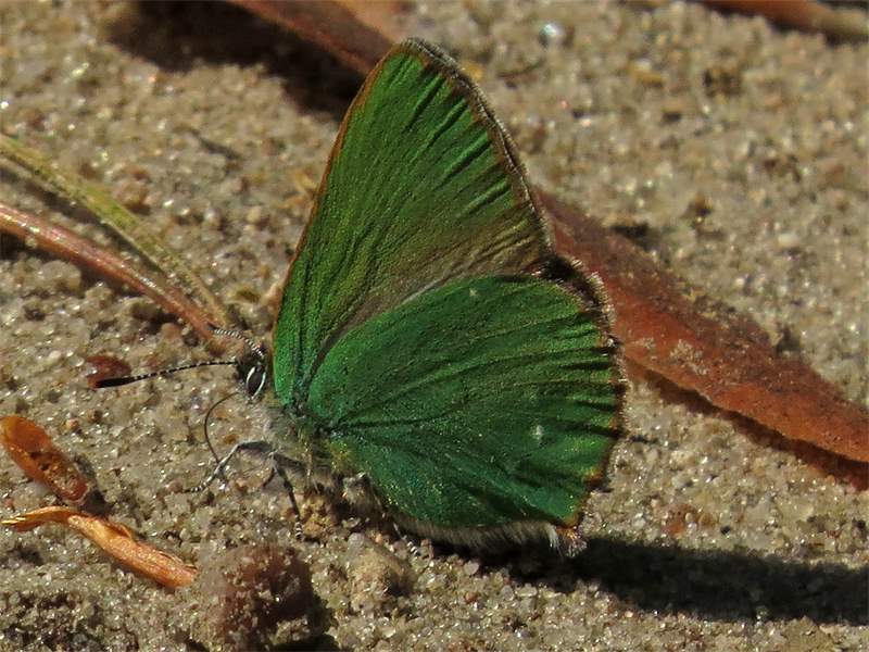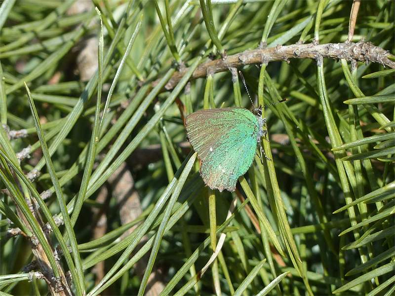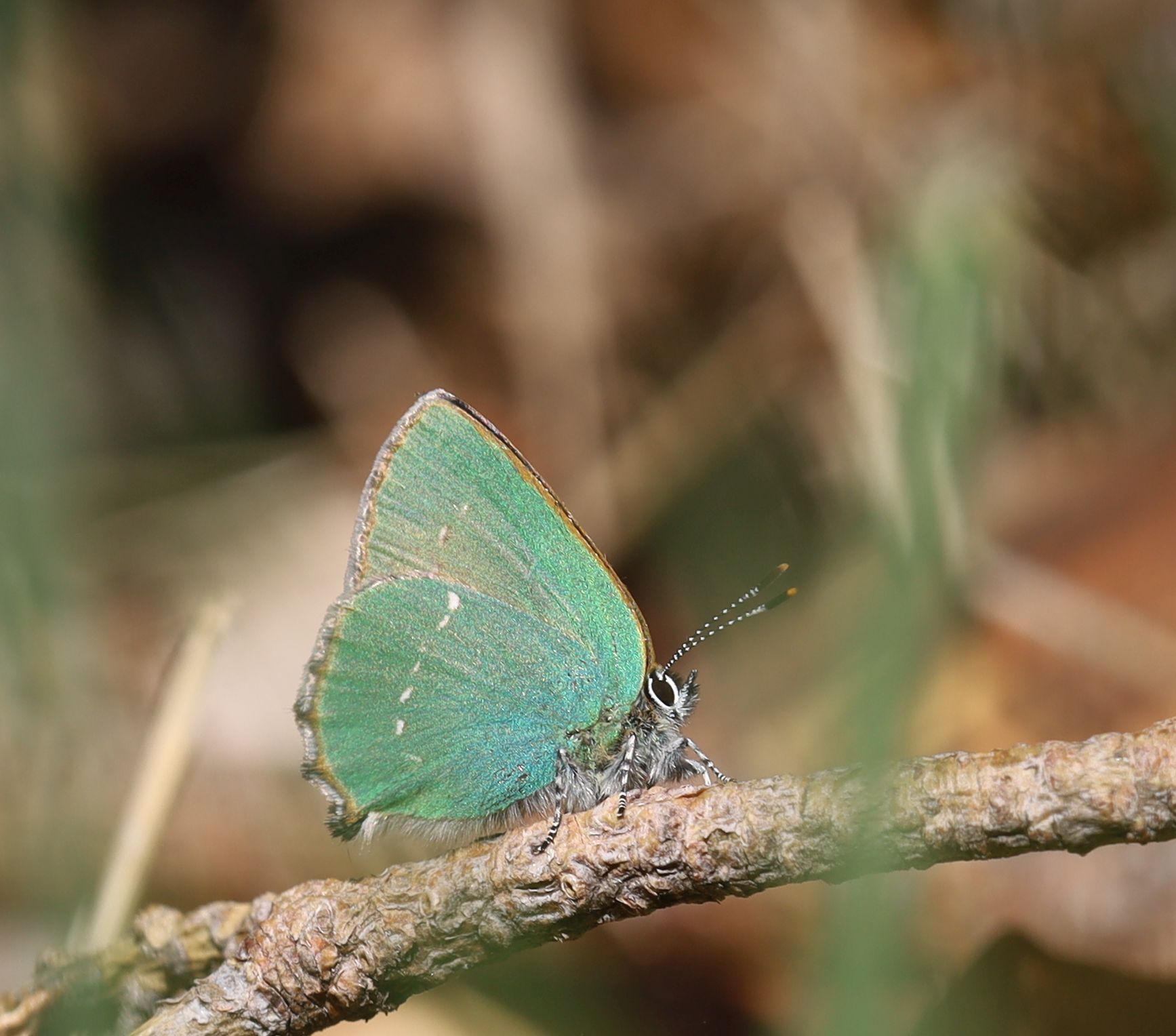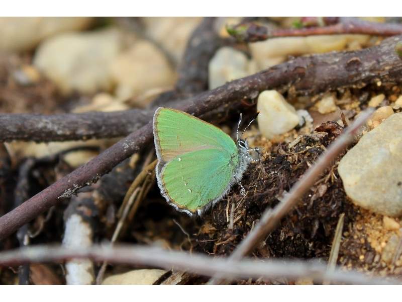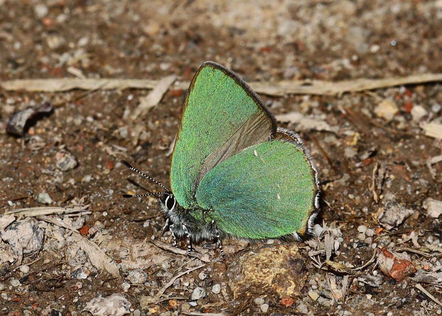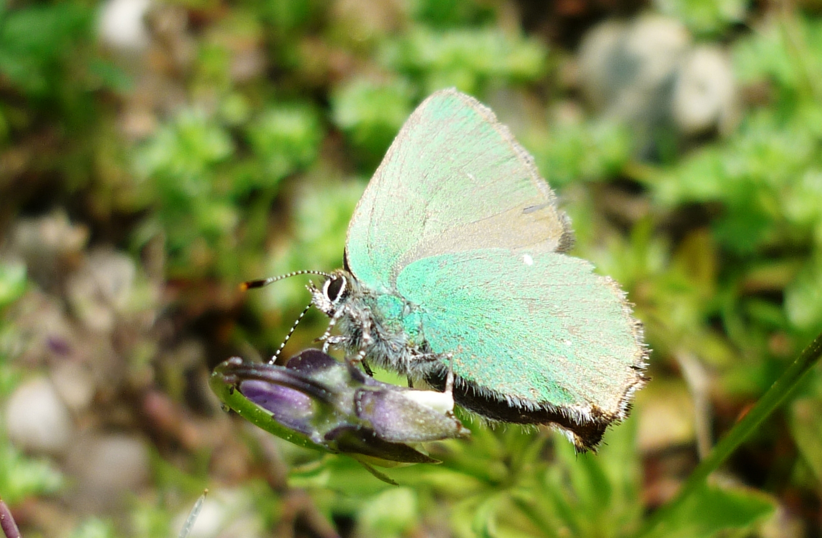 Grüner Zipfelfalter, im NSG Presseler Heide,- Wald,- und Moorgebiet, ca. 3 km nördl. von Wöllnau, am 17.05.2020