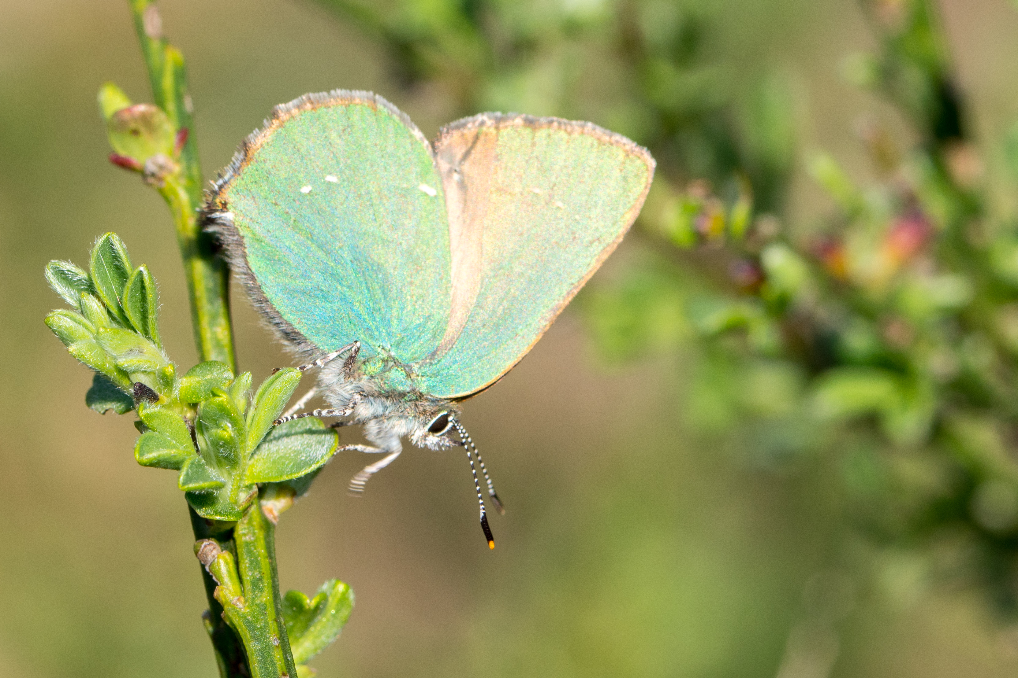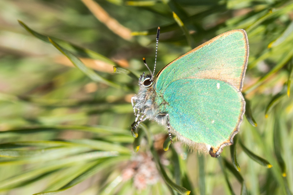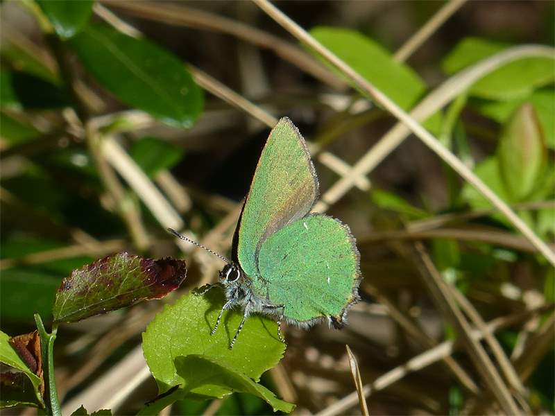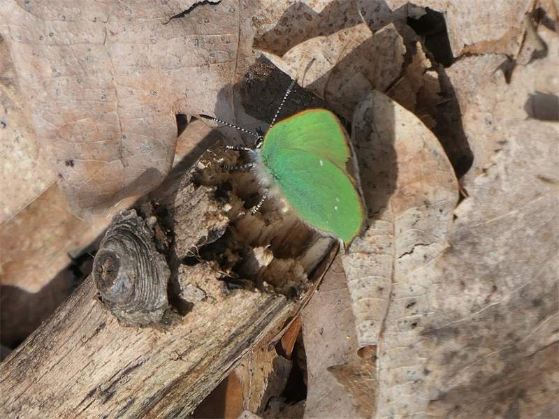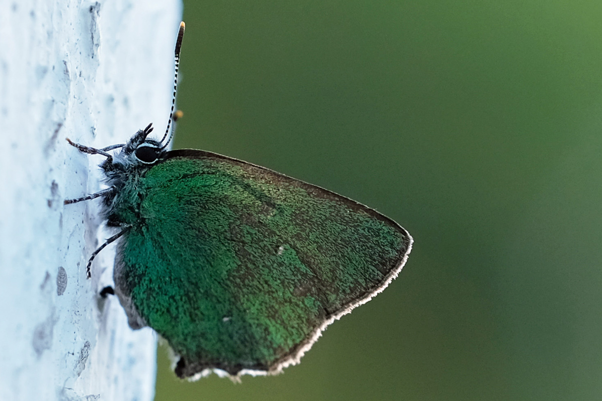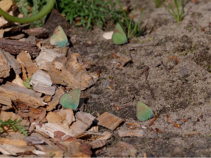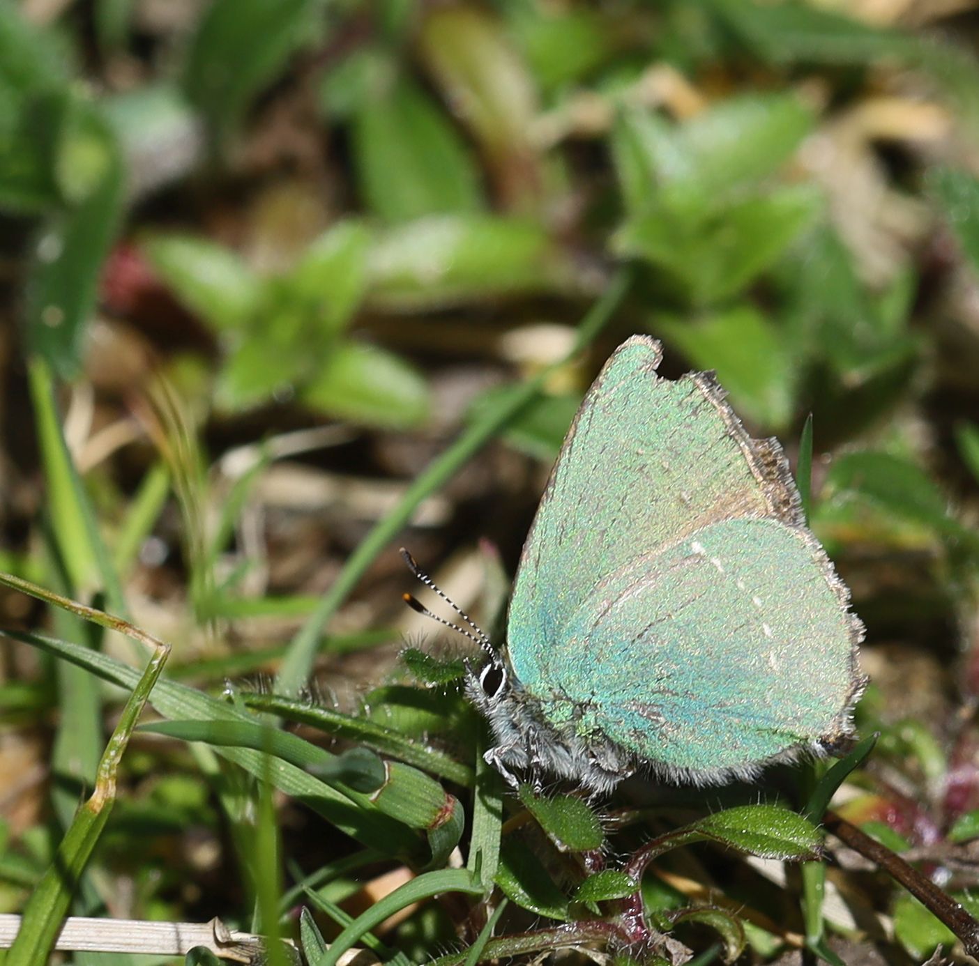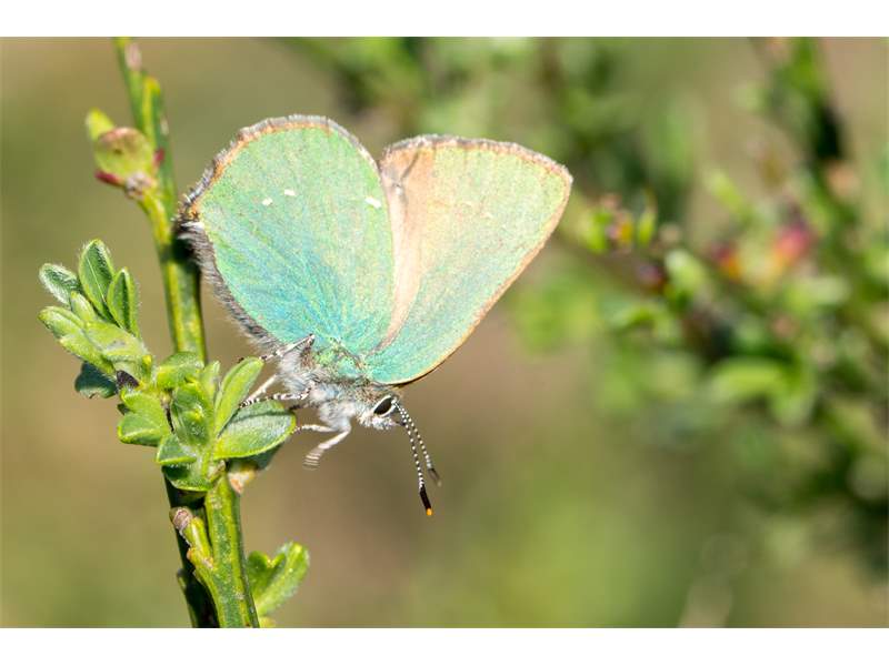 Grüner Zipfelfalter, im NSG Presseler Heide,- Wald,- und Moorgebiet, ca. 3 km nördl. von Wöllnau, am 17.05.2020