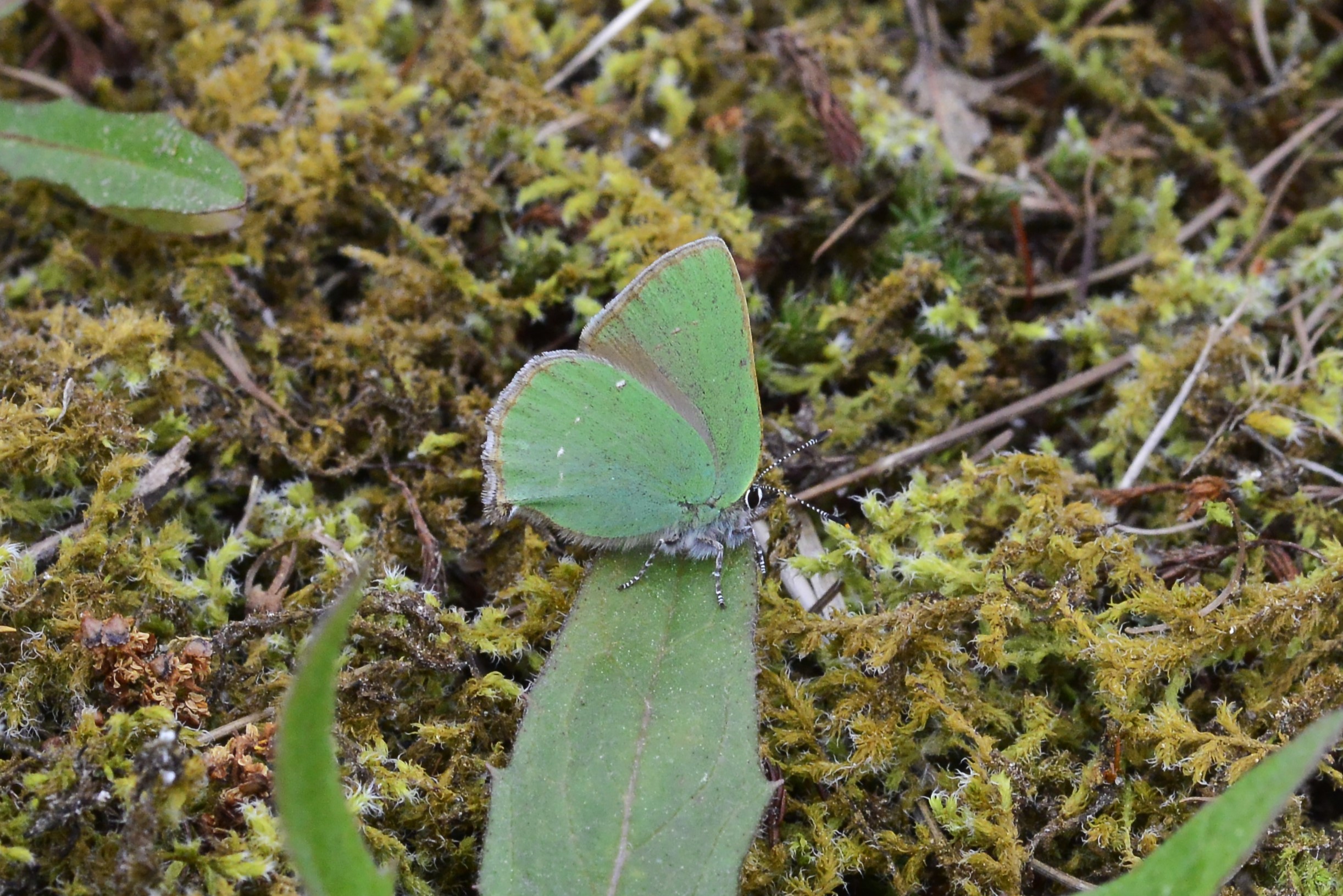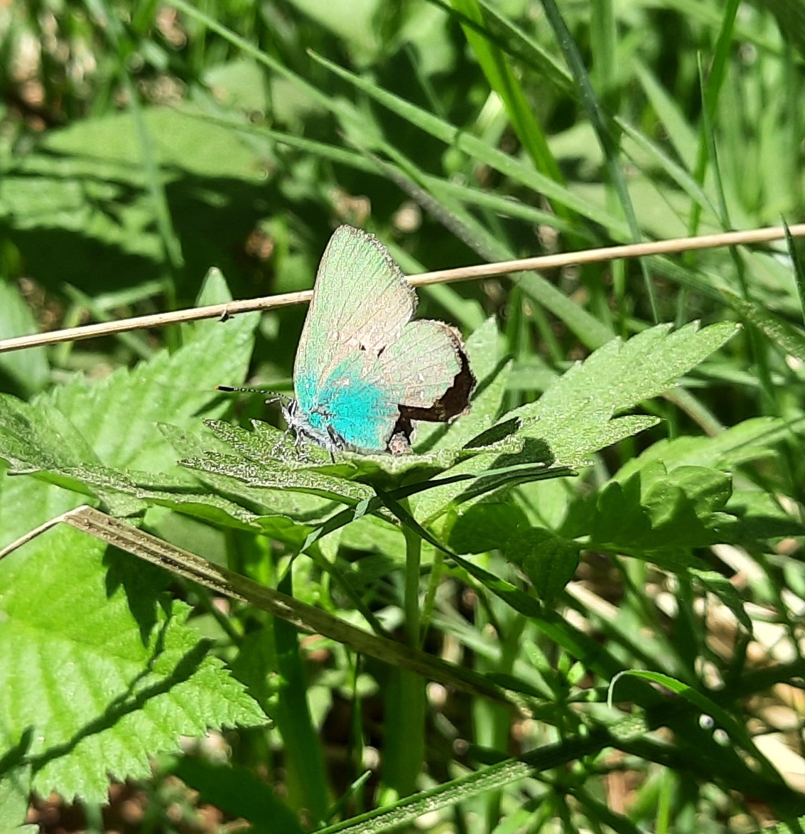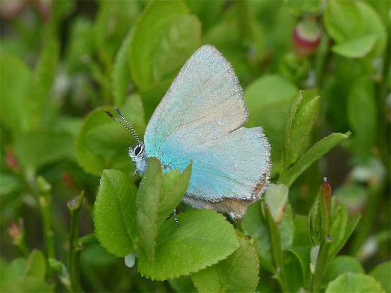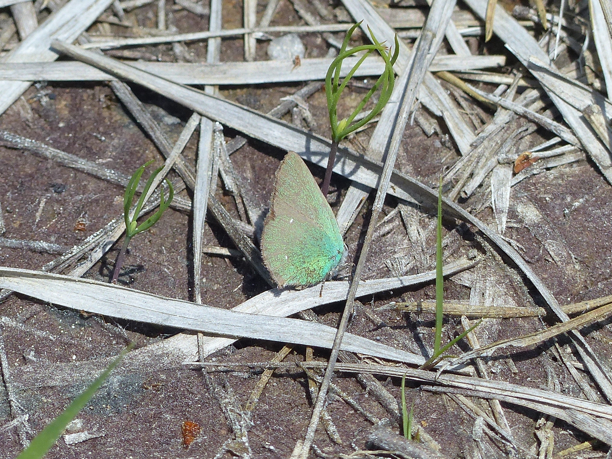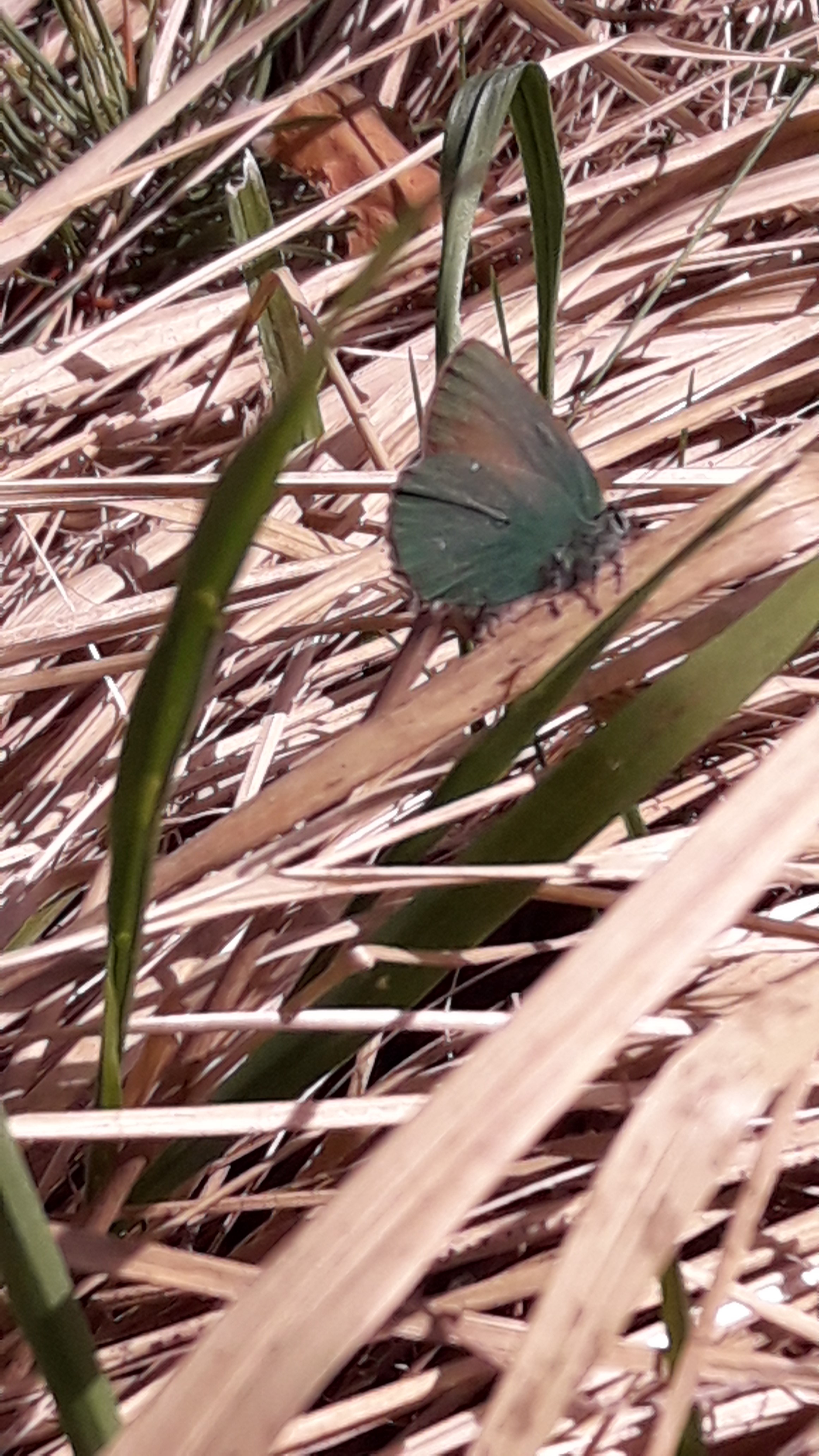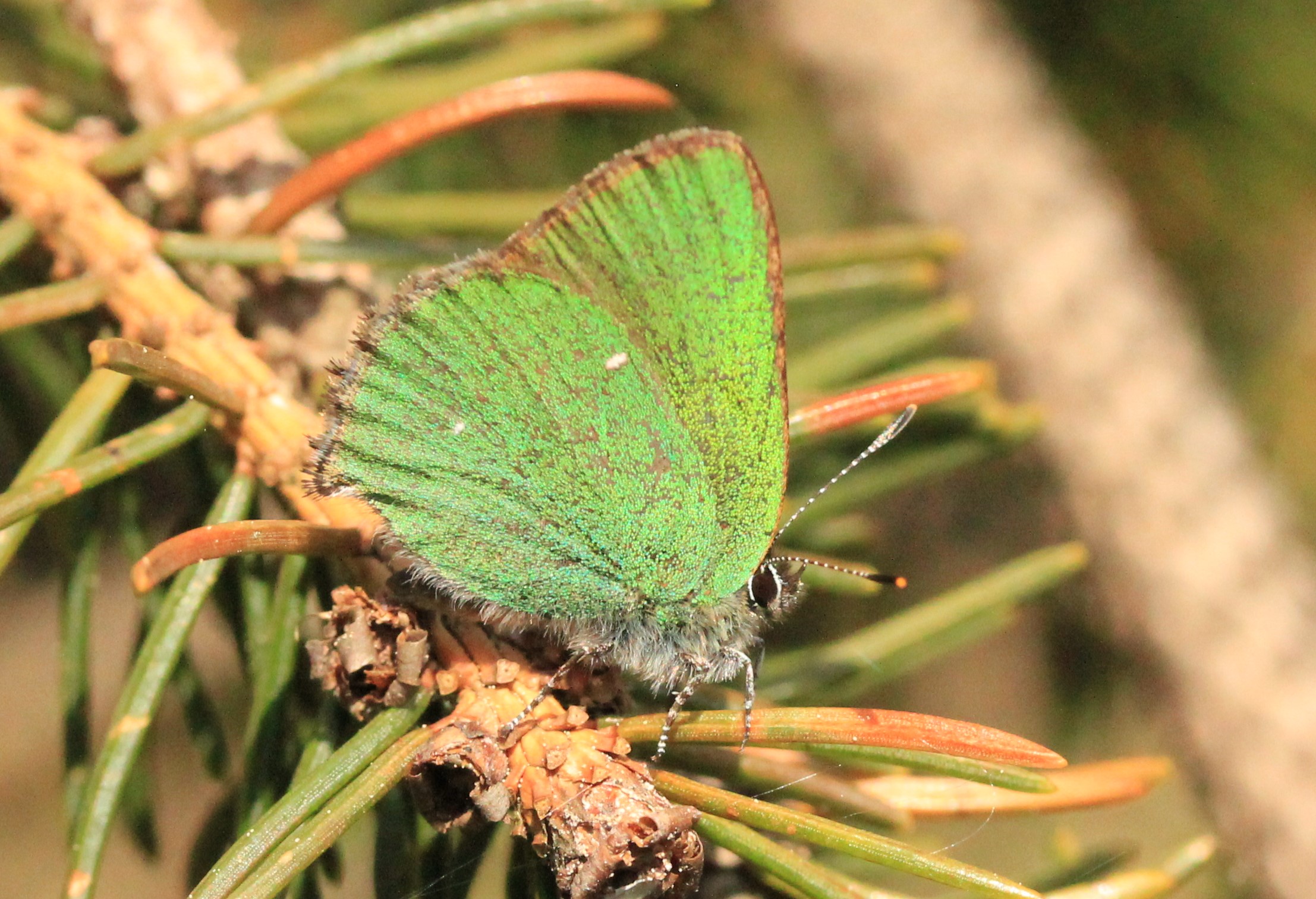Grüner Zipfelfalter, im NSG Presseler Heide,- Wald,- und Moorgebiet, ca. 3 km nördl. von Wöllnau, am 17.05.2020