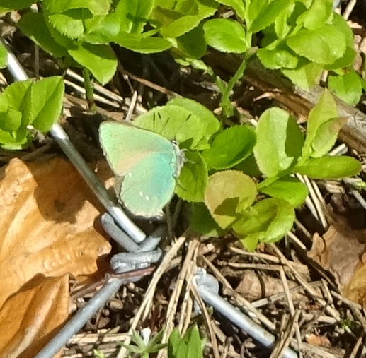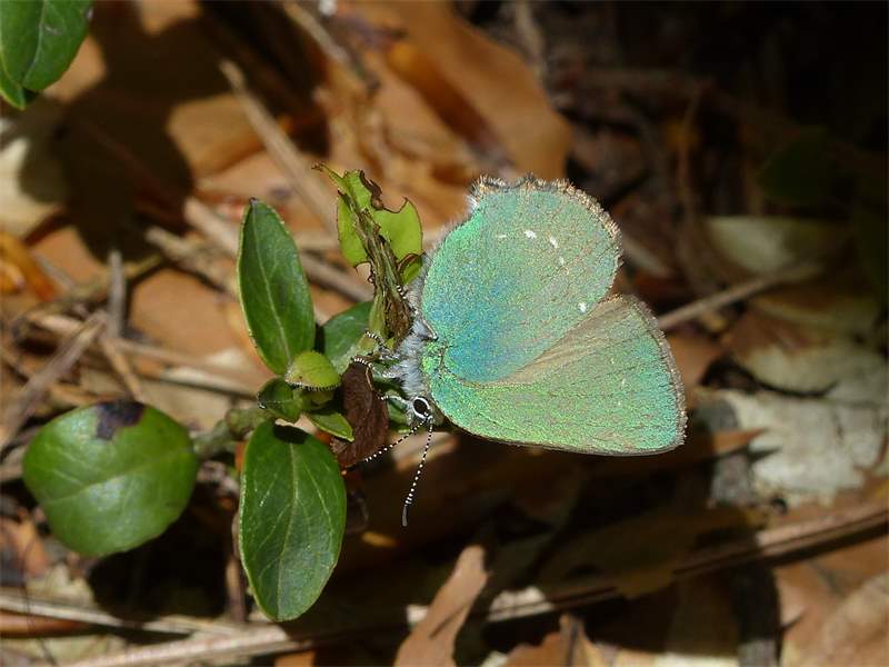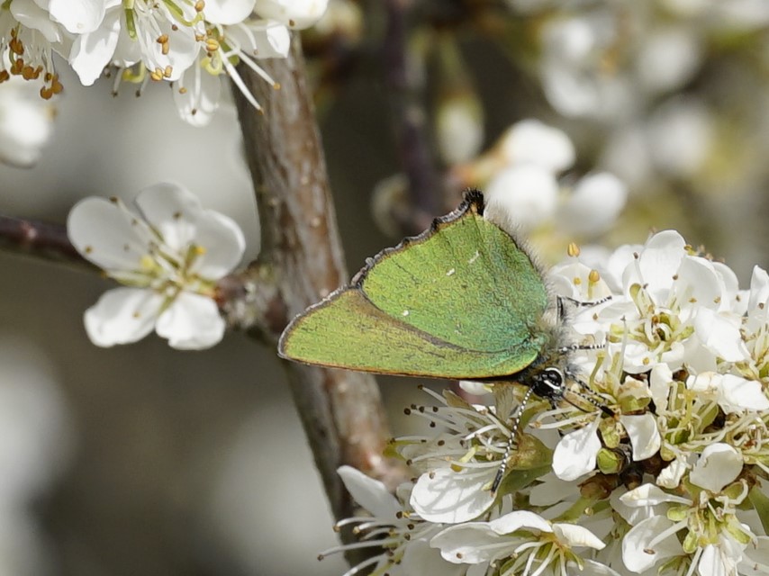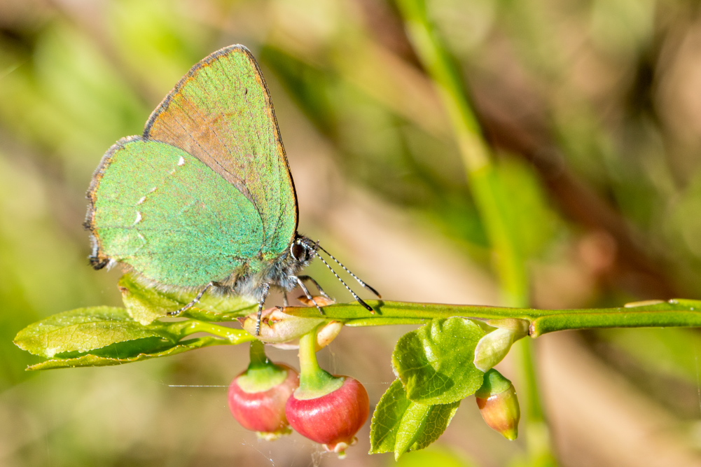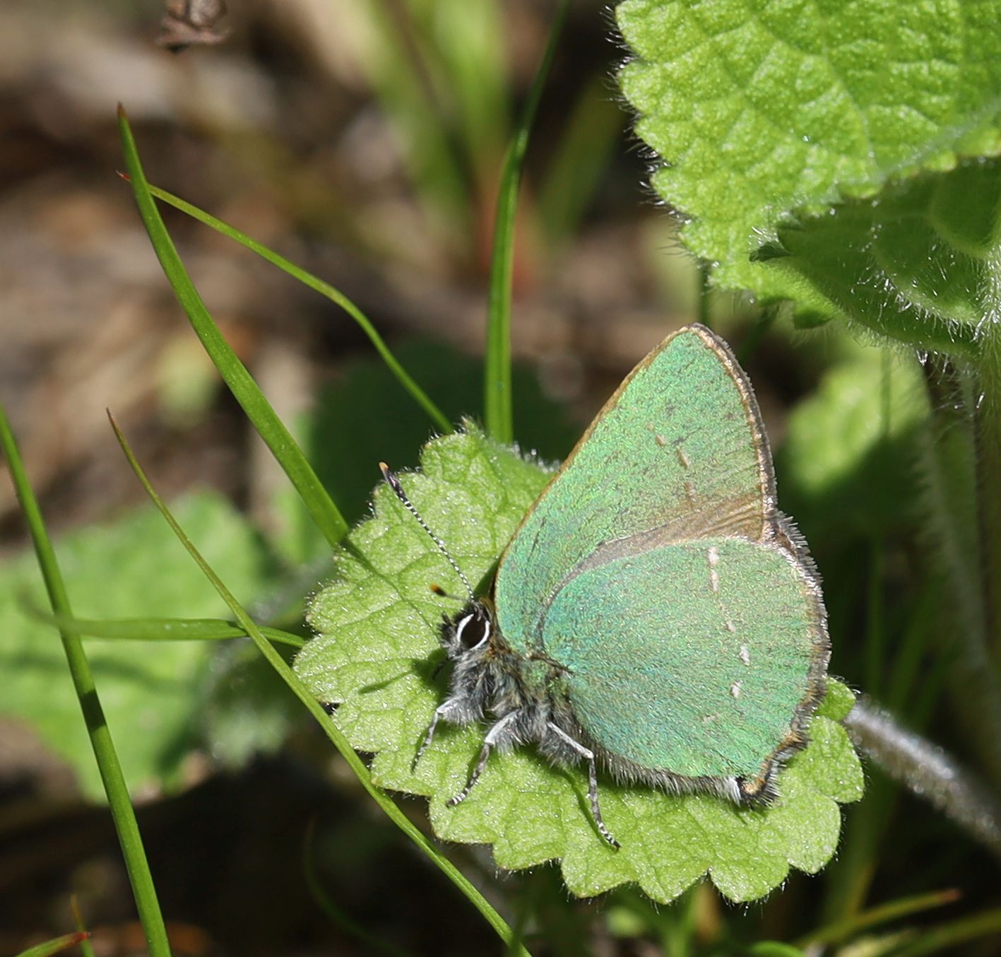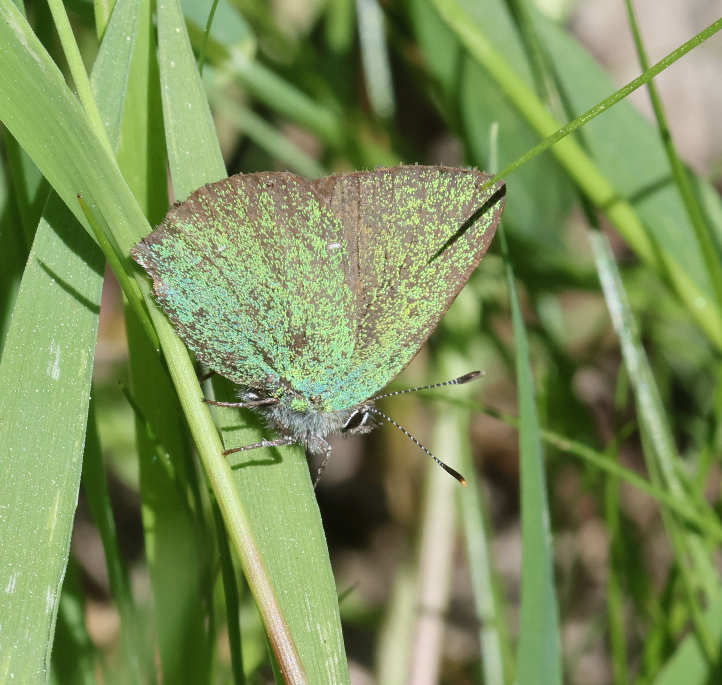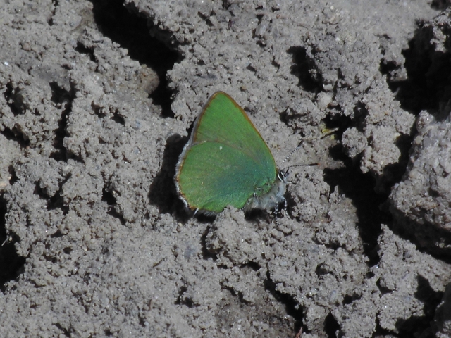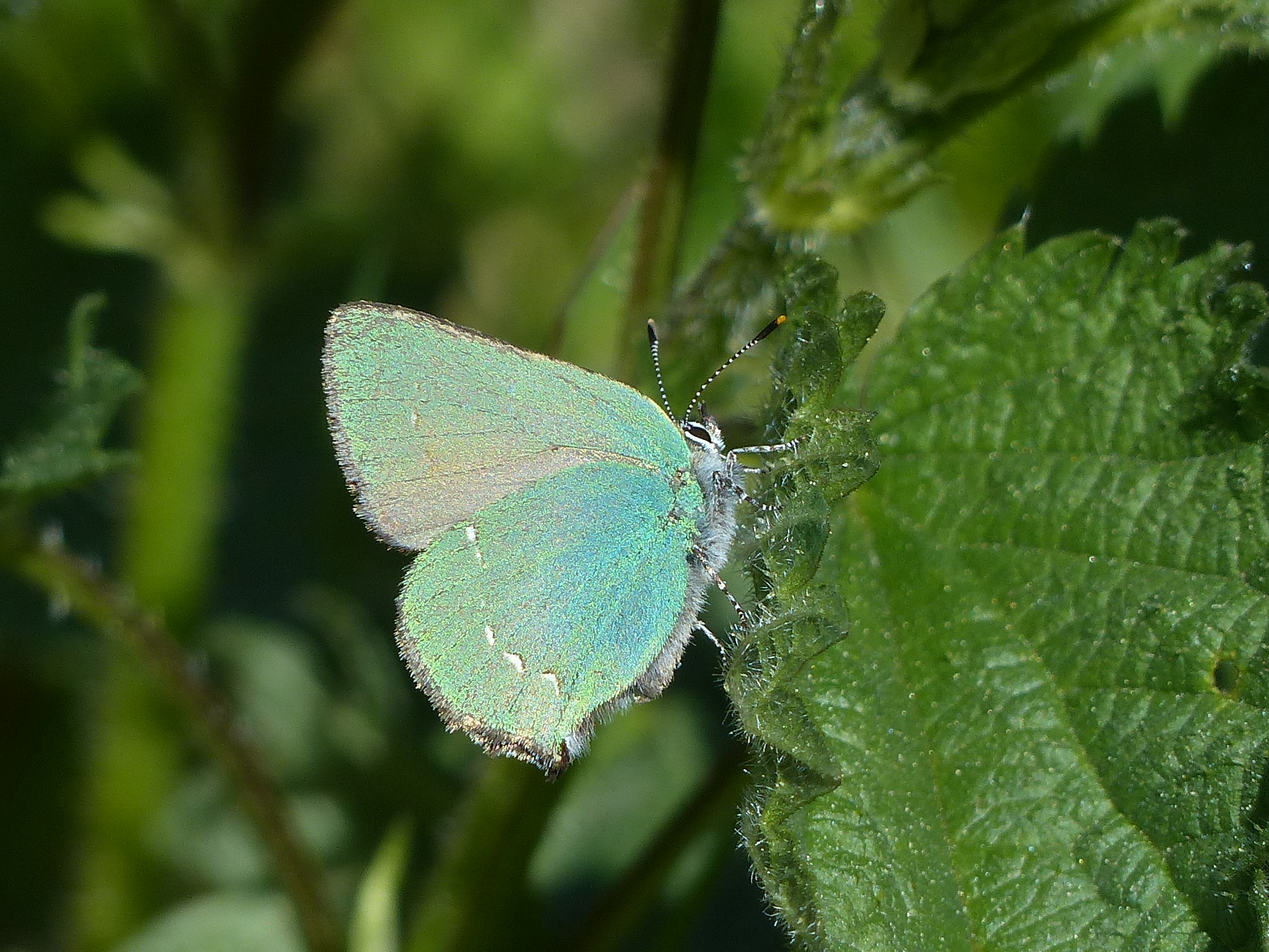Grüner Zipfelfalter, im NSG Presseler Heide,- Wald,- und Moorgebiet, ca. 3 km nördl. von Wöllnau, am 17.05.2020