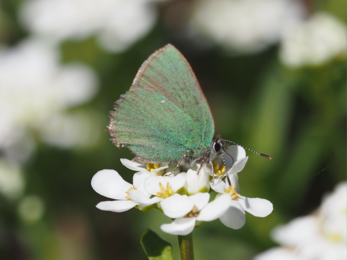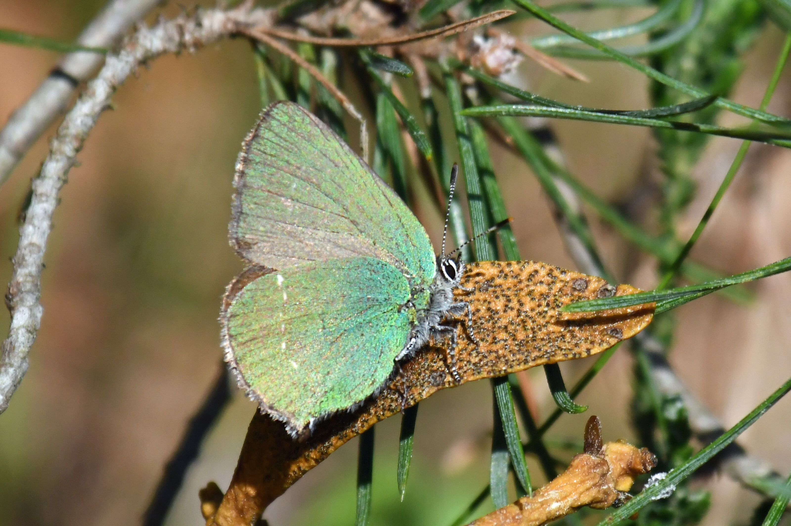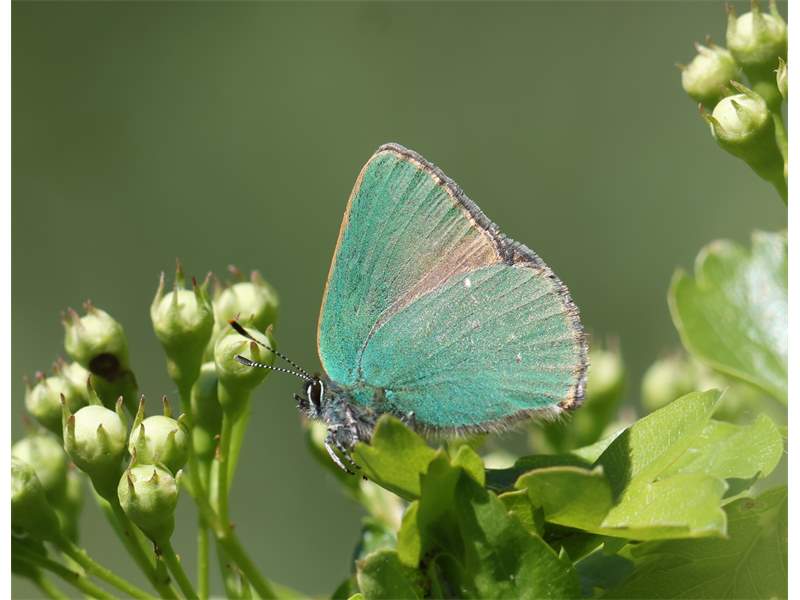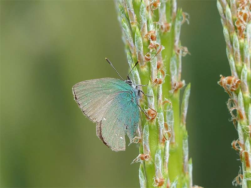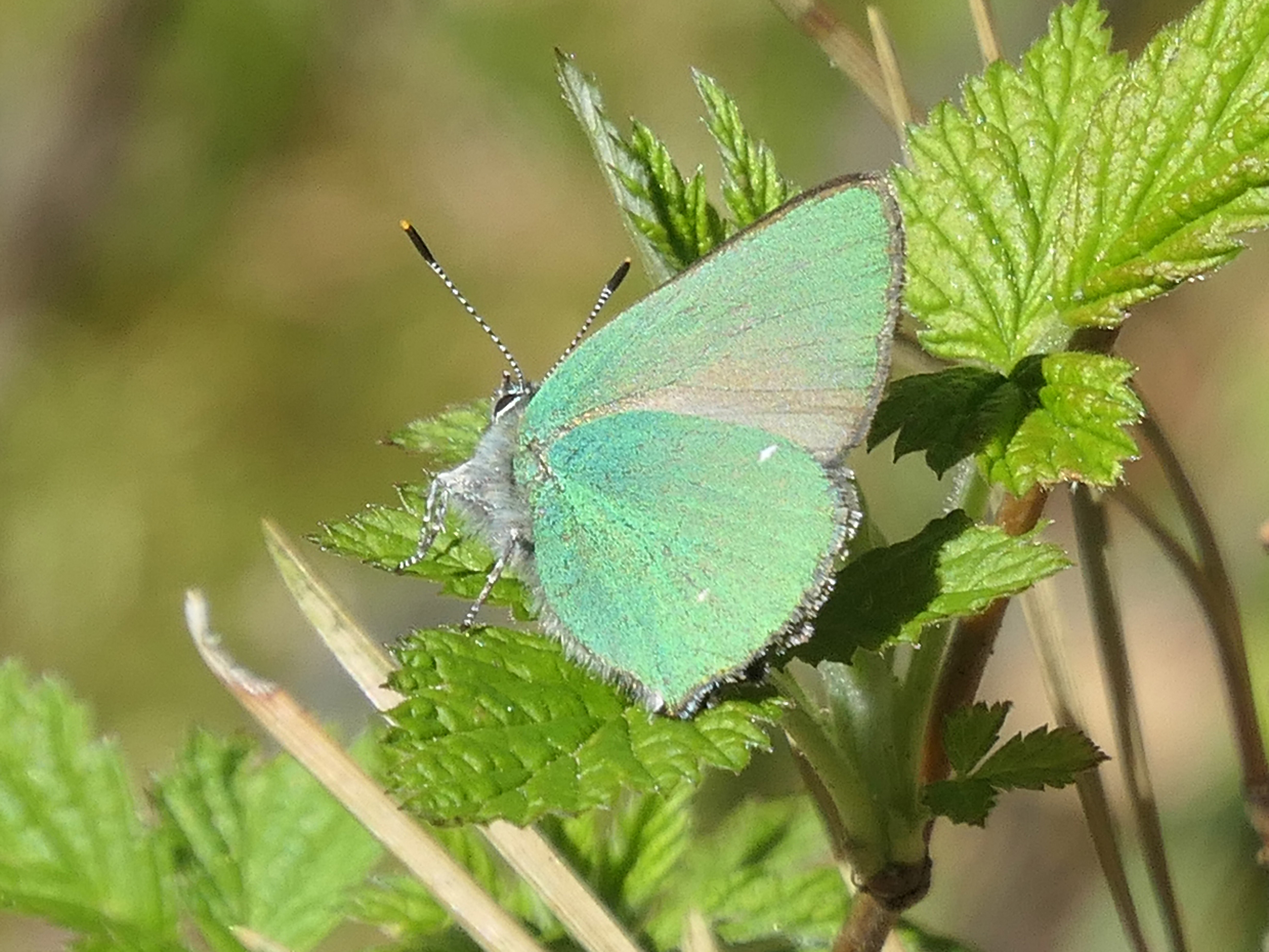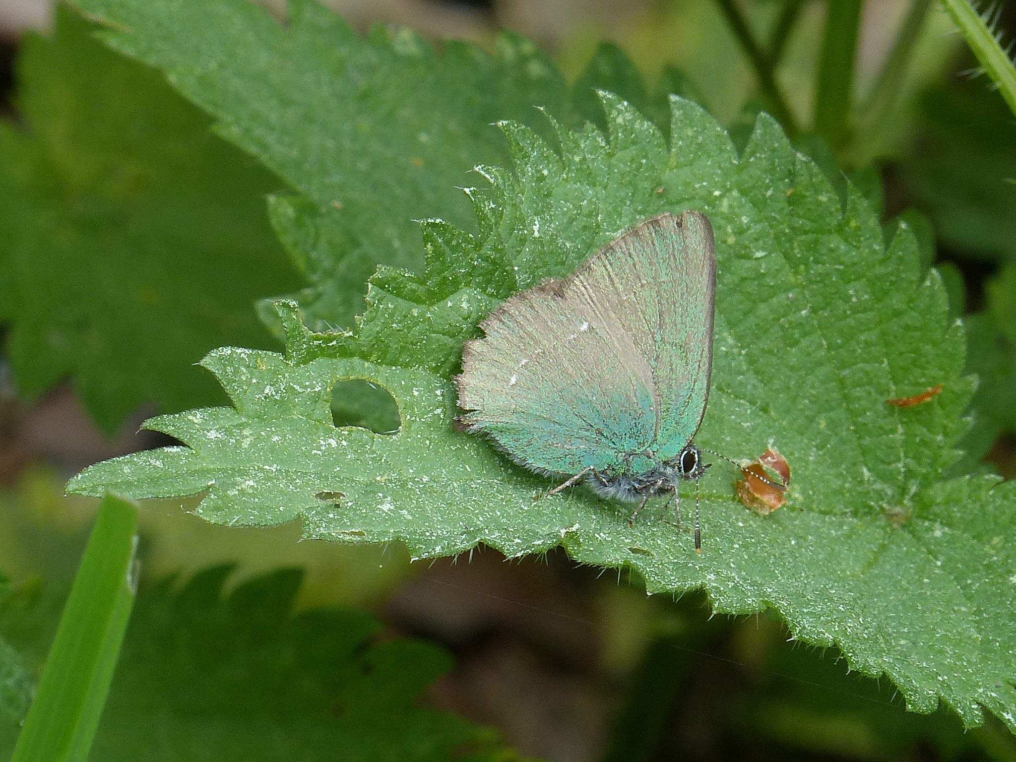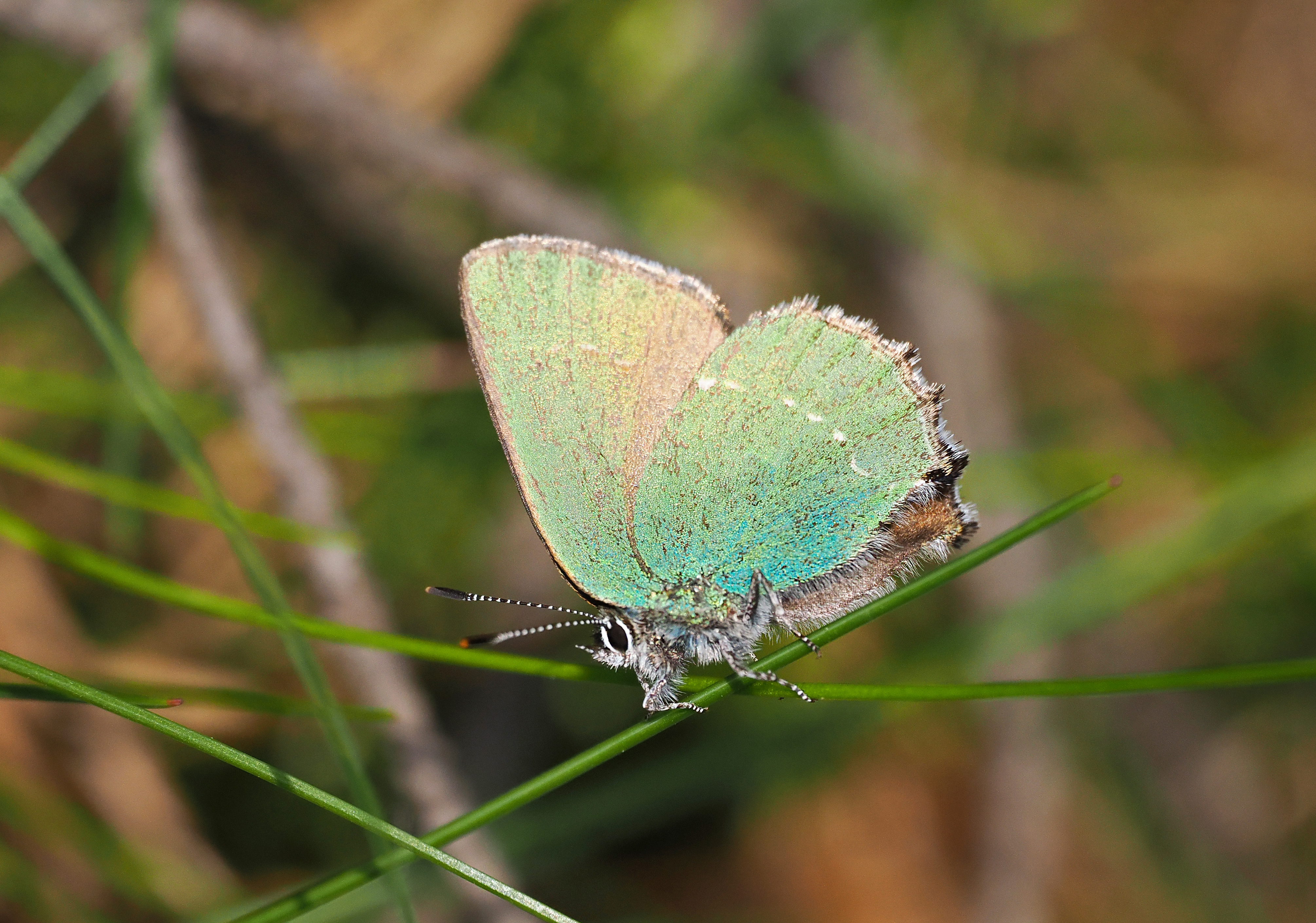 Grüner Zipfelfalter, im NSG Presseler Heide,- Wald,- und Moorgebiet, ca. 3 km nördl. von Wöllnau, am 17.05.2020