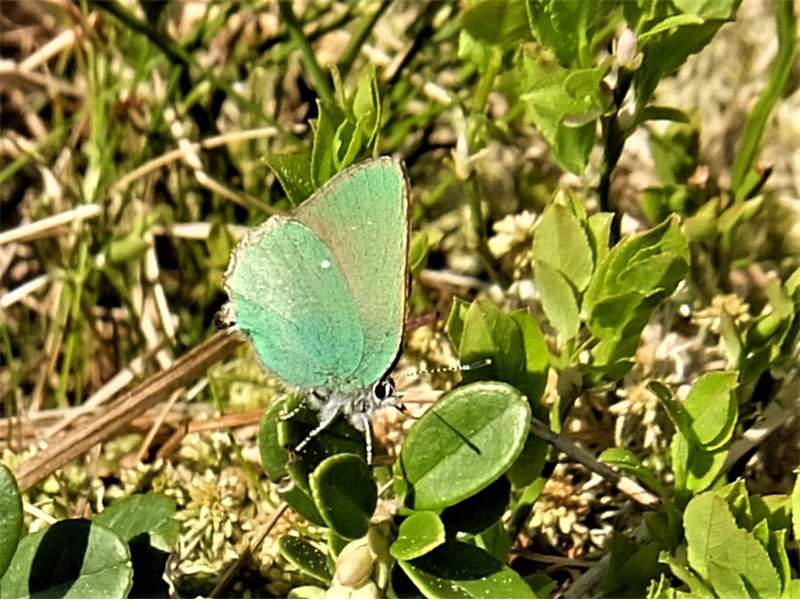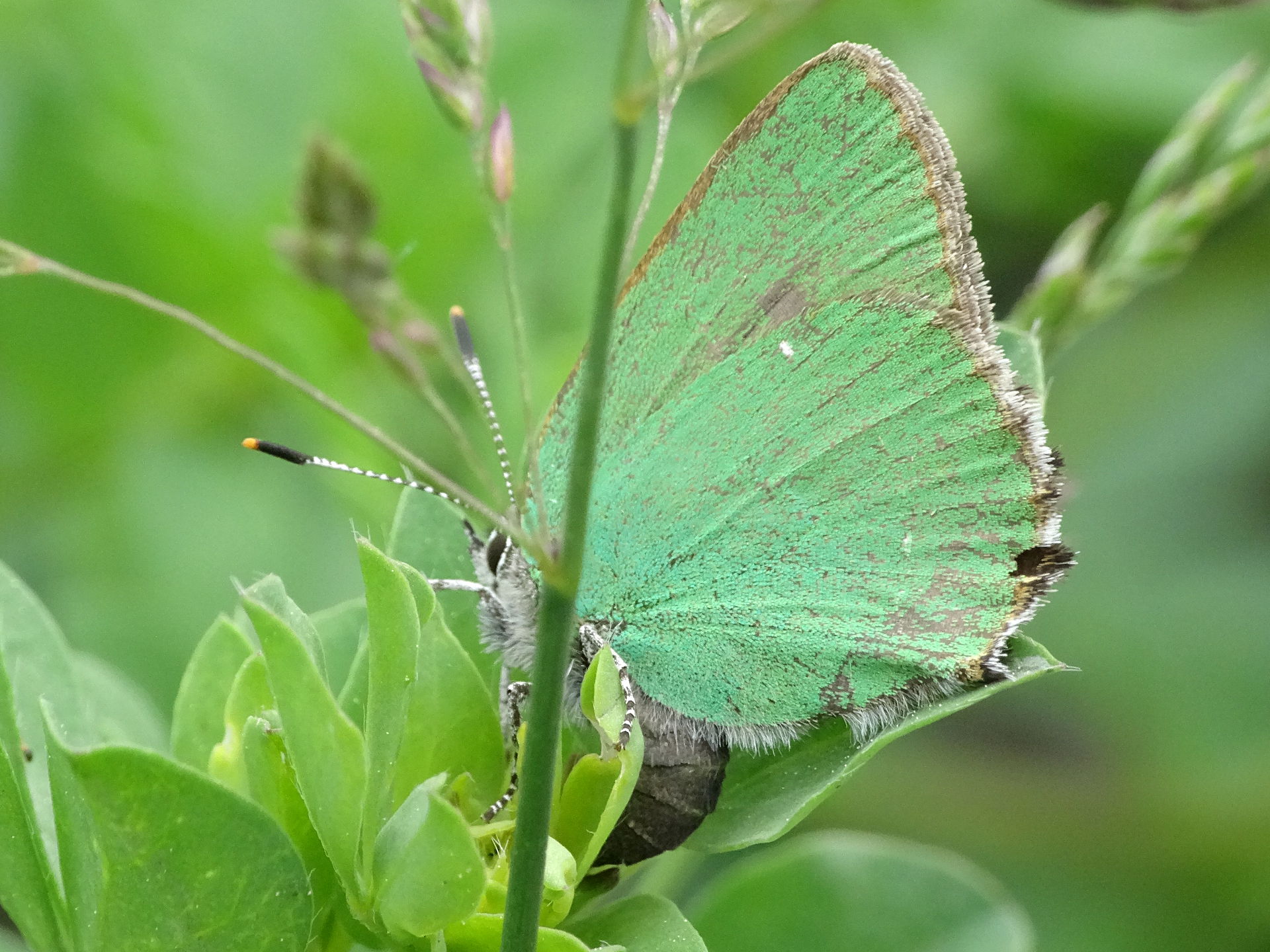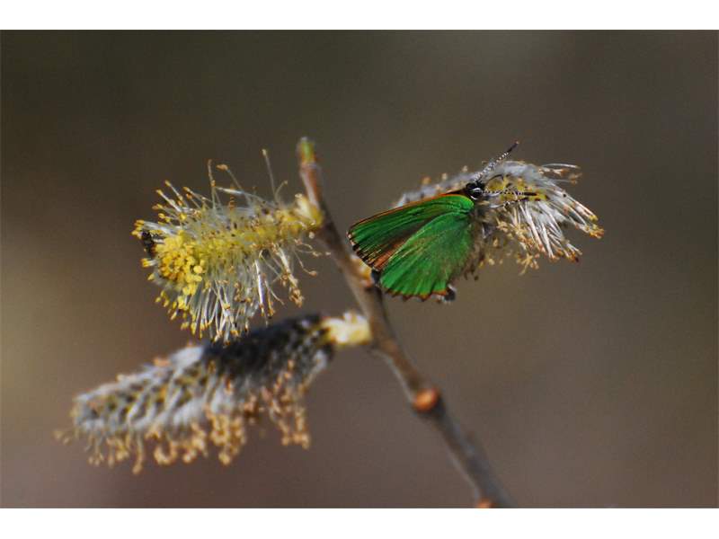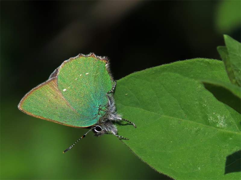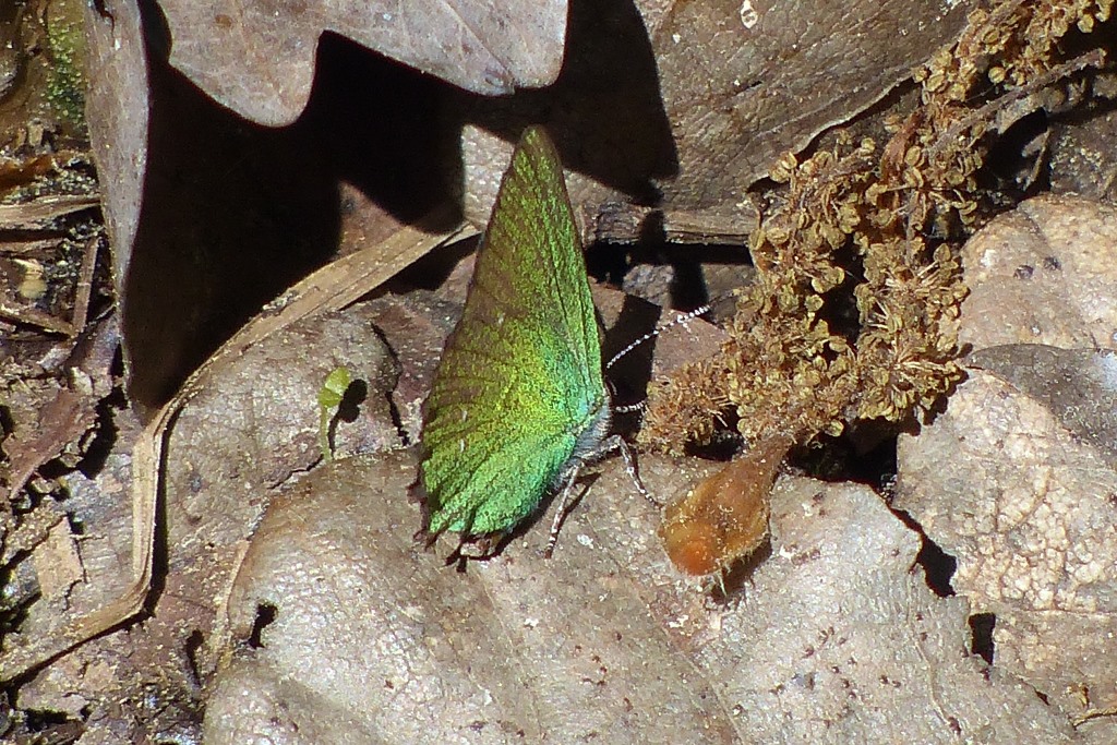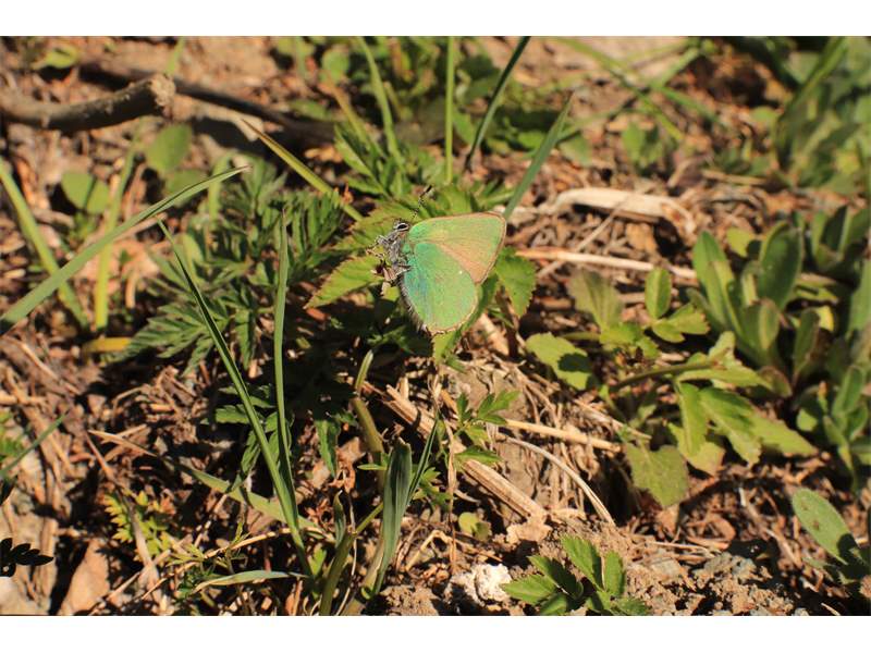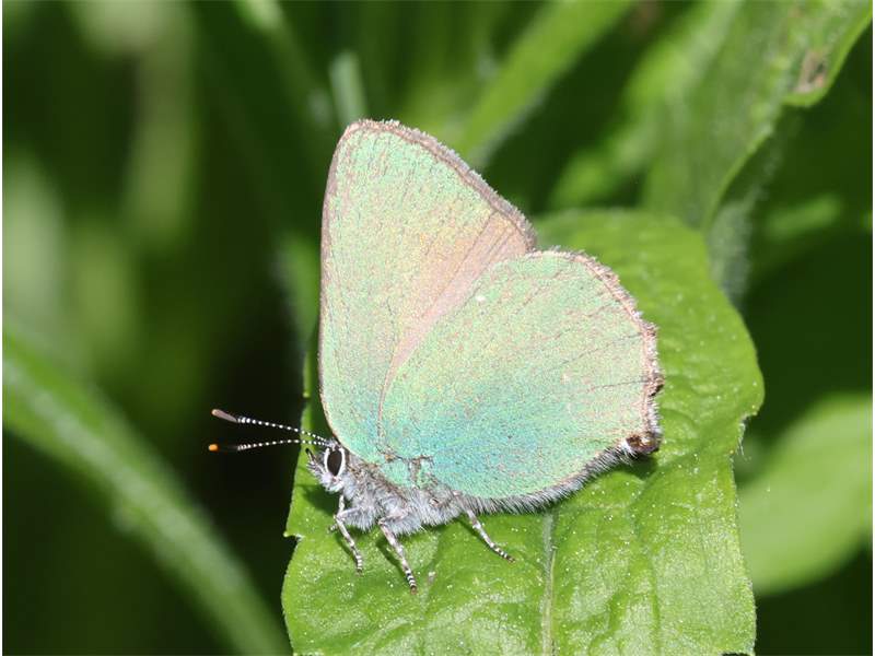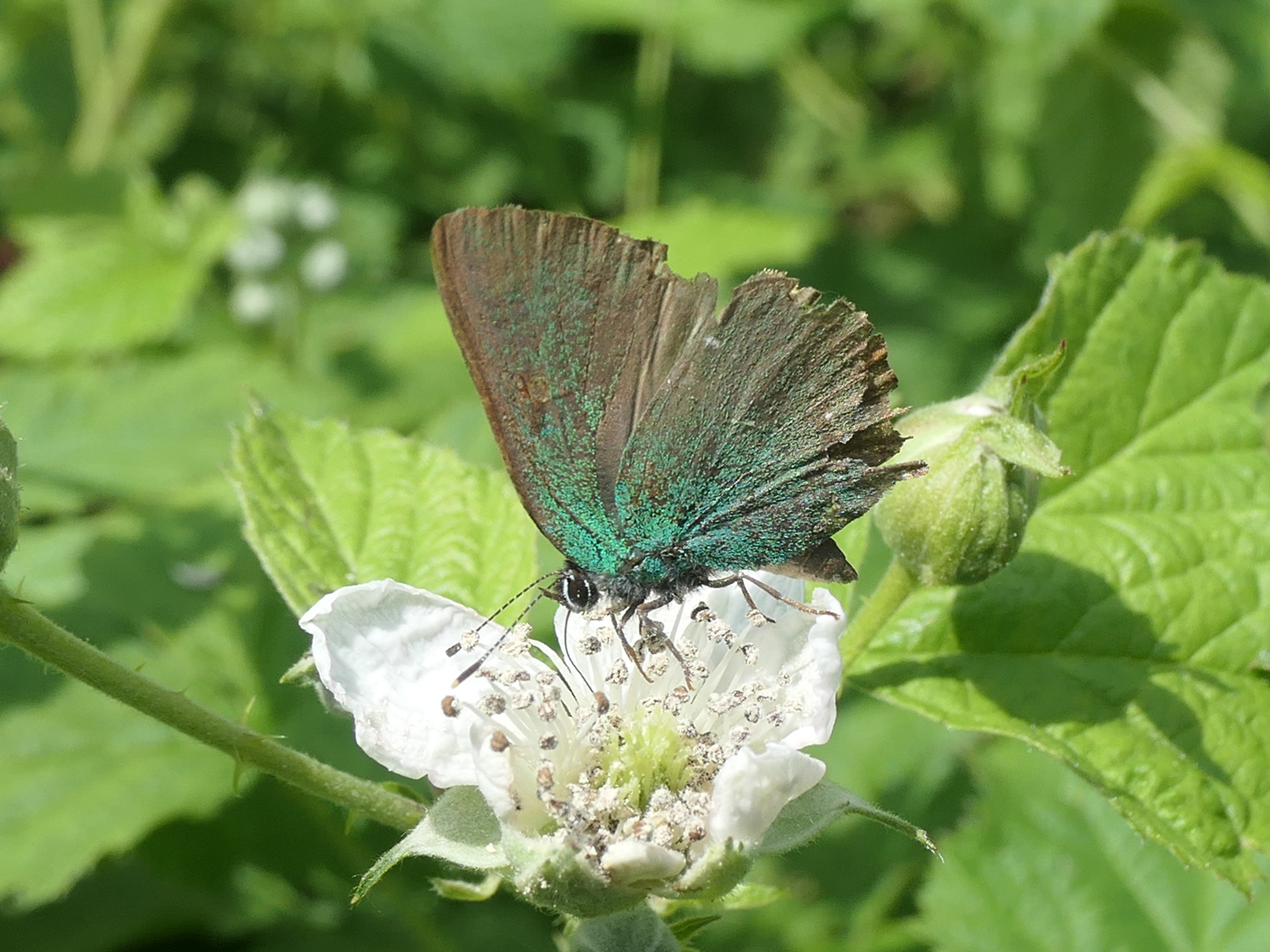 Grüner Zipfelfalter, im NSG Presseler Heide,- Wald,- und Moorgebiet, ca. 3 km nördl. von Wöllnau, am 17.05.2020