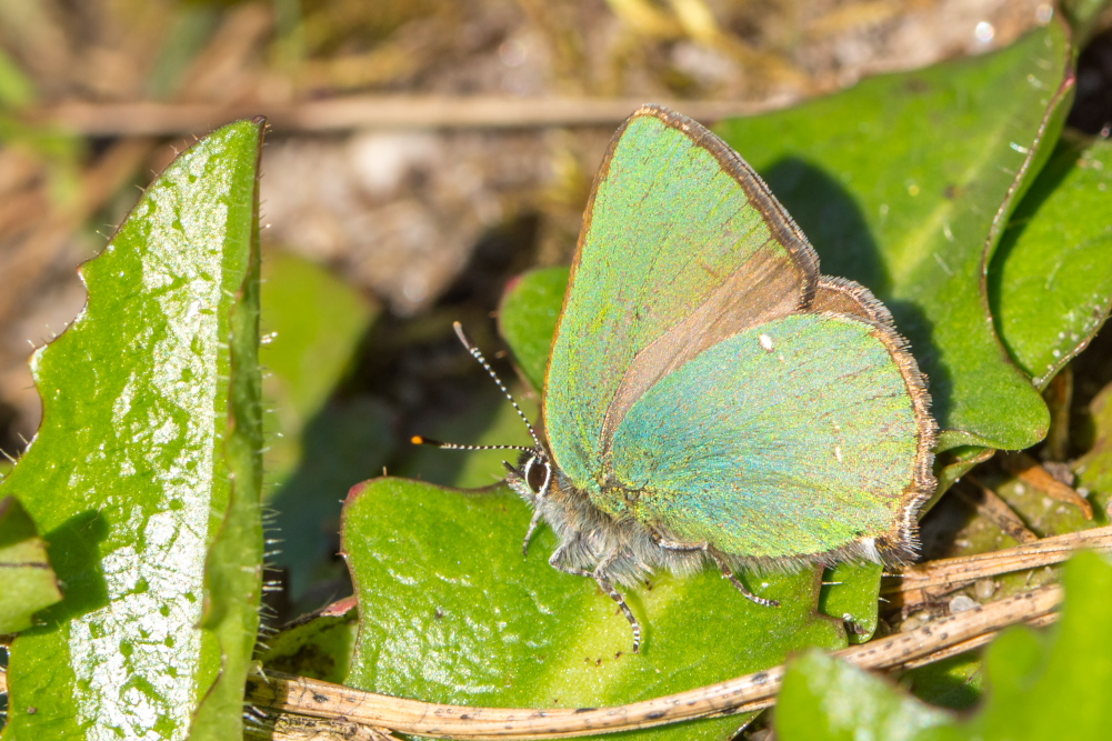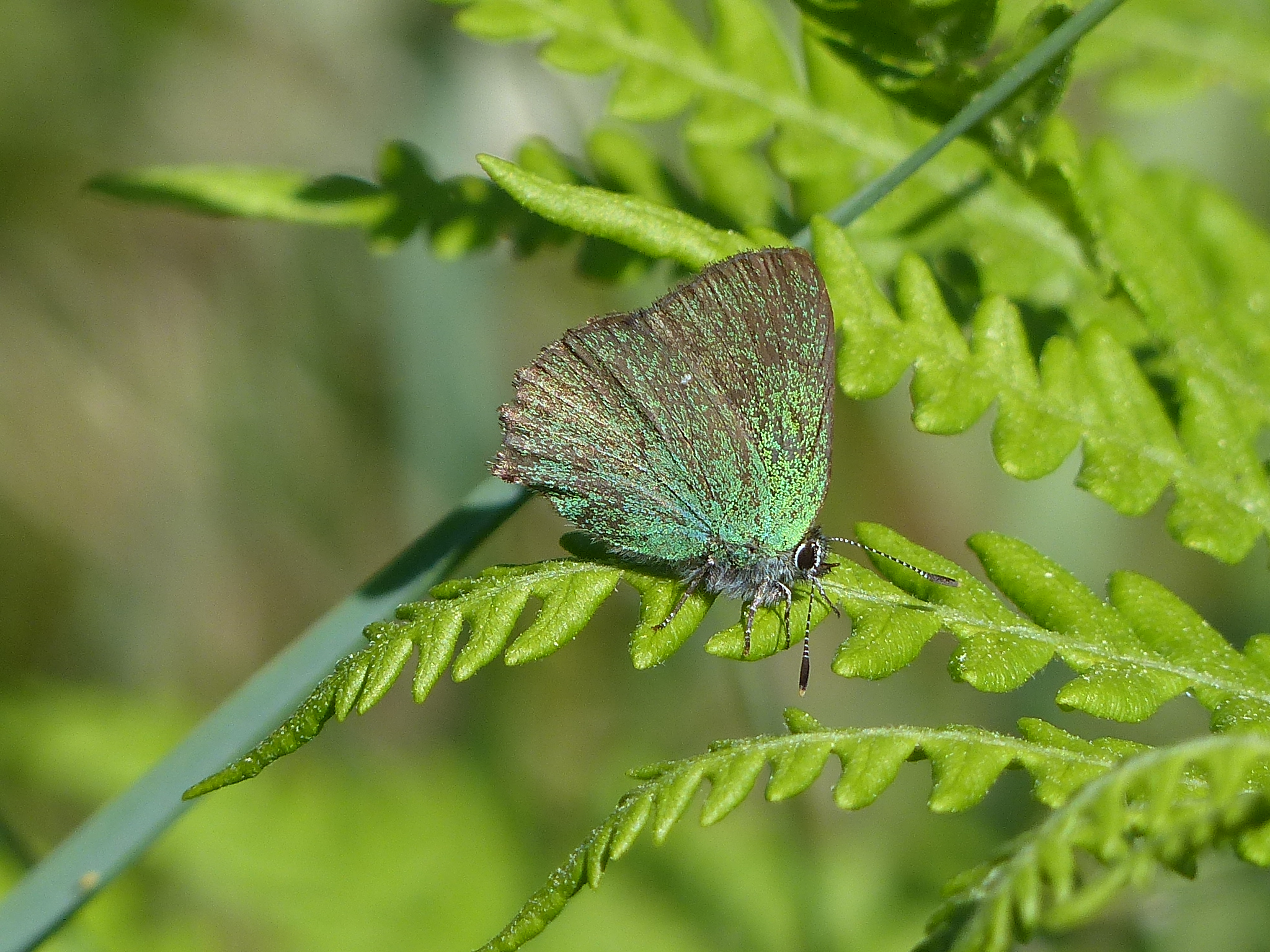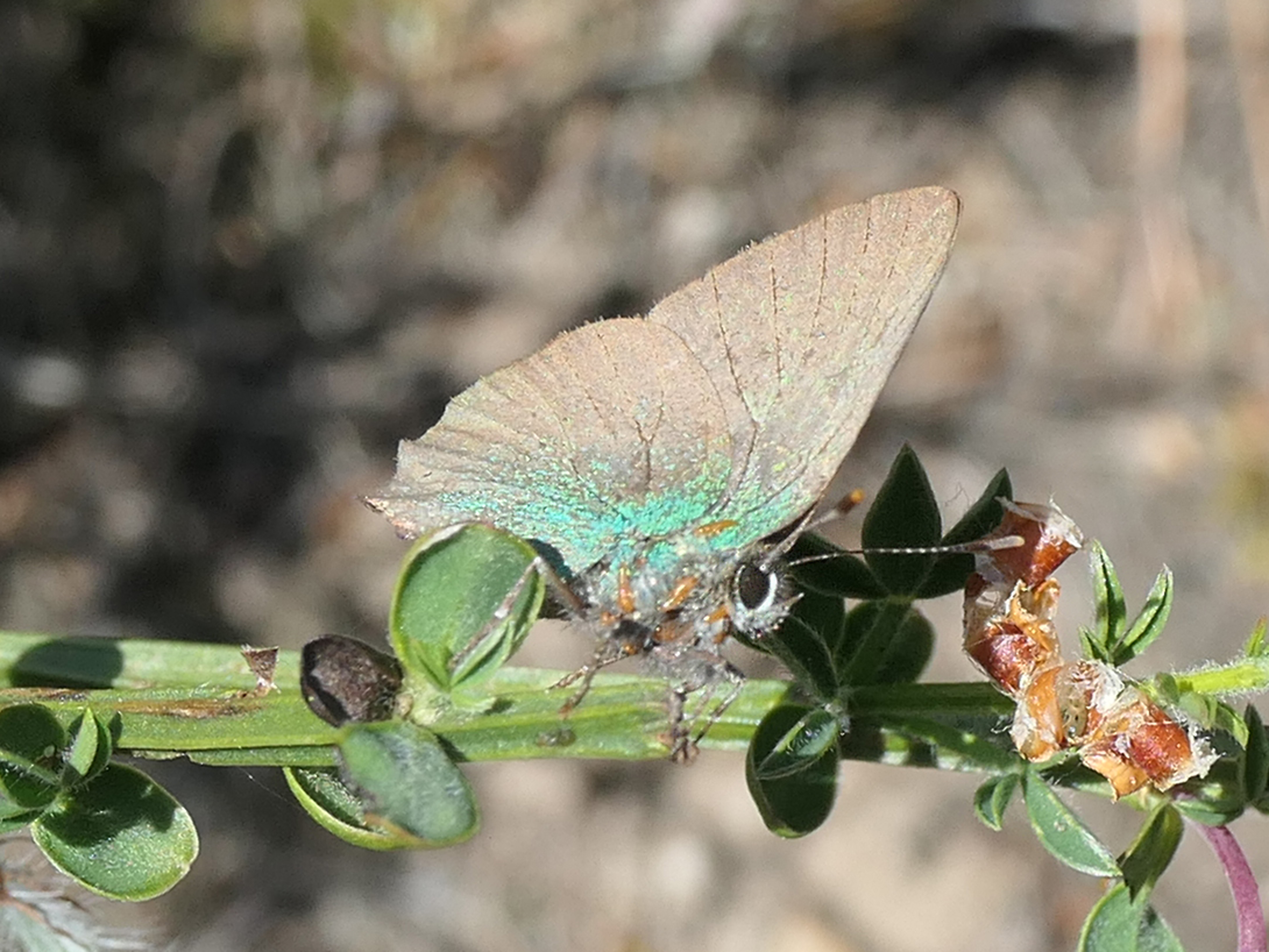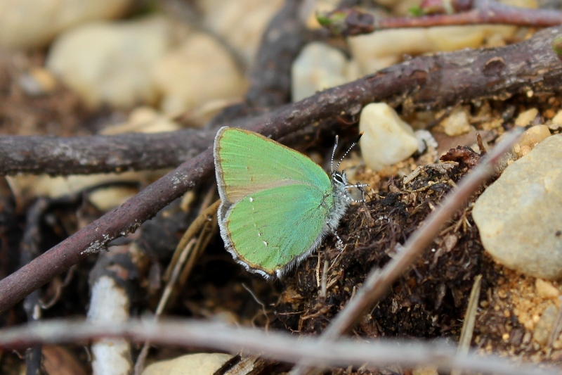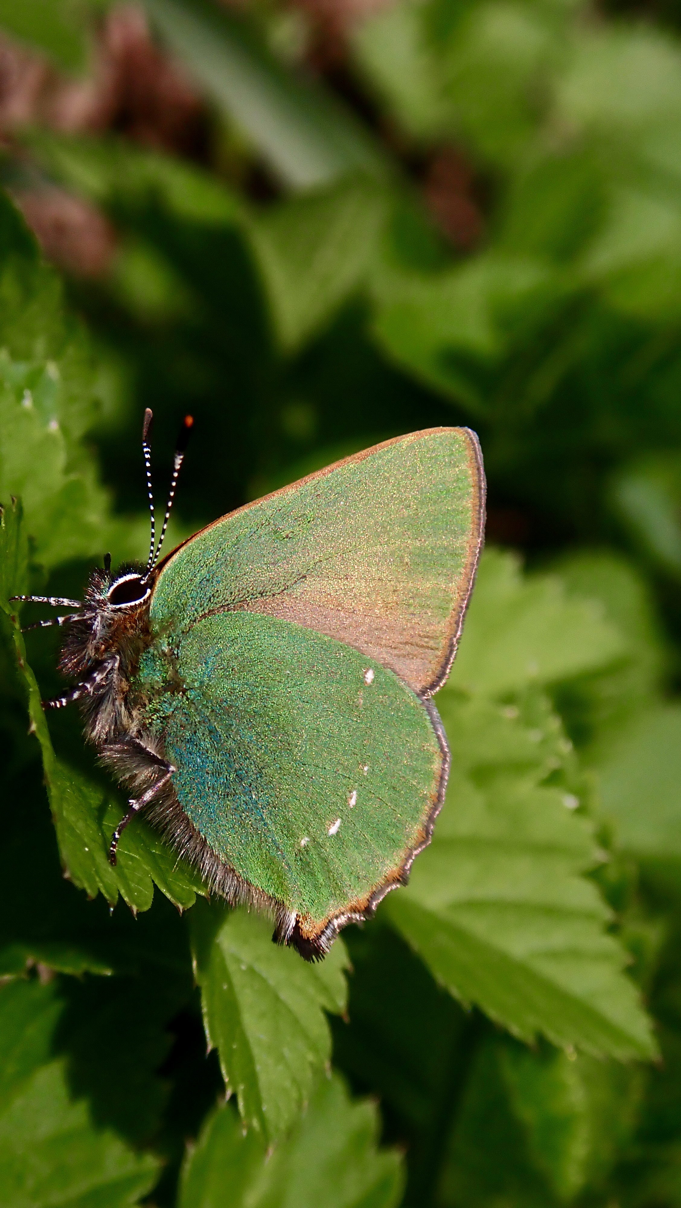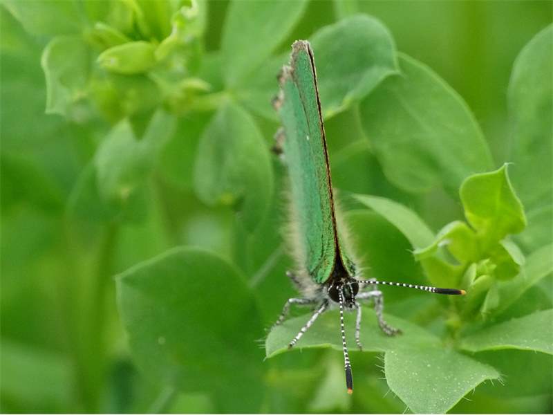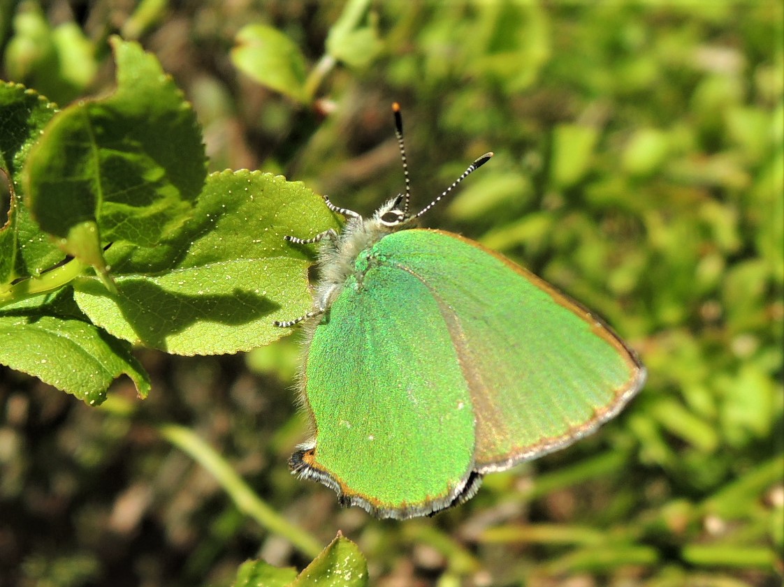 Grüner Zipfelfalter, im NSG Presseler Heide,- Wald,- und Moorgebiet, ca. 3 km nördl. von Wöllnau, am 17.05.2020