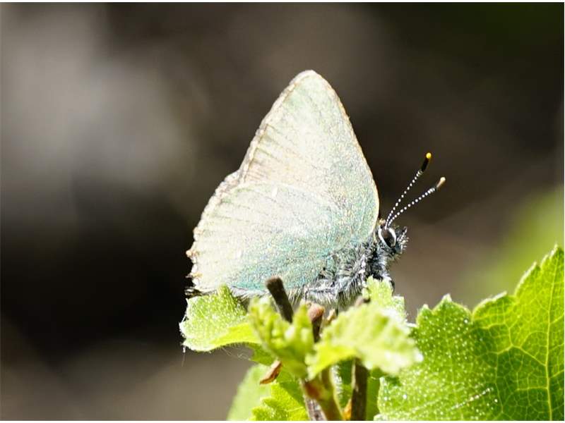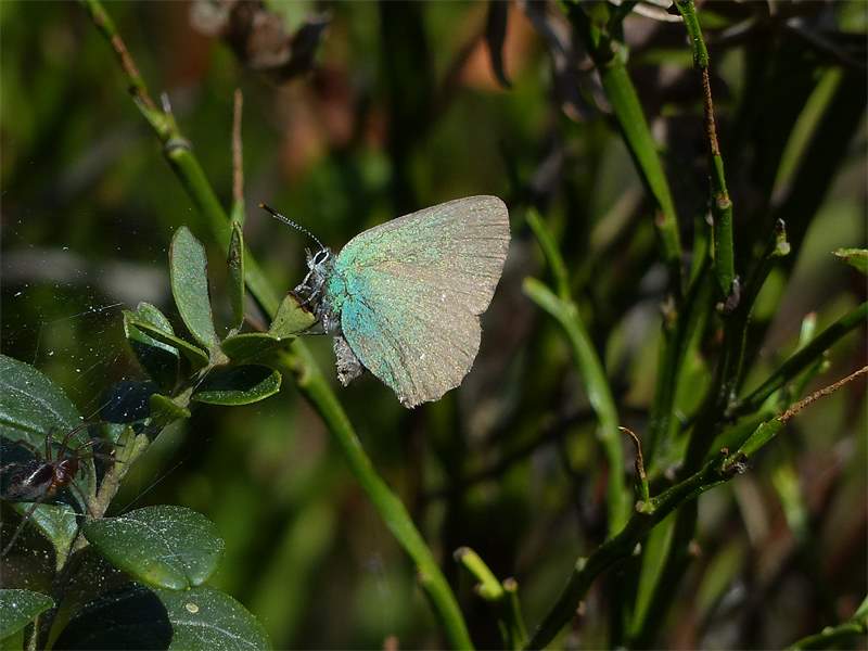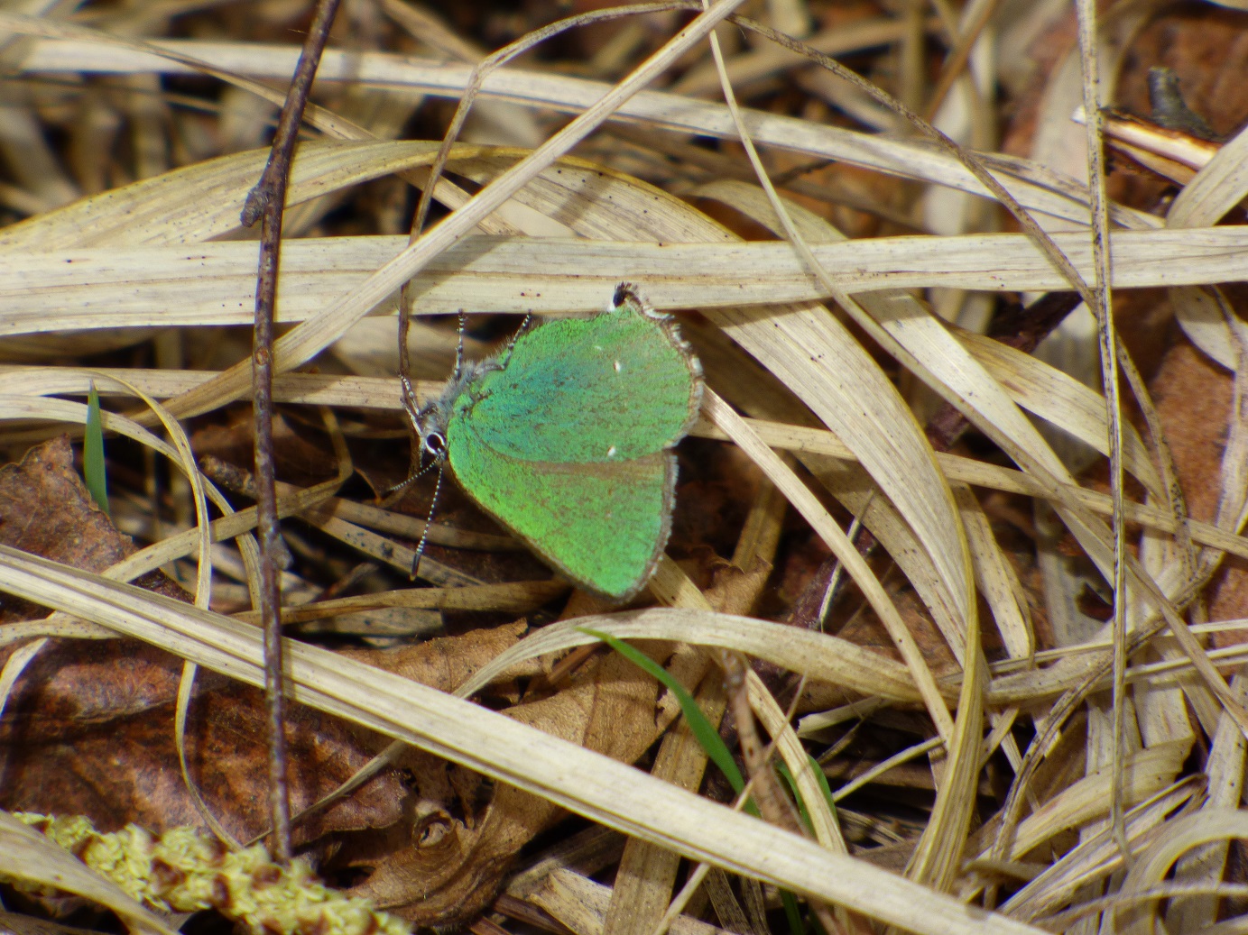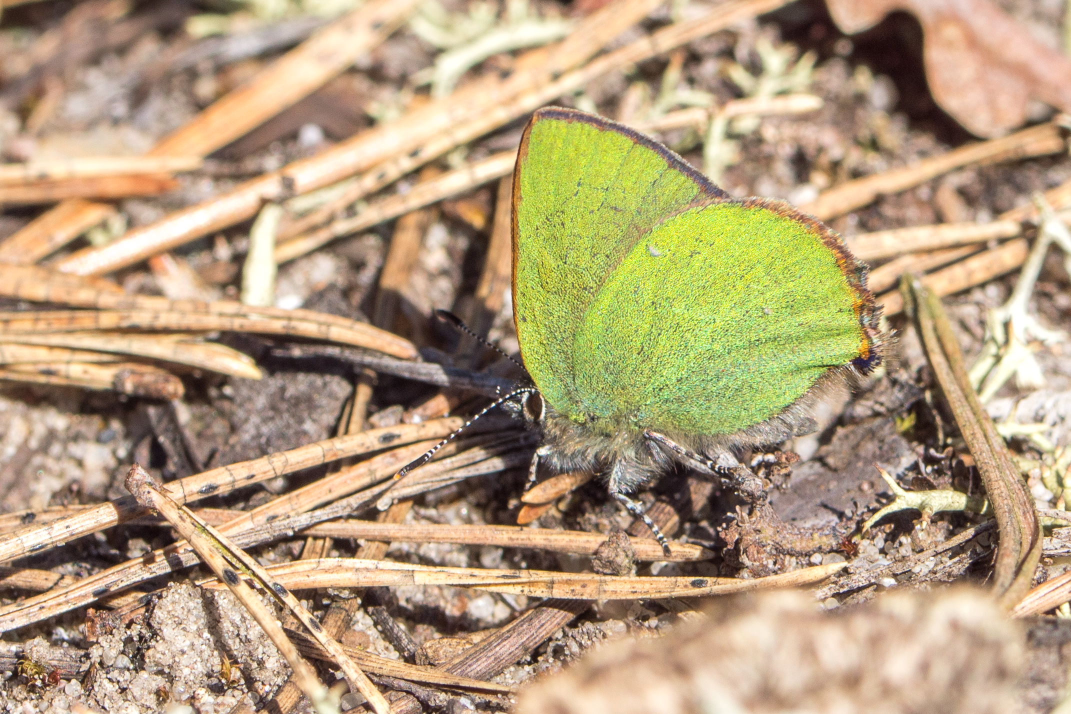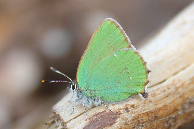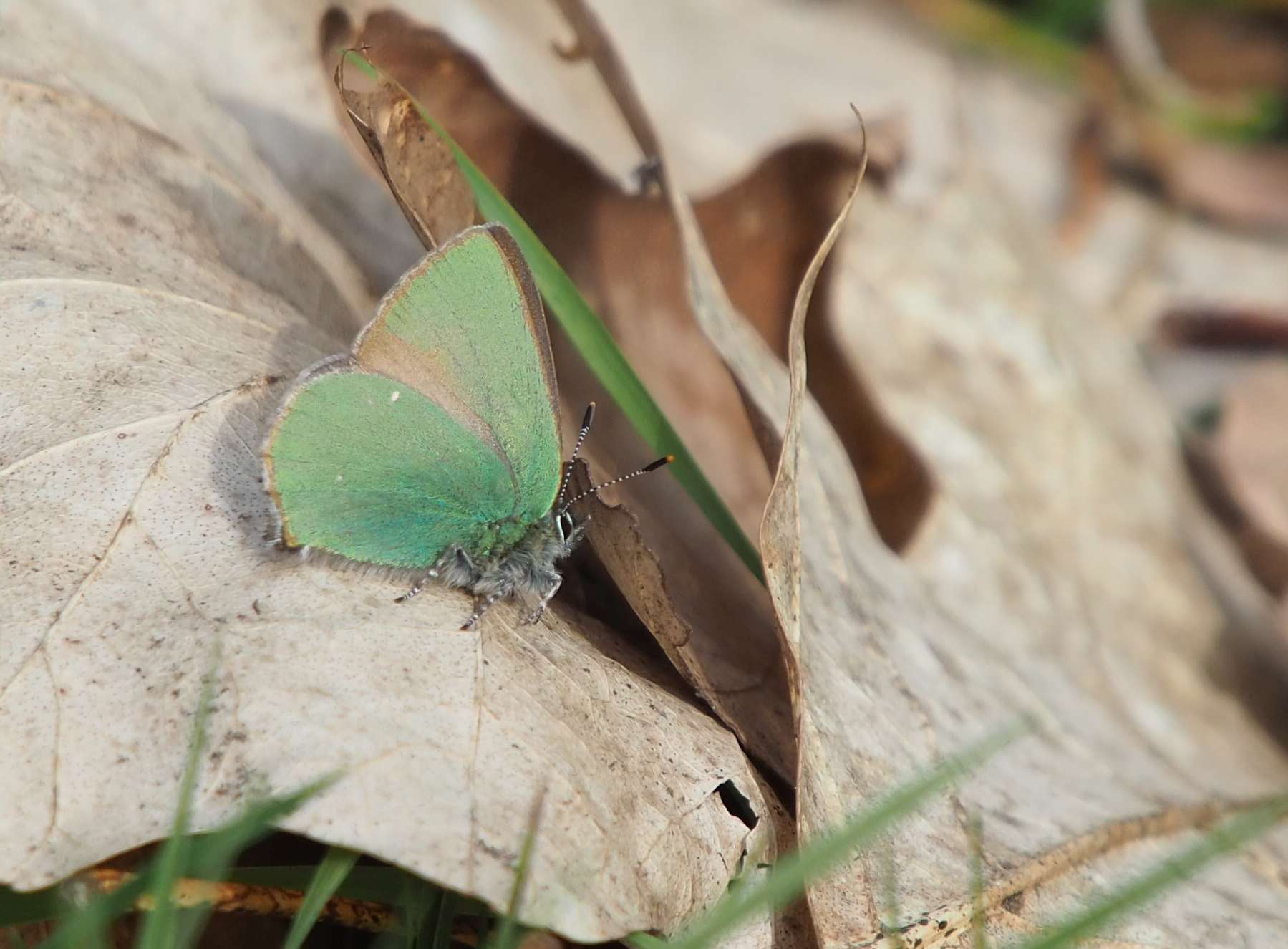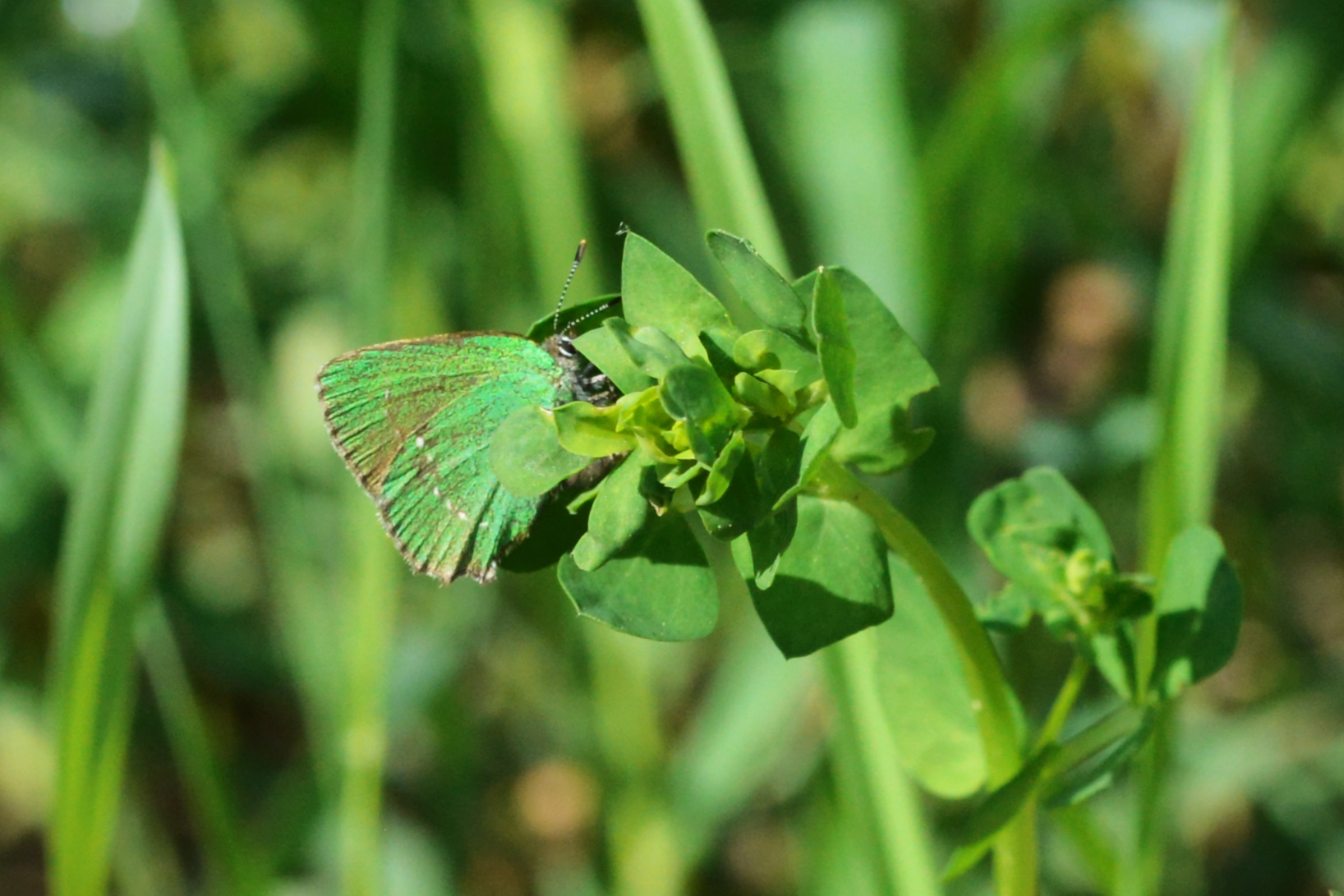 Grüner Zipfelfalter, im NSG Presseler Heide,- Wald,- und Moorgebiet, ca. 3 km nördl. von Wöllnau, am 17.05.2020