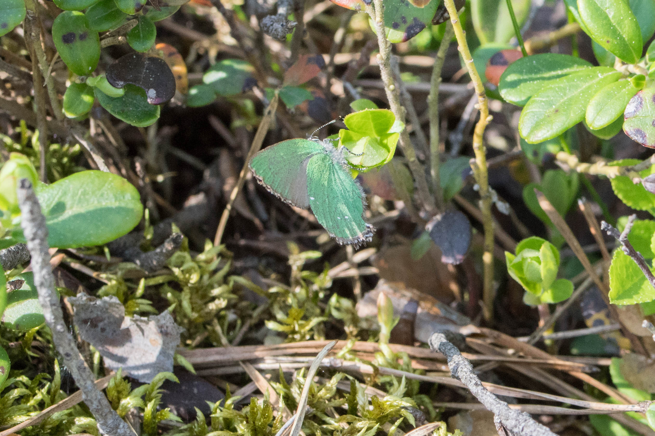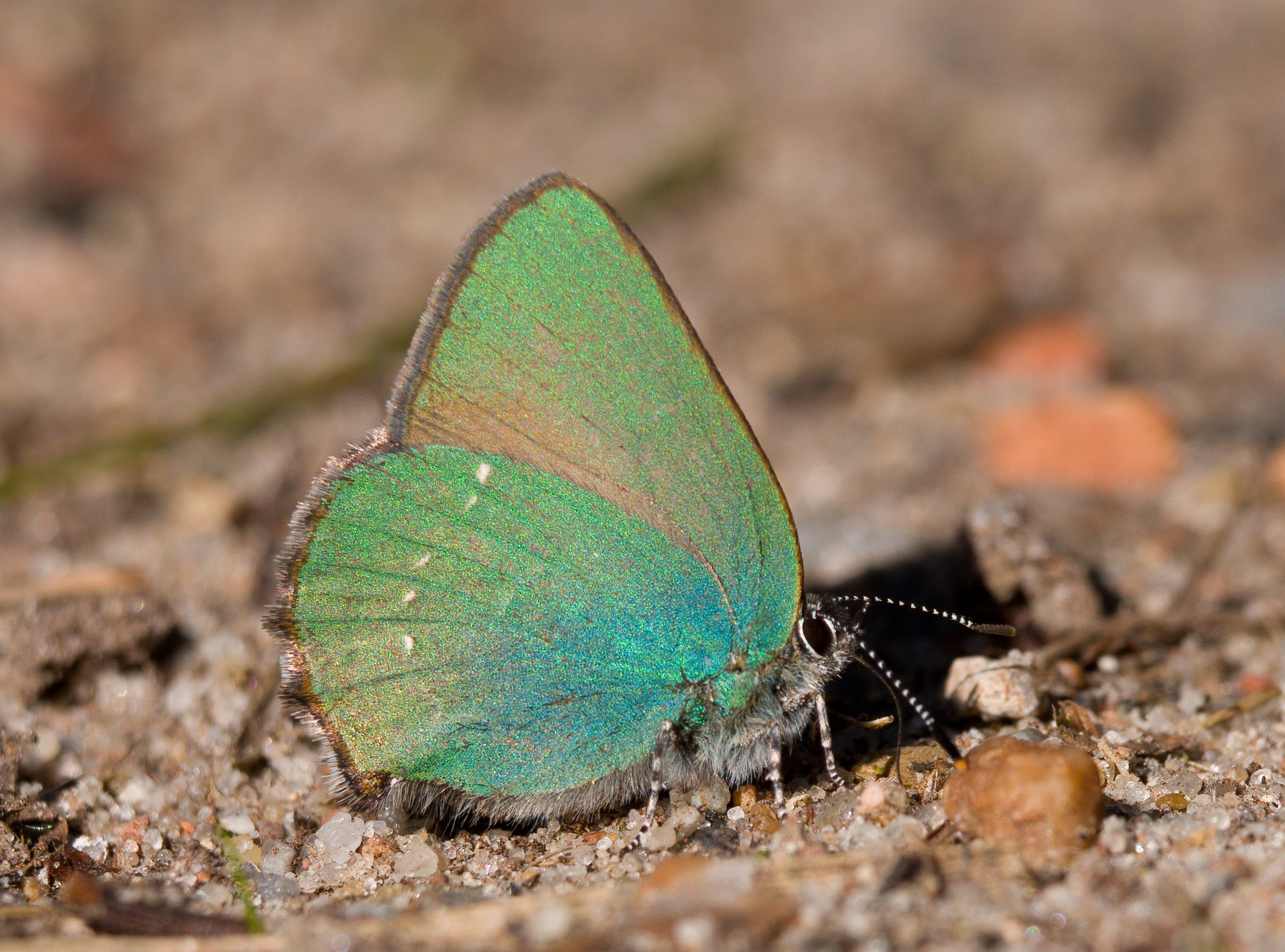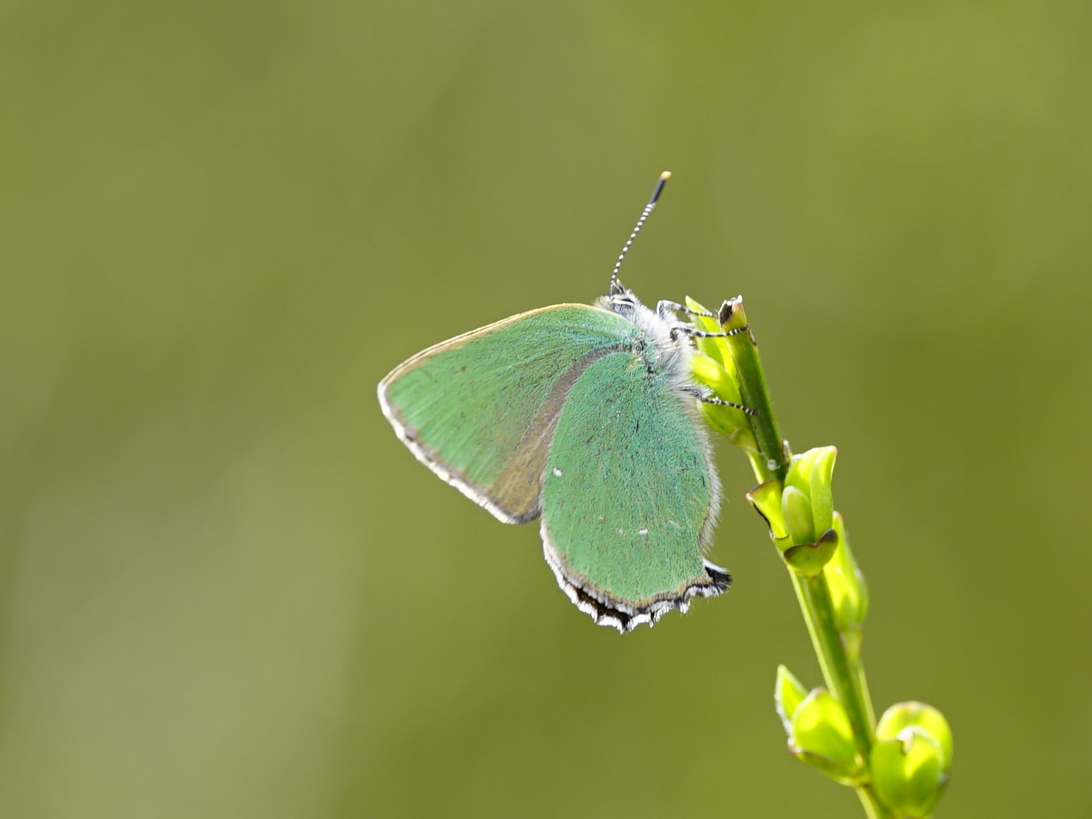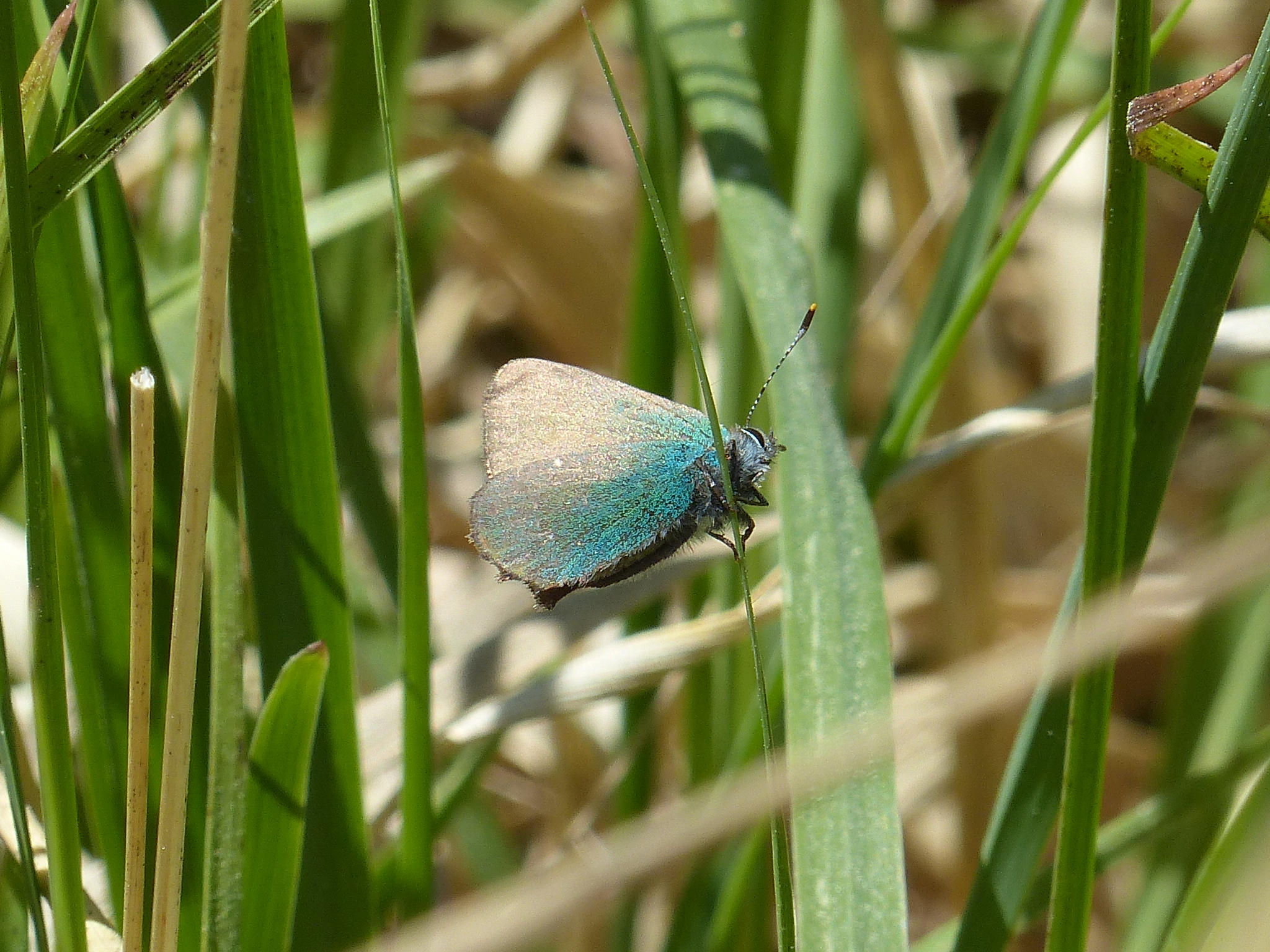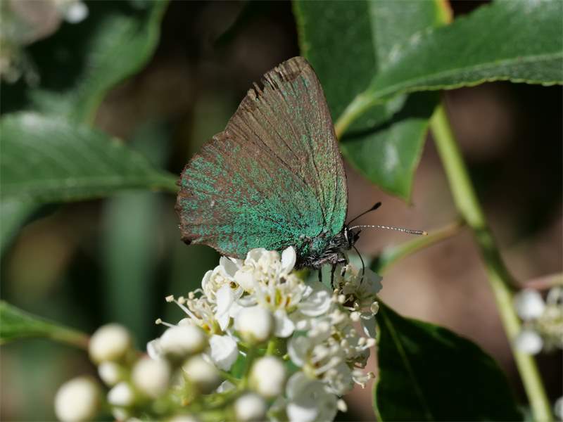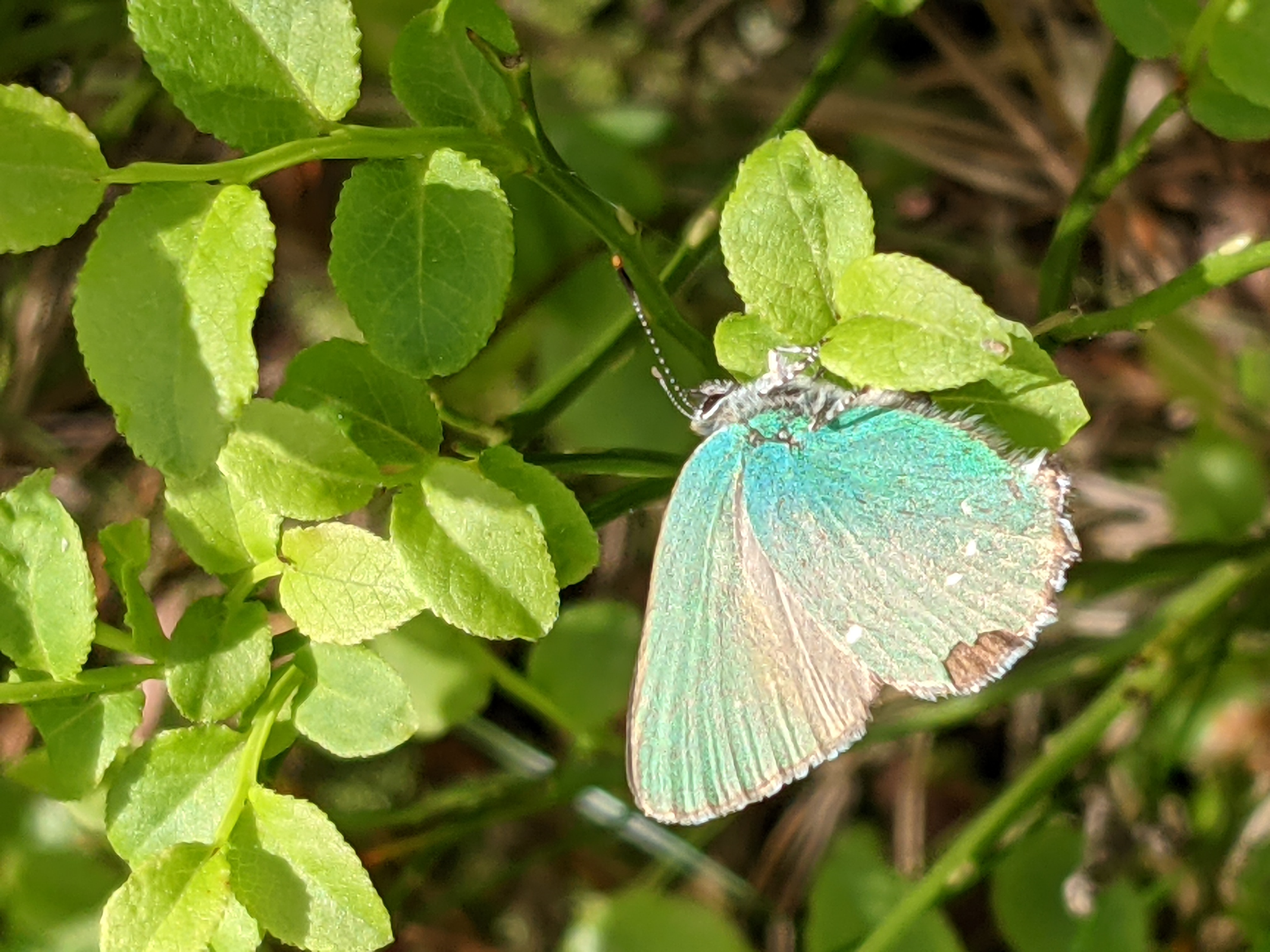 Grüner Zipfelfalter, im NSG Presseler Heide,- Wald,- und Moorgebiet, ca. 3 km nördl. von Wöllnau, am 17.05.2020