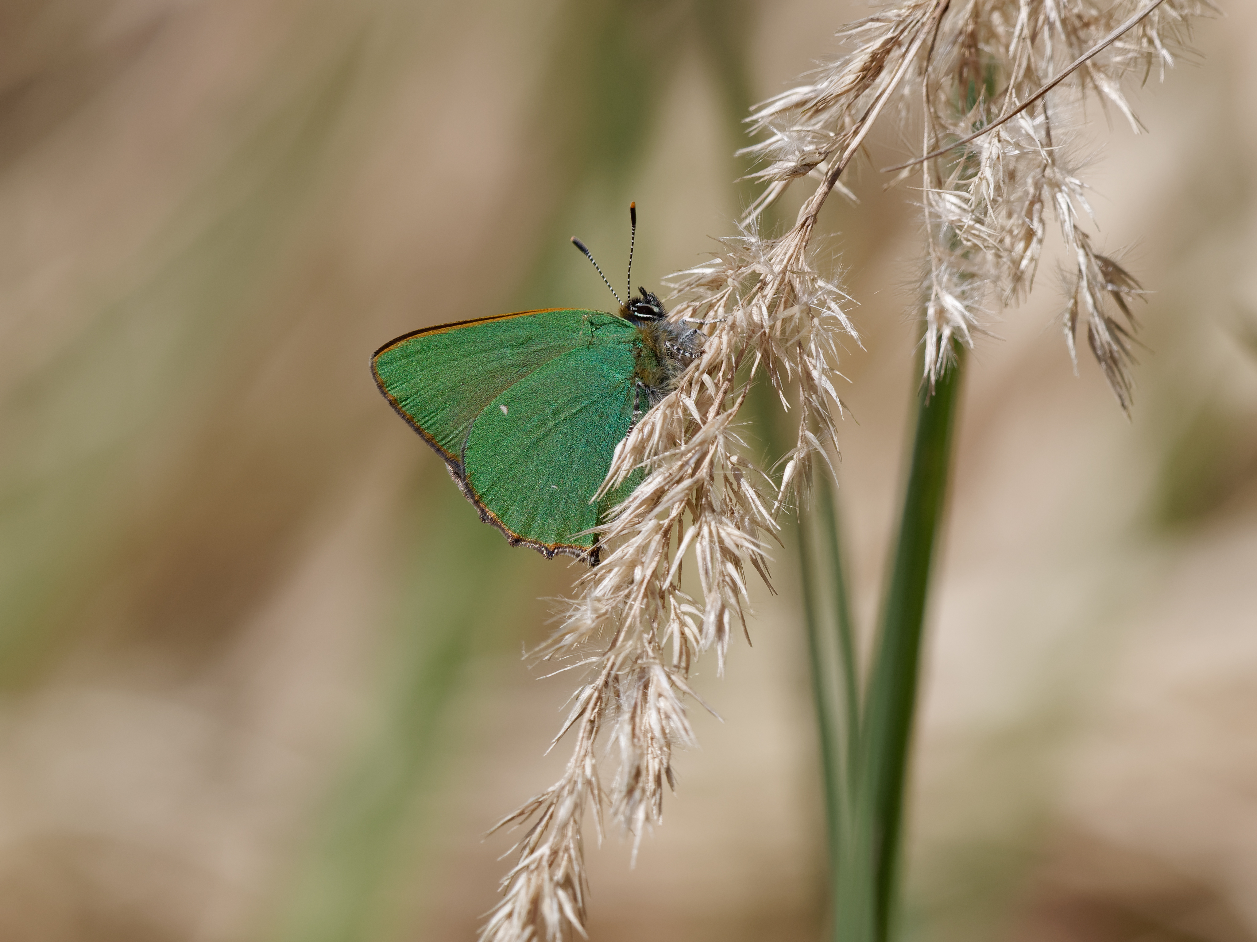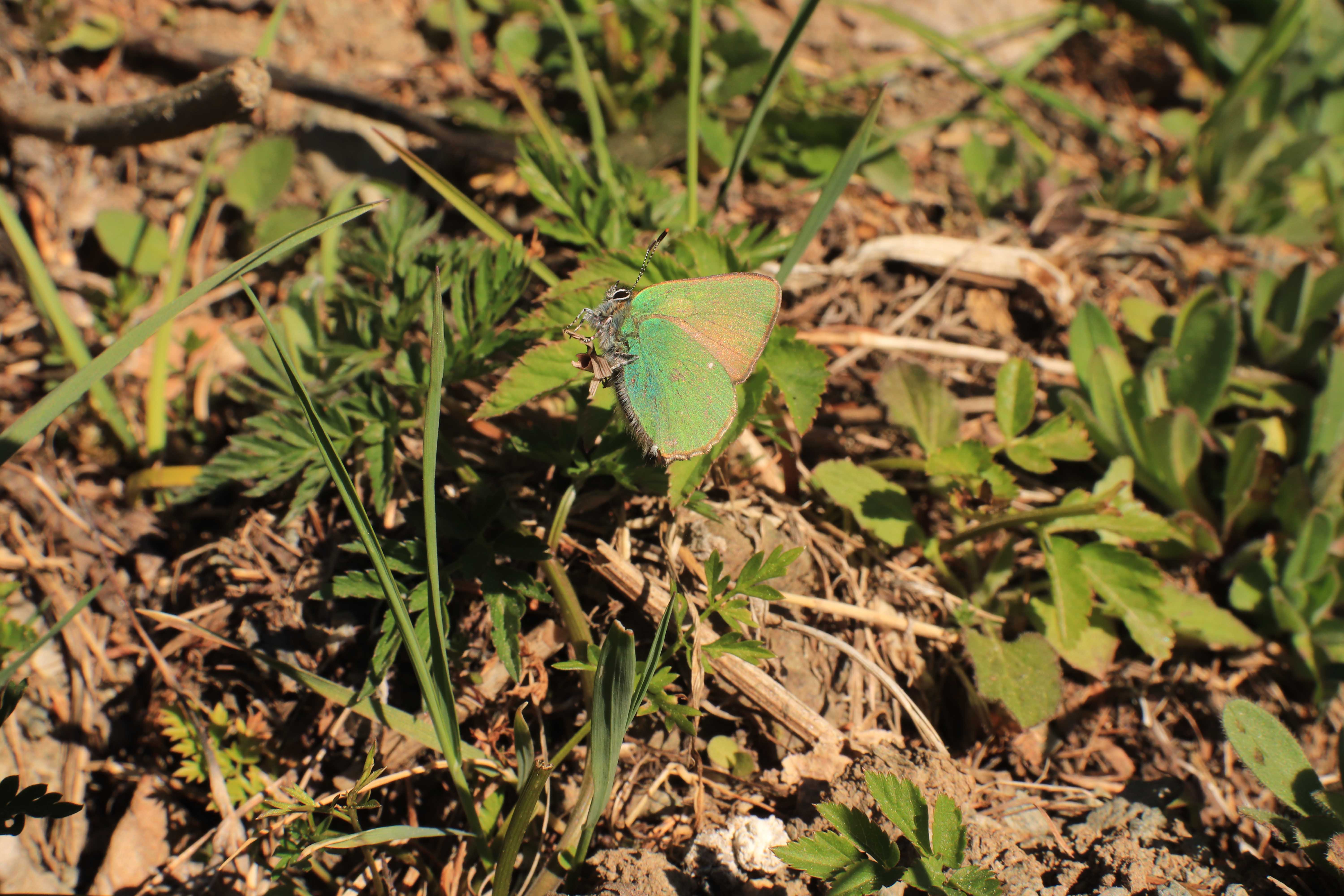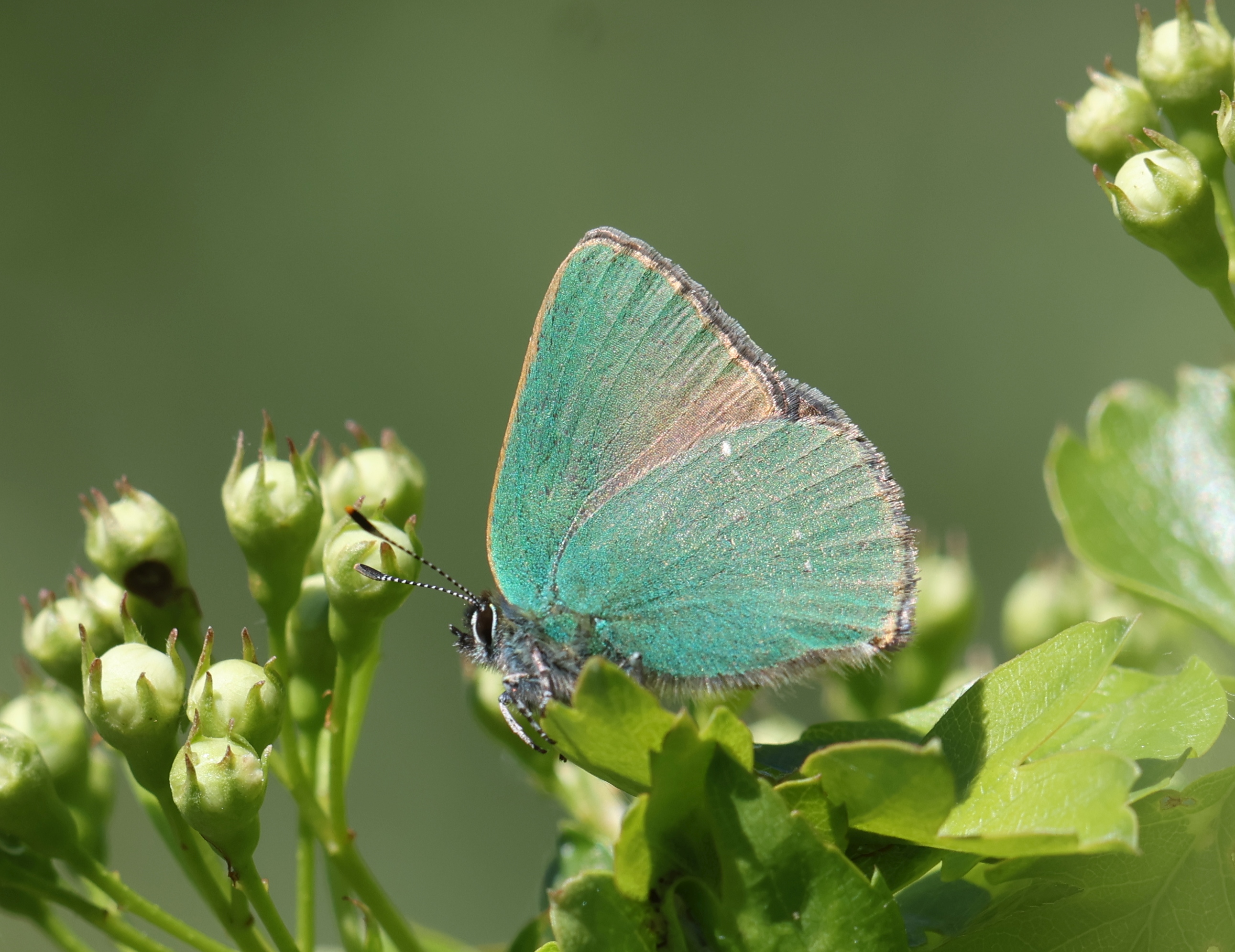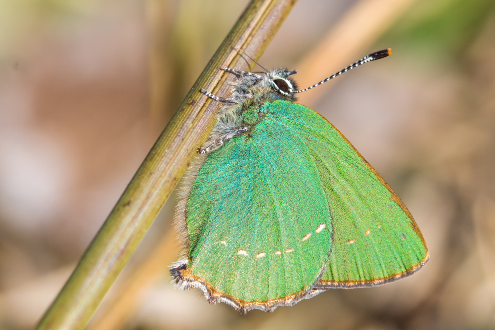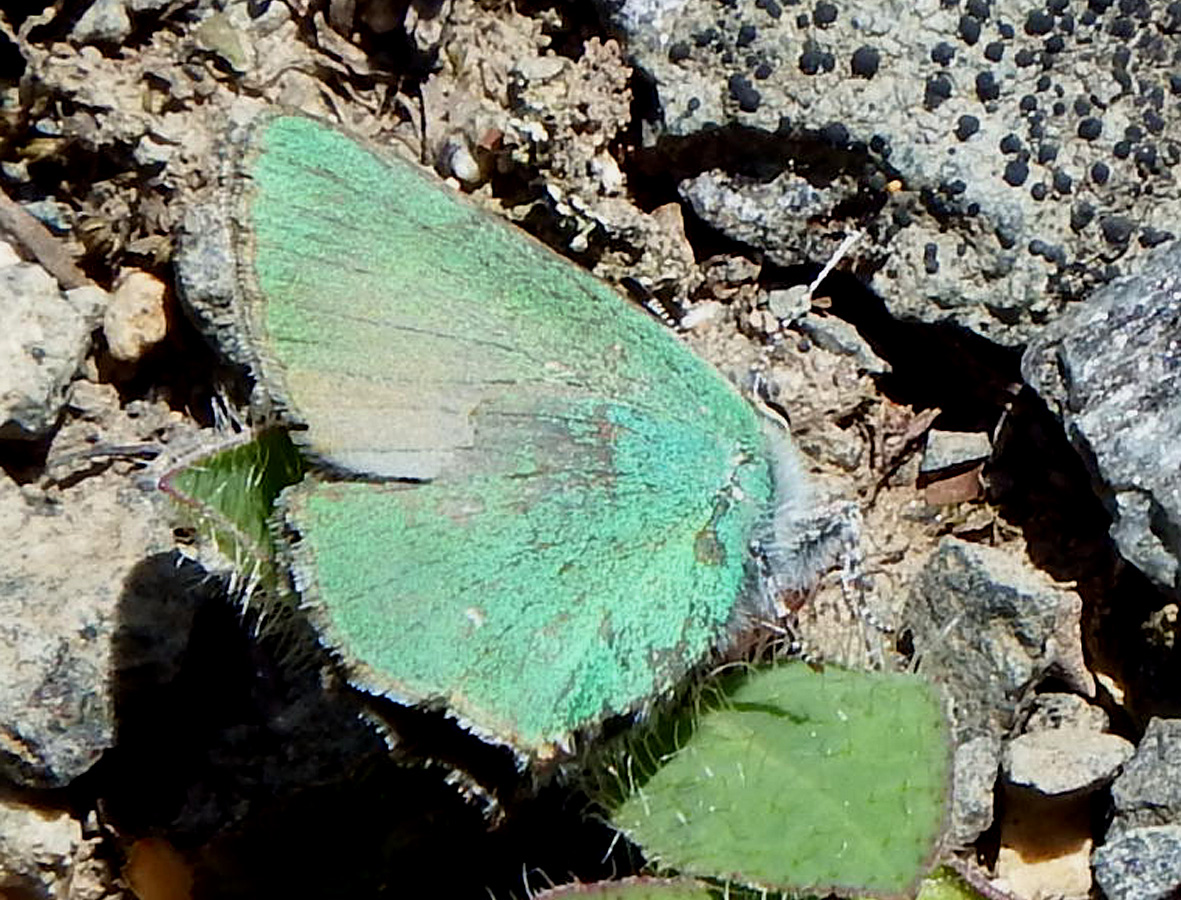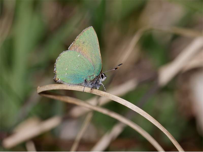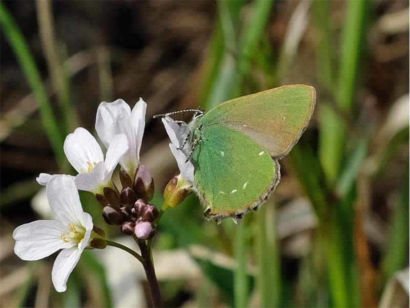 Grüner Zipfelfalter, im NSG Presseler Heide,- Wald,- und Moorgebiet, ca. 3 km nördl. von Wöllnau, am 17.05.2020