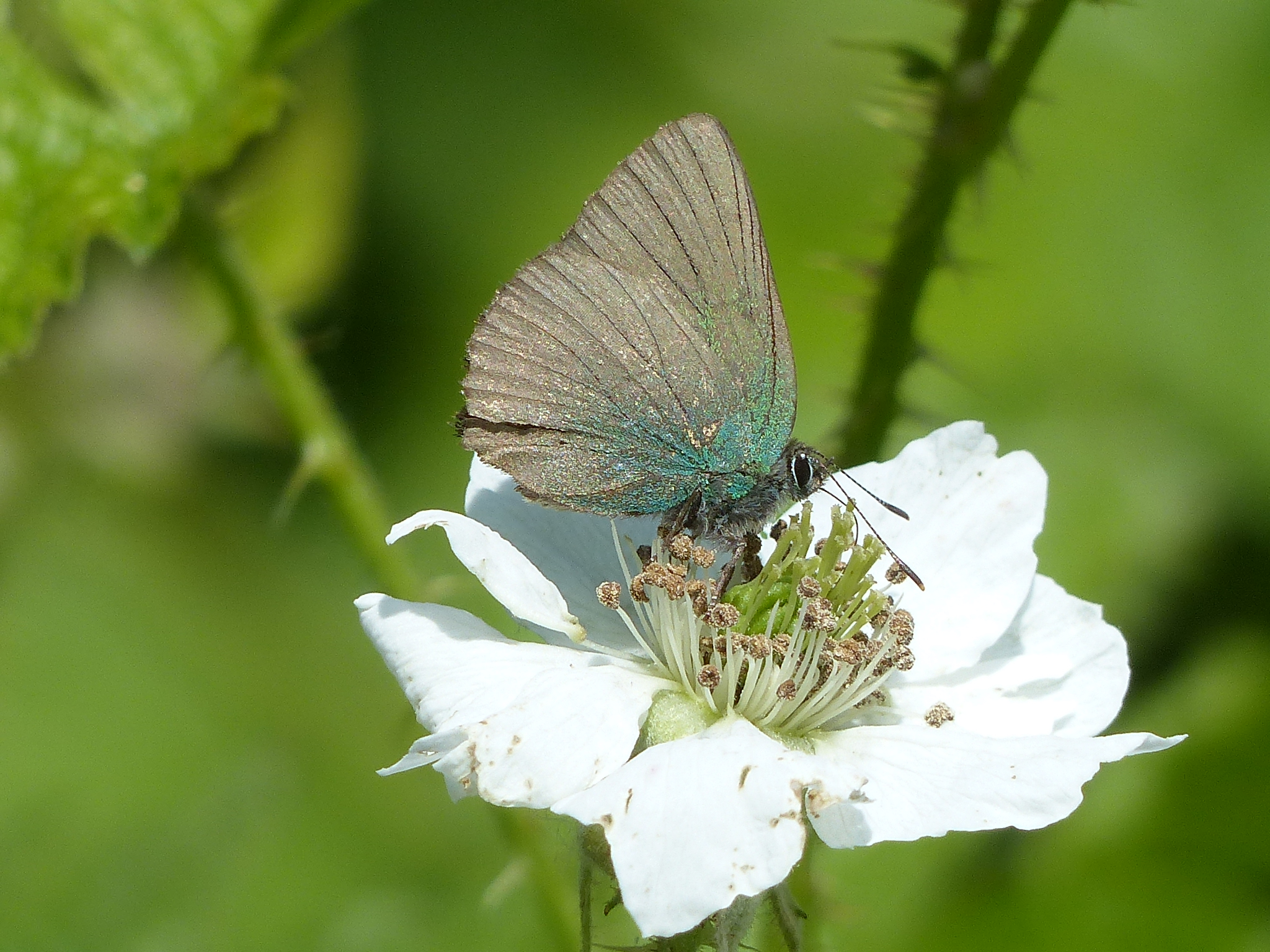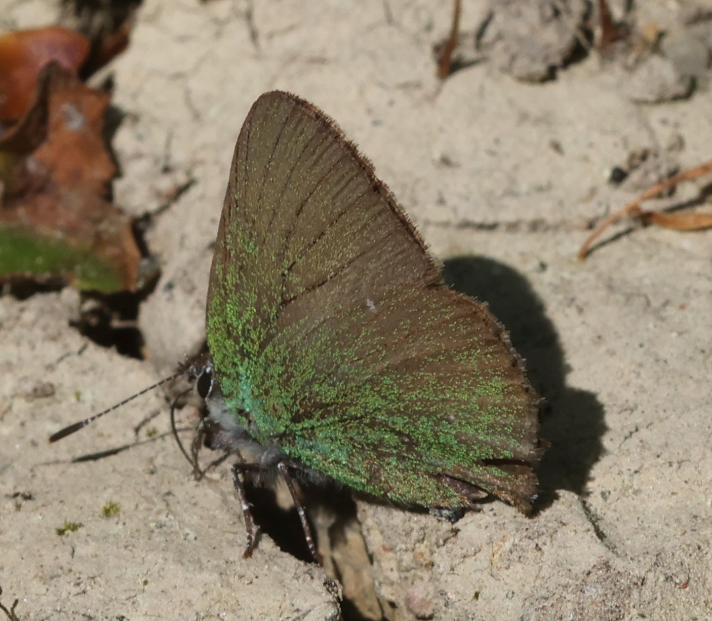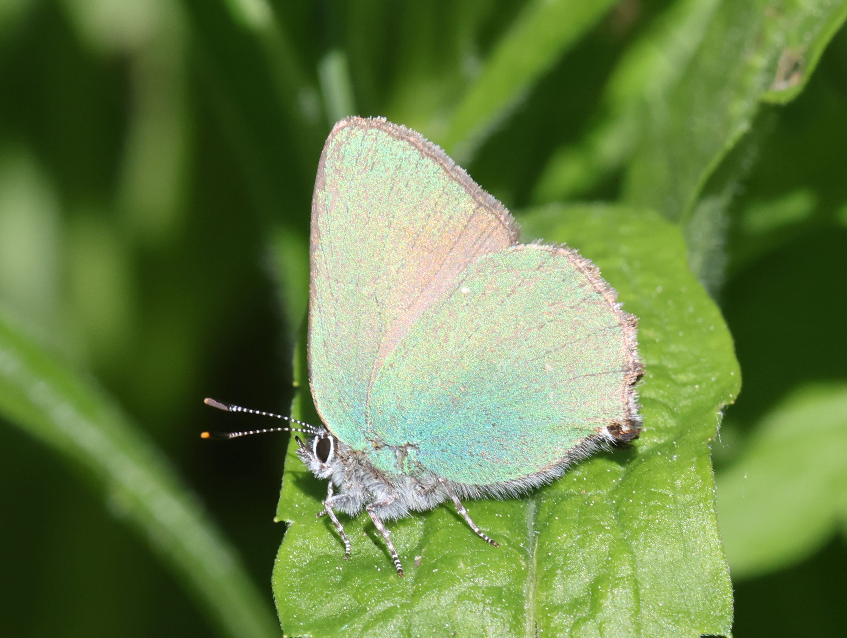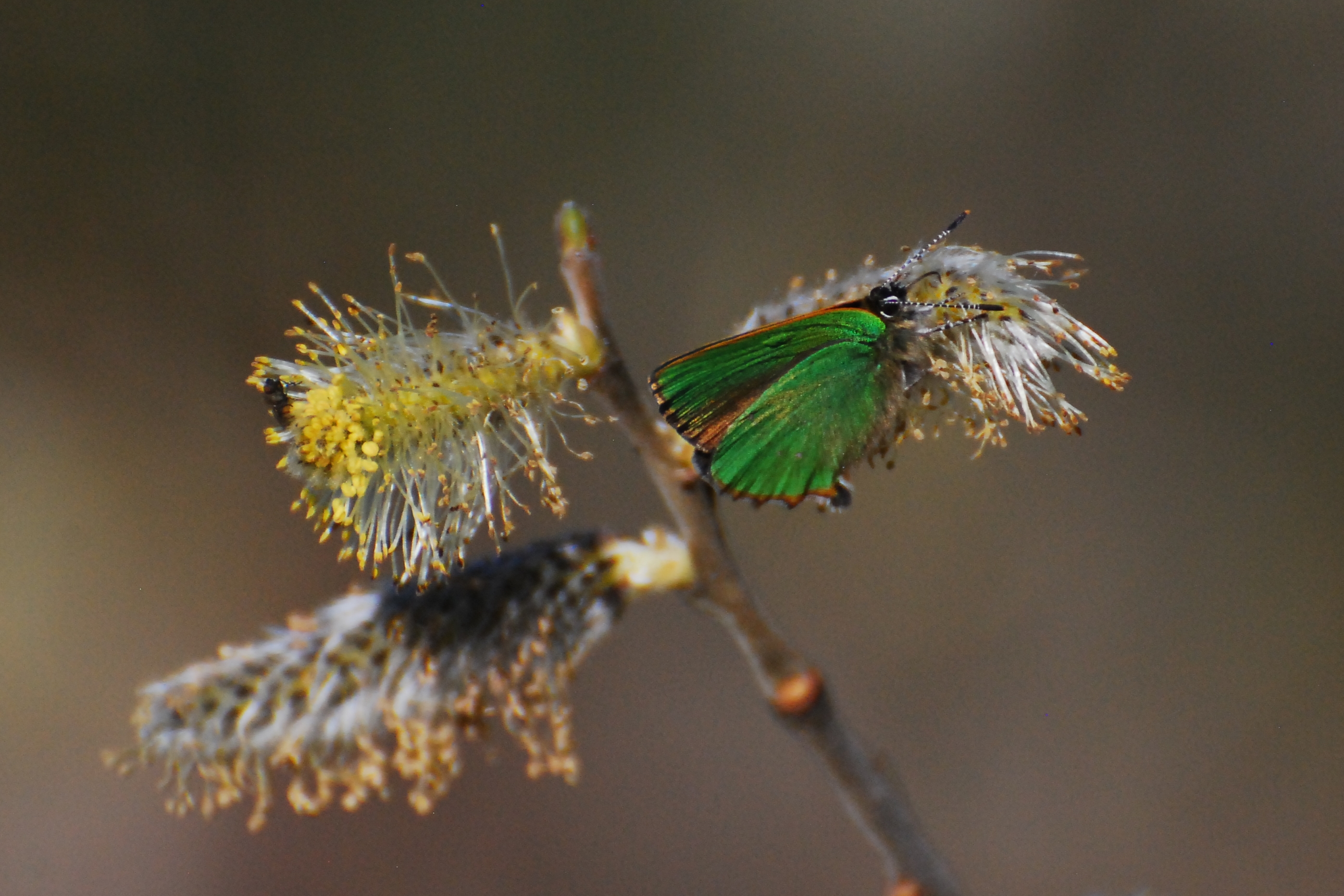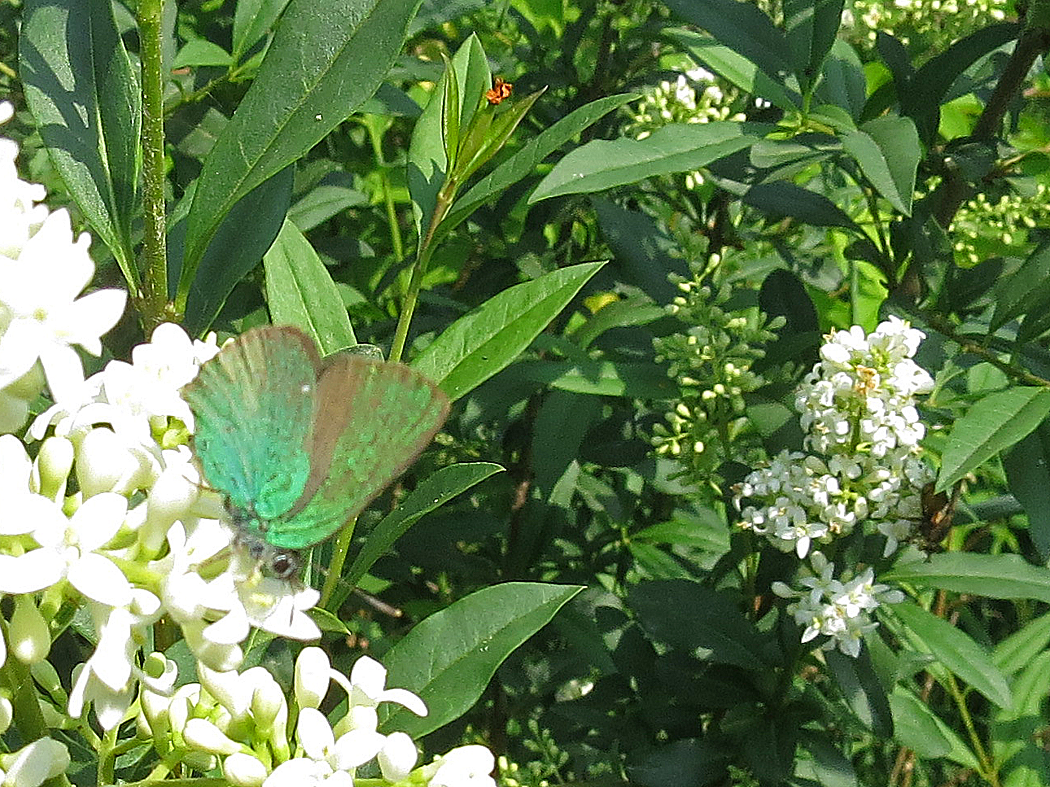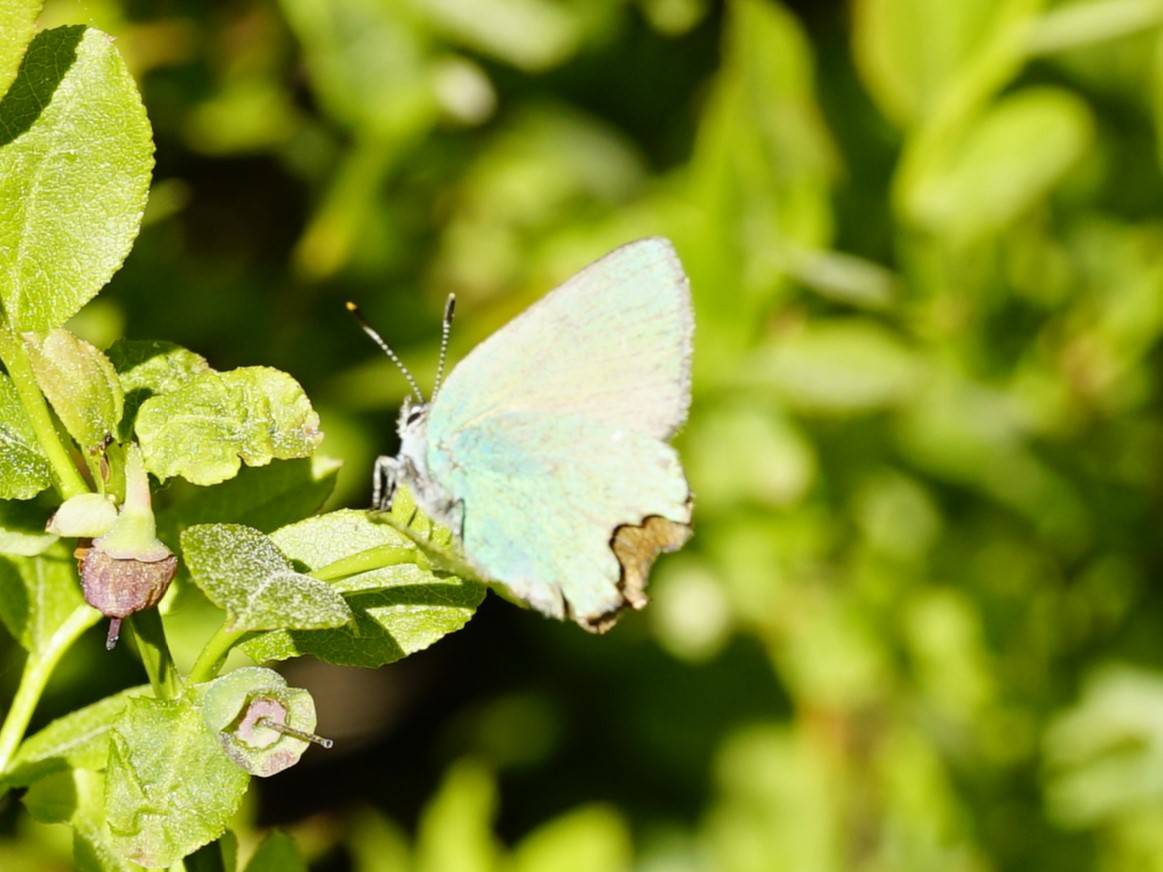 Grüner Zipfelfalter, im NSG Presseler Heide,- Wald,- und Moorgebiet, ca. 3 km nördl. von Wöllnau, am 17.05.2020