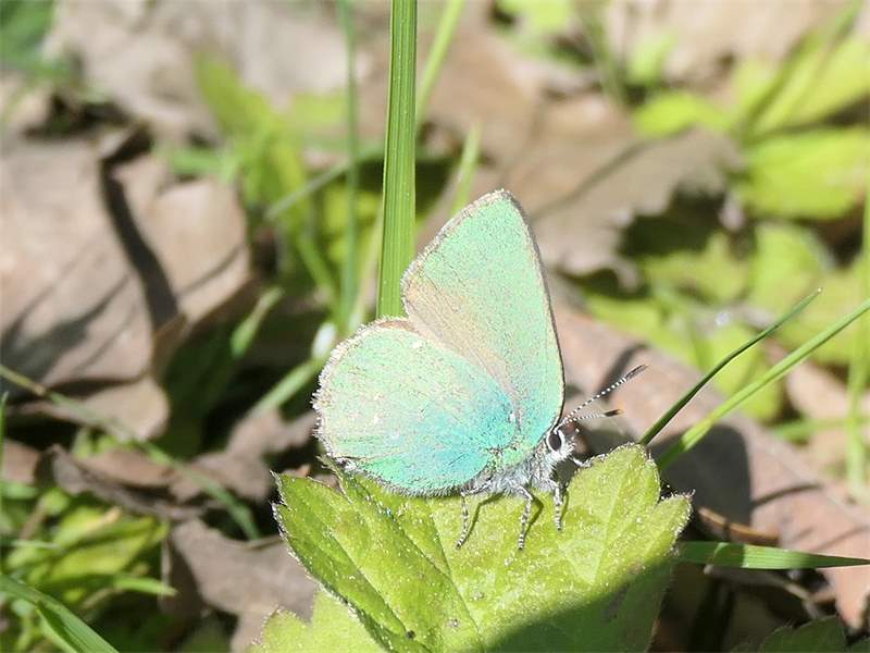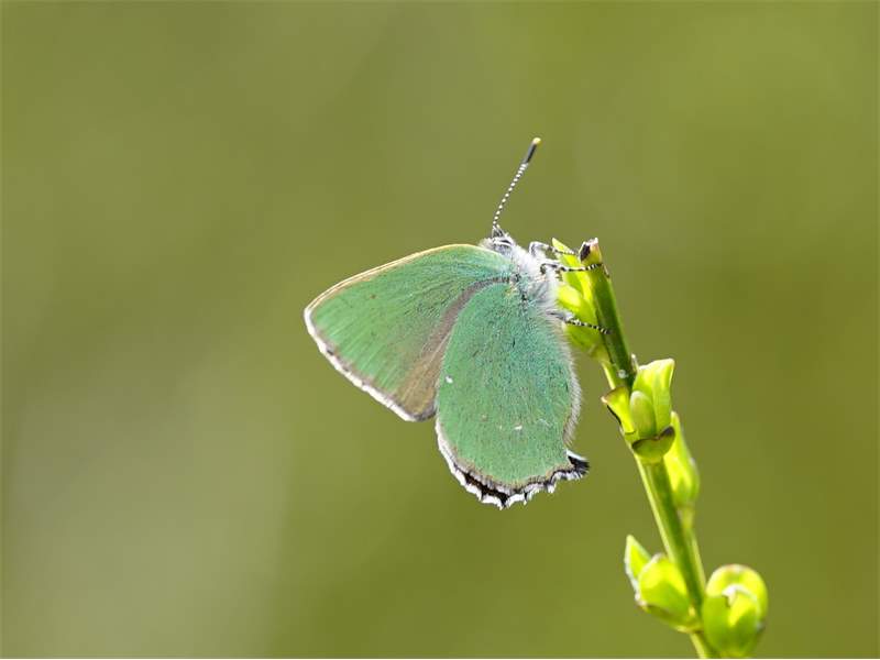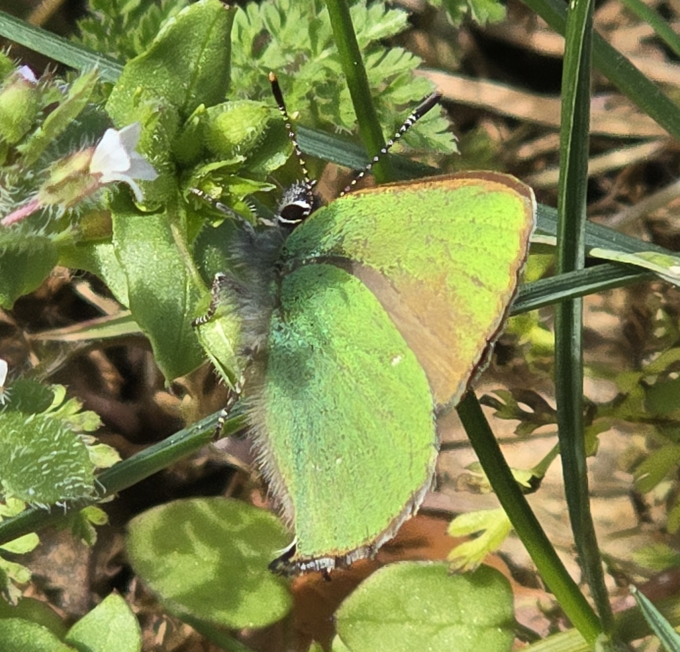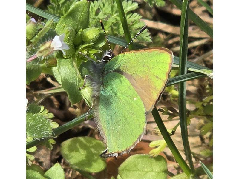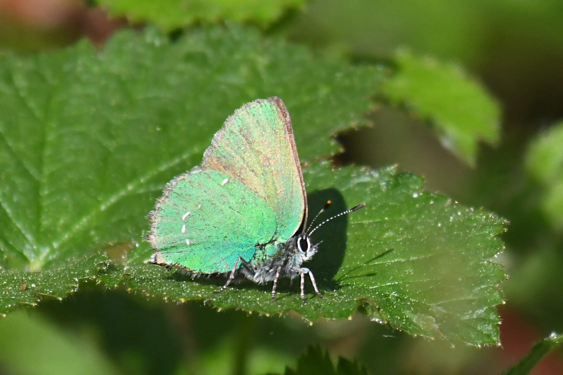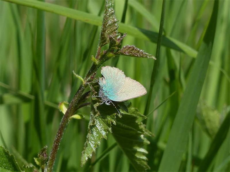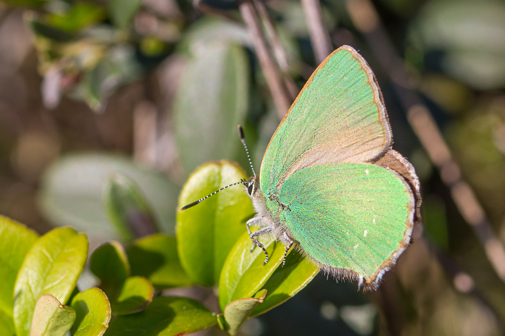 Grüner Zipfelfalter, im NSG Presseler Heide,- Wald,- und Moorgebiet, ca. 3 km nördl. von Wöllnau, am 17.05.2020